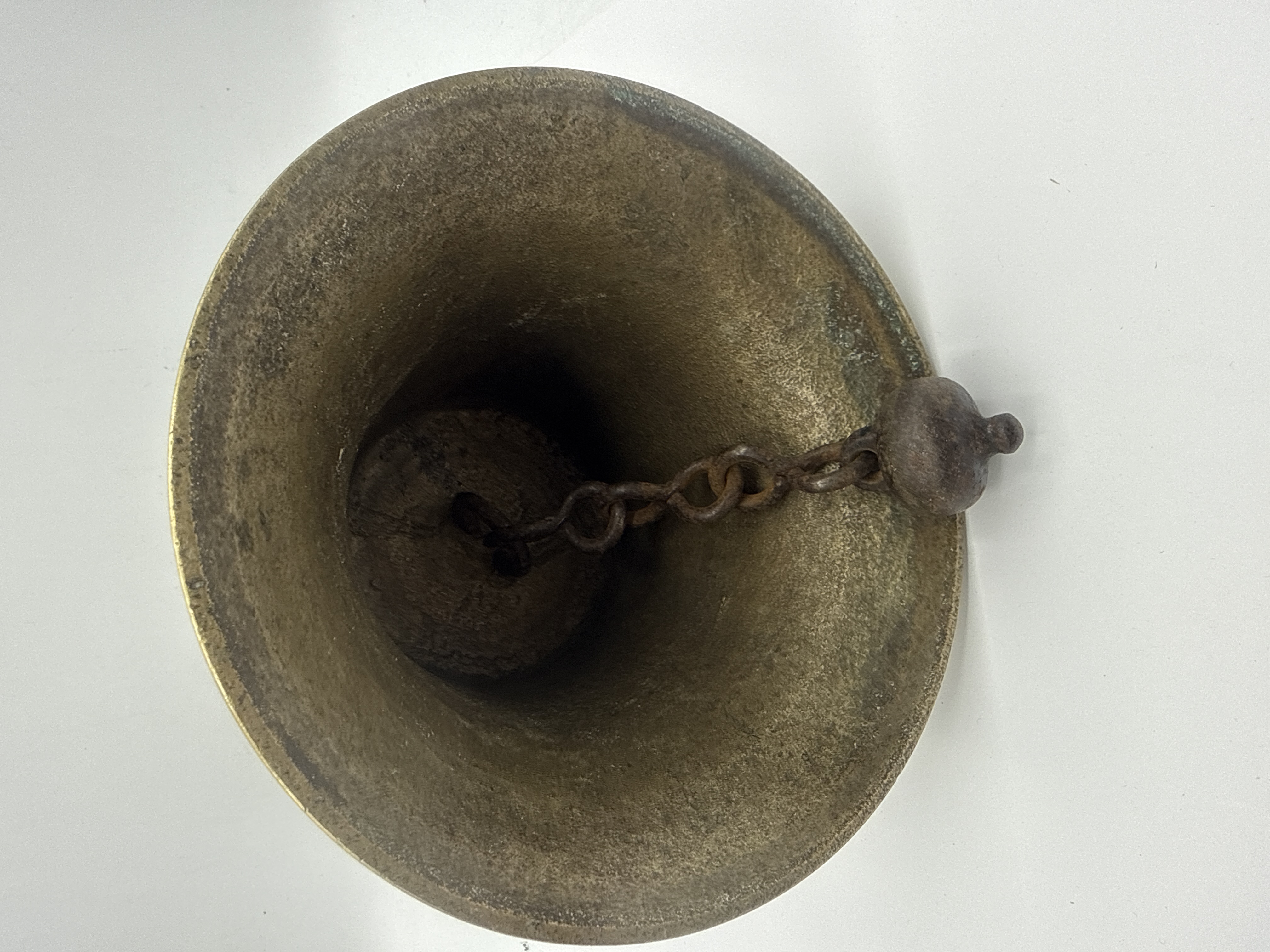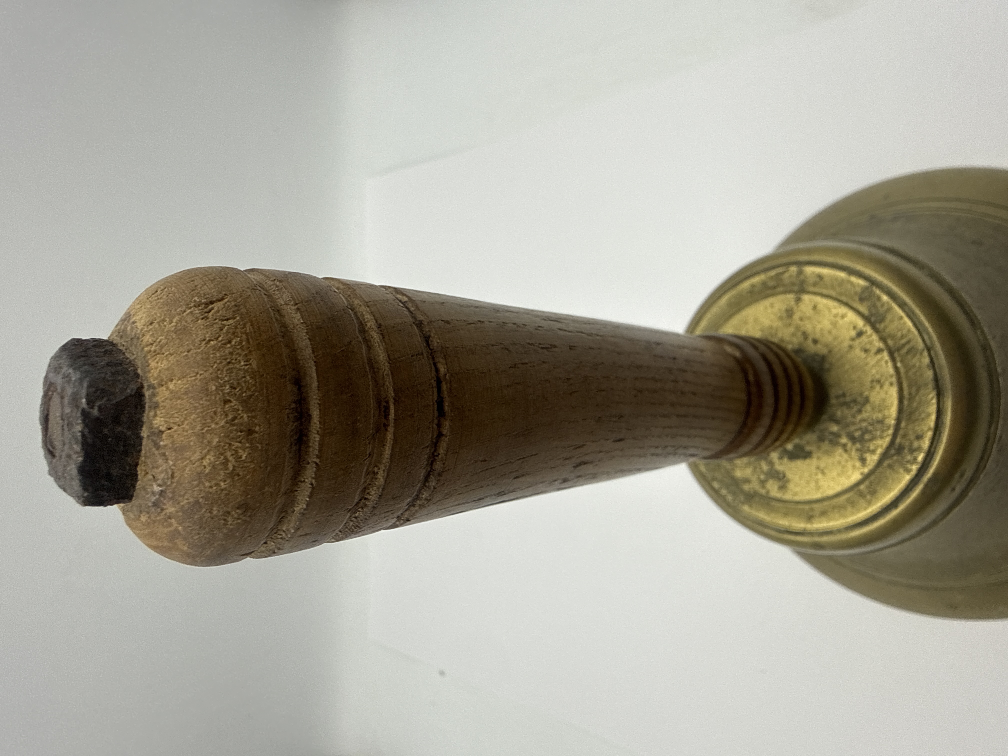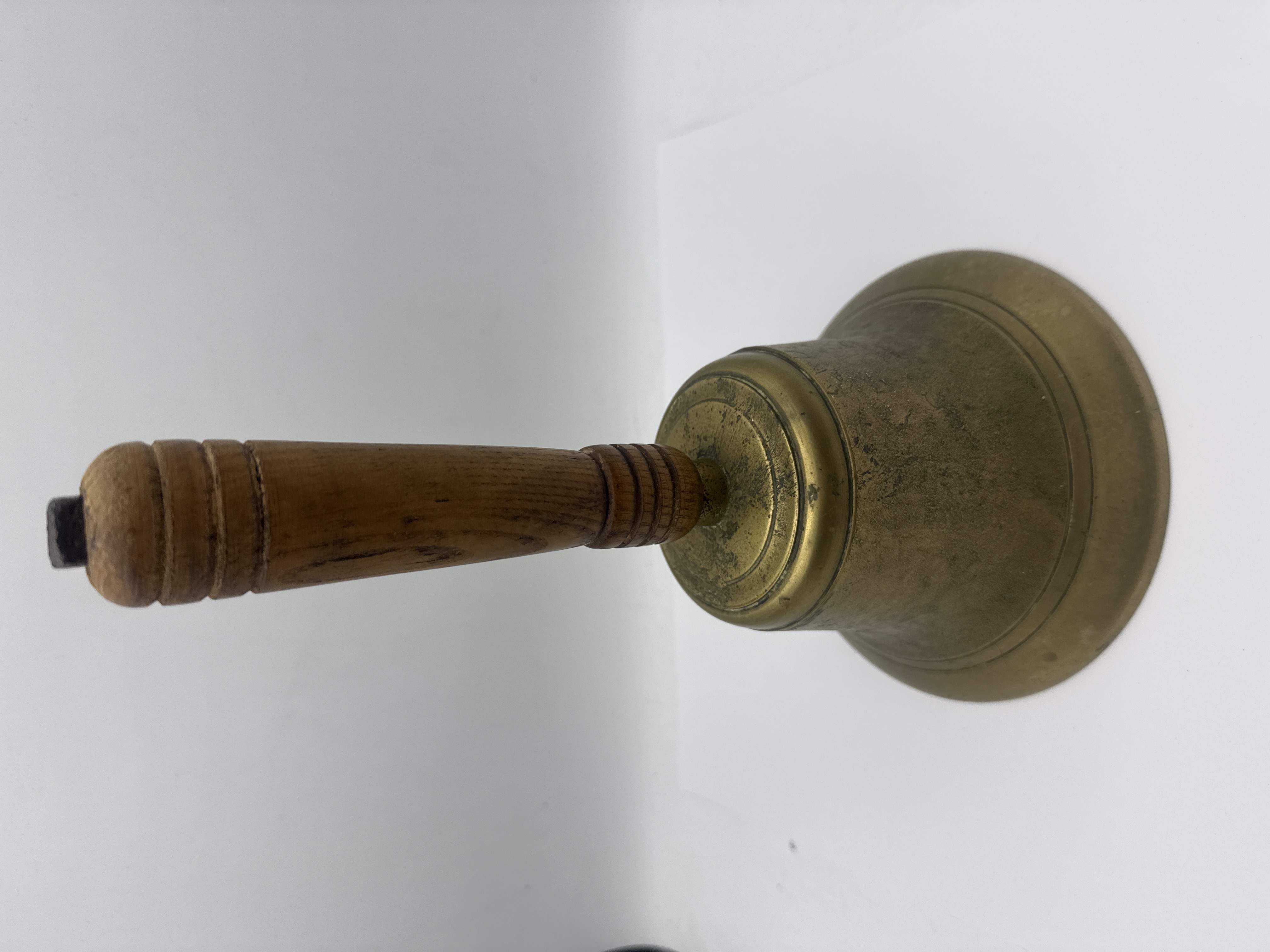A vintage brass school bell featuring a flared rim and concentric ring detailing to the shoulder. The bell is fitted with a turned wooden handle exhibiting decorative ridged bands at the base and top, secured by an iron bolt. The interior contains a heavy iron ball clapper attached to a multi-link metal chain.