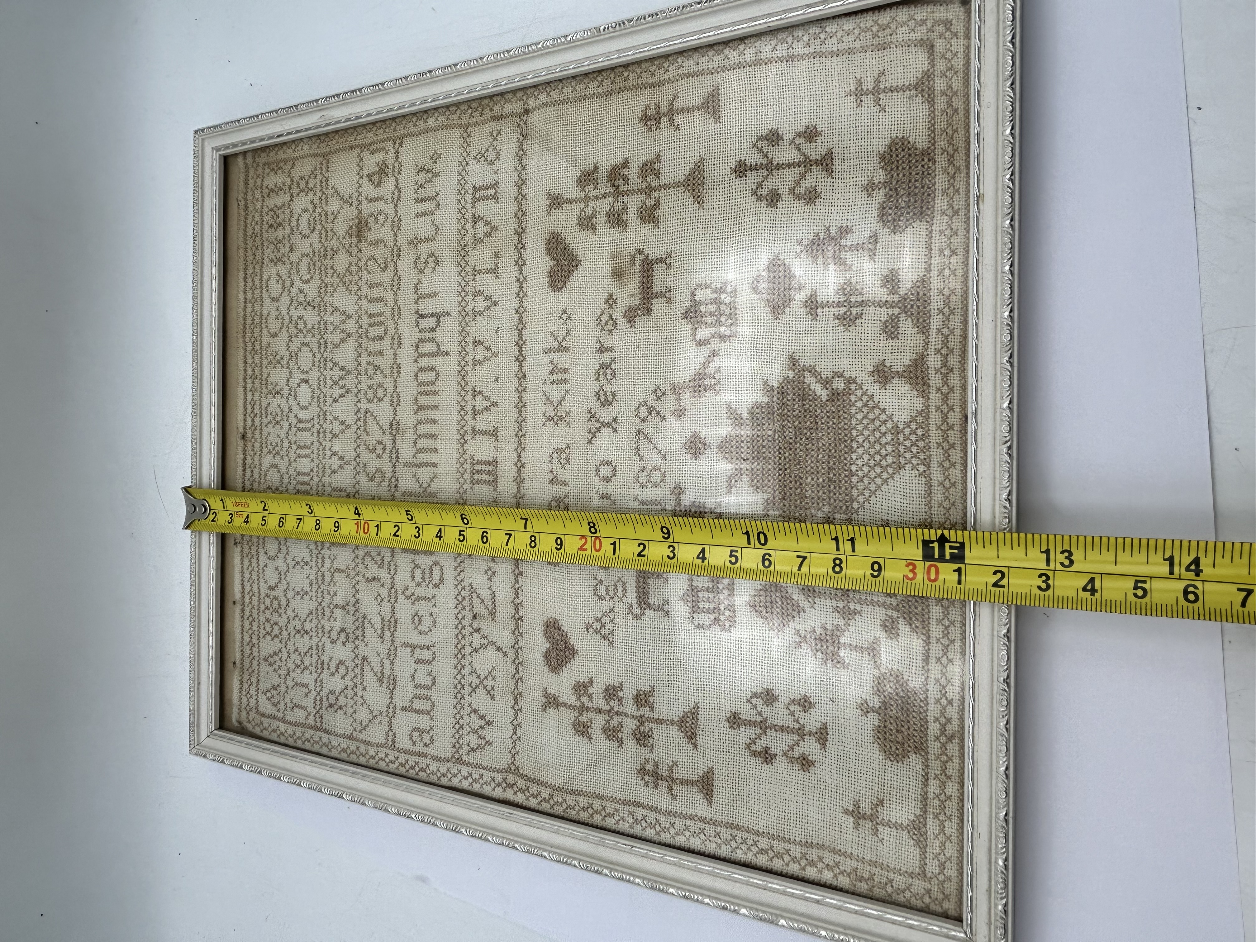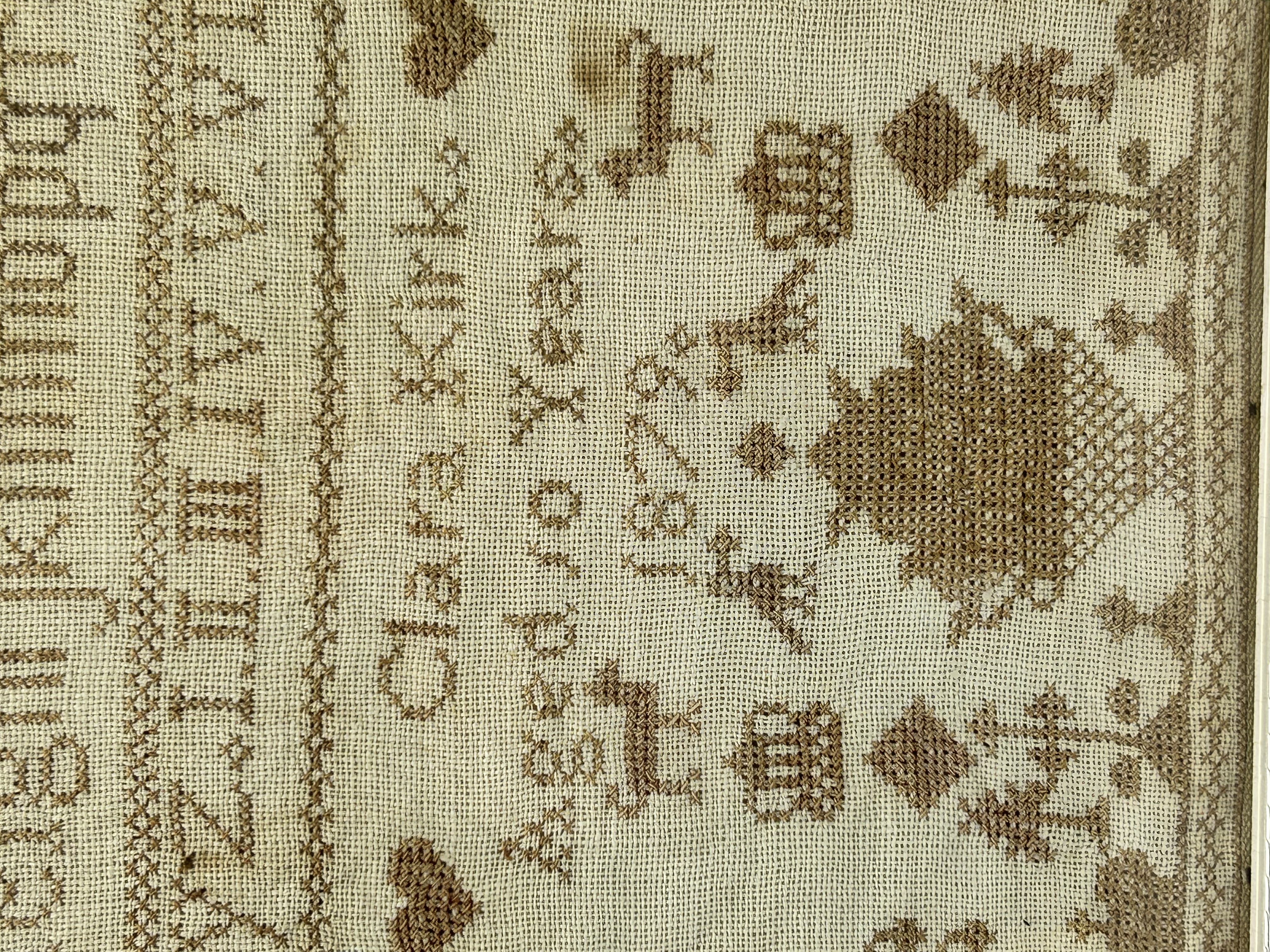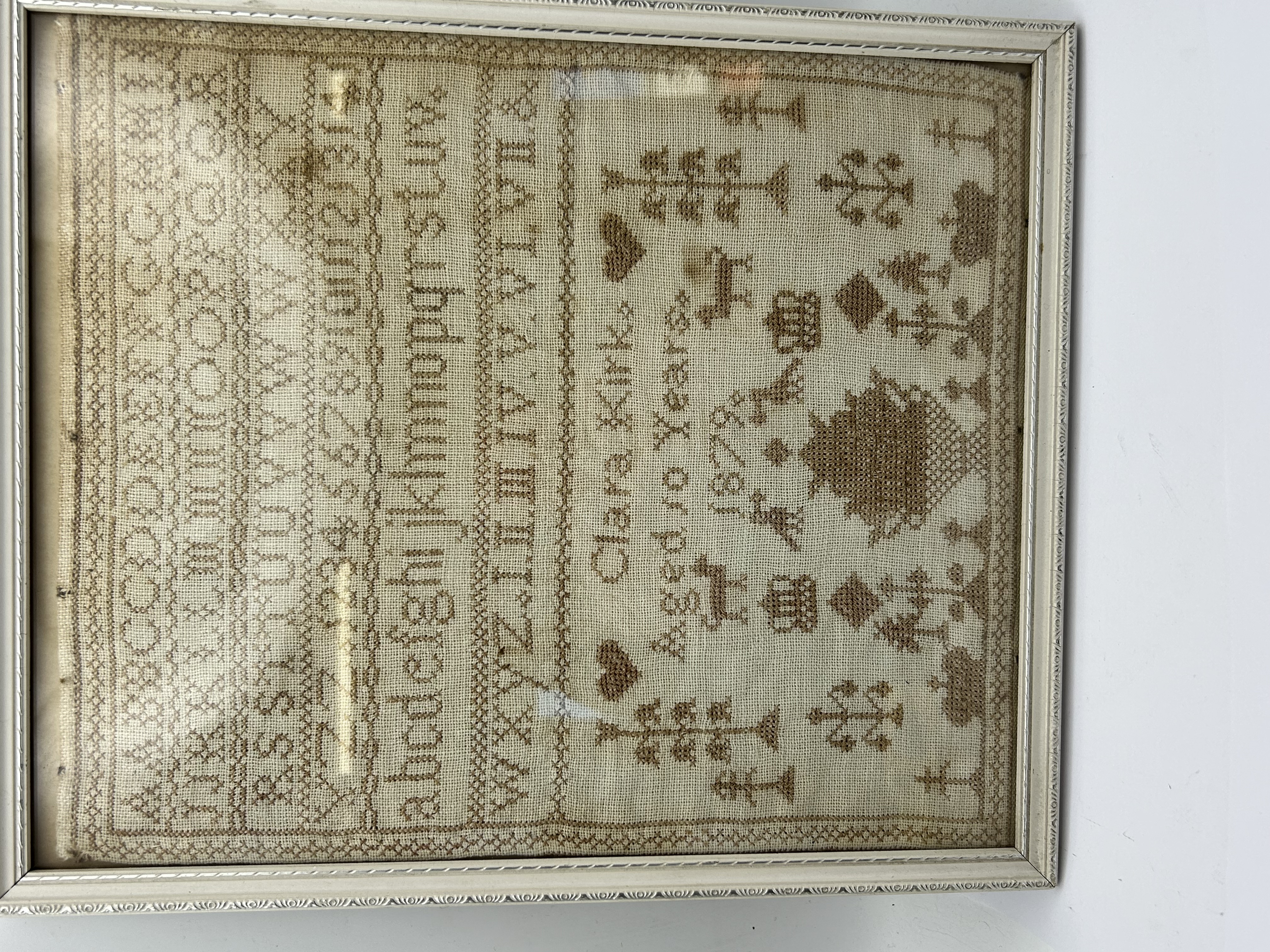 A late 19th-century needlework sampler executed in monochromatic brown cross-stitch on a coarse weave fabric ground. The work features multiple rows of alphabets in various scripts, numeric sequences, and Roman numerals. The composition is flanked by decorative motifs including stylised trees, hearts, animals, and crowns, with a central basket of flowers. The piece is inscribed Clara Kirk Aged 10 Years and dated 1879. It is housed behind glass in a light-toned, ornate decorative frame.