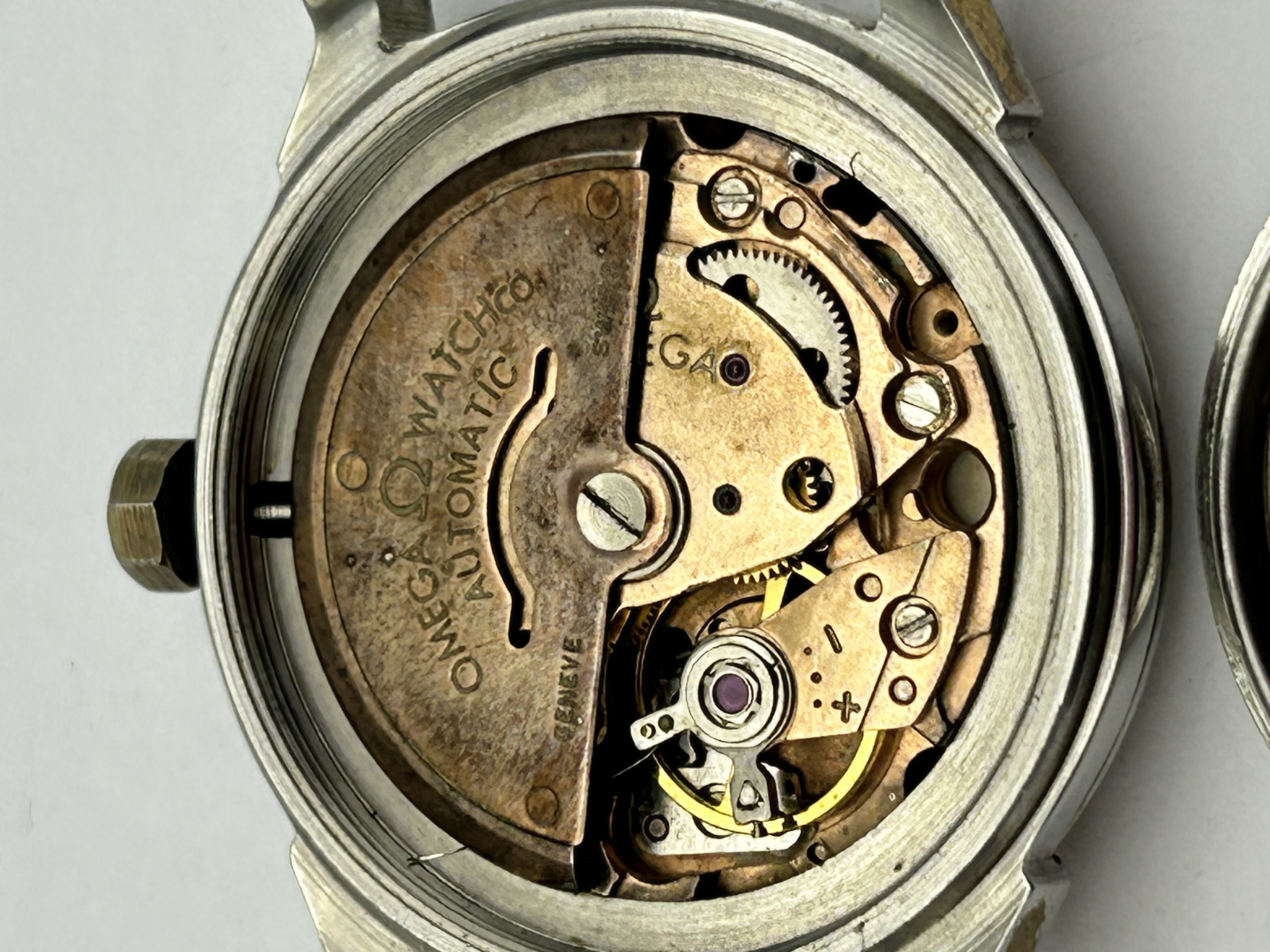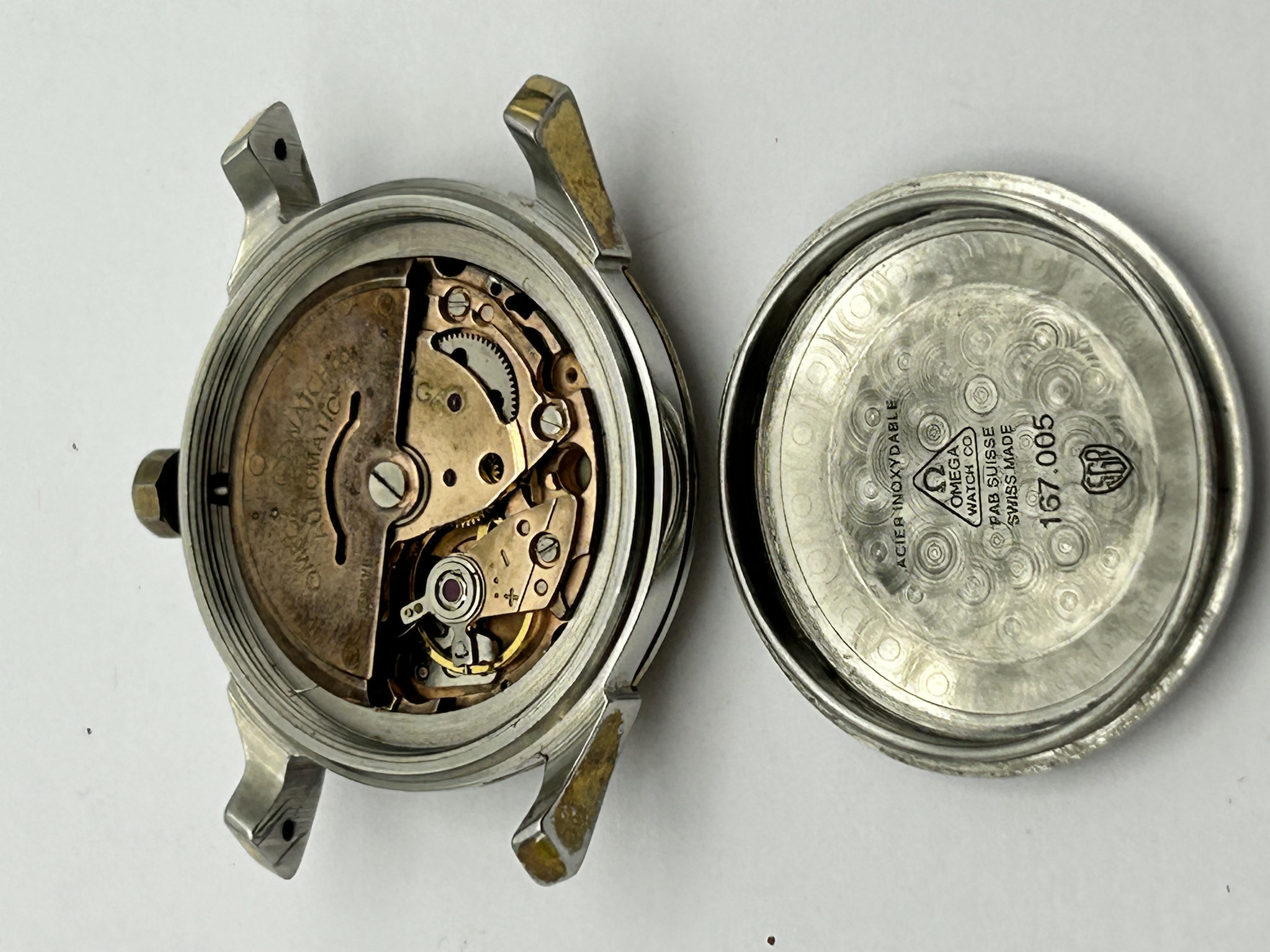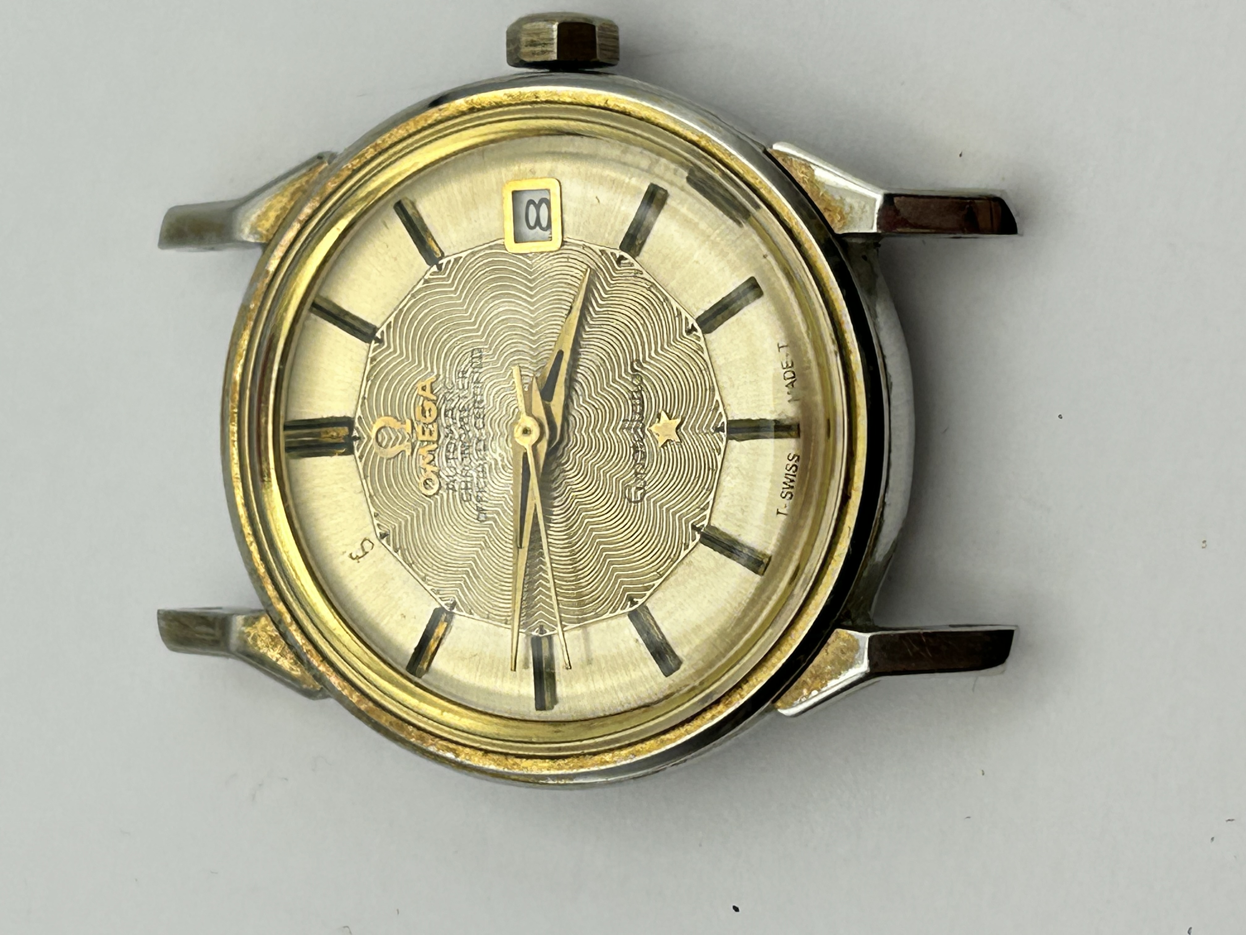 An Omega Constellation automatic chronometer wristwatch head, reference 167.005. The timepiece features a stainless steel case with gold-capped lugs and bezel. The gold-tone dial is detailed with a central guilloché wave pattern, applied baton hour markers, a date window at the 3 o’clock position, and the Constellation star emblem. The interior of the case back is marked ACIER INOXYDABLE, OMEGA WATCH CO, FAB. SUISSE, SWISS MADE, and 167.005. The copper-finished automatic movement is signed OMEGA WATCH CO. and GENEVE.