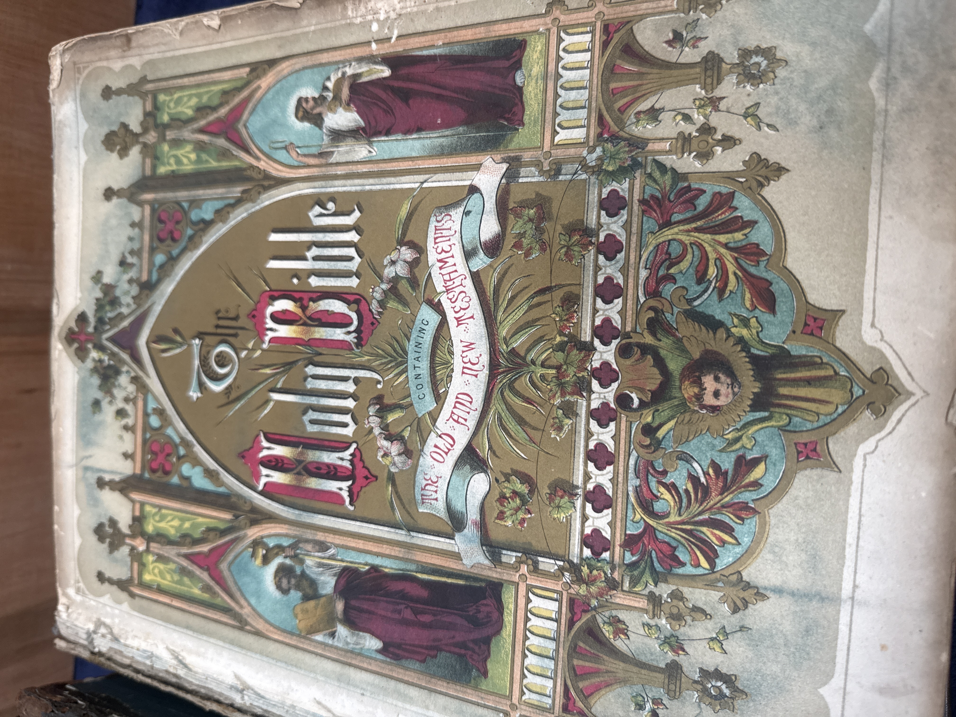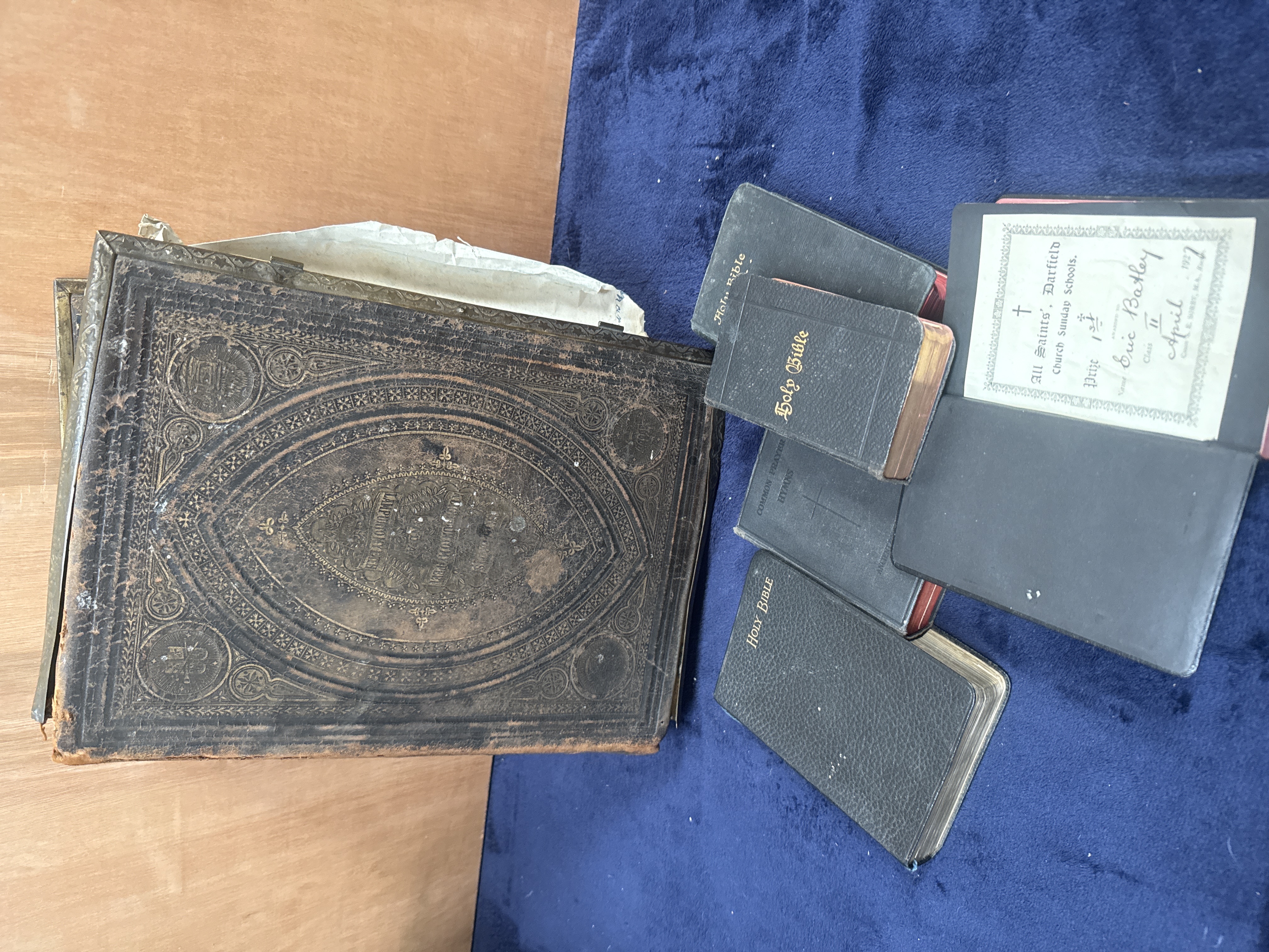 A collection of 6 items comprising a large Victorian family Bible and five smaller religious volumes. The family Bible is bound in heavily embossed black leather with ornate scrollwork and a central decorative medallion, containing a lithographed colour frontispiece titled The Holy Bible Containing The Old and New Testaments. The five smaller volumes include pocket-sized Bibles and hymnals bound in black leather, some with gold-stamped titles and gilded page edges. One volume contains a prize presentation label from All Saints, Darfield Church Sunday Schools, awarded to Eric Batley in April 1927.