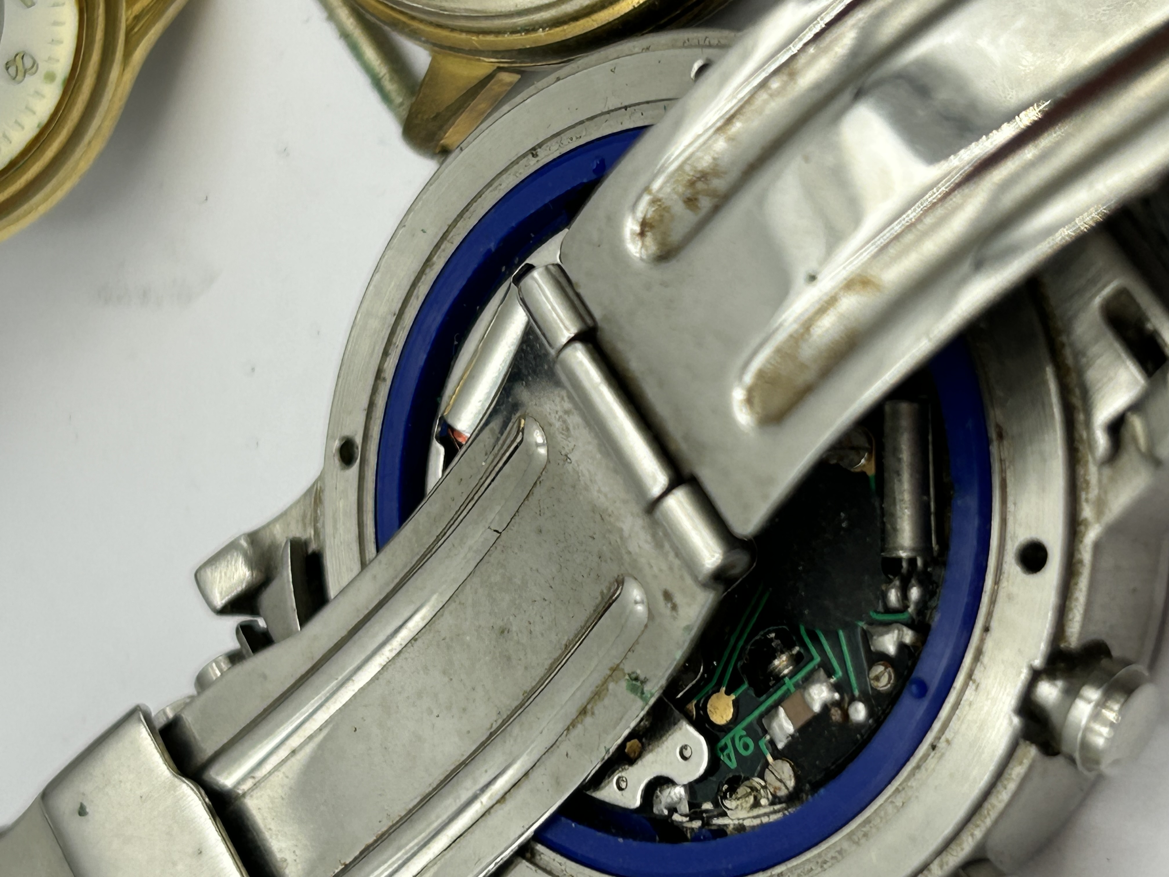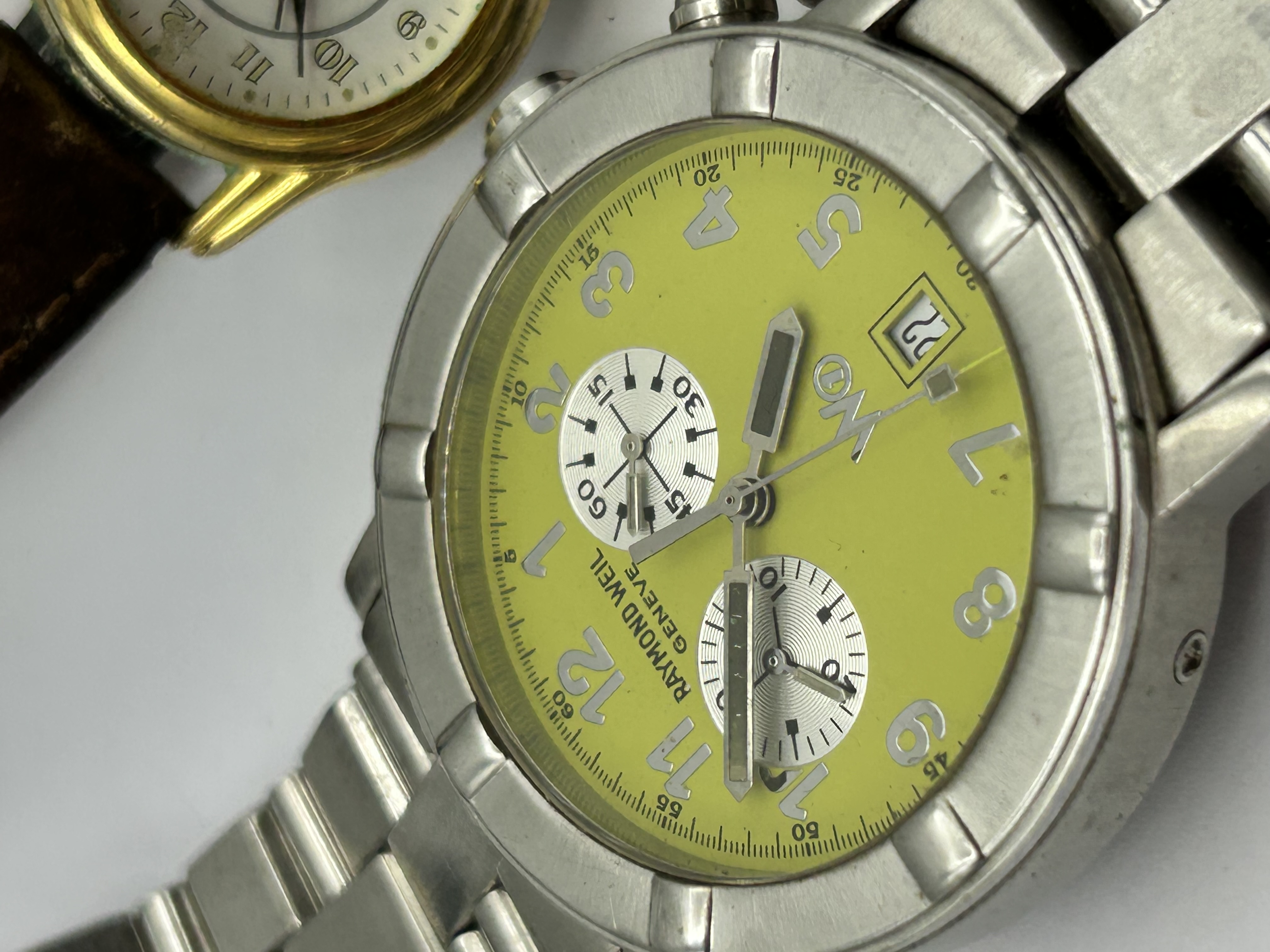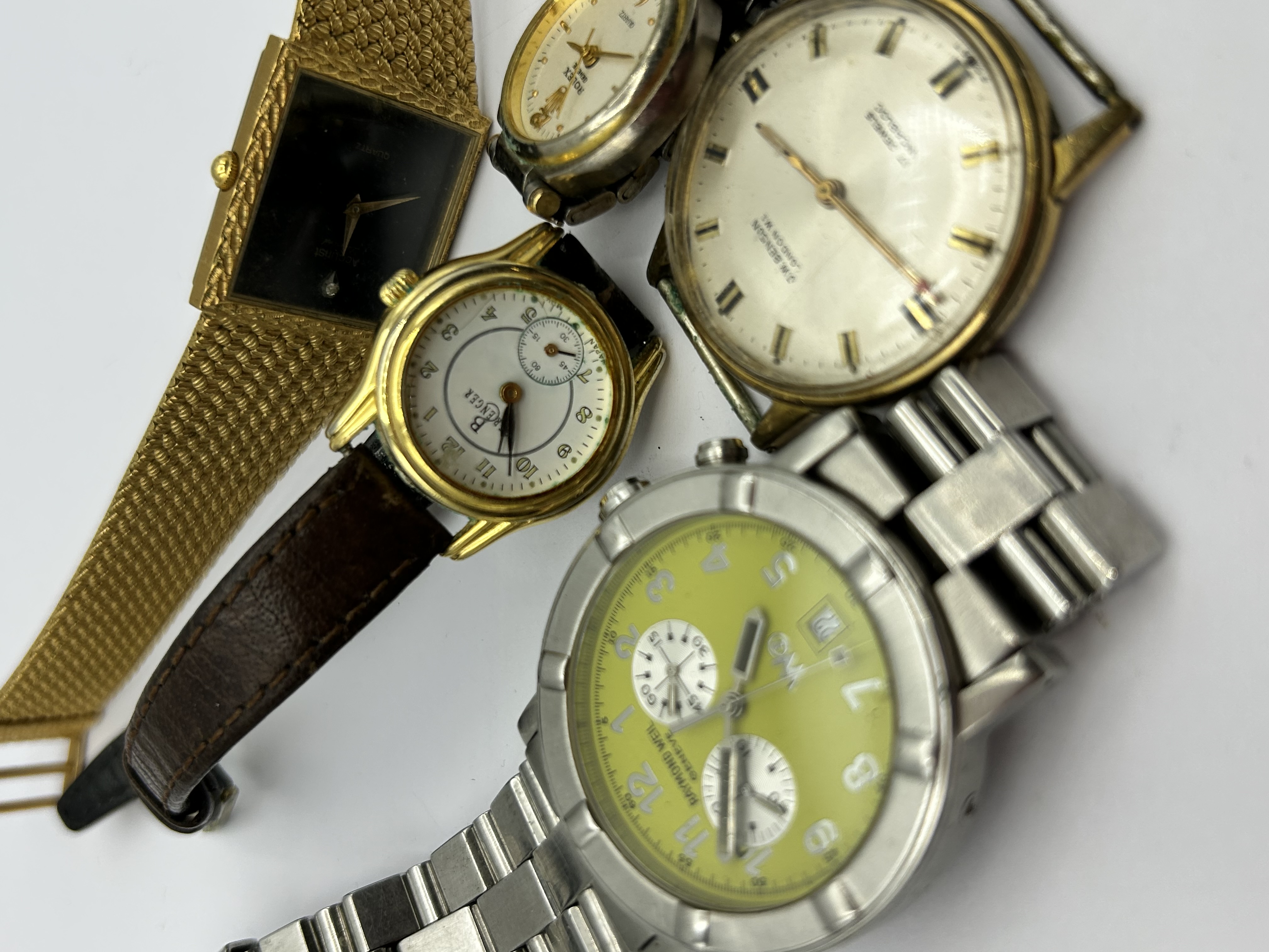 A collection of assorted wristwatches featuring various makers and styles. The group includes a Raymond Weil Geneve W1 chronograph with a stainless steel case, a bright yellow dial, two sub-dials, and a date aperture. Also present is a J.W. Benson London W.1 manual-wind wristwatch with a gold-tone case and a dial marked 17 Jewels Incabloc. The collection further contains a square Accurist quartz watch with a black dial and integrated textured gold-tone bracelet, a B Ranger watch with a sub-second dial on a brown leather strap, and a small round wristwatch marked Rolex. The pieces are constructed from stainless steel and gold-tone base metals.