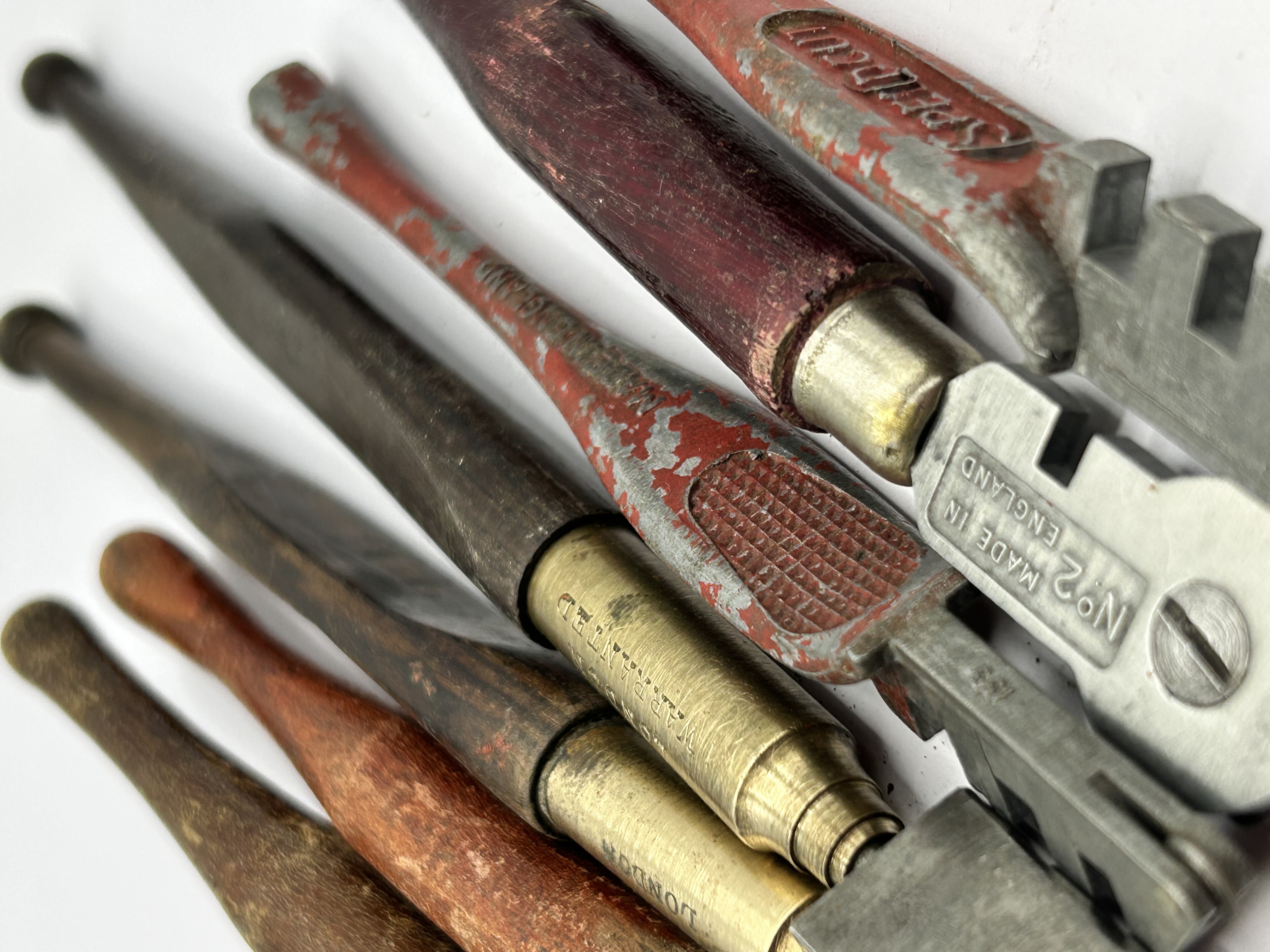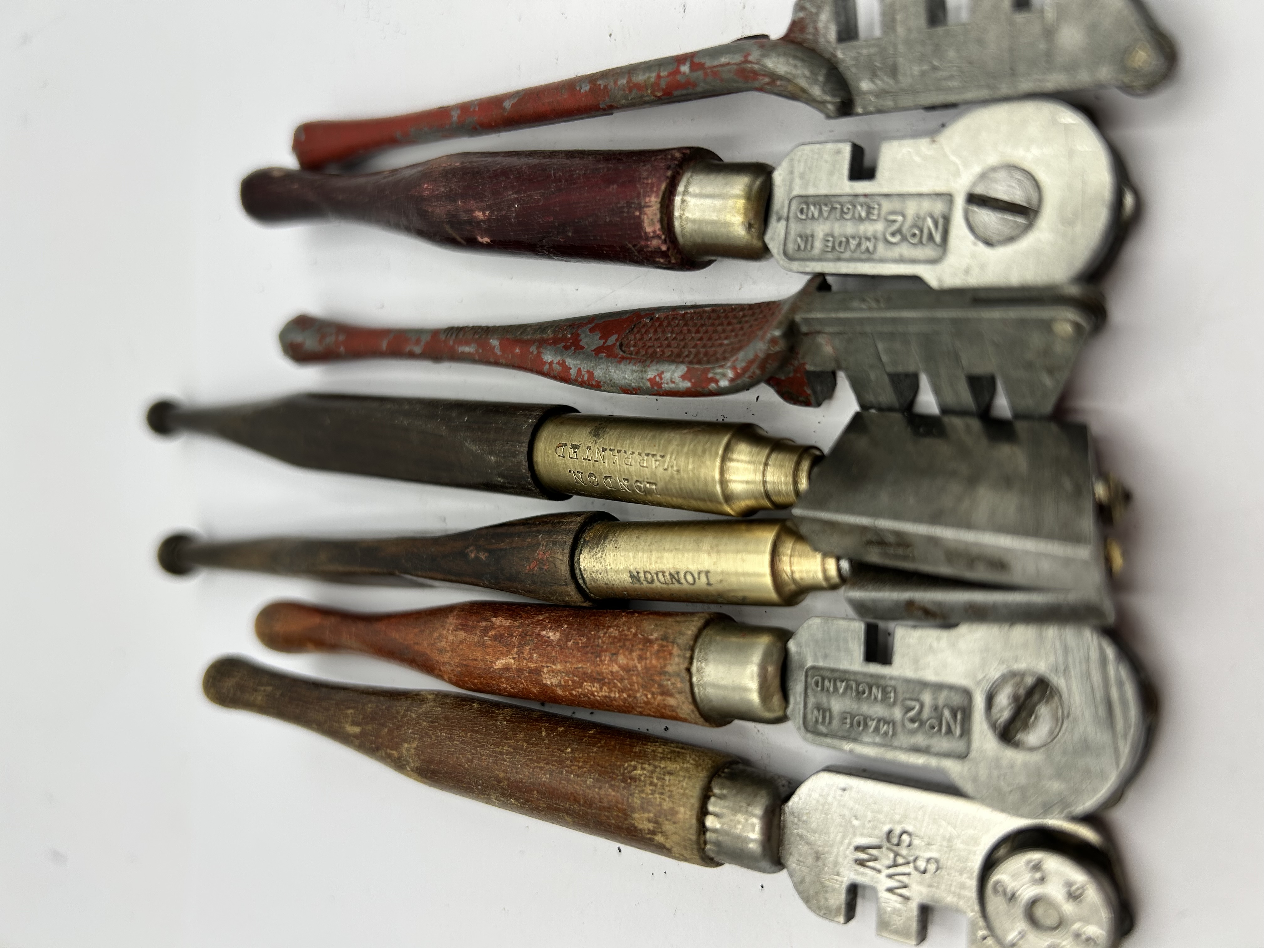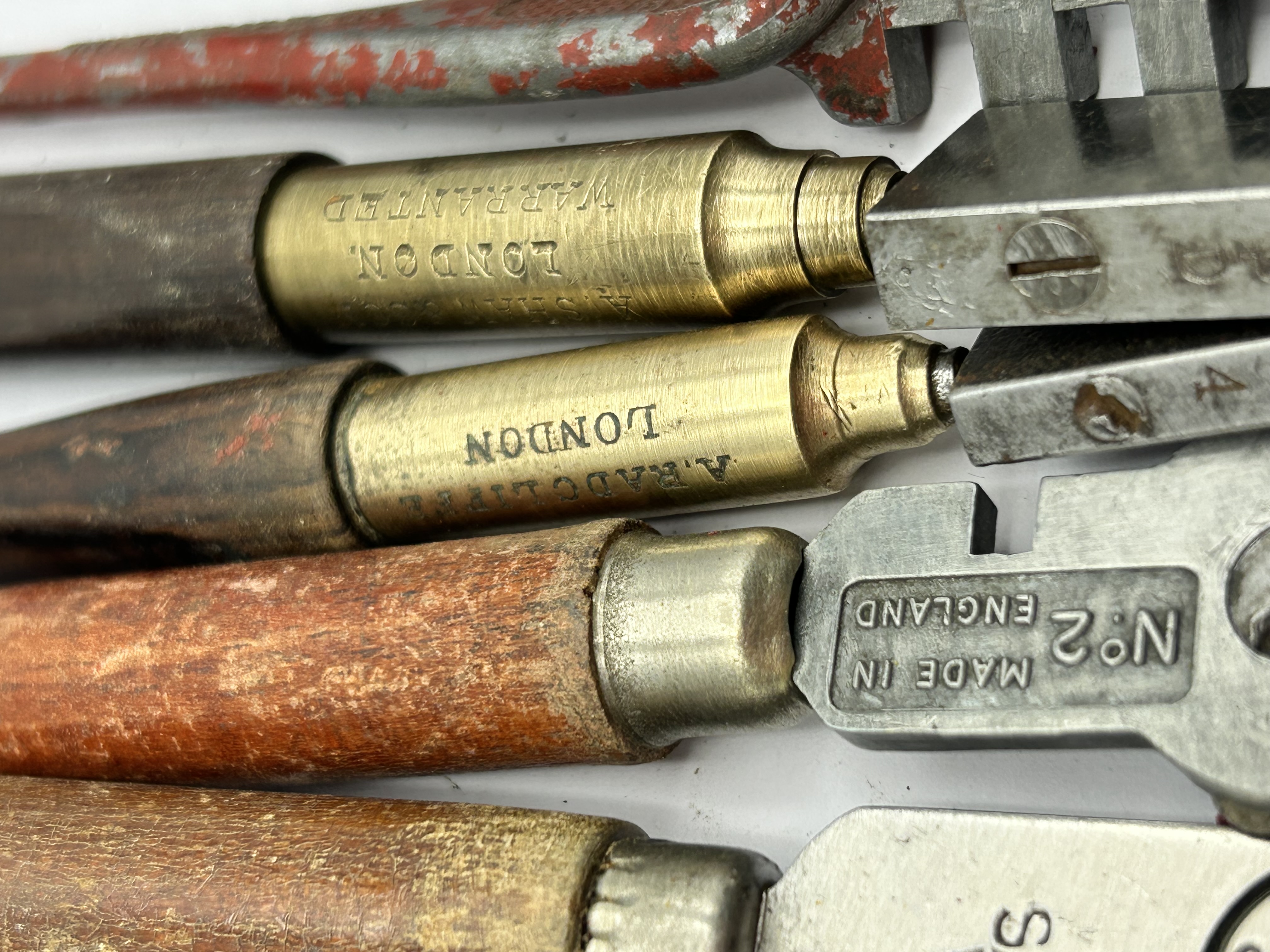 A collection of vintage and antique glass cutters of various designs and manufacture. The assortment includes tools with turned wooden handles, brass sleeves, and cast metal heads. Notable markings include brass components stamped LONDON and WARRANTED, with one example further marked A. RADCLIFFE. Two cast metal cutters are stamped MADE IN ENGLAND and Nº 2. One example features a red-painted textured handle marked SPEED CUT, while another bears the mark SAW W. The collection comprises both wheel-type and traditional glazier tool forms.