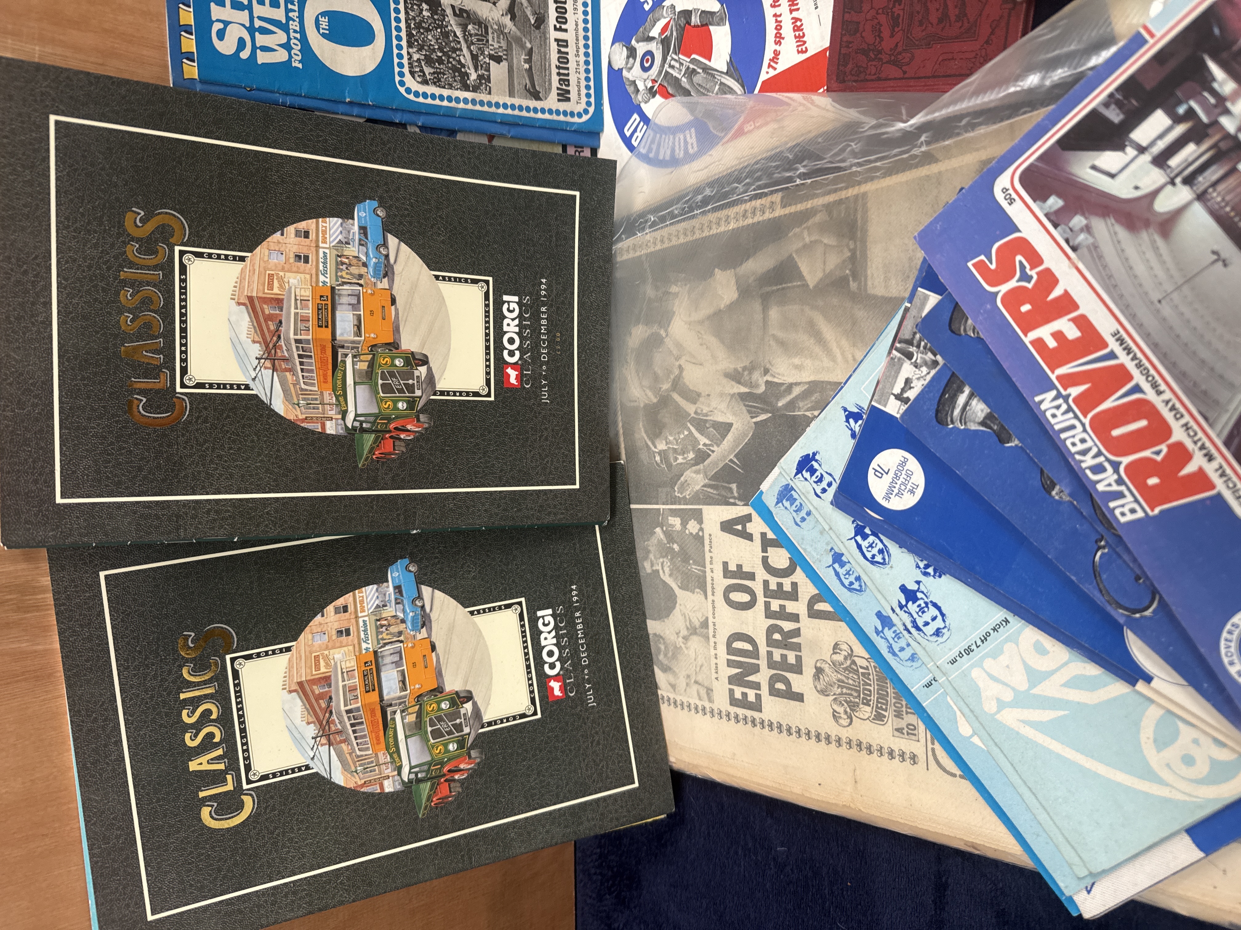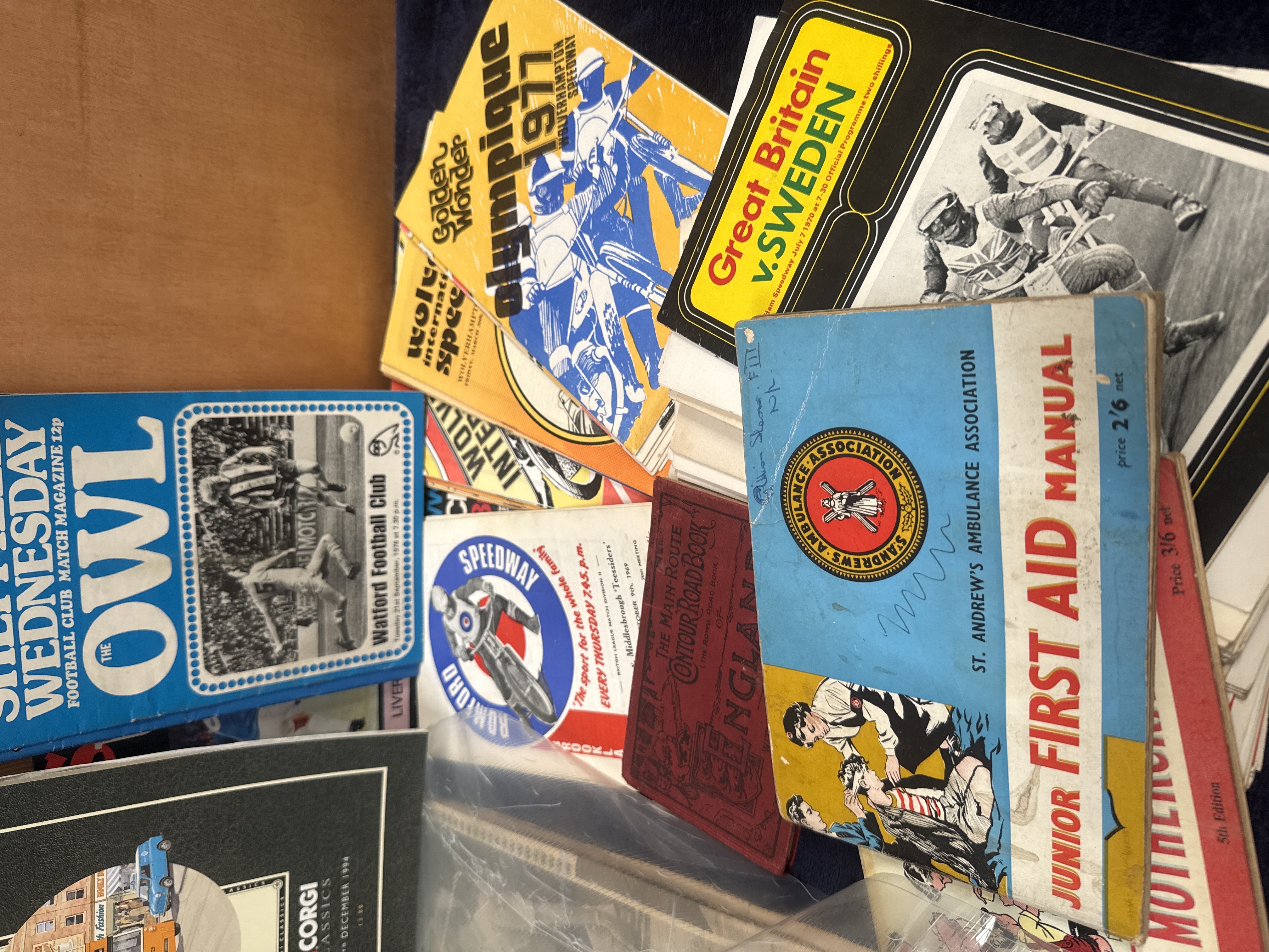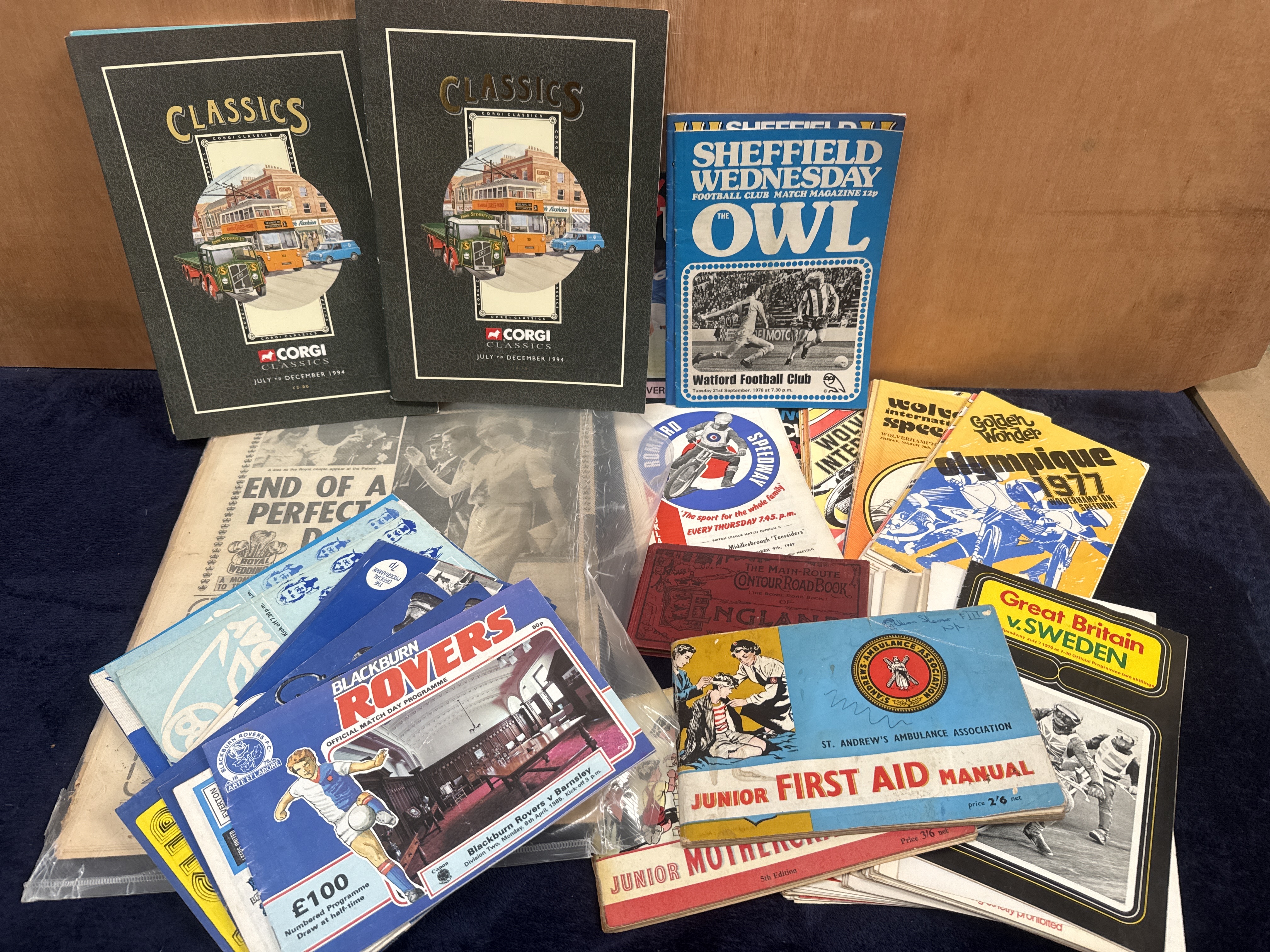 An assortment of mid to late 20th-century paper ephemera and booklets. The collection includes various football matchday programmes, notably Sheffield Wednesday v Watford (1976) and Blackburn Rovers v Barnsley (1985). Speedway interest is represented by items such as the 1977 Golden Wonder Olympique at Wolverhampton, a 1970 Great Britain v Sweden international programme at Wimbledon, and a Romford Speedway programme. The lot features two Corgi Classics die-cast model trade catalogues dating from July to December 1994. Educational and reference material includes a St. Andrew’s Ambulance Association Junior First Aid Manual, a Junior Mothercraft manual, and The Main-Route Contour Road Book of England. Also present is a newspaper supplement titled End of a Perfect Day regarding a royal wedding. The items are printed on various paper and cardstock.