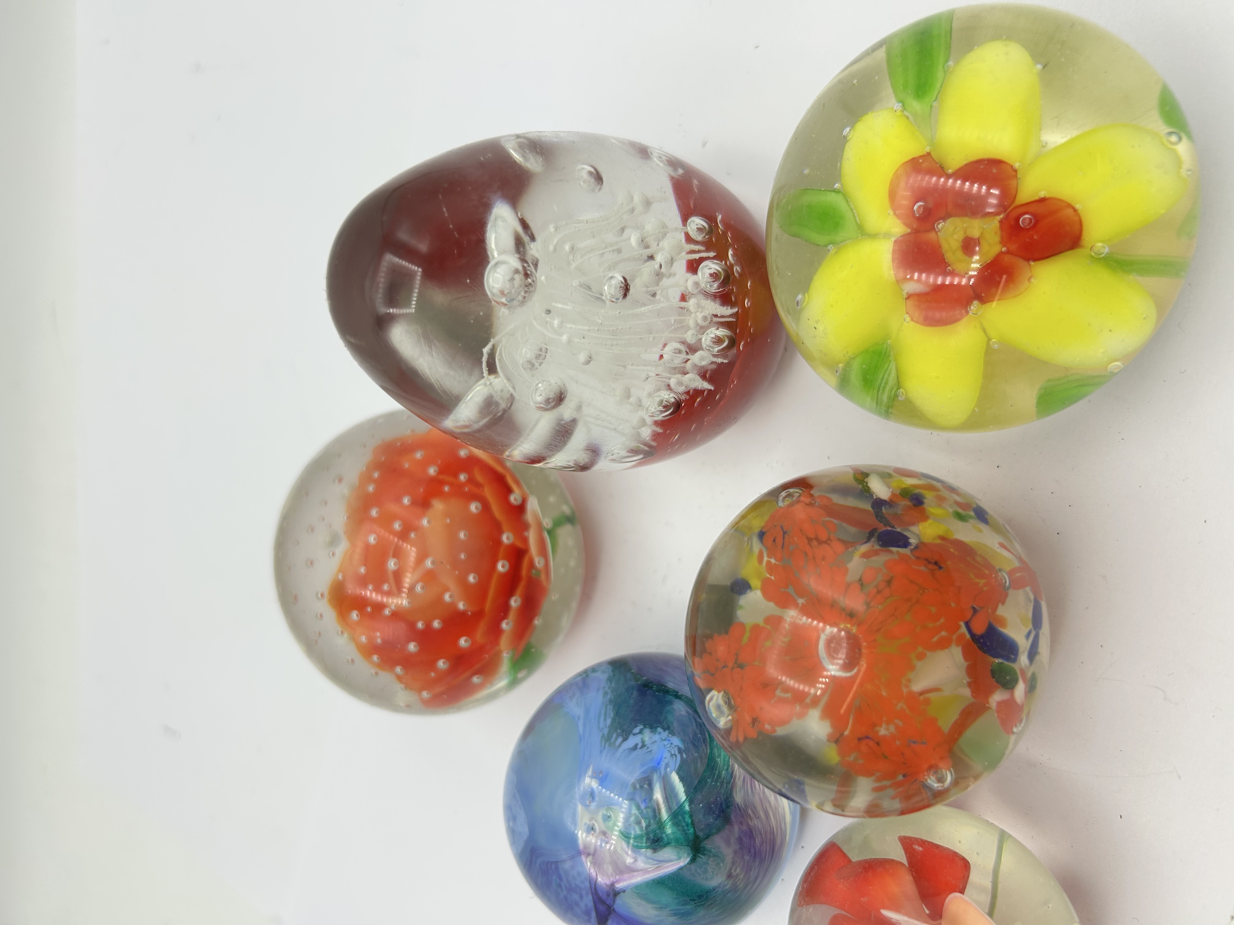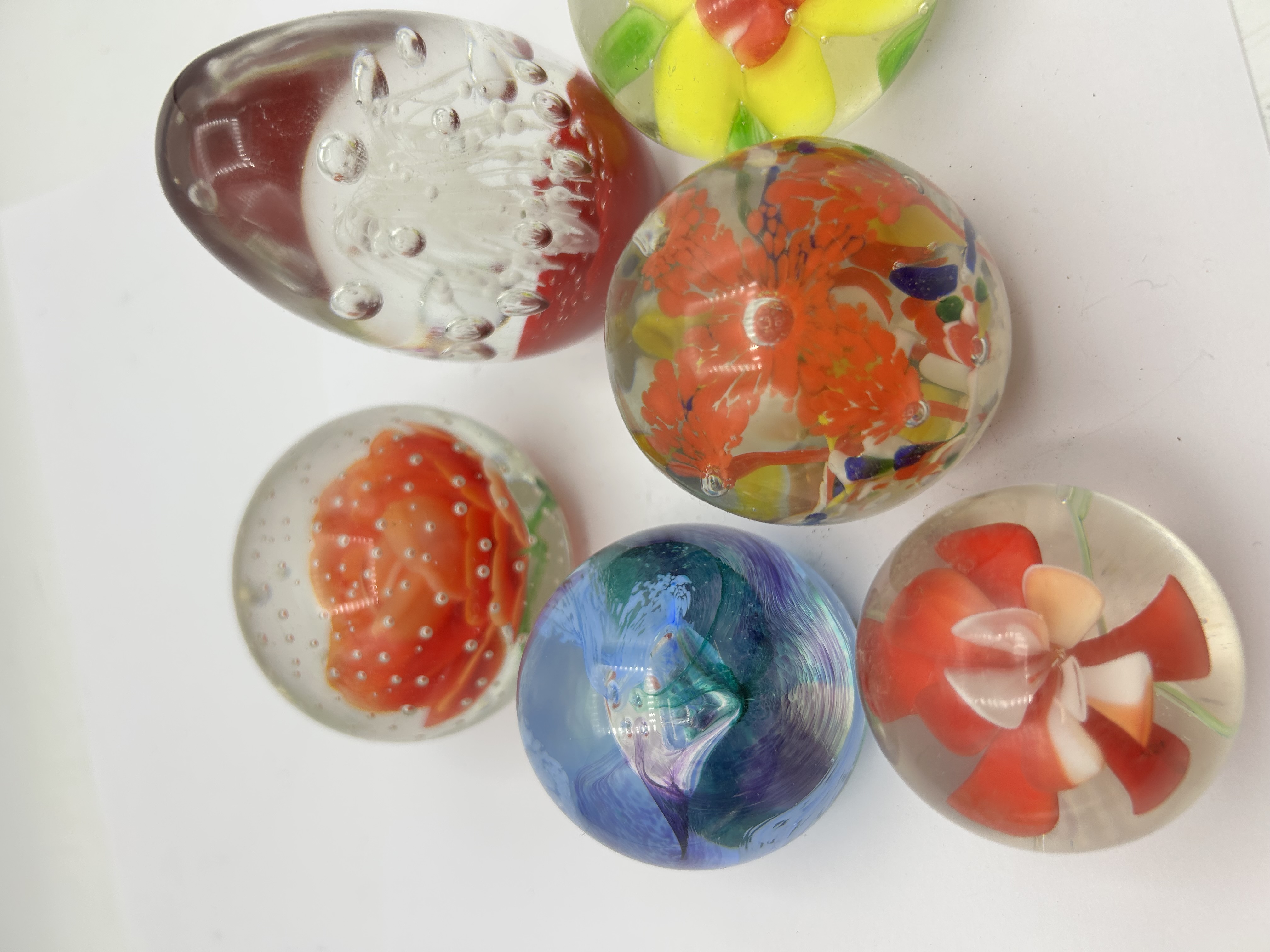 A collection of art glass paperweights of various forms including spherical and one egg-shaped example. The group features internal designs such as millefiori-style floral motifs in shades of yellow, red, and orange, alongside abstract blue and purple swirls. One piece displays a controlled bubble effect over a white and red base. The items are crafted from clear glass with smooth polished surfaces.