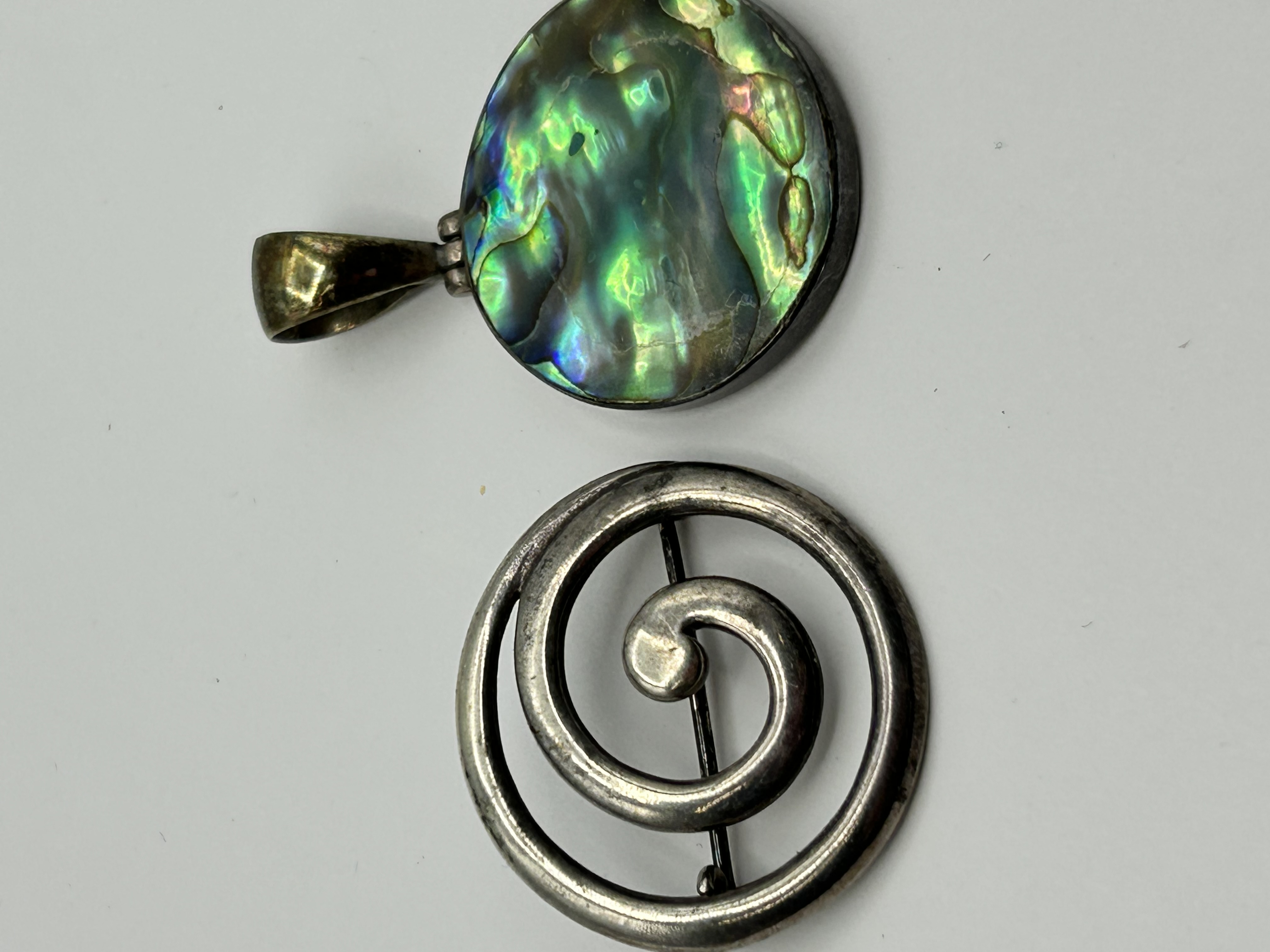 A group of two sterling silver jewellery items. The first is a circular pendant featuring an iridescent abalone shell inlay, also known as paua shell, set within a silver frame. The pendant is fitted with a wide tapered bail and has a neutral cream-coloured shell or stone backing. The second item is a modernist brooch designed in a stylized openwork spiral form with a pin-back fastener. Both pieces are stamped with 925 marks indicating sterling silver purity.