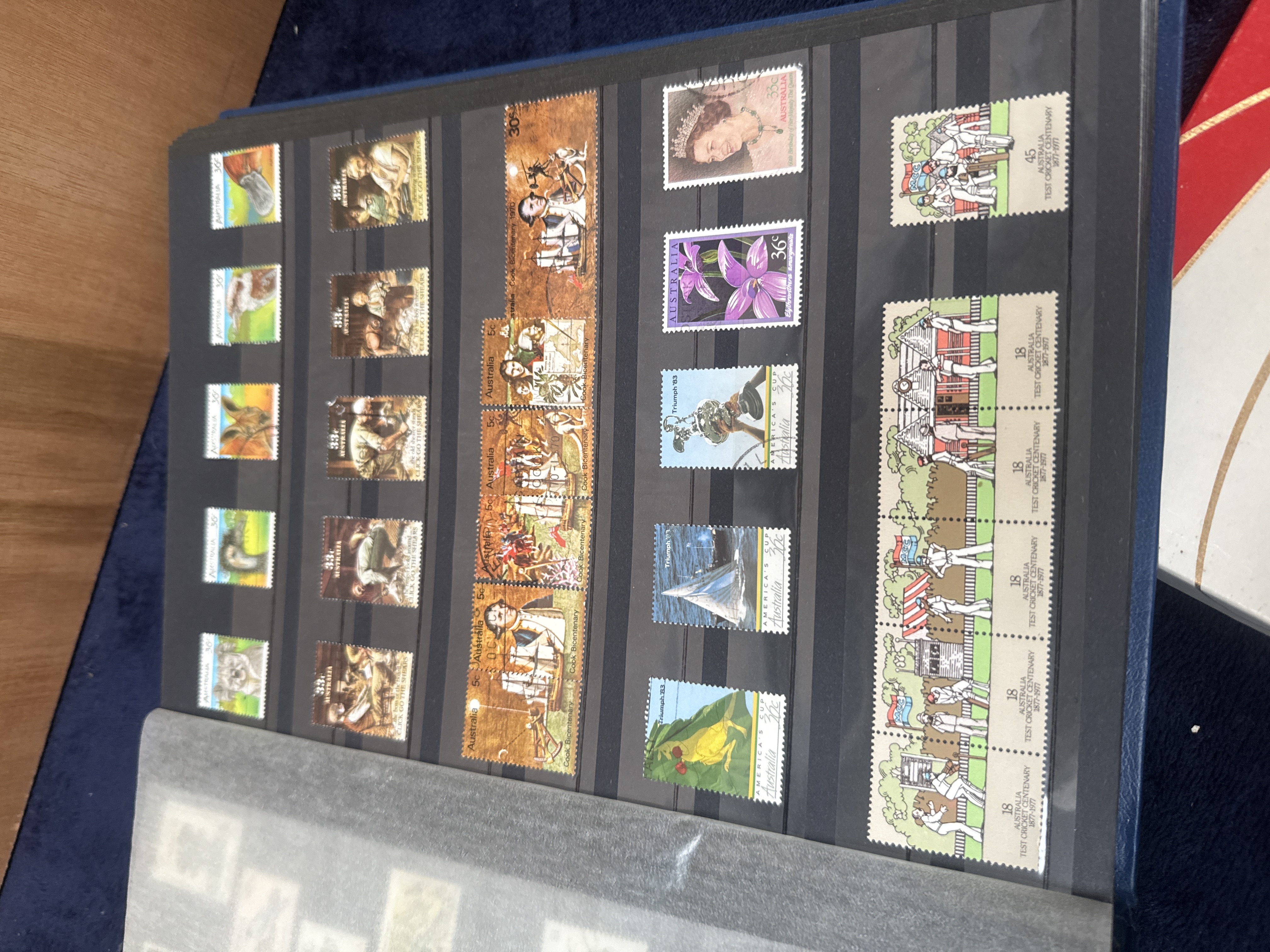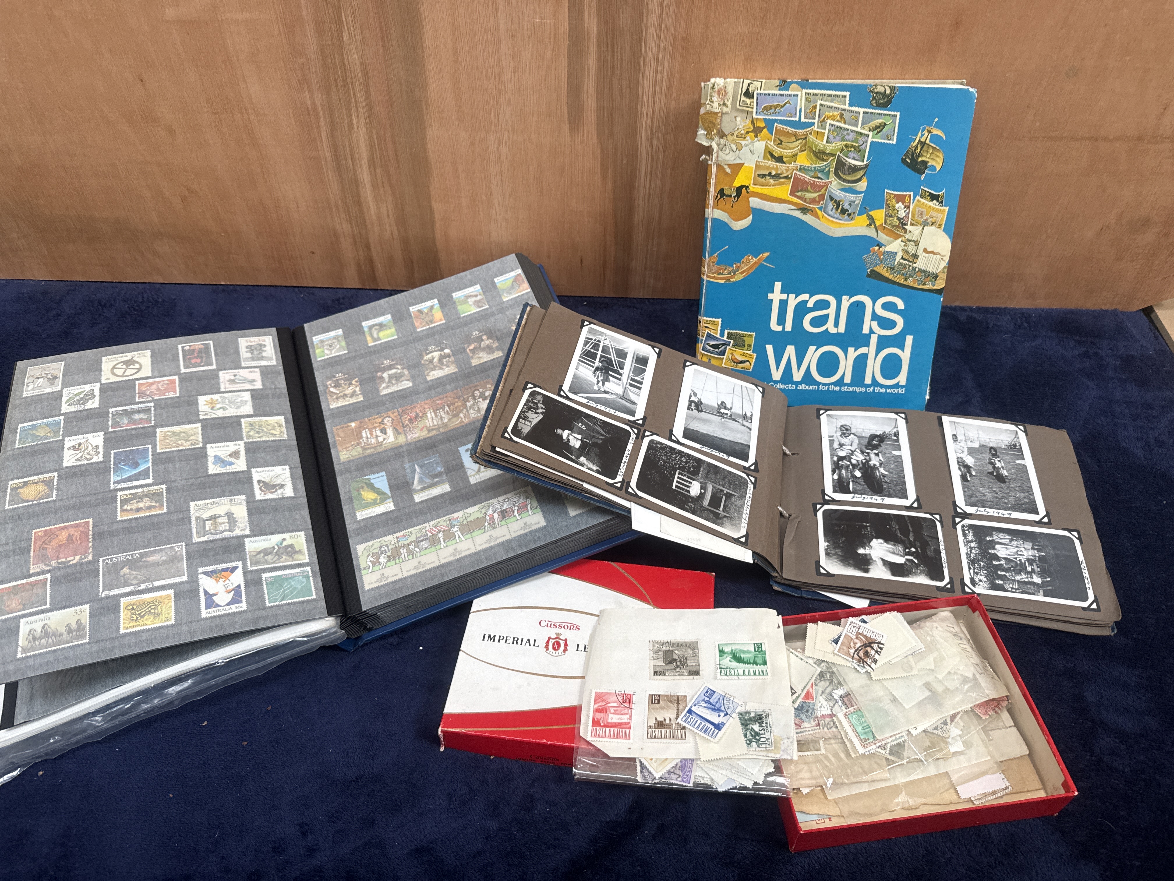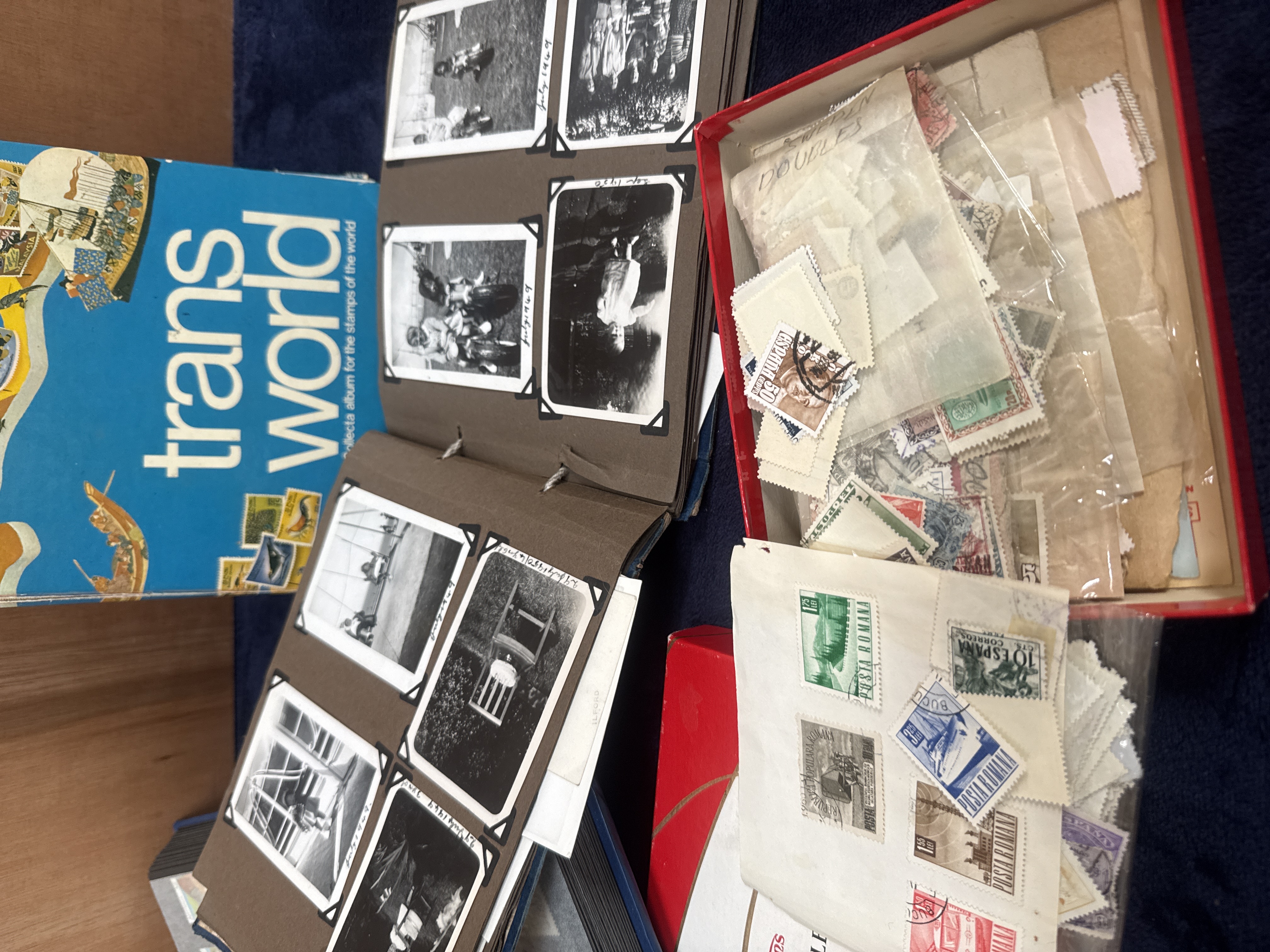 A philatelic and photographic collection comprising several albums and loose components. The group includes a large blue stockbook containing mid-to-late 20th-century international postage stamps from regions including Australia, Romania, and Spain. Also present is a blue paperback Trans World Collecta album for stamps of the world. A red Cussons Imperial Leather branded box contains various loose stamps and glassine envelopes, some marked as doubles. Accompanying the stamps is a vintage photograph album containing multiple black-and-white snapshots mounted with photo corners. Several photographs feature handwritten captions dated to 1949, depicting domestic scenes, portraits, and children. The stamps include various themes such as Australian wildlife, the America’s Cup, and the Test Cricket Centenary 1877-1977.