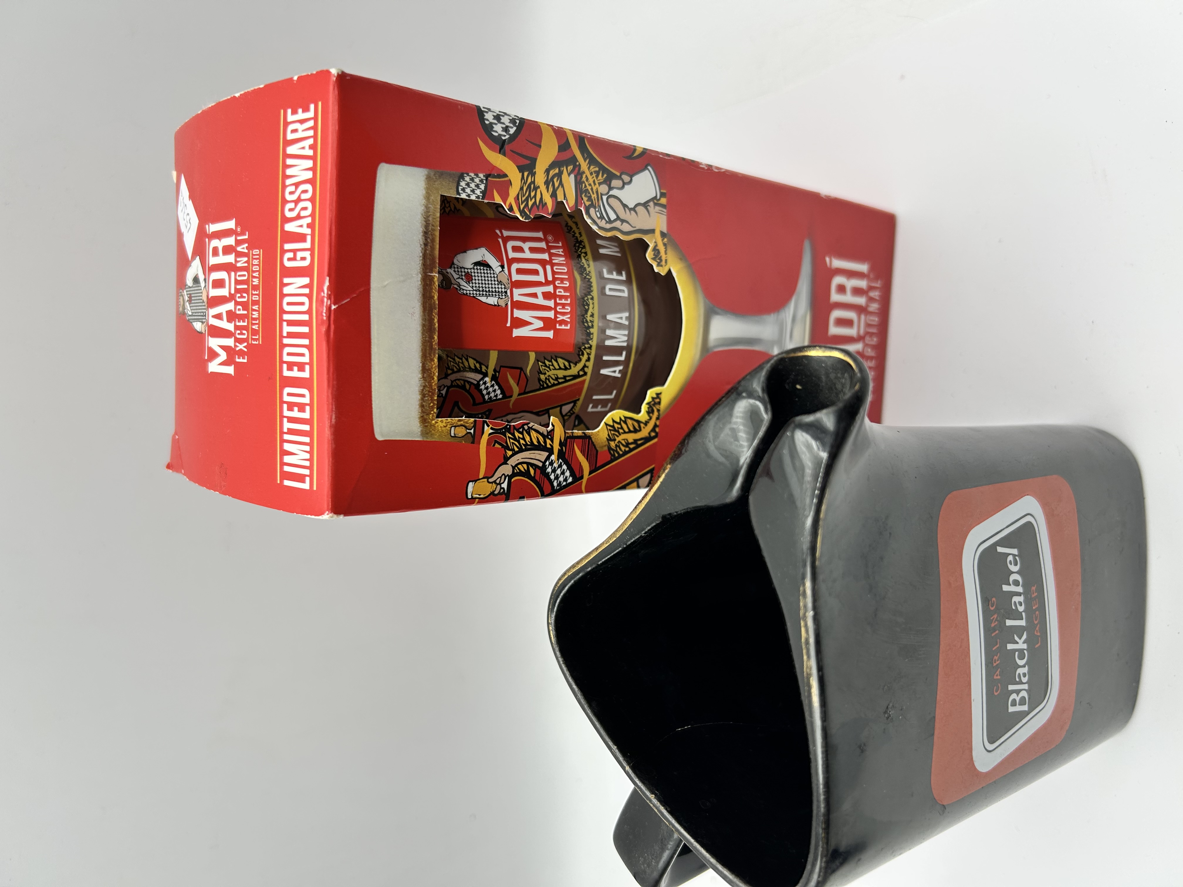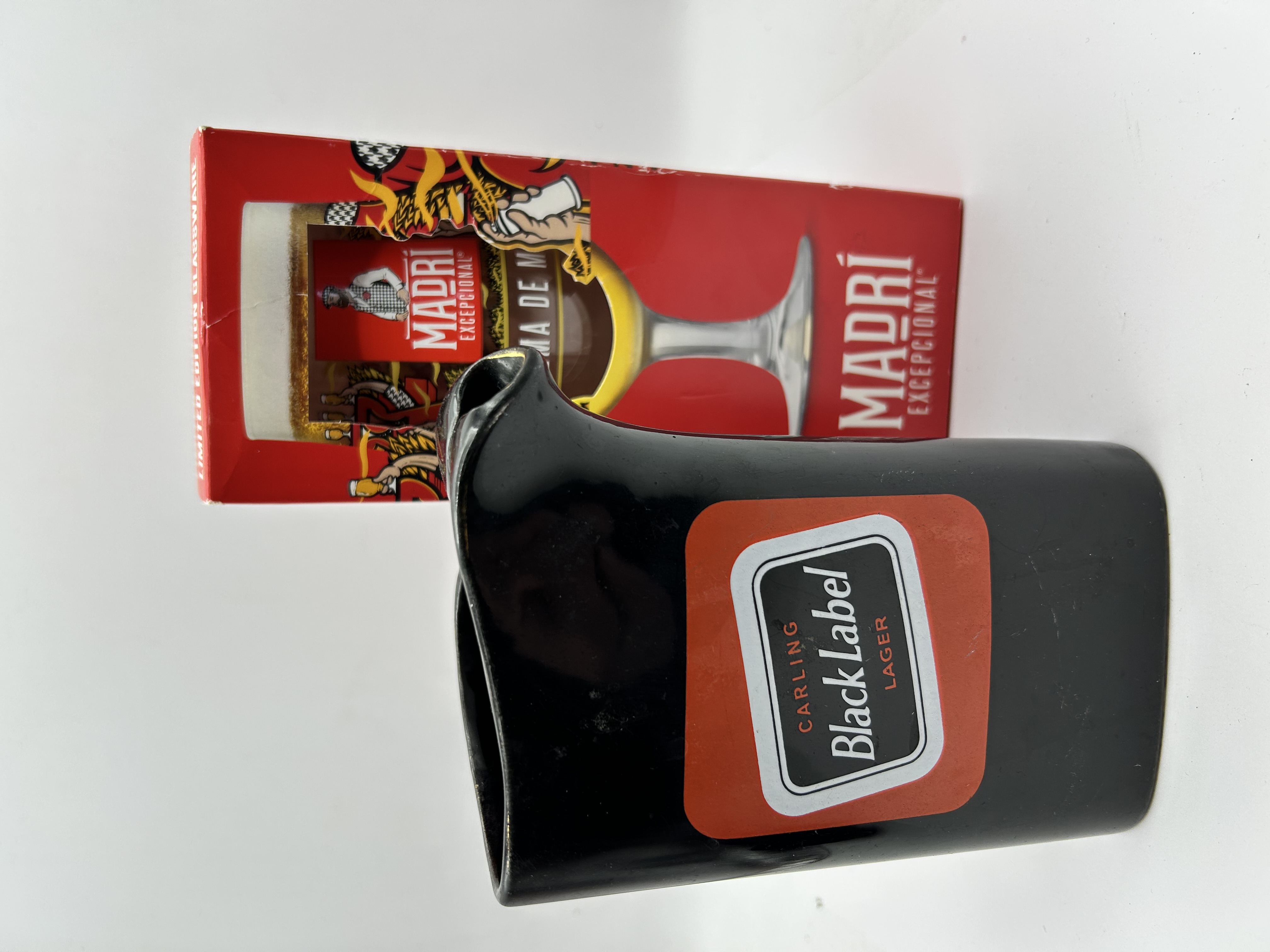 A group of two breweriana promotional items. The first is a ceramic water jug finished in a black glaze, featuring the Carling Black Label Lager logo to the body and a gilt-edged rim. Similar examples of this type are produced by makers such as Wade PDM. The second item is a Madri Excepcional limited edition glass, contained within its original red pictorial cardboard carton. The packaging is printed with the brand El Alma de Madrid slogan and associated graphics.