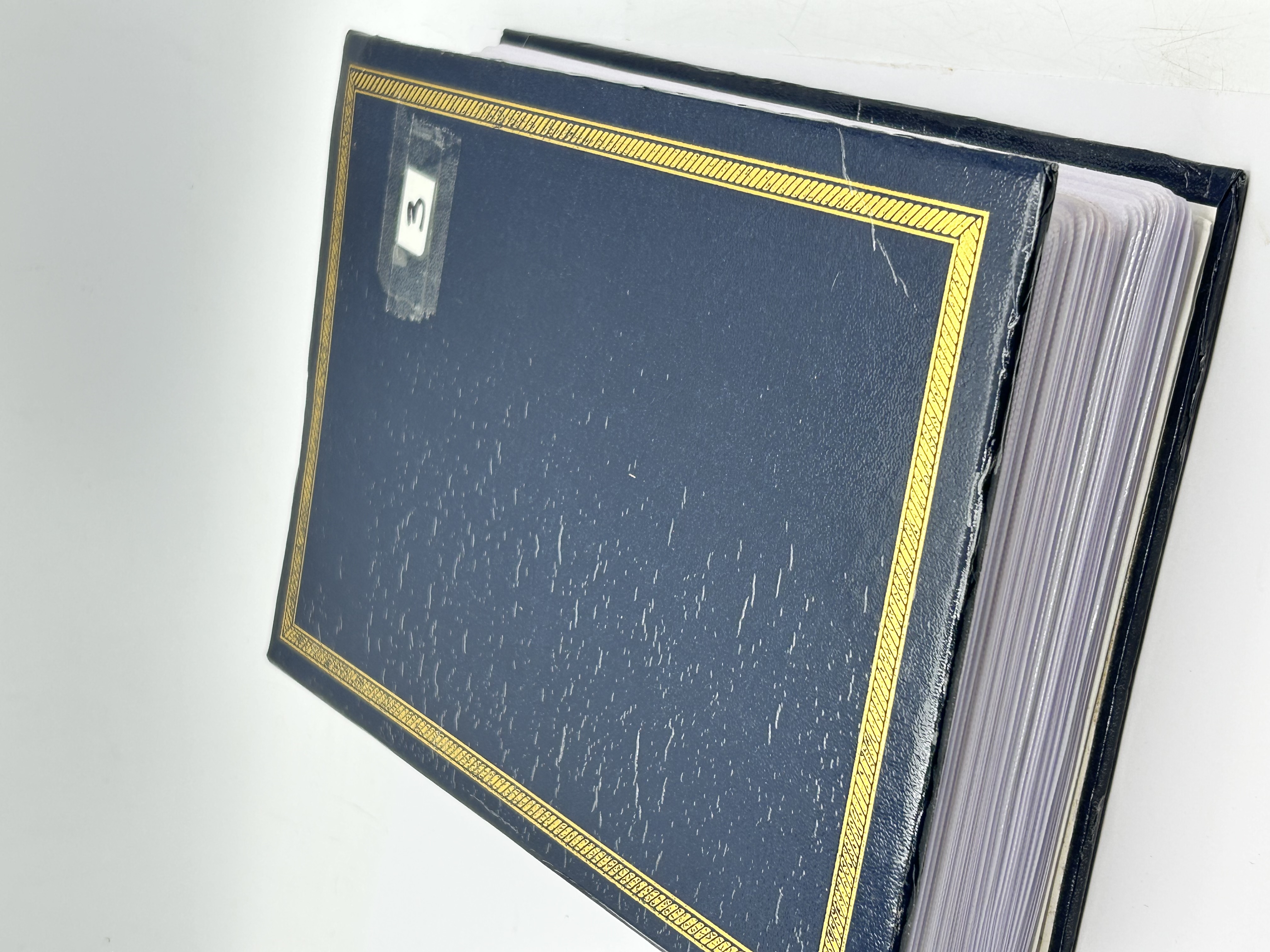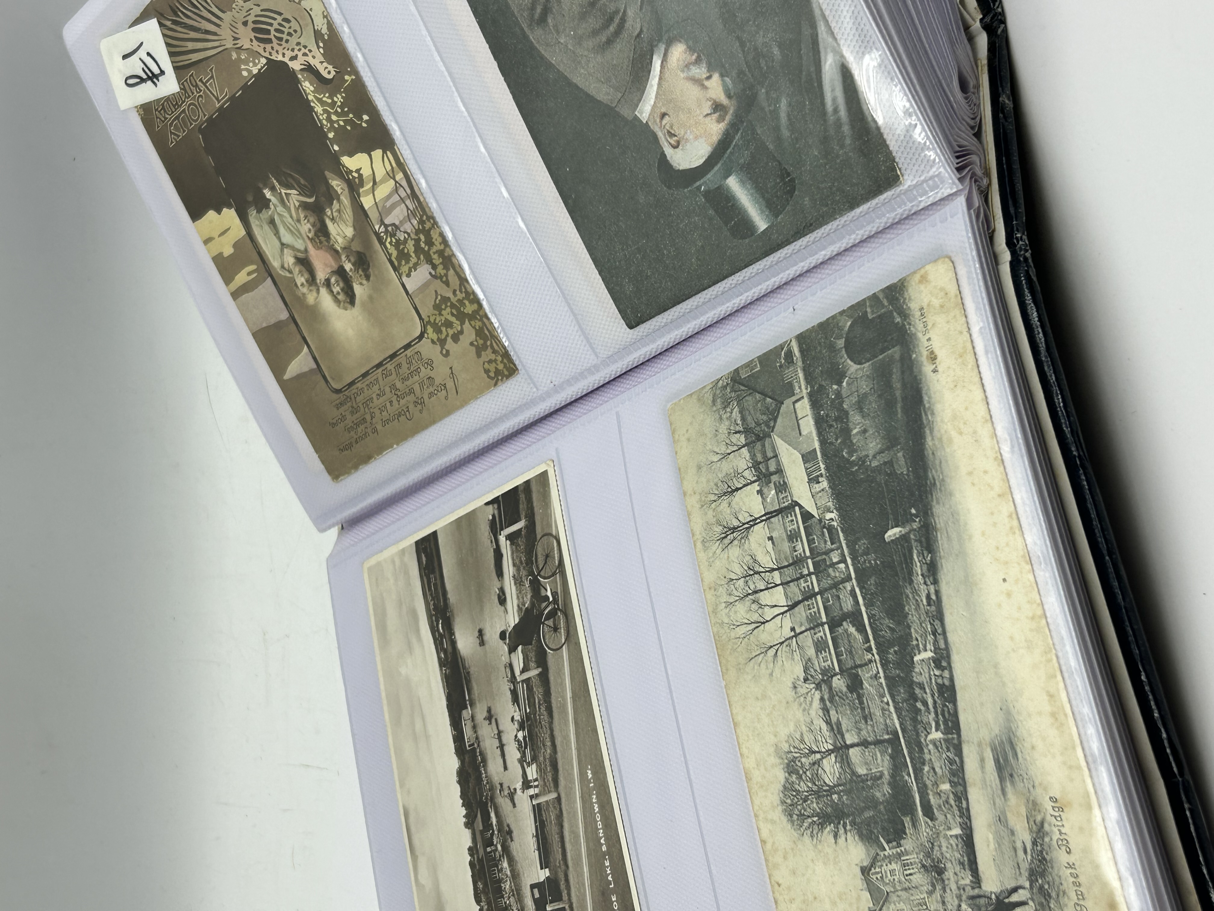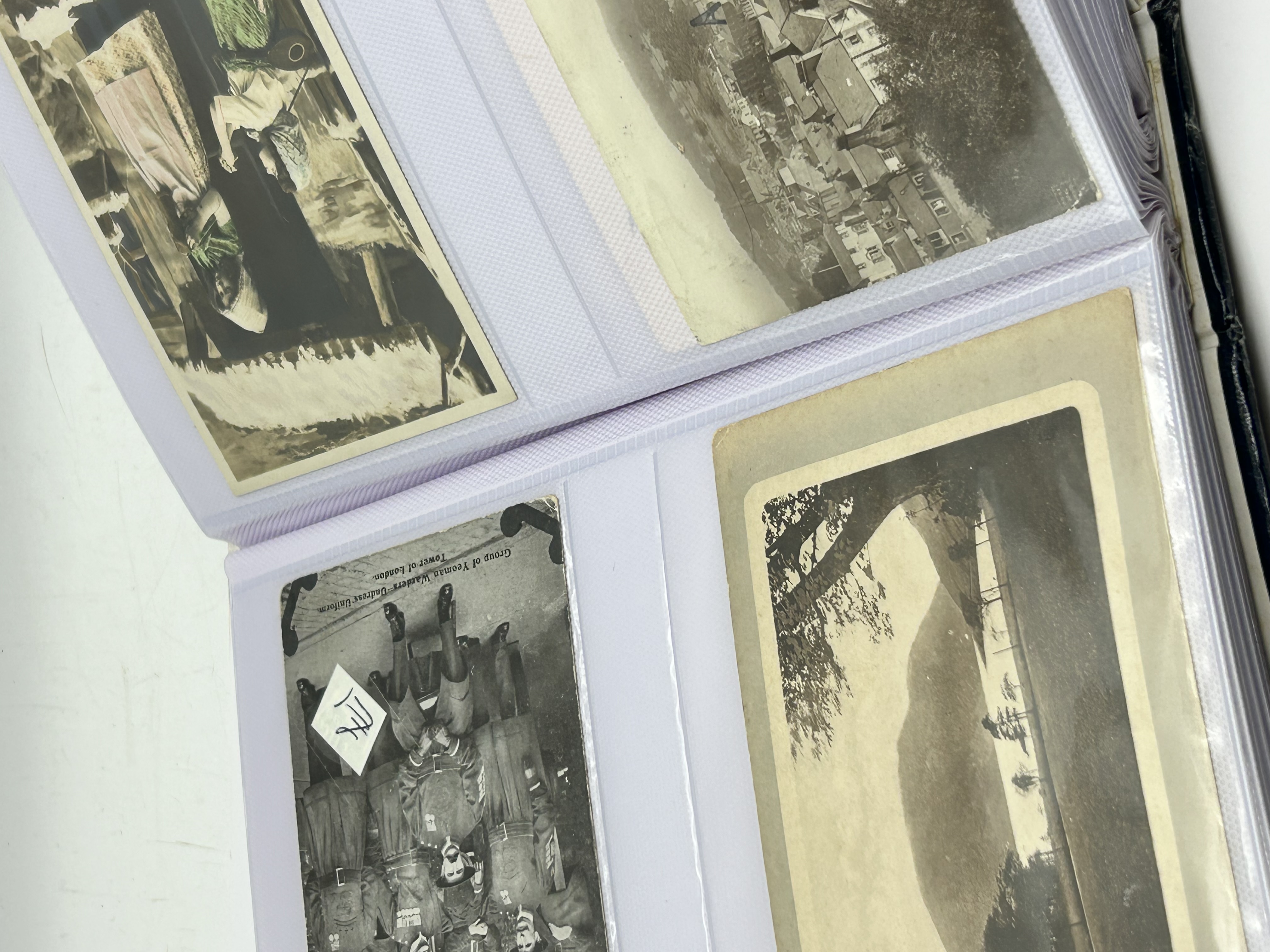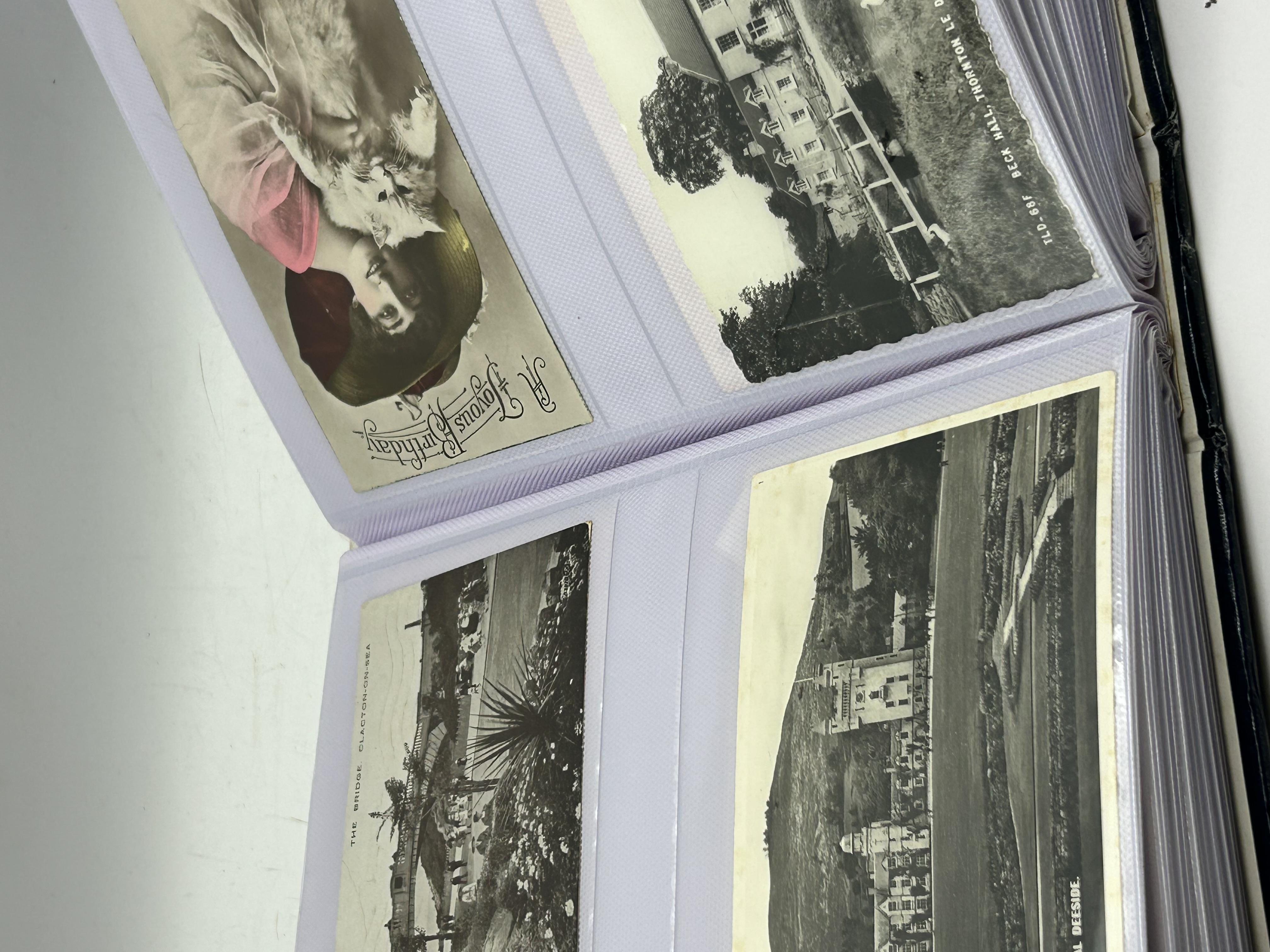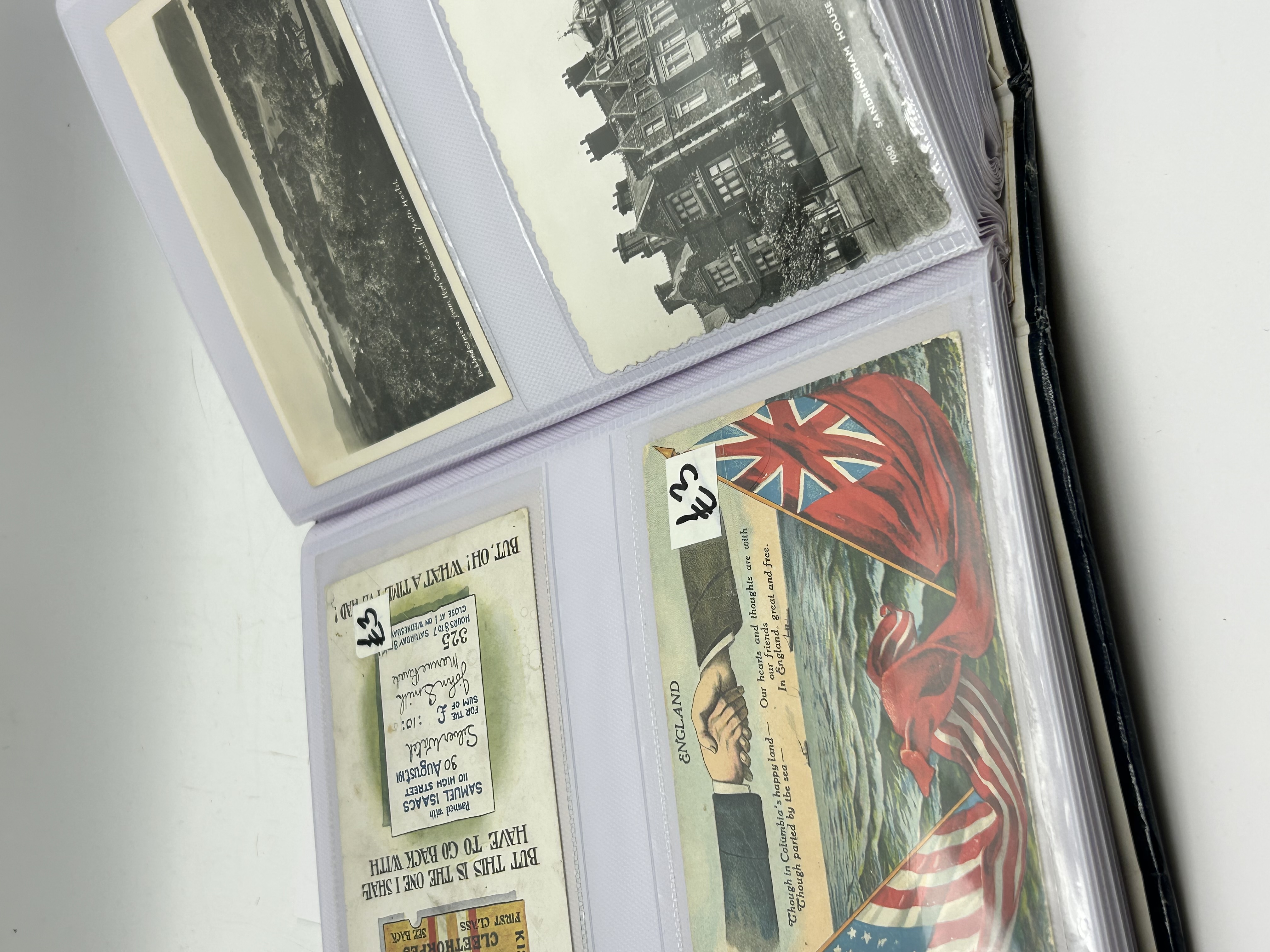 A collection of early to mid-20th-century postcards housed in a dark blue binder-style album with gold-toned decorative borders. The assortment includes various topographical black-and-white photographic views, illustrated greeting cards, and patriotic motifs. Notable subjects include a Group of Yeoman Warders at the Tower of London, Sandringham House, Clacton-on-Sea, and Thornton-le-Dale. Also present is an illustration titled England featuring the Union Jack and the Stars and Stripes. The cards are displayed within plastic sleeves.
