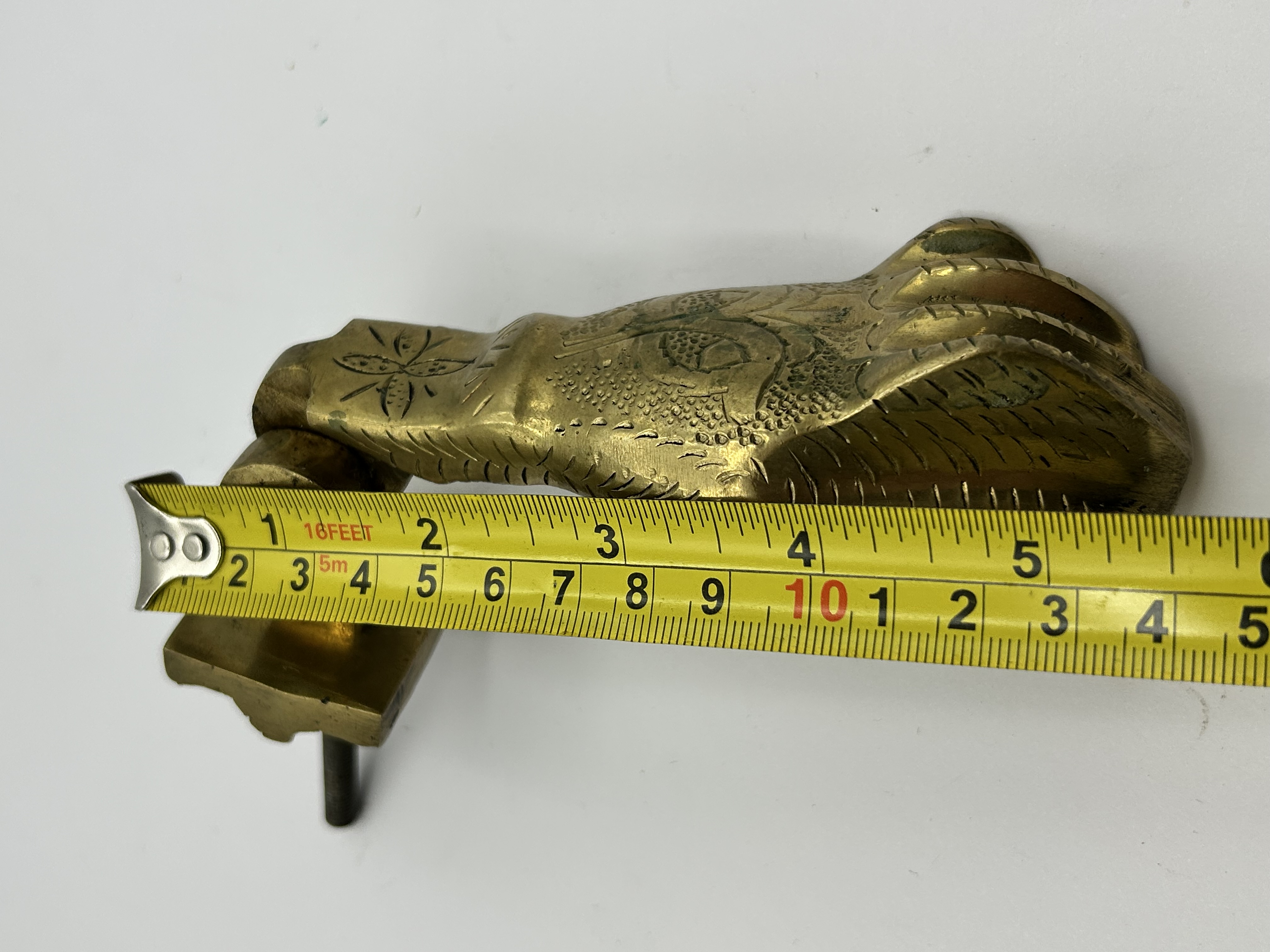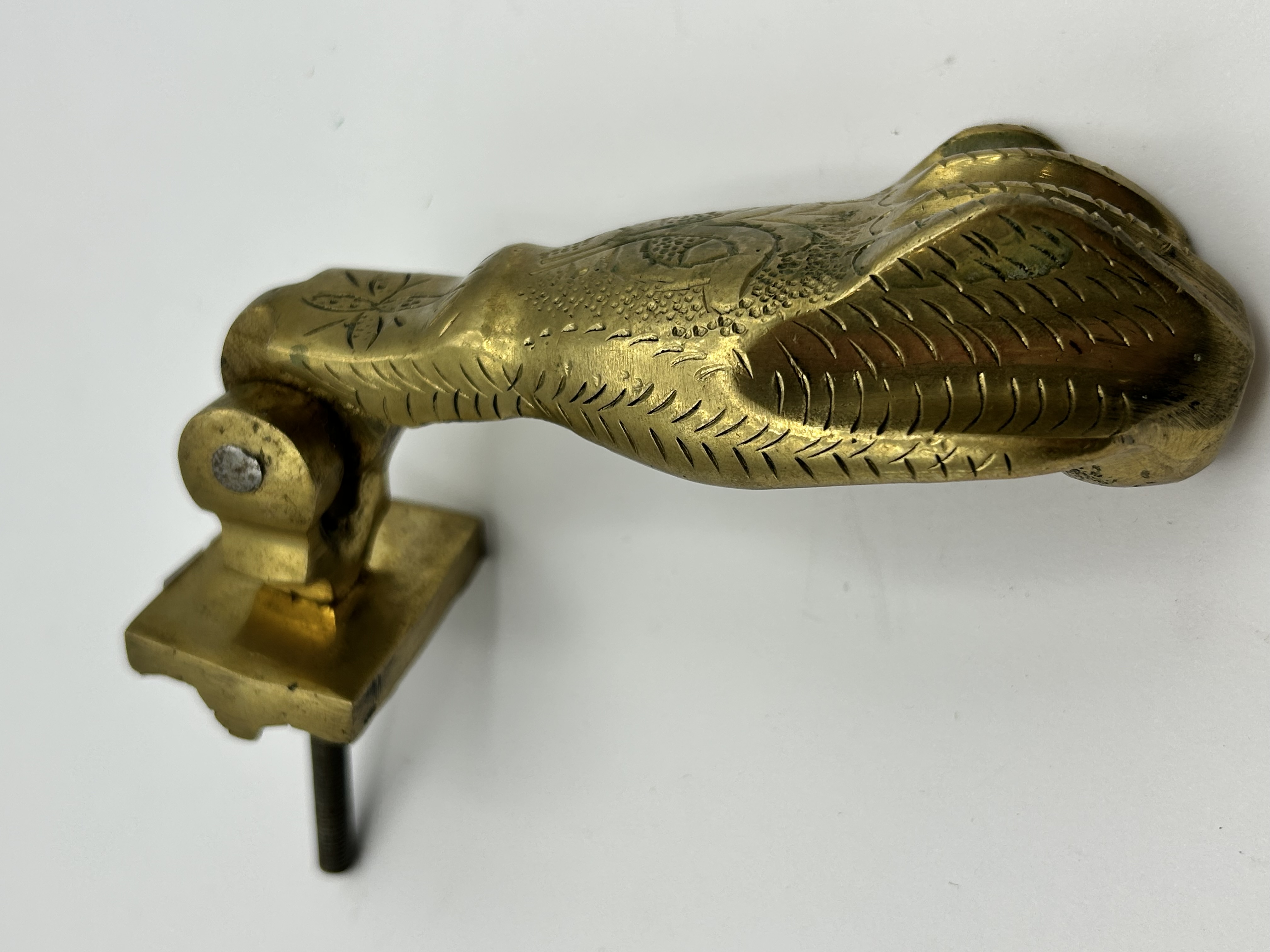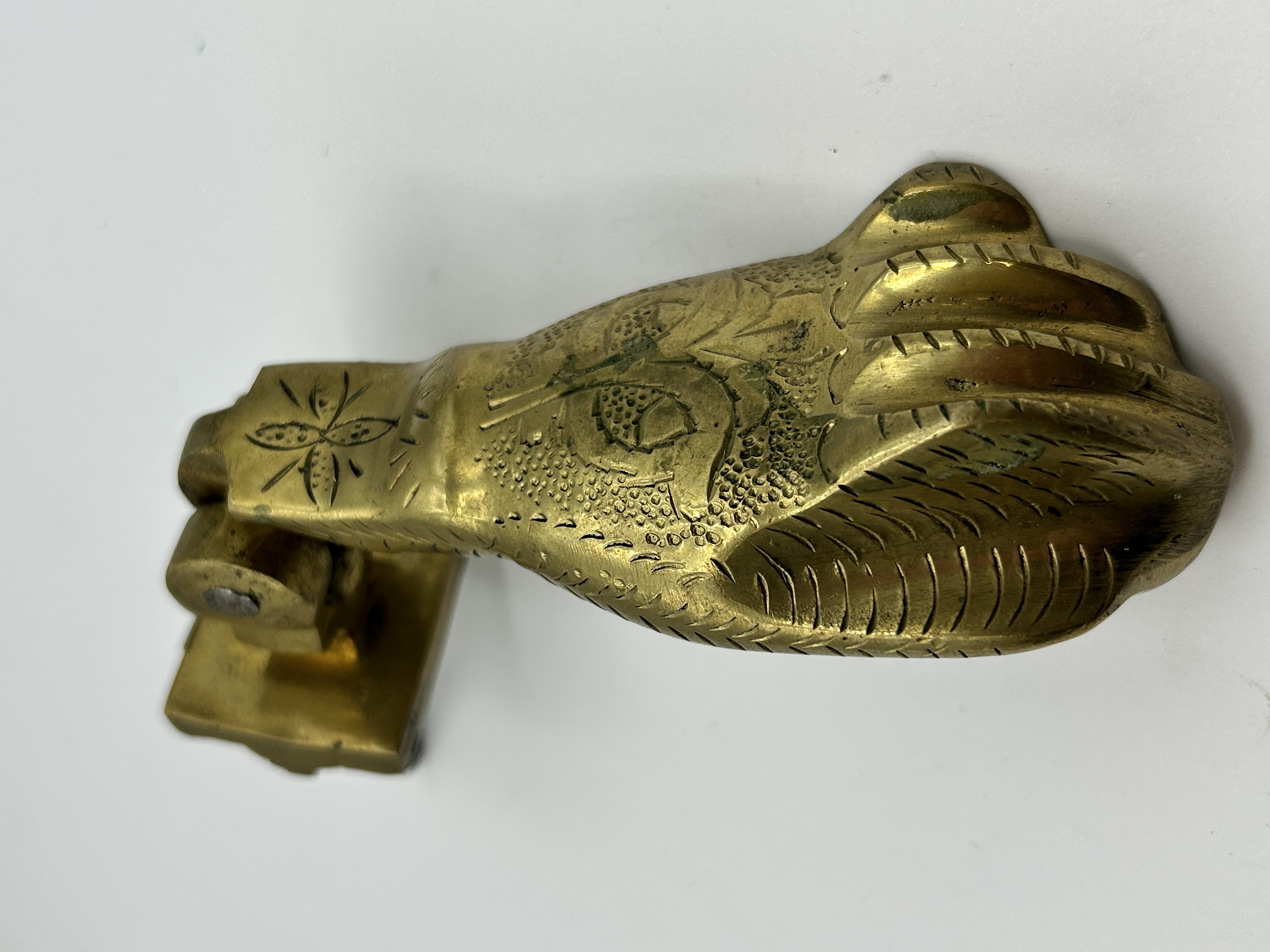 A cast brass door knocker in the figurative form of an avian foot or talon. The piece features intricate chased decorative details, including a stylised floral motif on the shank and textured, scale-like patterns across the main body. The knocker is hinged to a square mounting plate which includes a threaded attachment post for installation.