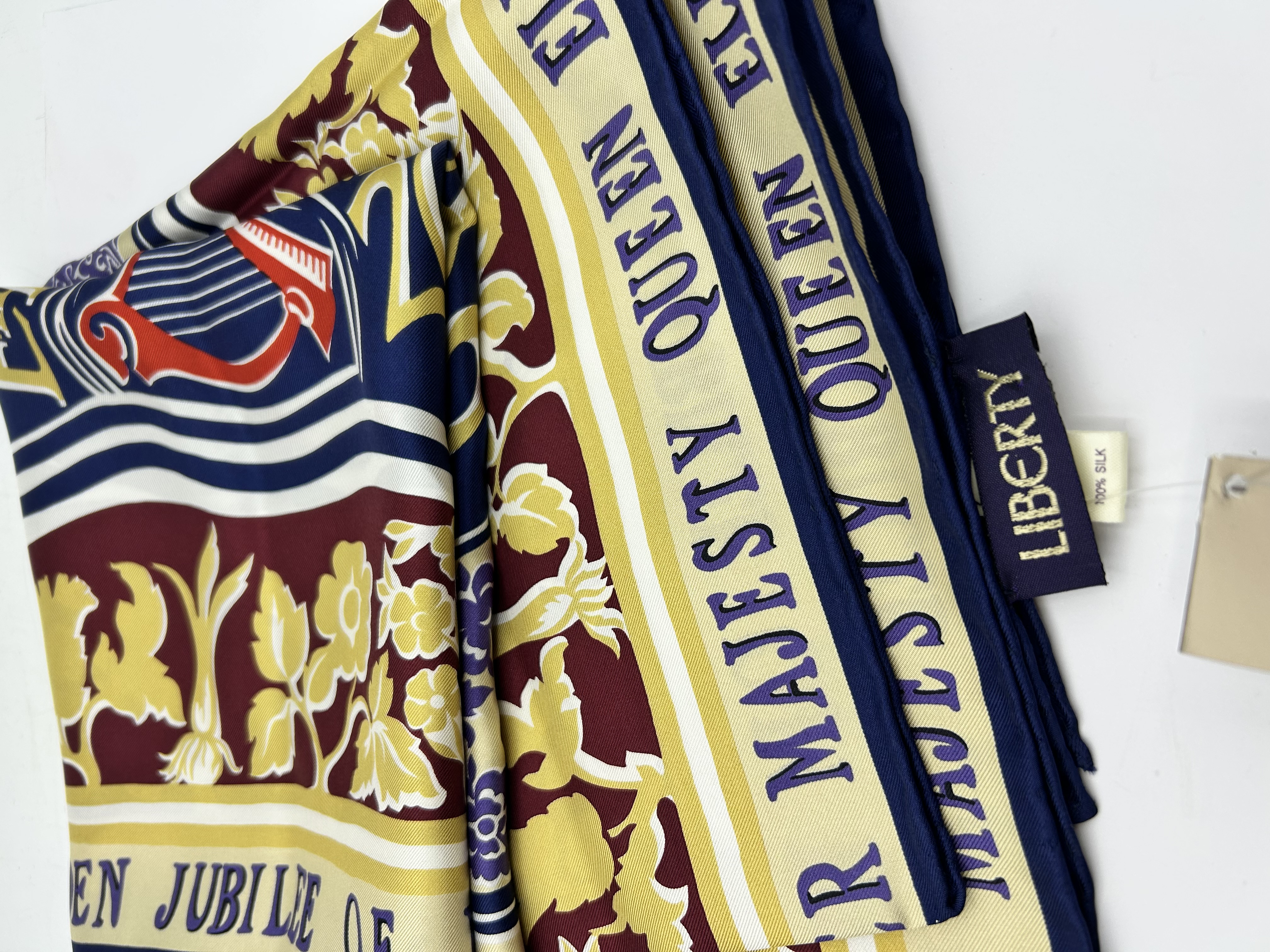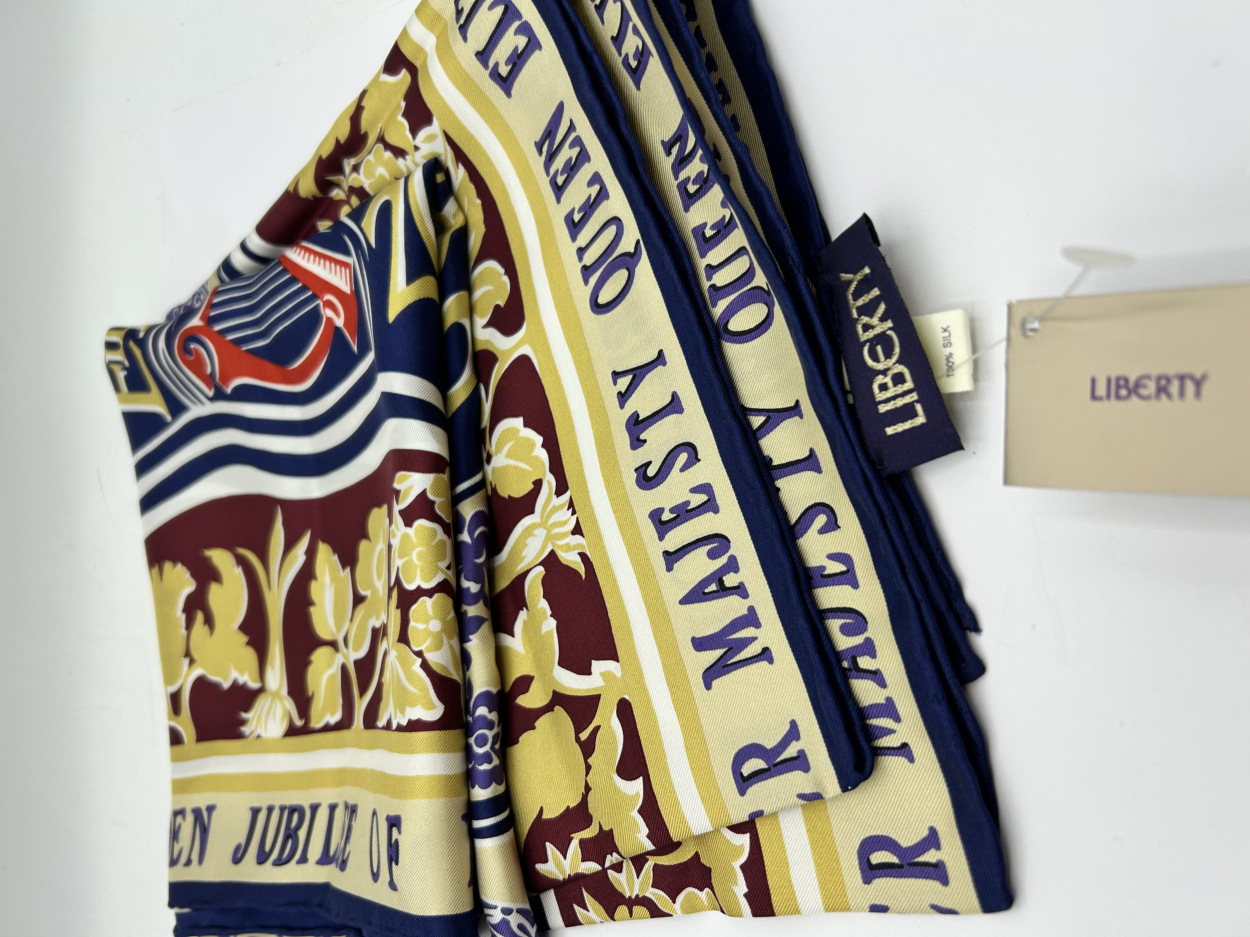 A 100% silk scarf produced by Liberty of London to commemorate the 2002 Golden Jubilee of Her Majesty Queen Elizabeth II. The scarf features a traditional colour palette of navy blue, burgundy, cream, and gold, decorated with heraldic and floral motifs including a red harp and various national floral emblems. Text along the borders reads HER MAJESTY QUEEN ELIZABETH and GOLDEN JUBILEE OF. The piece is finished with hand-rolled edges and includes a woven LIBERTY brand tag, a 100% SILK composition label, and an original cardboard retail tag.