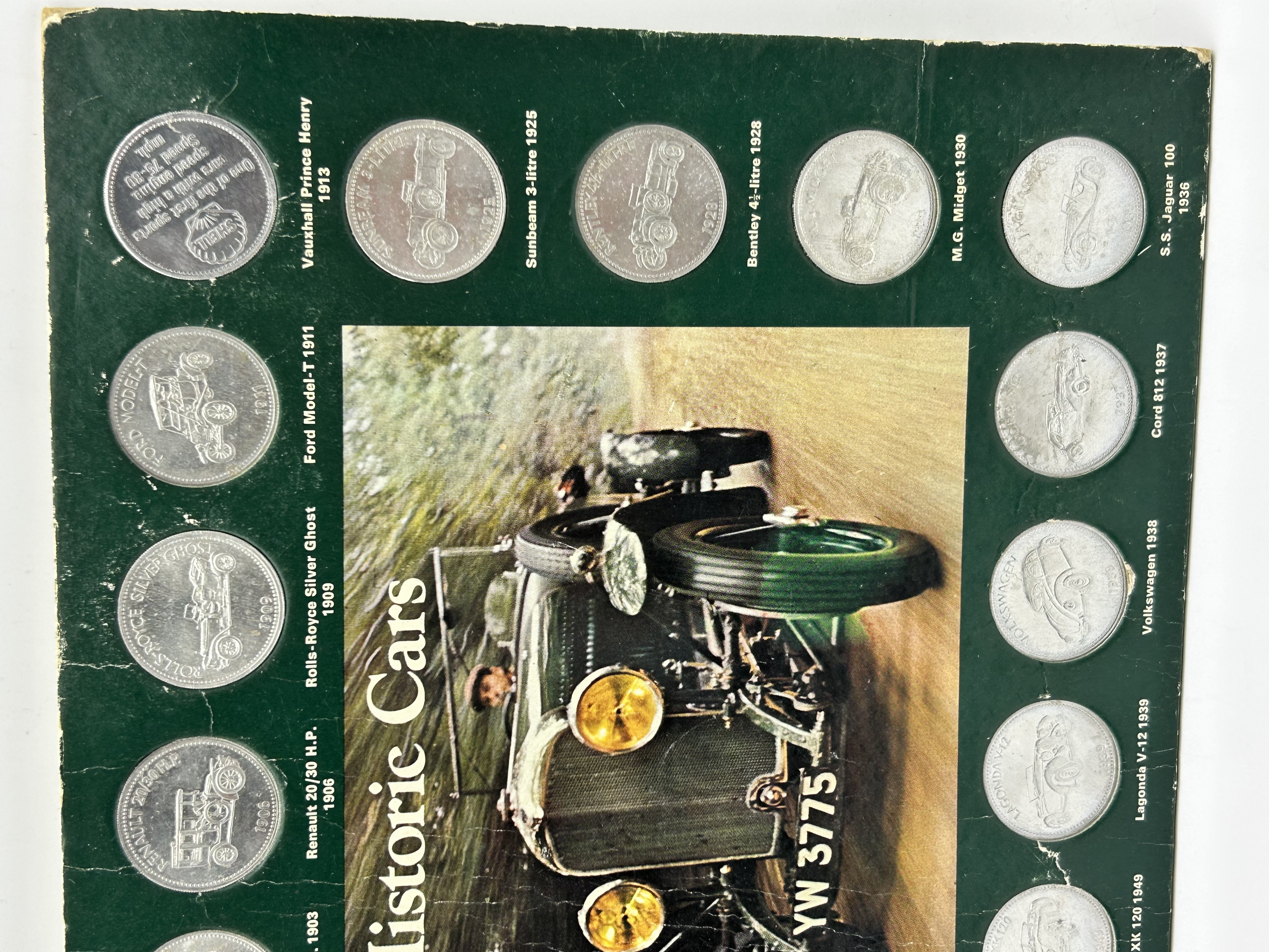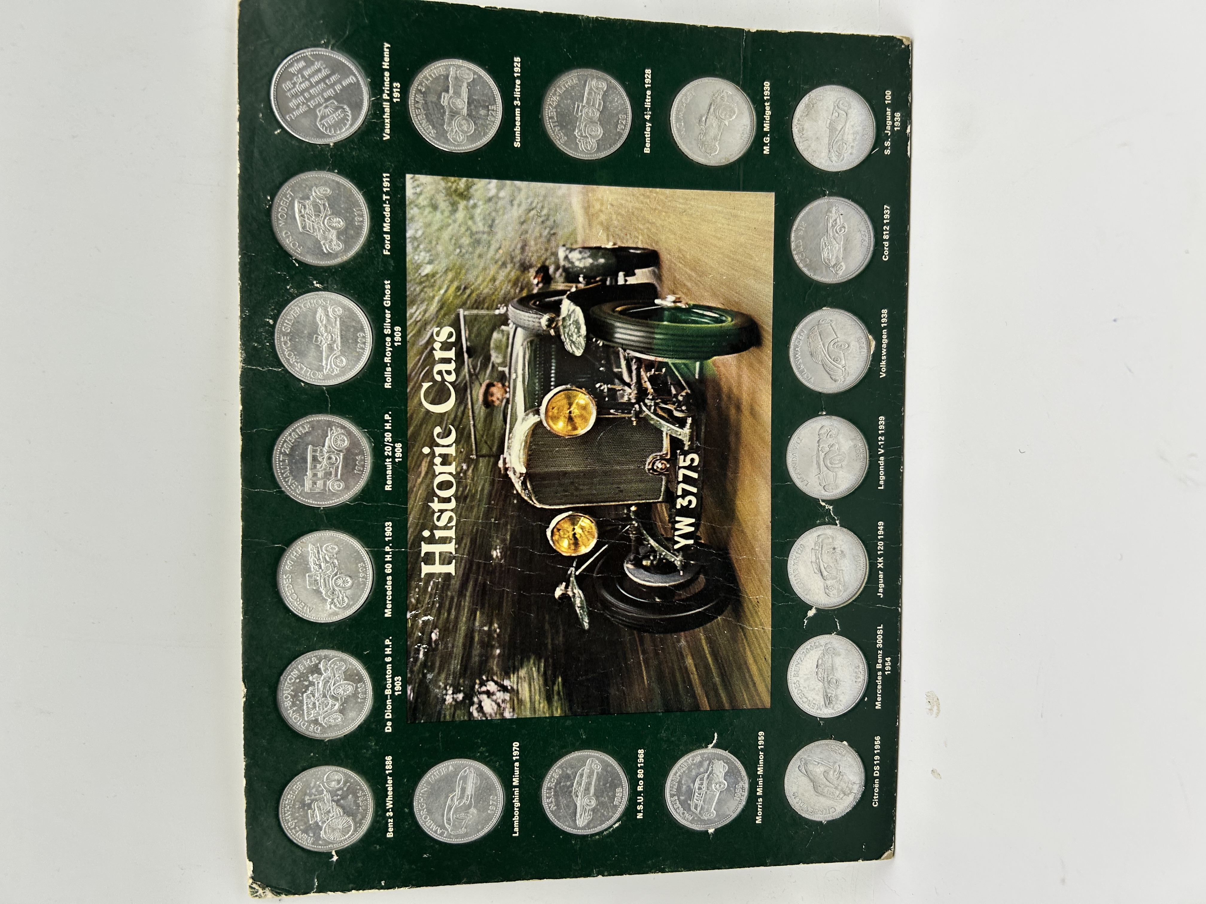 A vintage promotional token set produced by Shell titled Historic Cars. The collection consists of an assortment of silver-toned embossed tokens mounted onto a green cardboard display card. The centre of the card features a colour illustration of a vintage motor vehicle with the registration YW 3775. The tokens are arranged around the central image, each depicting a significant automobile model with its corresponding production year. Represented models include the 1886 Benz 3-Wheeler, 1909 Rolls-Royce Silver Ghost, 1911 Ford Model-T, 1954 Mercedes Benz 300SL, and the 1970 Lamborghini Miura. One specific token displays the Shell pecten logo alongside text describing an early sports car. The card includes printed identification for each vehicle.