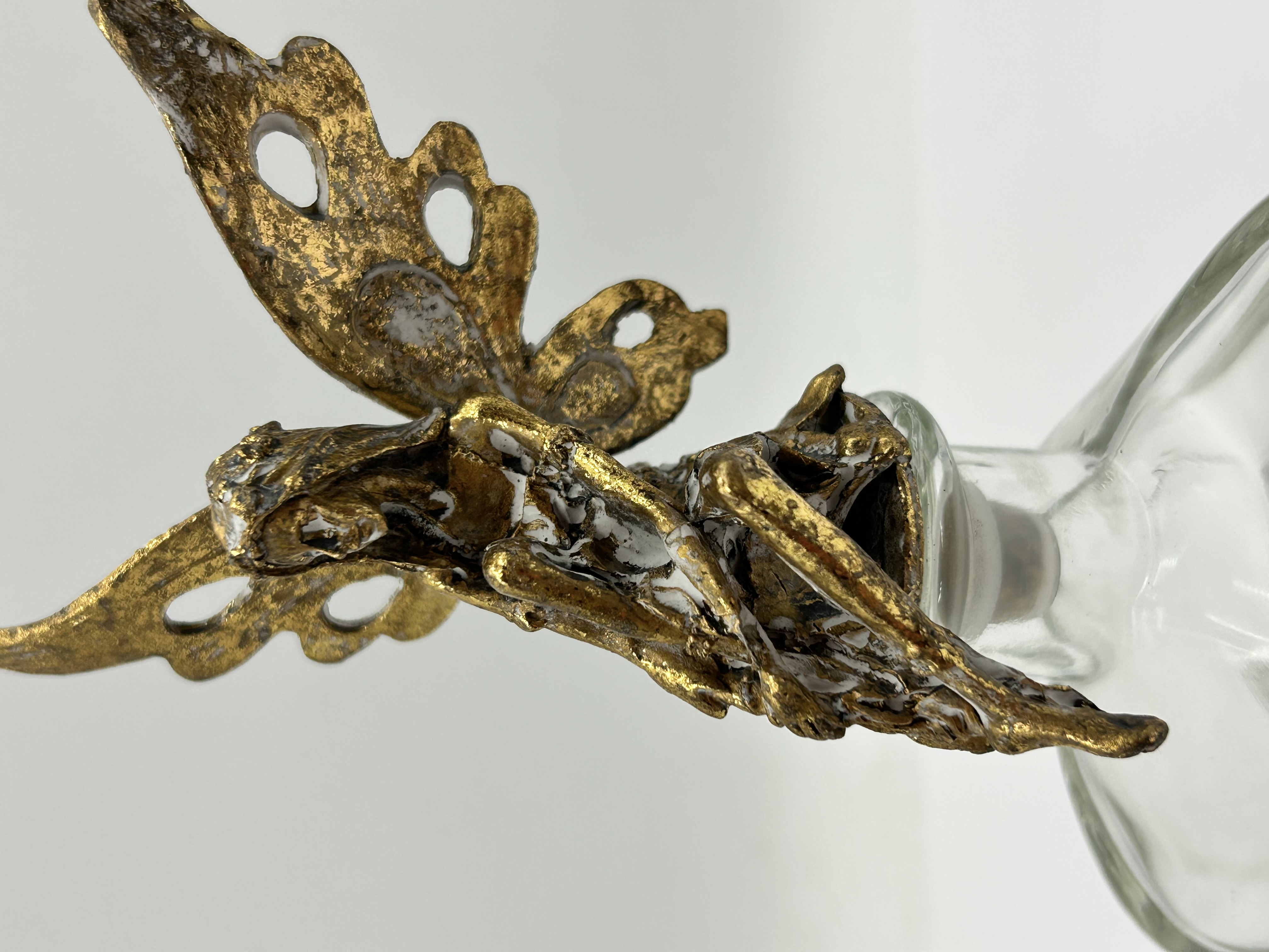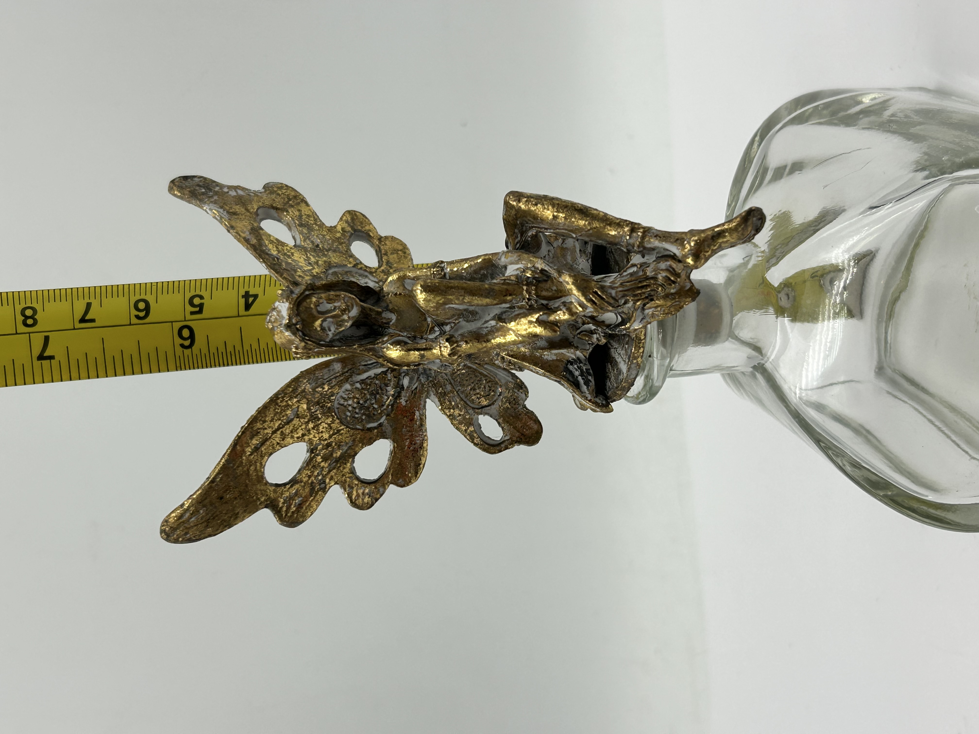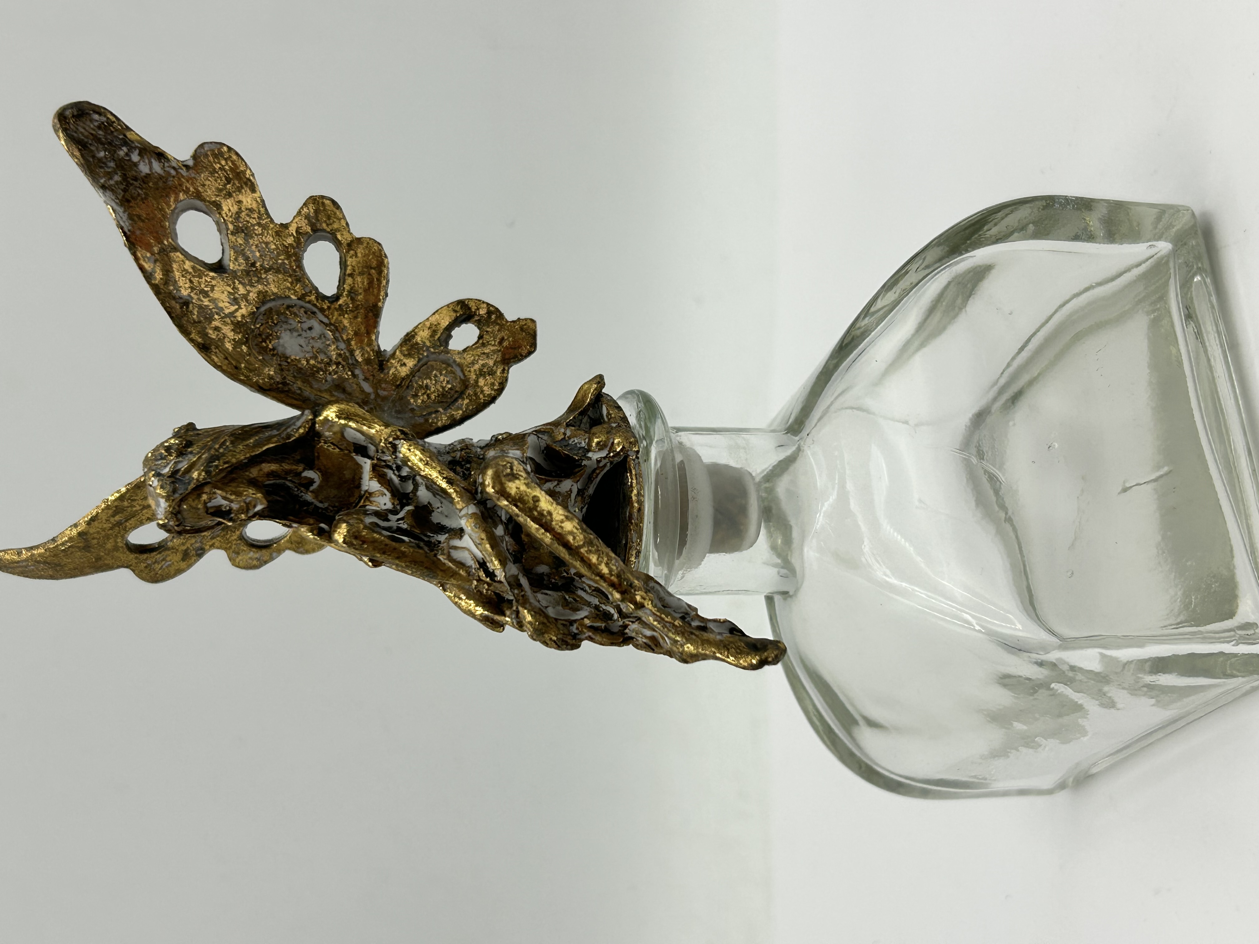 A decorative vanity bottle featuring a clear glass body of irregular teardrop form. The bottle is fitted with a figural stopper in the form of a reclining winged fairy. The topper is finished with a textured, distressed gold-tone metallic coating over a composite or metal base. The functional portion of the stopper comprises a translucent synthetic plug. No maker’s marks or signatures are present.