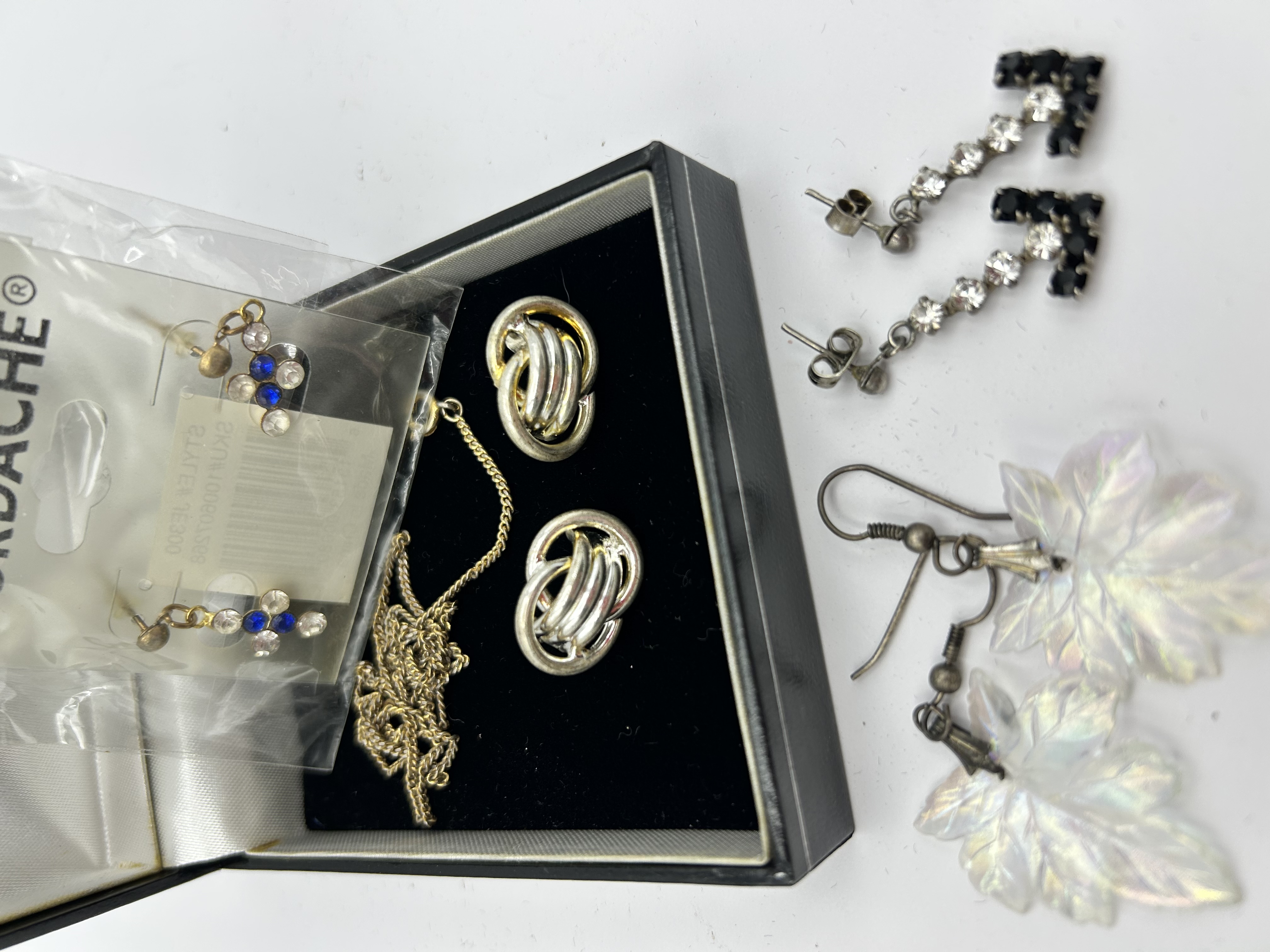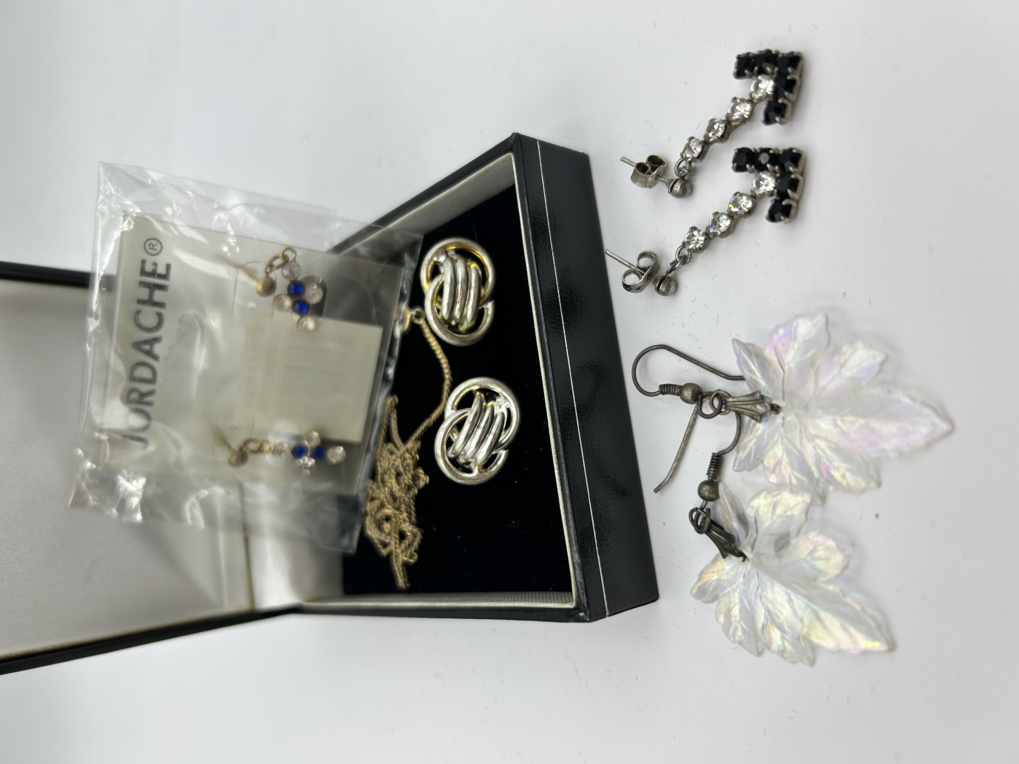A collection of contemporary costume jewellery comprising several pairs of earrings and a necklace. The group includes a pair of Jordache brand post earrings featuring blue and clear stones, retained in the original retail packaging. Also present is a pair of two-tone silver and gold-toned knot earrings and a gold-toned chain, both presented within a black hinged box. The assortment is completed by a pair of articulated drop earrings set with clear and black rhinestones and a pair of iridescent leaf-shaped dangle earrings on white metal hook findings.