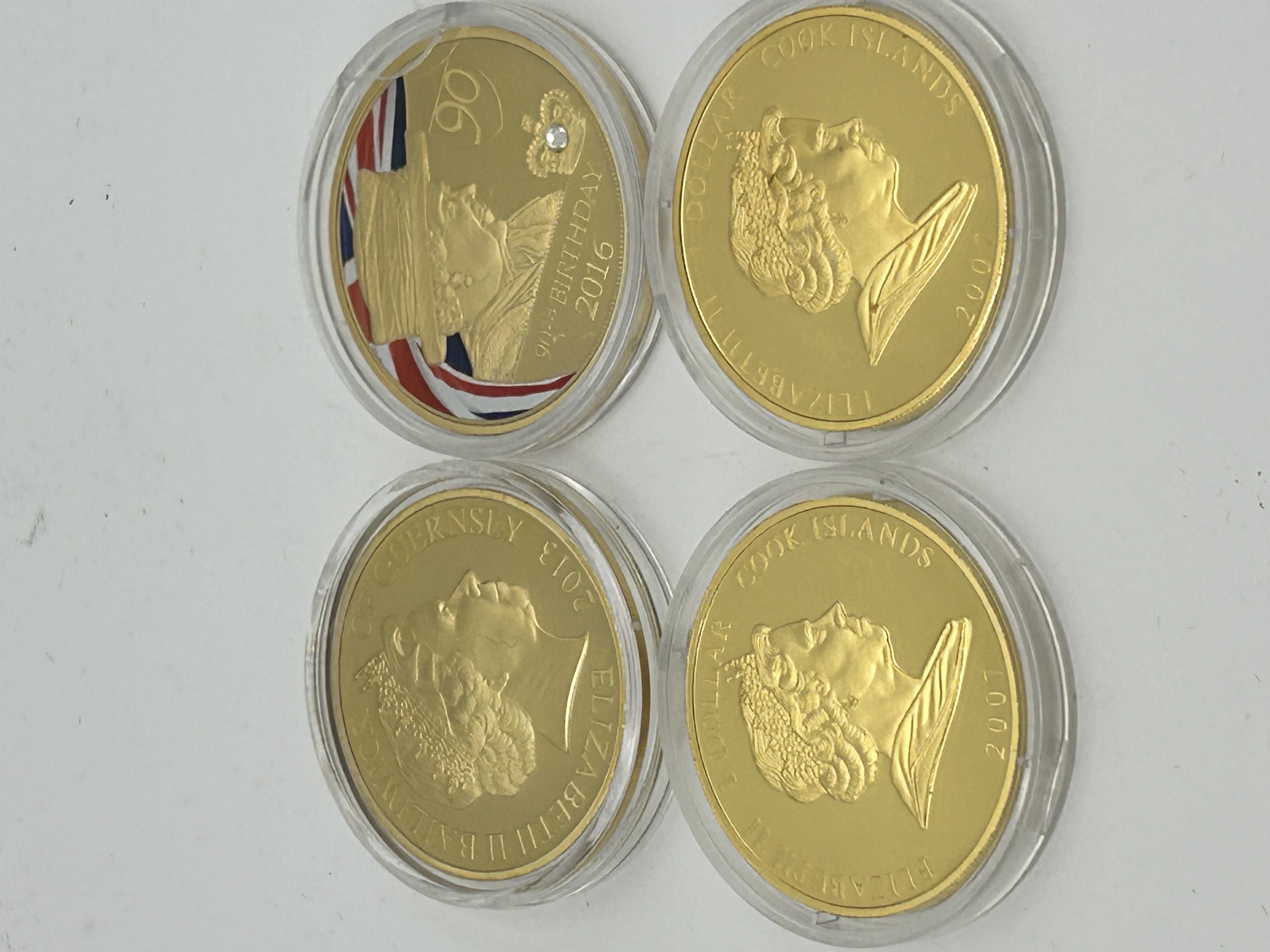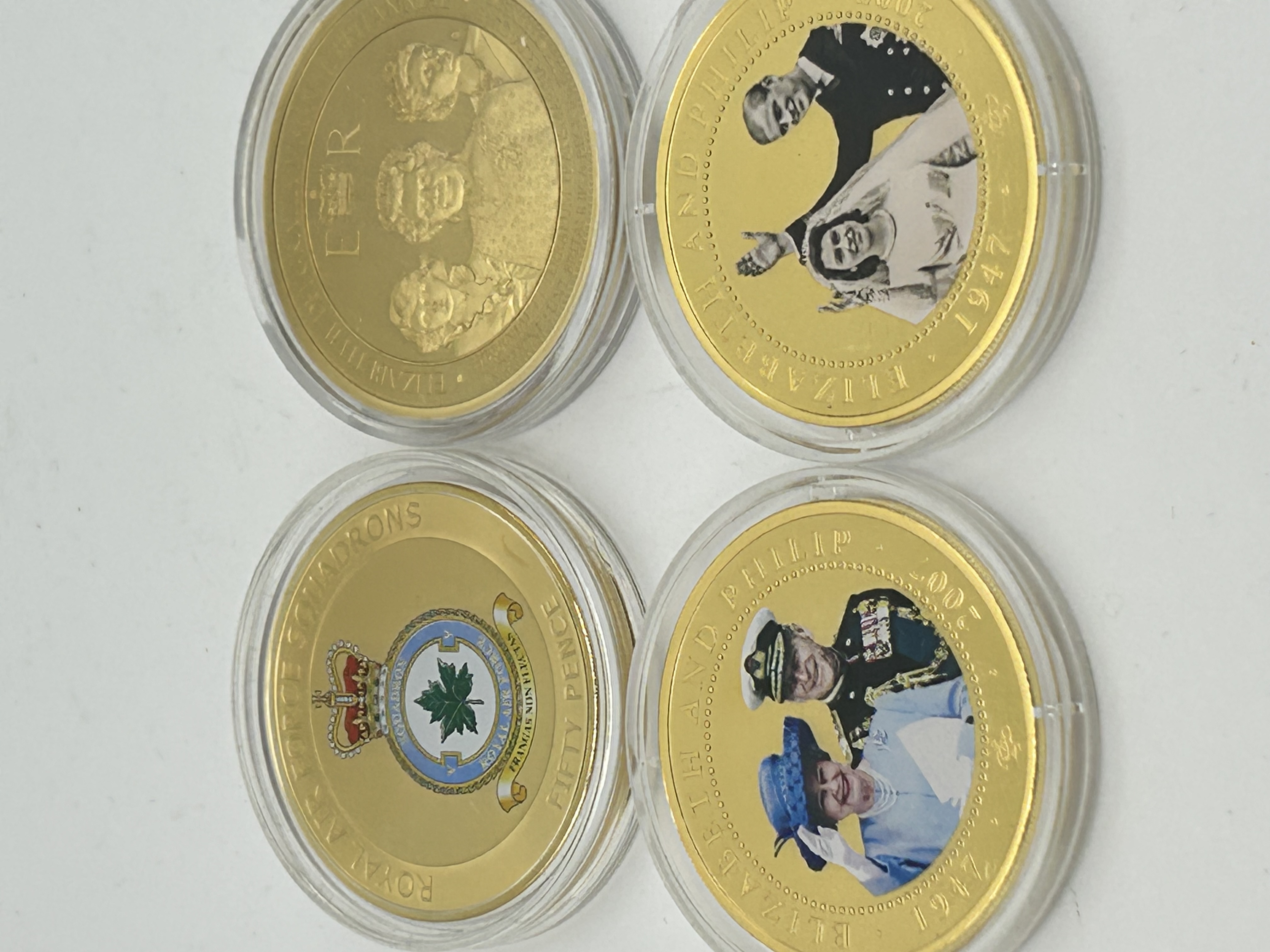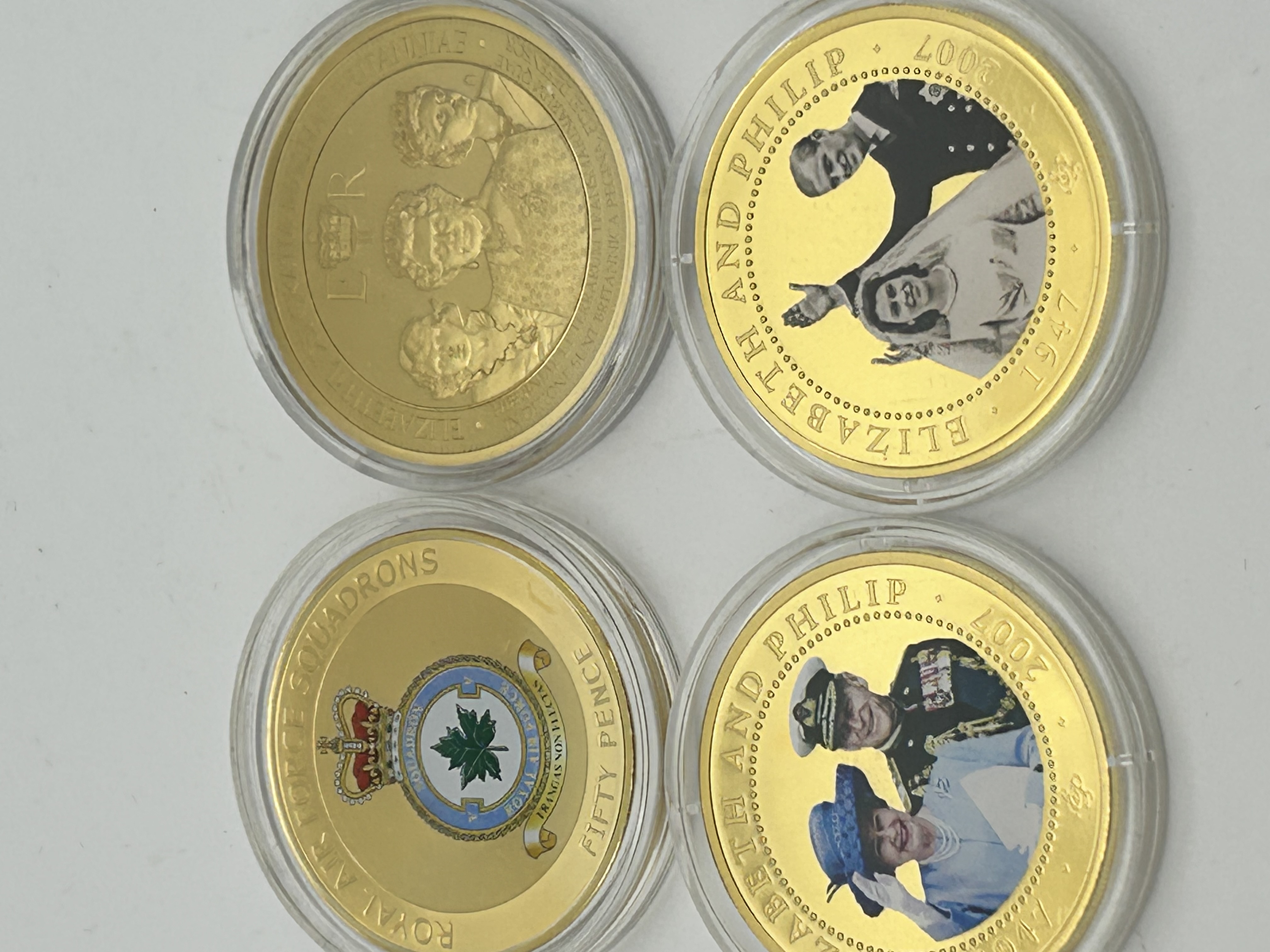 A collection of gold-toned commemorative coins and medallions primarily focused on the British Royal Family and military heritage. The group includes a 2016 Bailiwick of Guernsey coin celebrating the 90th birthday of Queen Elizabeth II, featuring a Union Jack motif and a small inset crystal. Also present are Cook Islands one-dollar coins dated 2007 and medallions commemorating the 60th wedding anniversary of Queen Elizabeth II and Prince Philip (1947–2007), which feature photographic transfers. The collection further contains a Royal Air Force Squadrons fifty-pence piece featuring a colourised crest and the motto FRANGAS NON FLECTAS. The items are struck in gold-toned metal and are each housed in individual clear protective plastic capsules.