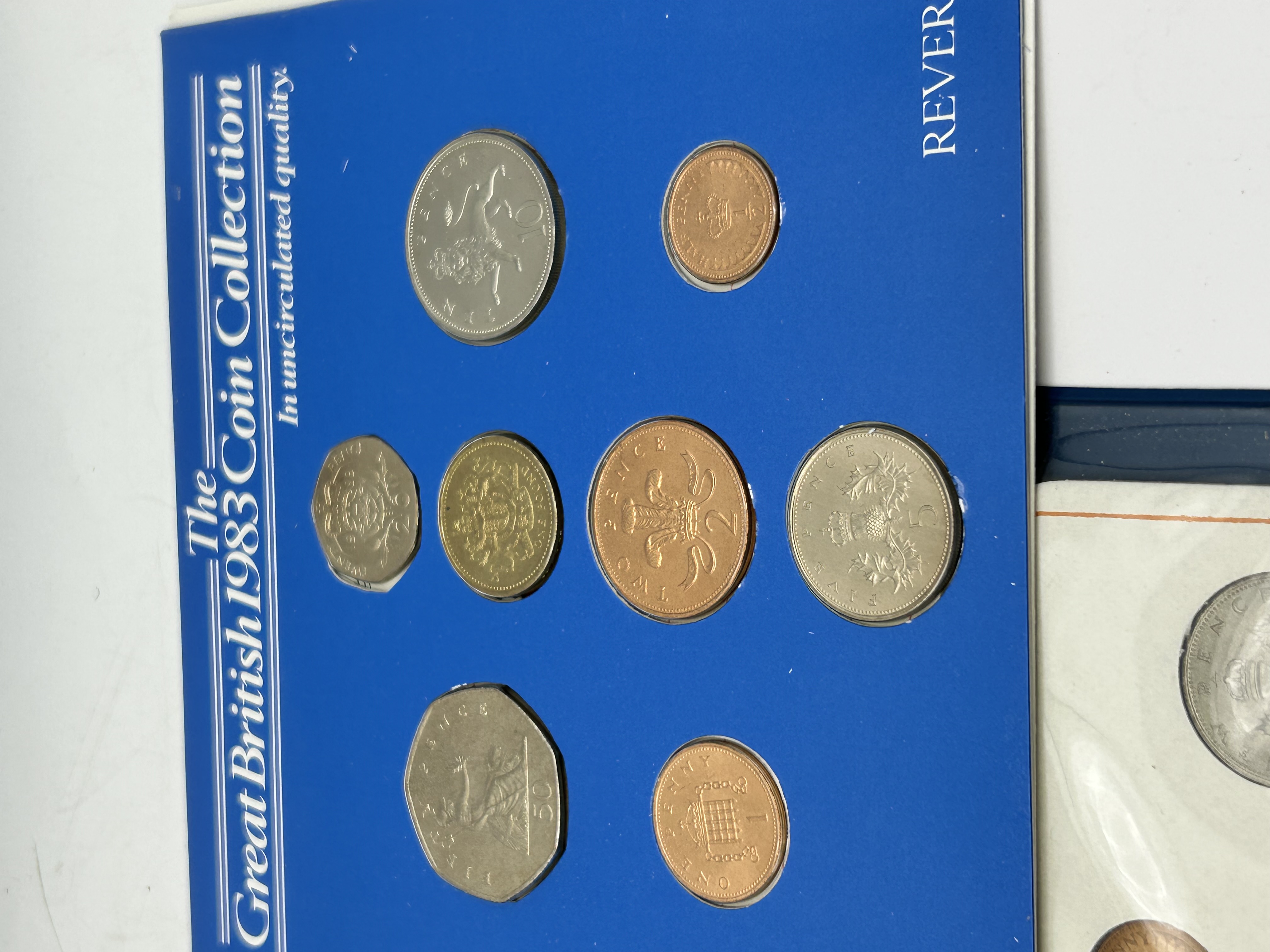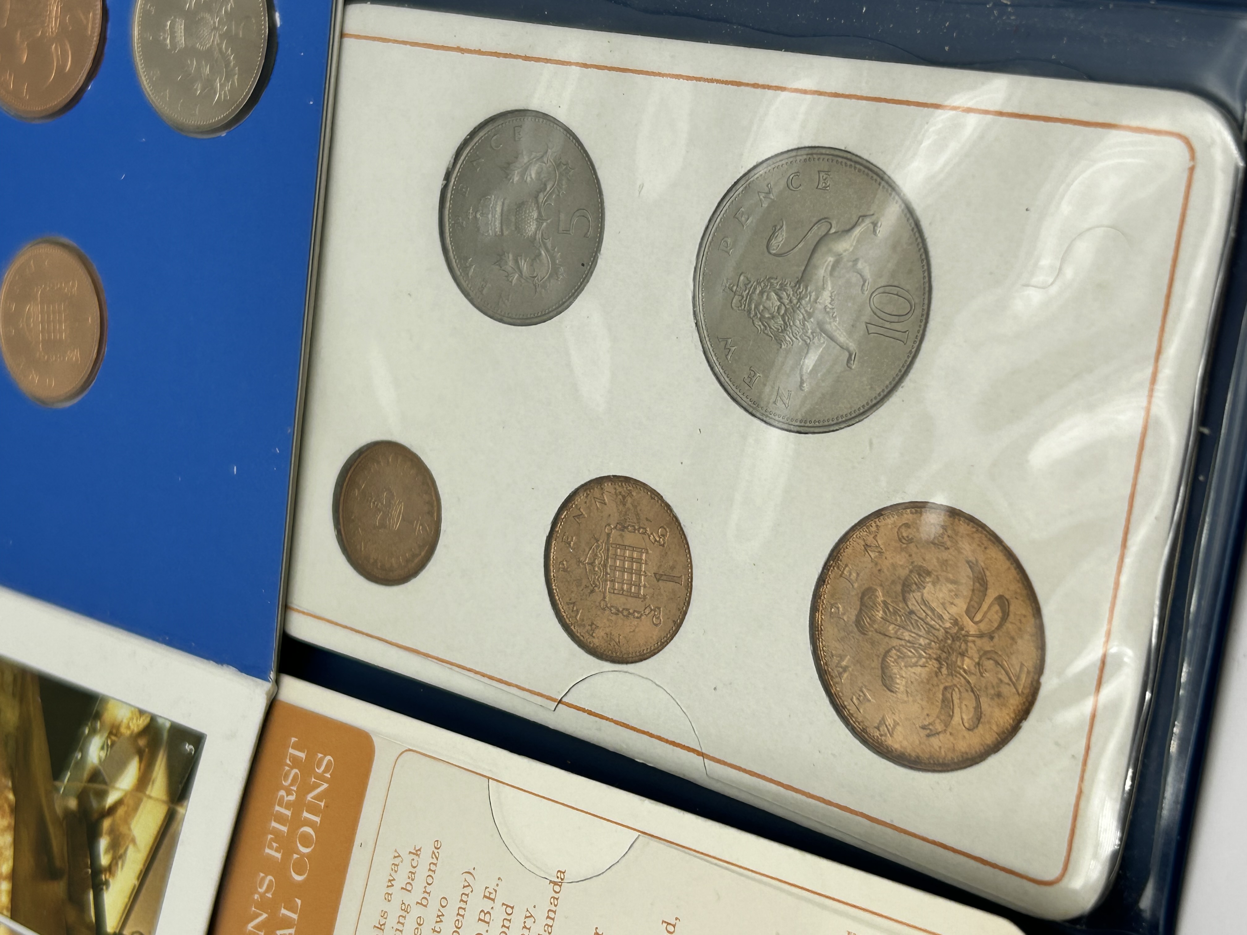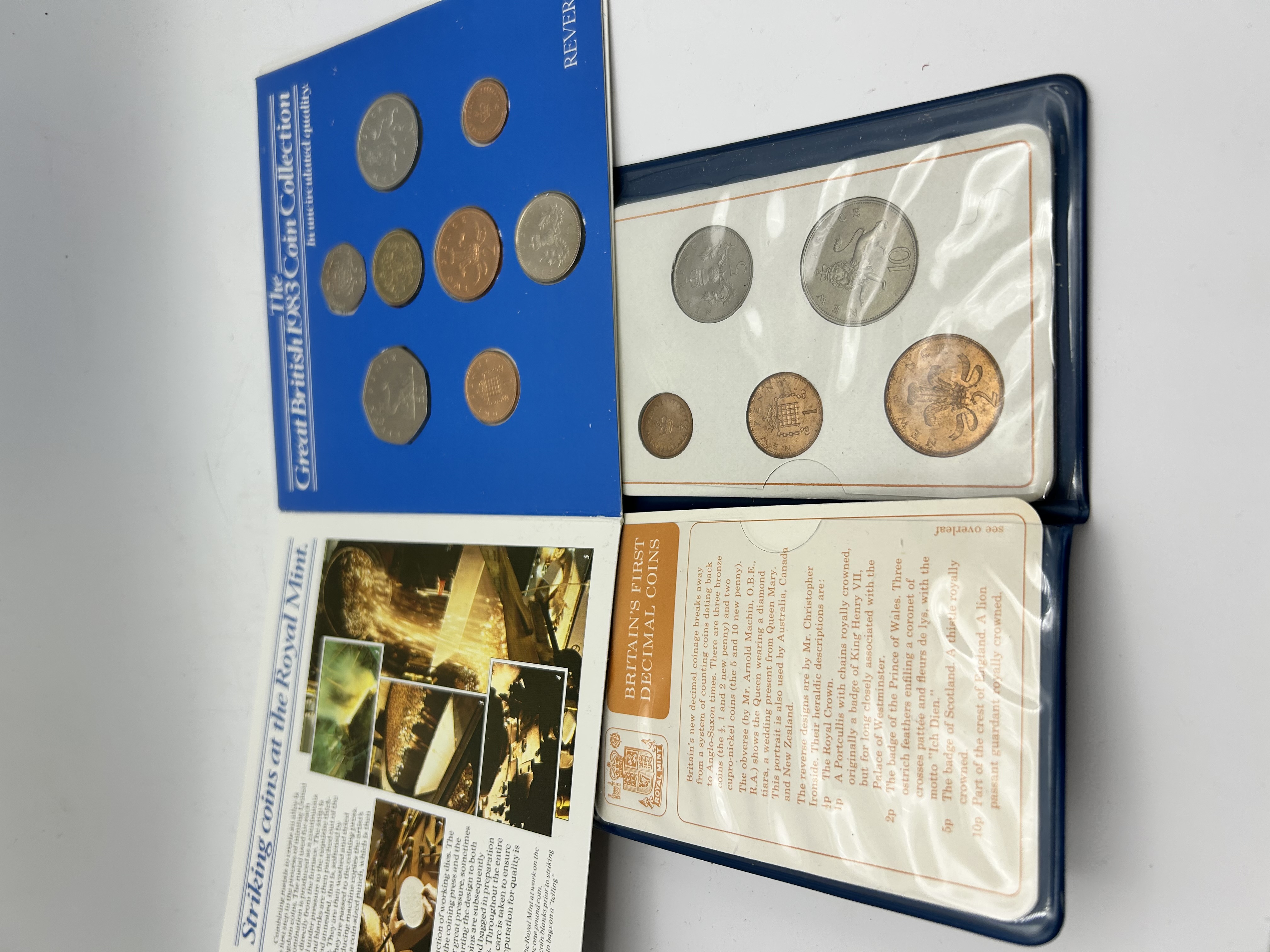 A group of official British decimal coin sets produced by the Royal Mint. The lot includes The Great British 1983 Coin Collection, presented in a blue card folder, featuring uncirculated coins ranging from the half-penny to the one pound coin. Also included is a set titled Britain’s First Decimal Coins, housed in a blue plastic wallet with an accompanying descriptive booklet. This set contains the initial denominations introduced during the decimalisation period, including the half-penny, one penny, two pence, five pence, and ten pence coins. The coins are struck in various alloys including cupro-nickel, bronze, and nickel-brass. The 1983 set includes the twenty pence and the round one pound coin.
