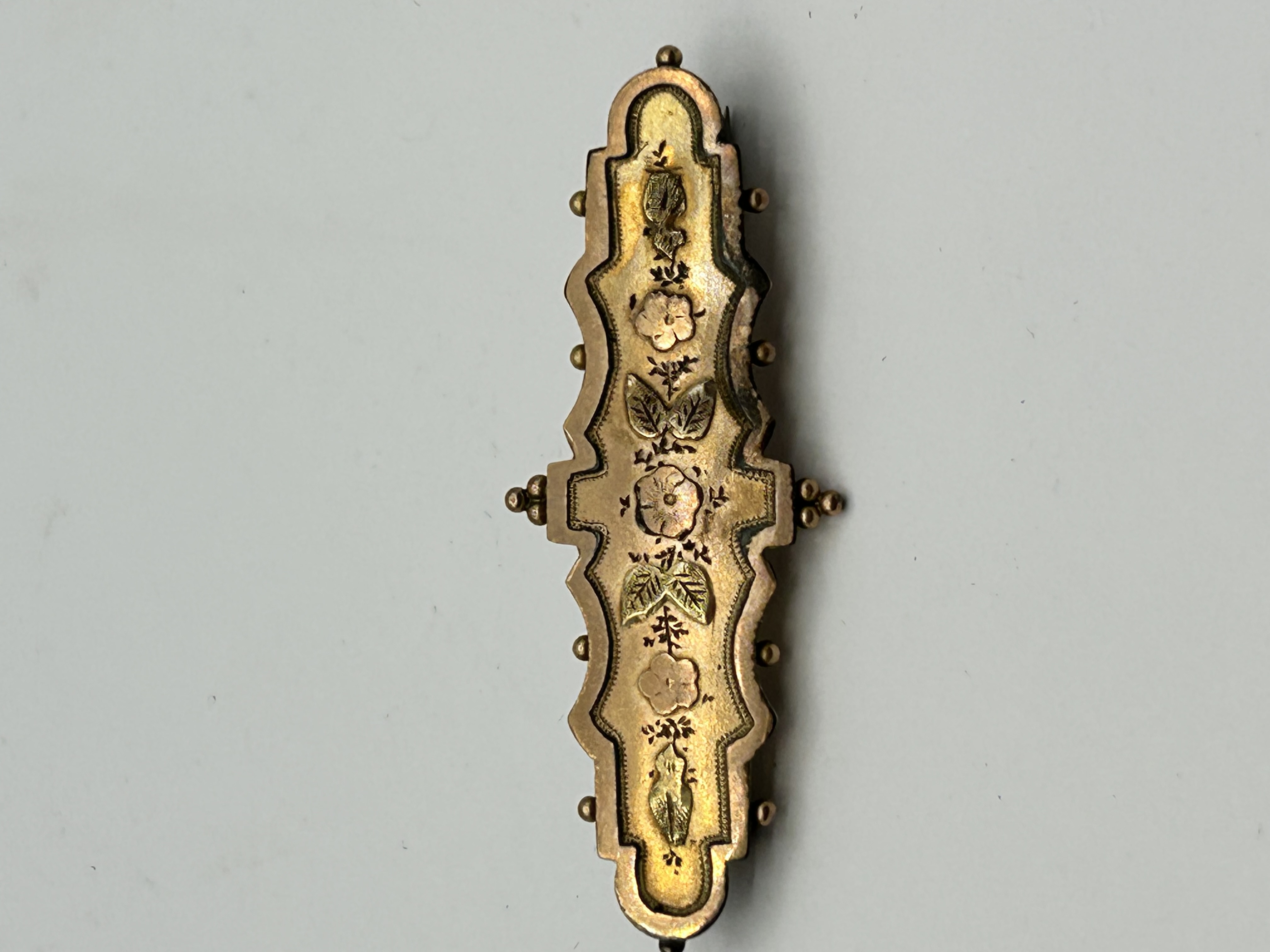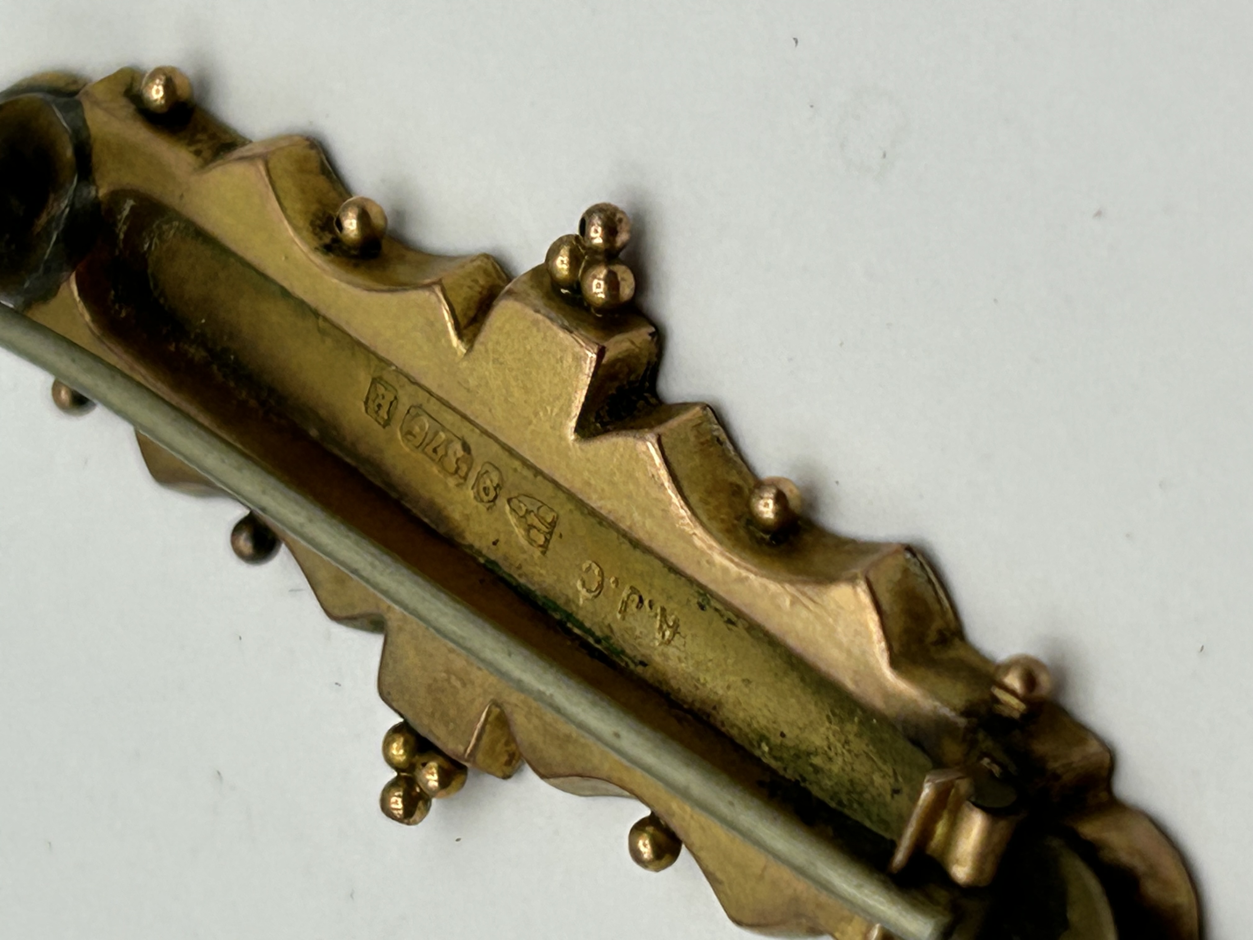 A late Victorian bar brooch of elongated, multi-lobed form, crafted in 9 carat tri-colour gold. The central recessed panel features applied floral and foliate motifs in yellow, rose, and green gold tones, bordered by granulated bead accents. The reverse is fitted with a traditional pin and C-clasp. The piece bears a full set of British hallmarks for Birmingham, 1901, including the maker mark A.J.C, the crown and 375 fineness marks for 9 carat gold, and the date letter b.