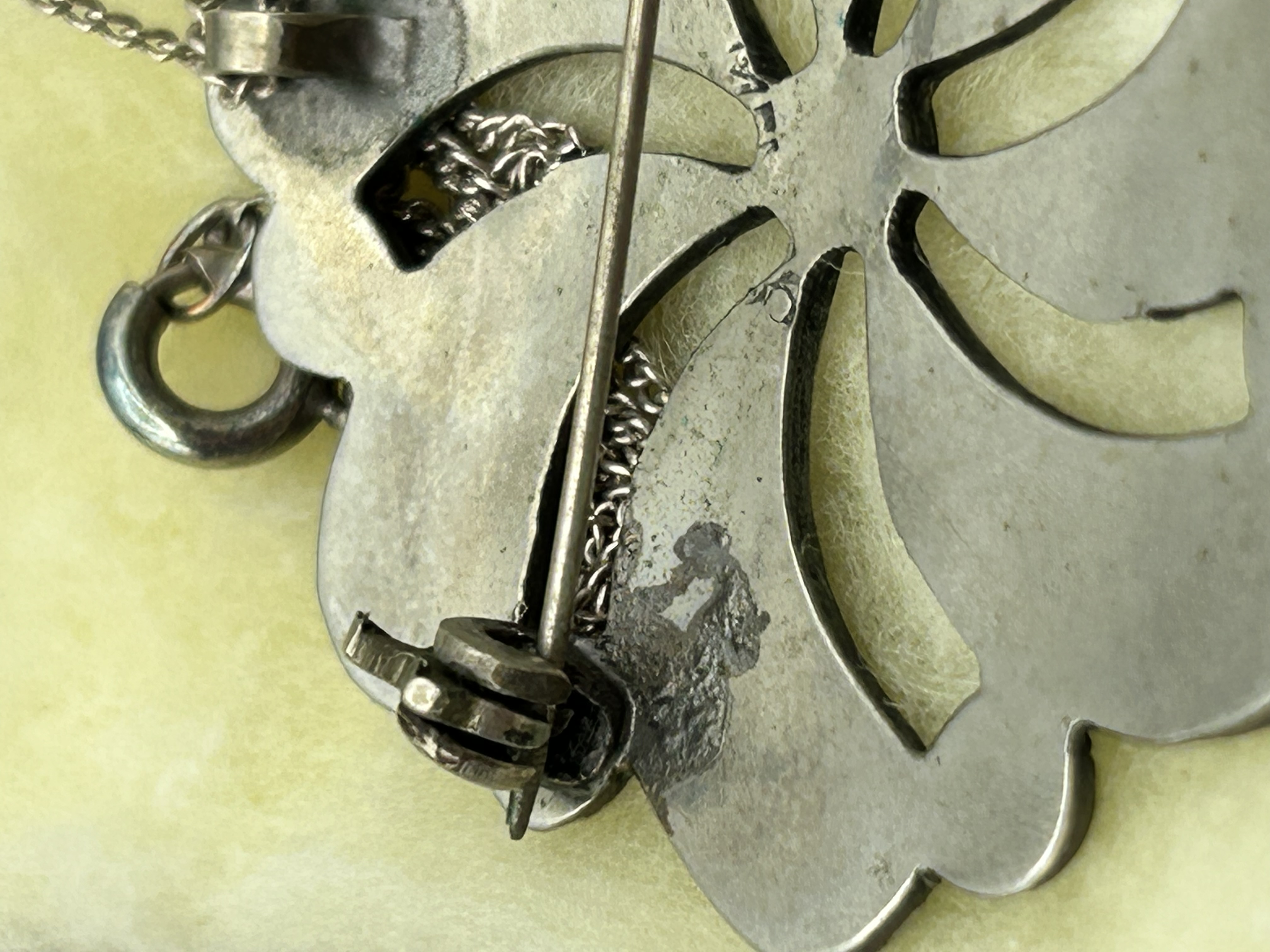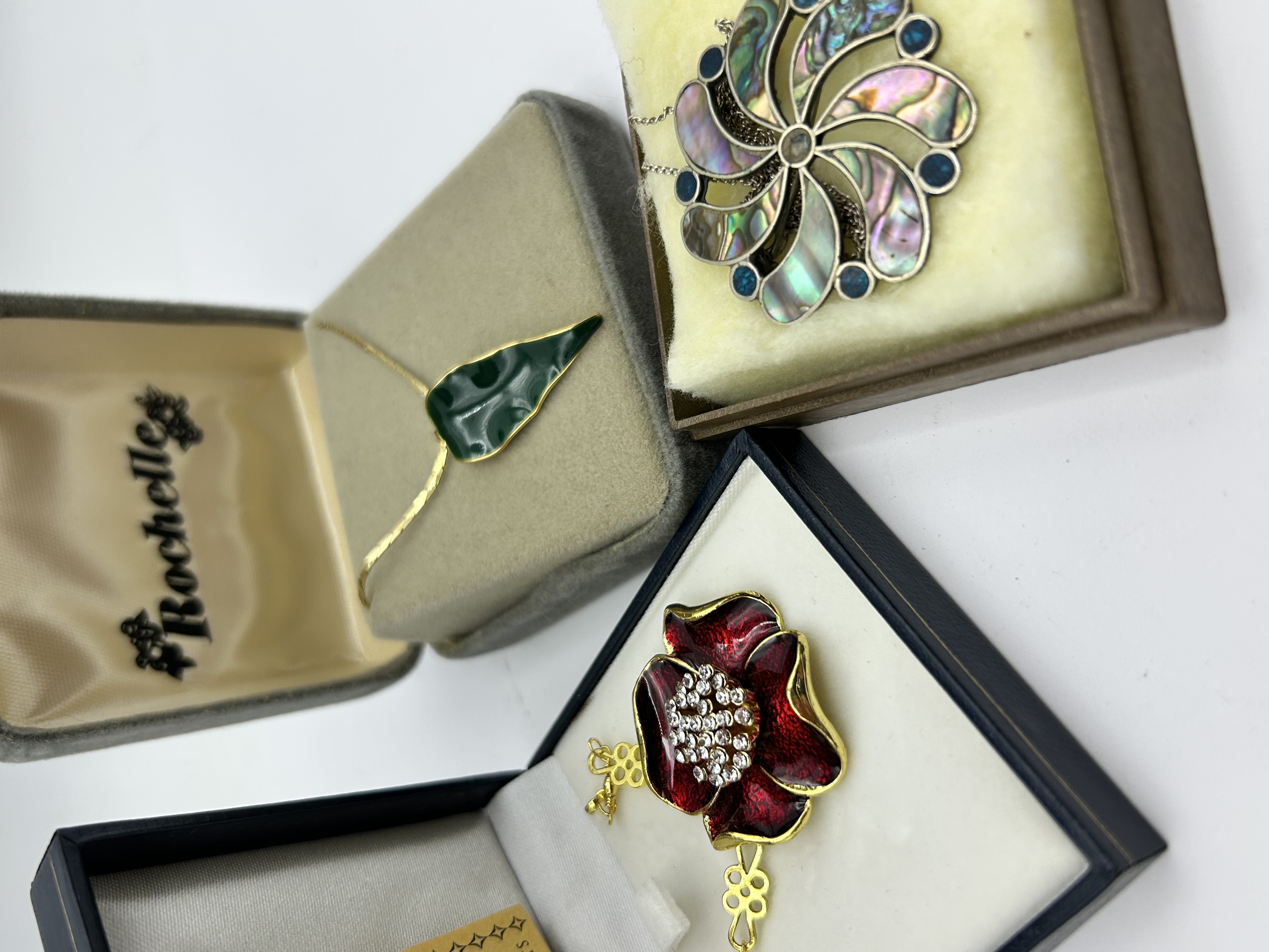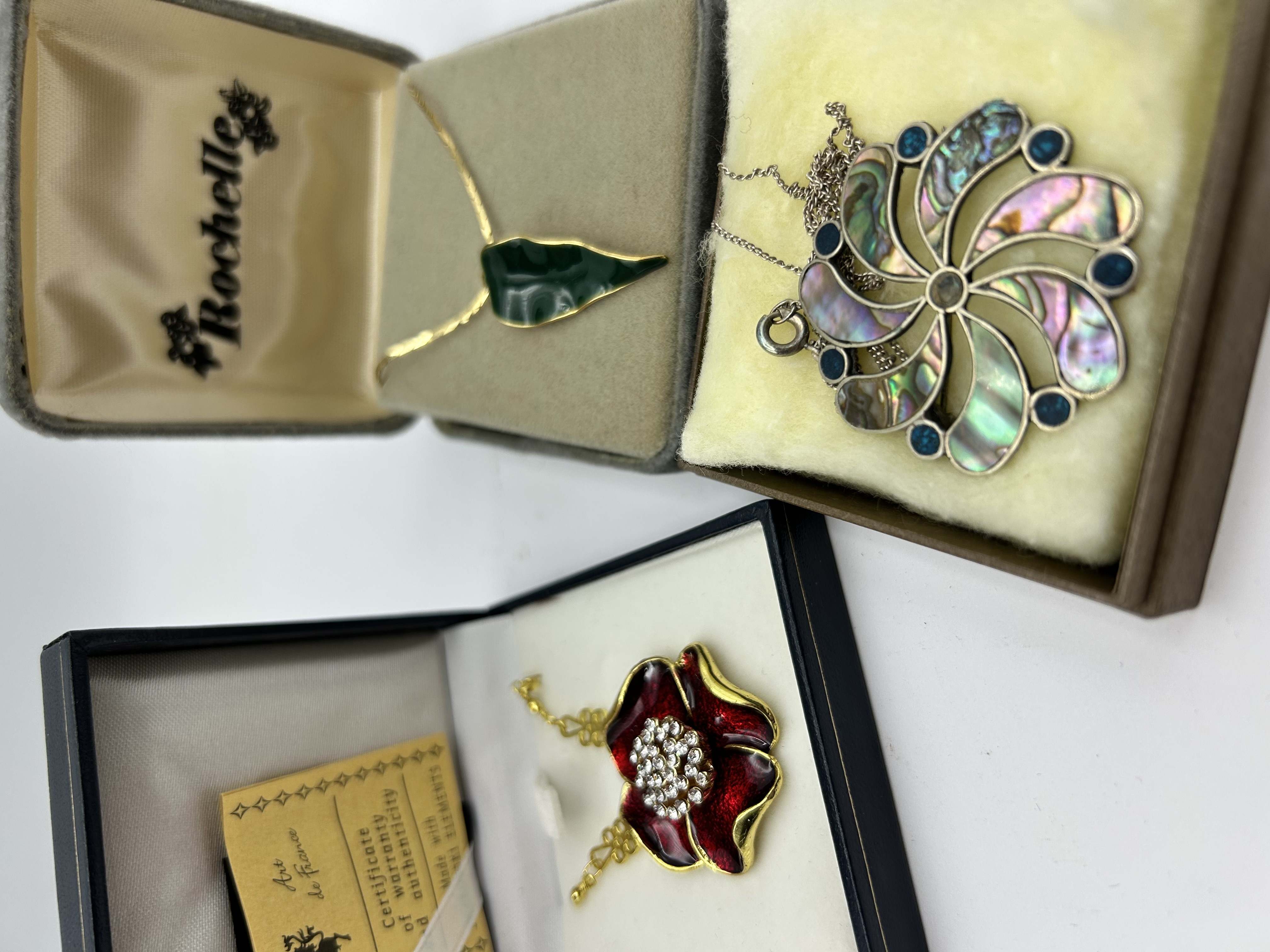 A collection of three costume jewellery items. The first is a gold-tone necklace featuring a green enamelled leaf-shaped pendant, presented in a Rochelle branded box. The second is a gold-tone necklace with a large red enamelled floral pendant, the centre set with clear crystals, accompanied by an Art de France certificate of authenticity and presented in a fitted box. The third item is a silver-tone combination brooch and pendant of swirling pinwheel design, featuring abalone shell inlays and small blue cabochon accents, suspended from a fine silver-tone chain.
