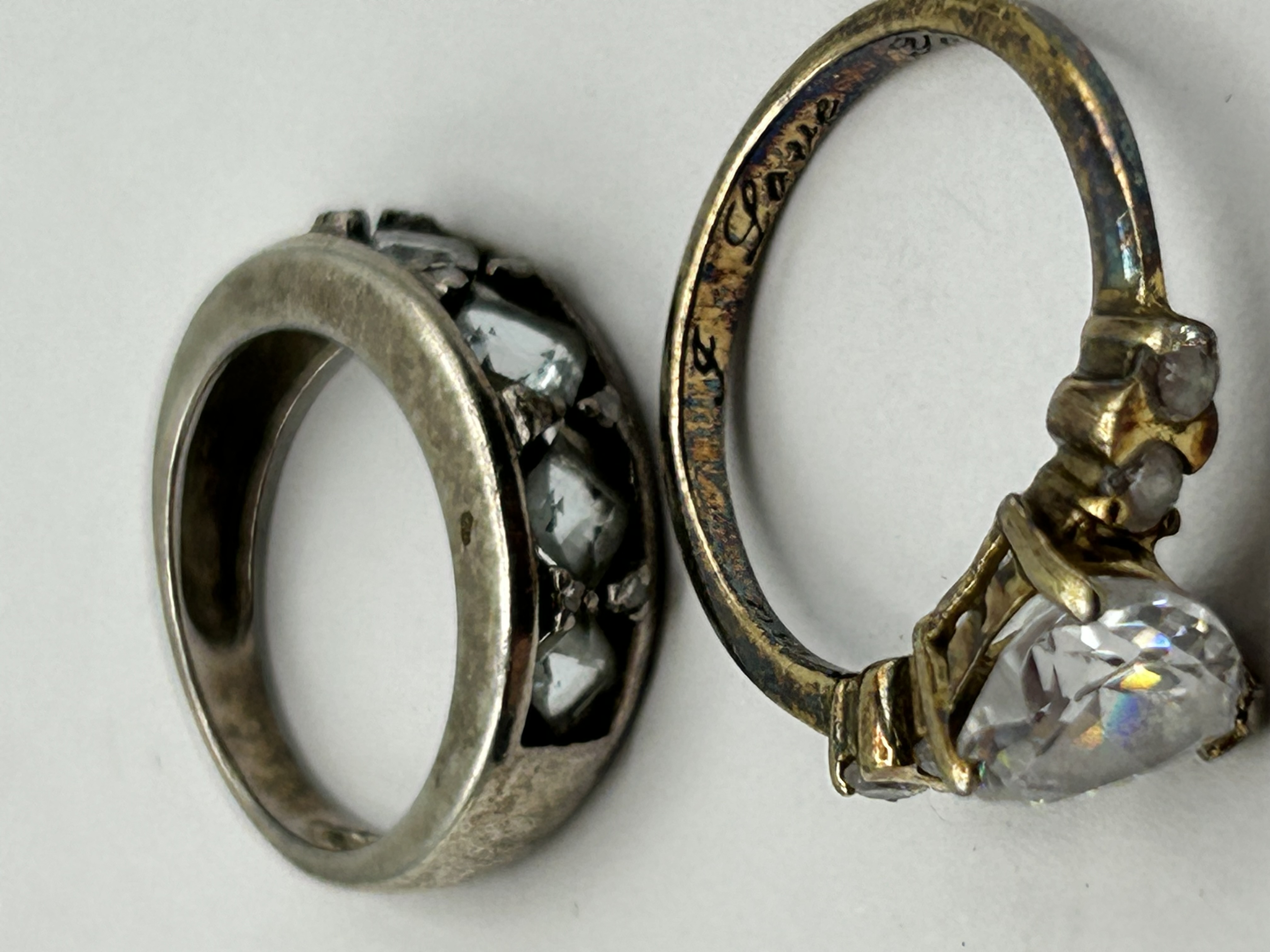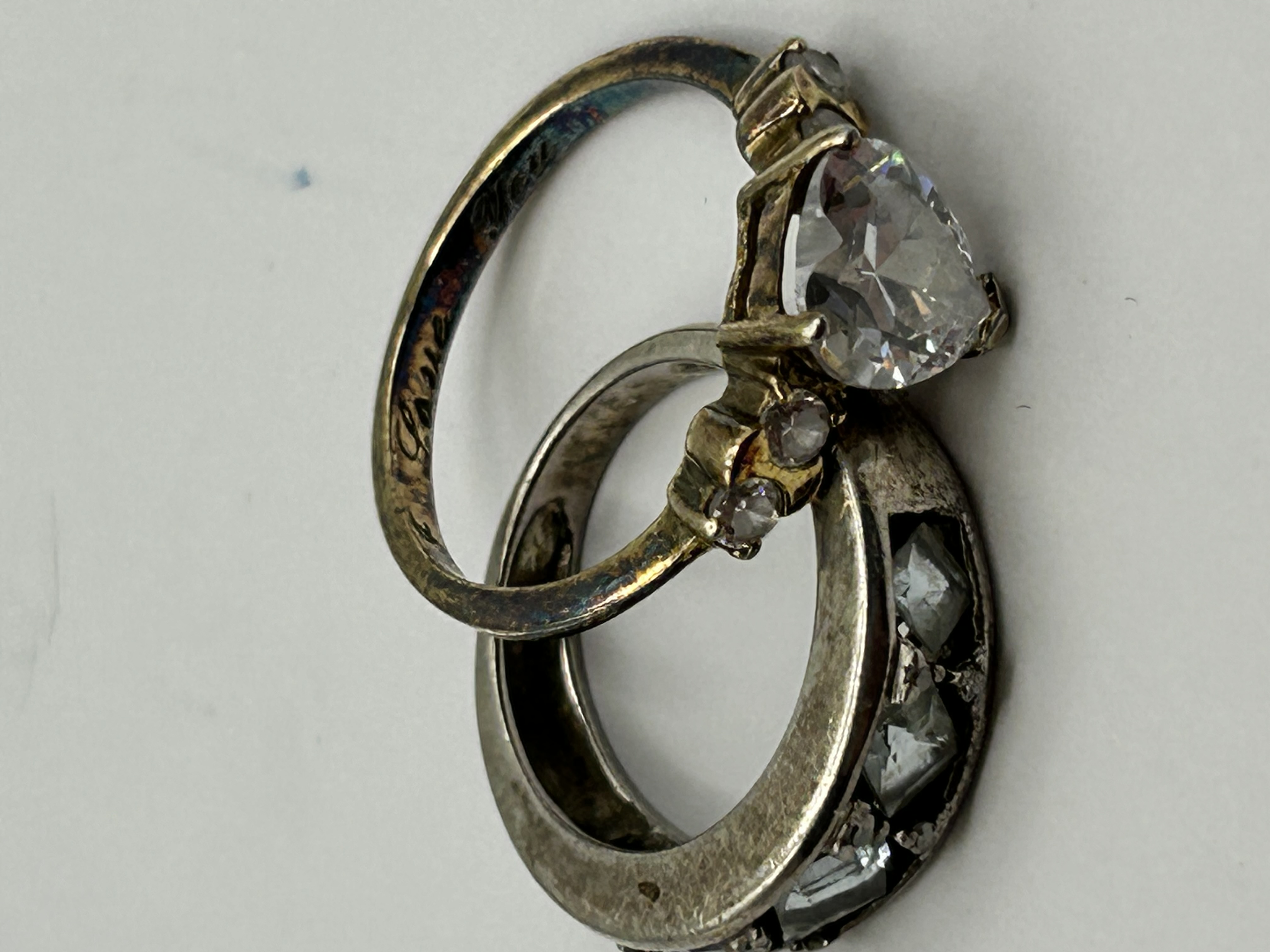 A collection of two rings comprising a yellow metal engagement-style ring and a wide white metal band. The yellow metal ring features a large heart-shaped colourless stone in a multi-prong setting, flanked by smaller round-cut stones. The interior of the shank is engraved with the word Love in a script font. The wide white metal band is set with several square-cut colourless stones along one side.
