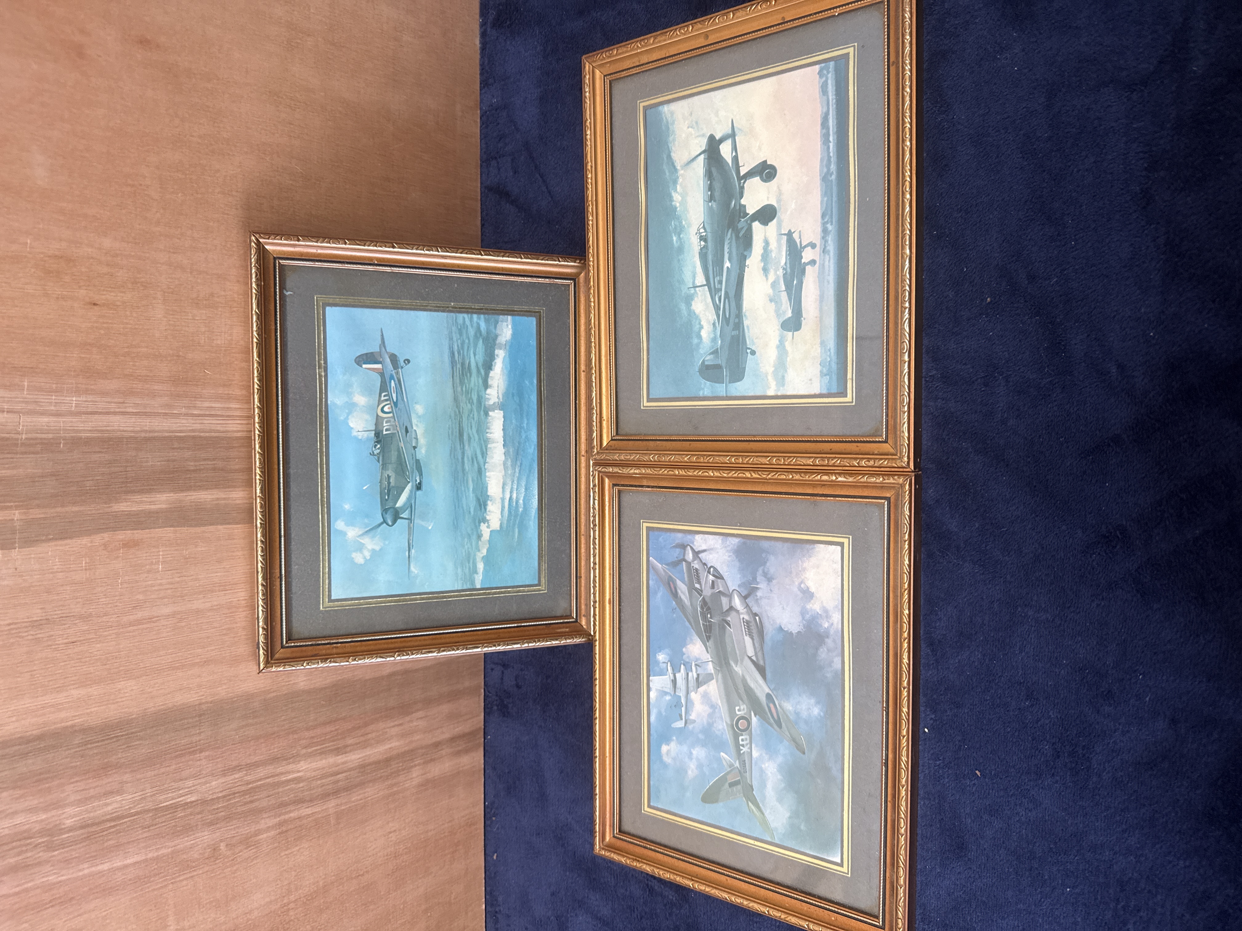 A trio of framed representational aviation prints by artist Robert Taylor, depicting World War II-era Royal Air Force (RAF) aircraft in flight. The collection includes a Supermarine Spitfire with fuselage markings PR-D shown over a coastal landscape, a formation of Hawker Hurricanes, and De Havilland Mosquitos including one marked SB-G. The Spitfire print corresponds to the work titled Duel of Eagles. Each piece is housed in a matching ornate, gilt-finished wooden frame with decorative moulding, set within a dark mat featuring a gold-toned inner border and preserved behind glass. These 11 x 9 inch prints are characteristic of Taylor’s detailed aerospace portraiture.
