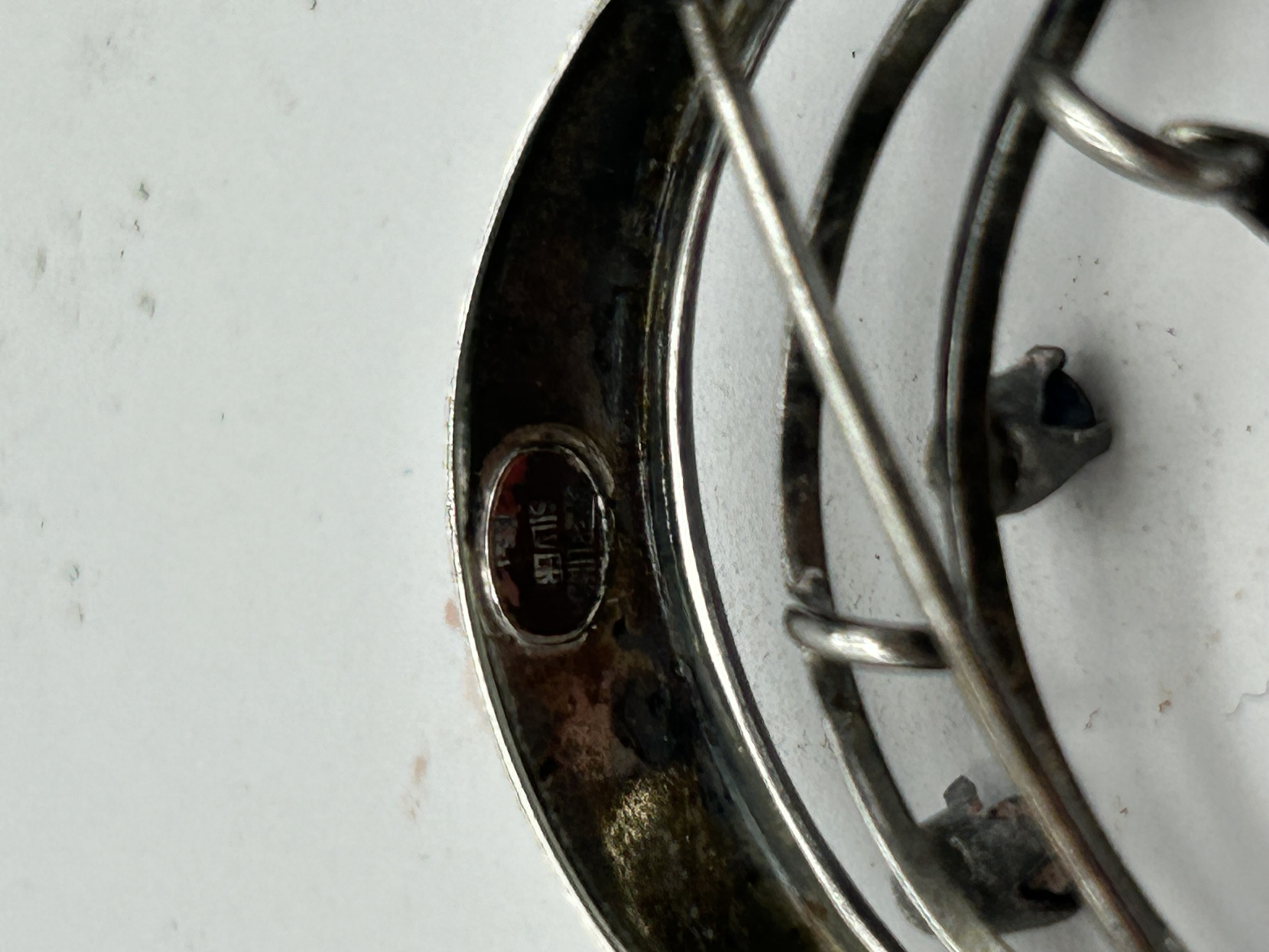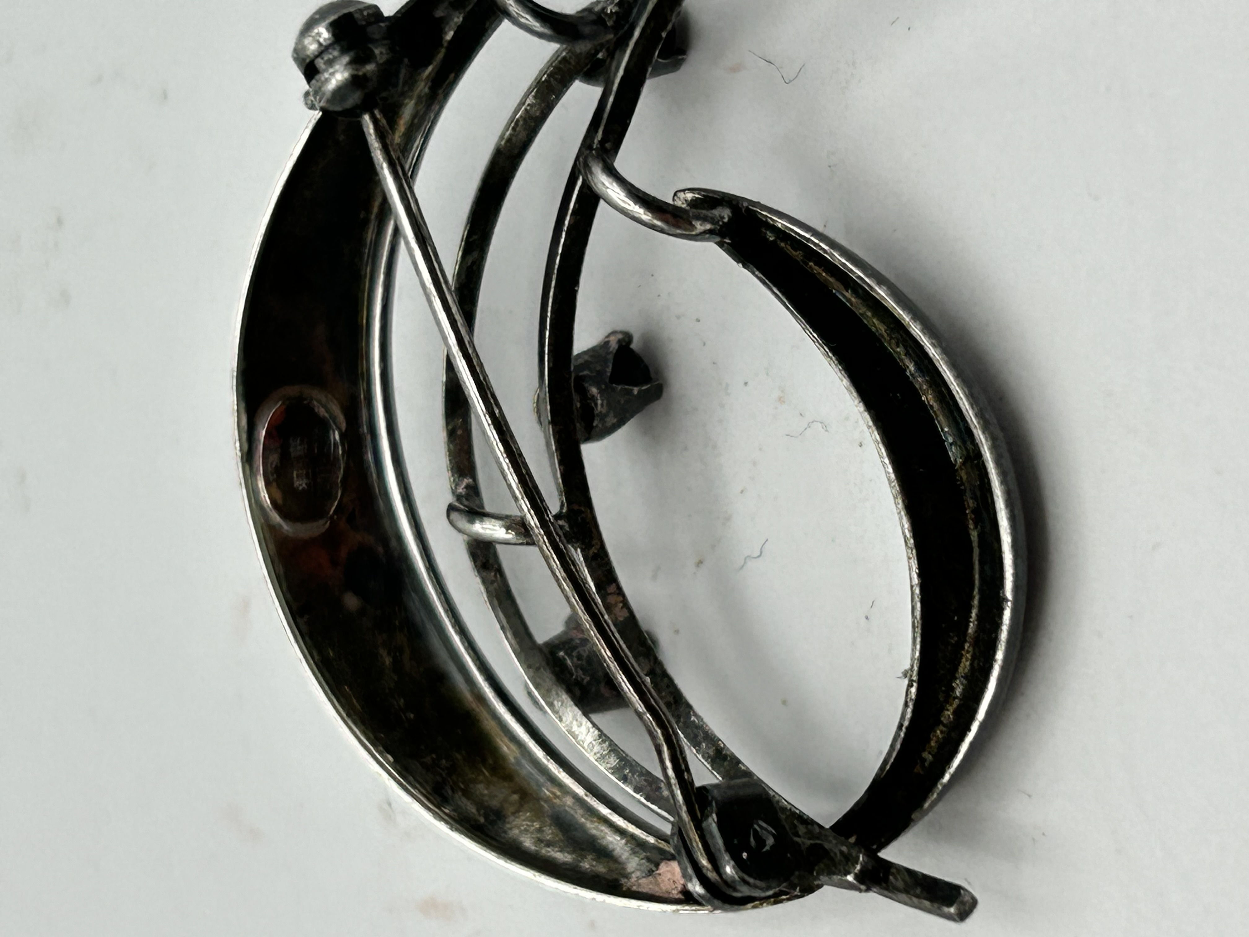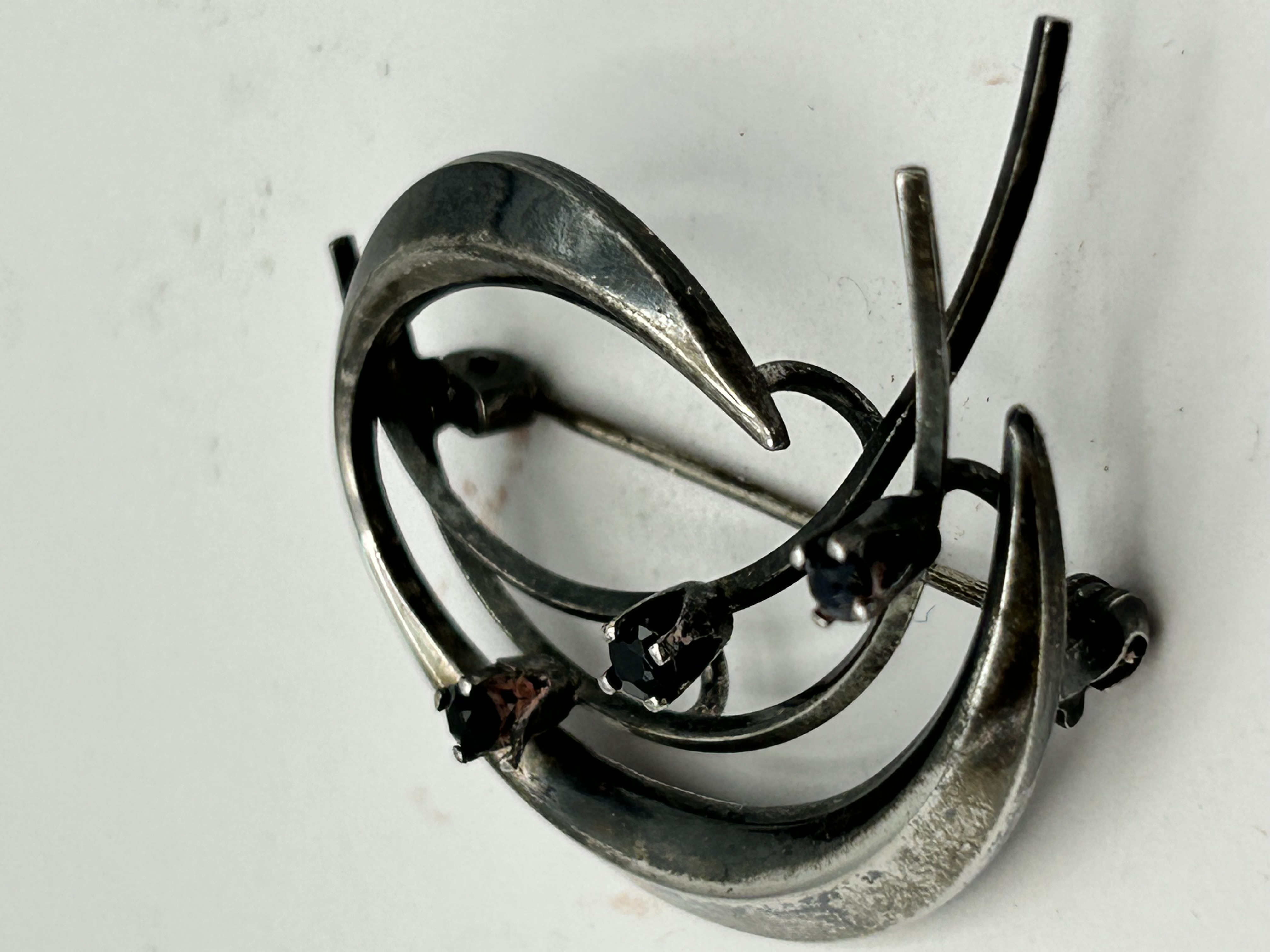 A silver brooch of modernist open-work design, featuring a swirling composition with two crescent-shaped elements. The piece is accented by three small, dark faceted stones, each secured in a prong setting. The reverse is fitted with a pin and safety clasp. A visible oval stamp on the reverse contains the characters 银制 (yín zhì) positioned above the word SILVER.