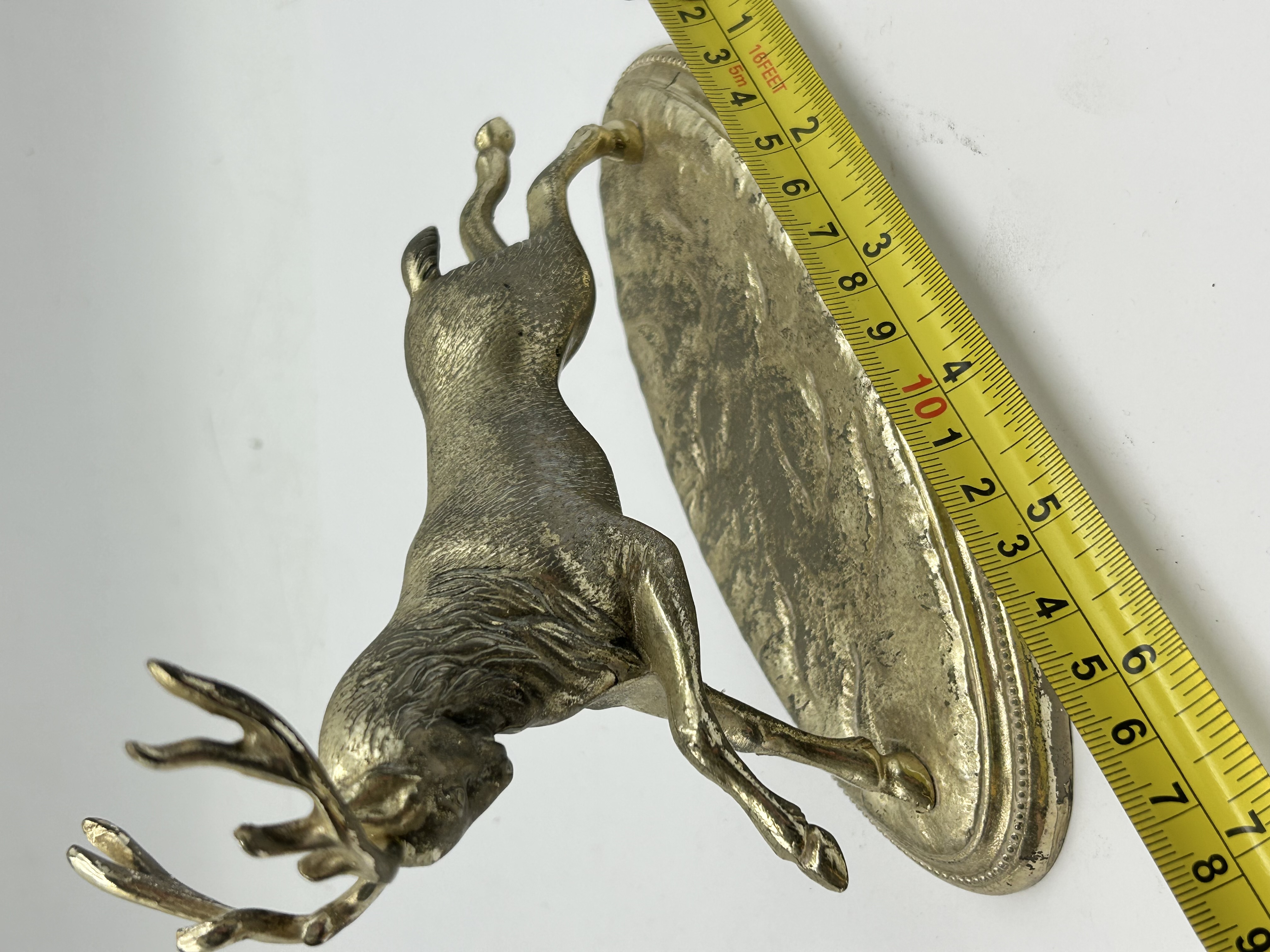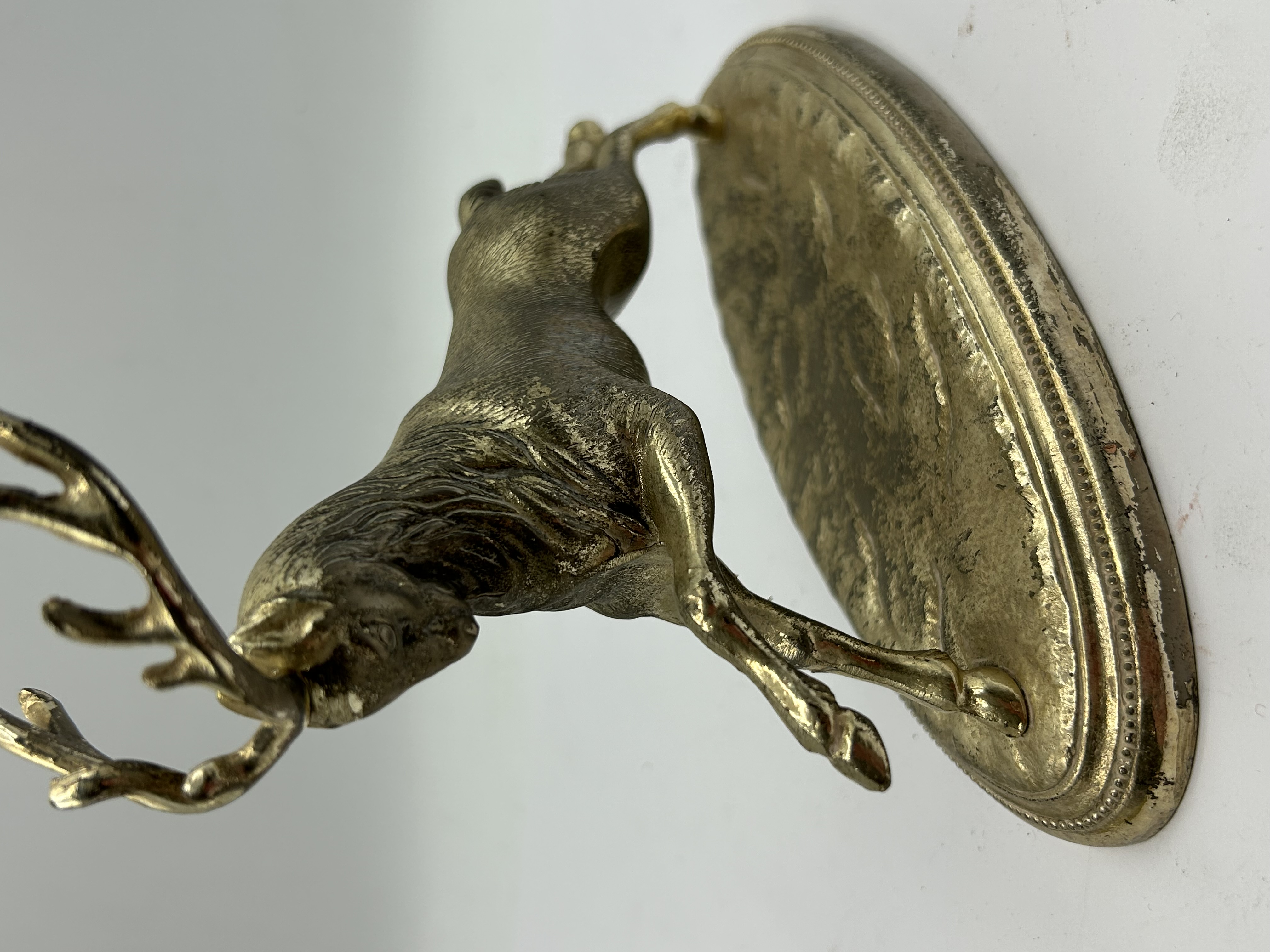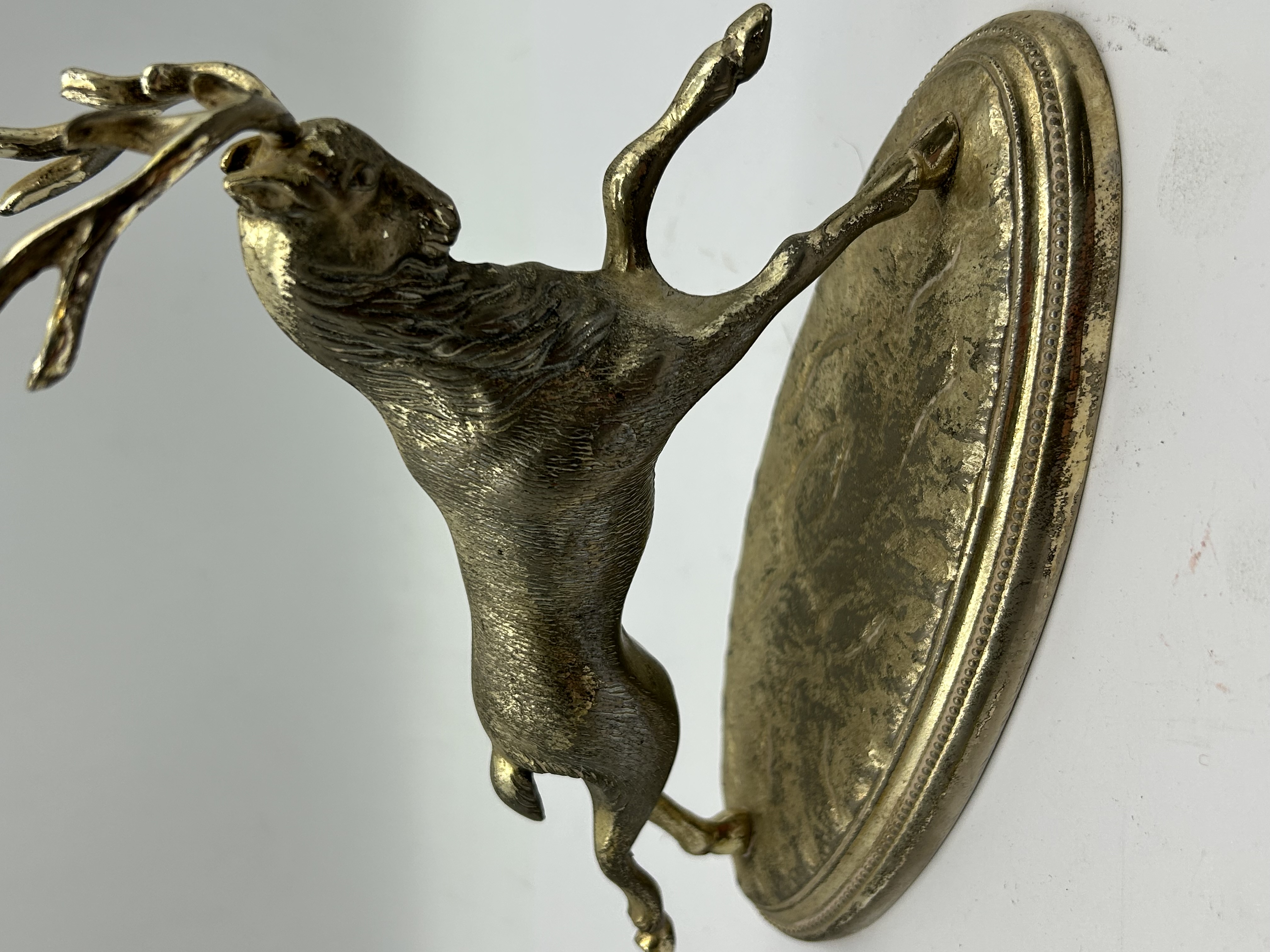 A mid-20th-century sculpture of a stag in a dynamic leaping pose, cast in brass or gilded metal. The figure is mounted upon an integral, tiered oval base featuring a beaded rim. The underside of the base exhibits a textured finish and is stamped with SPAIN within a rectangular cartouche.