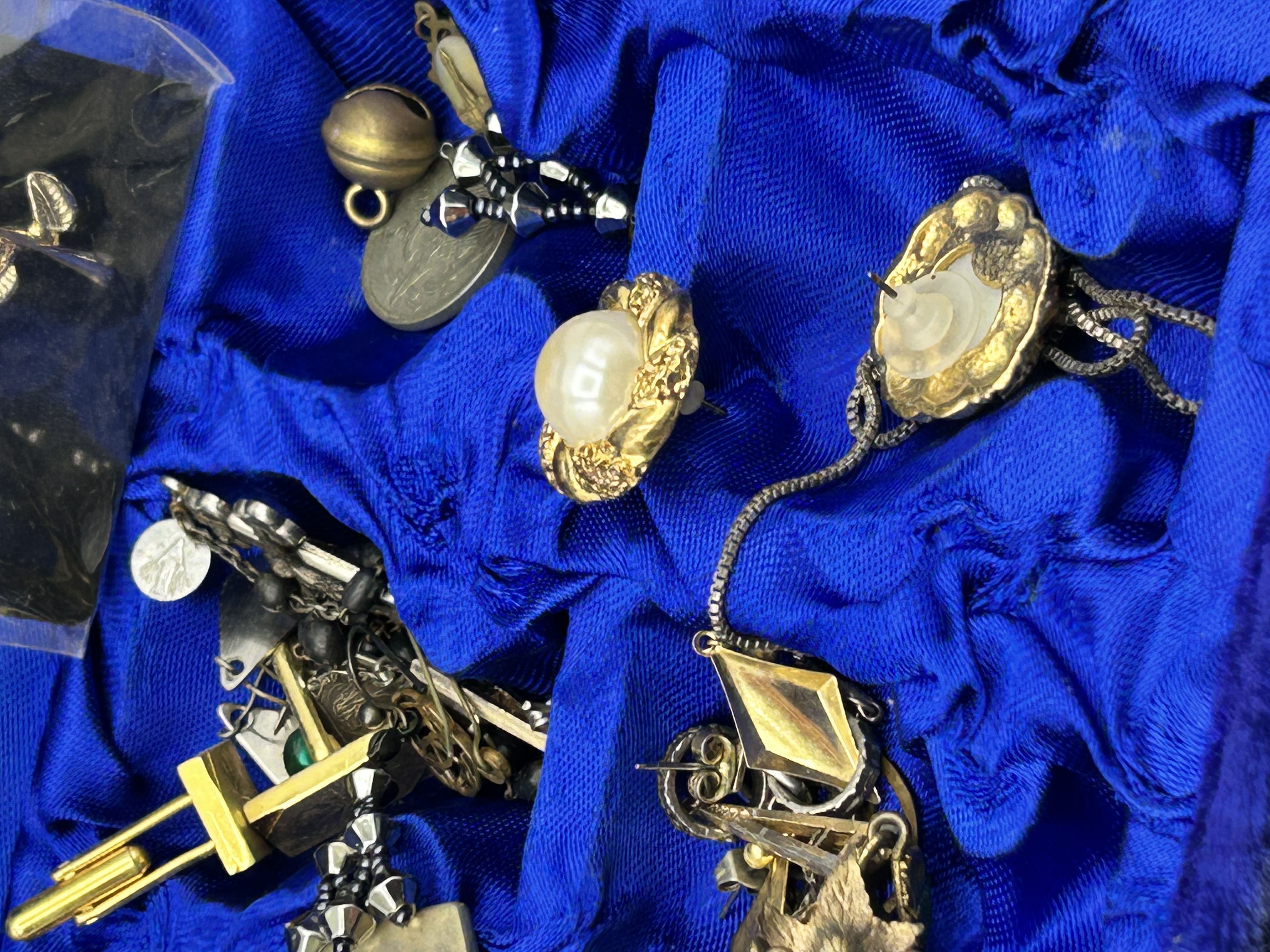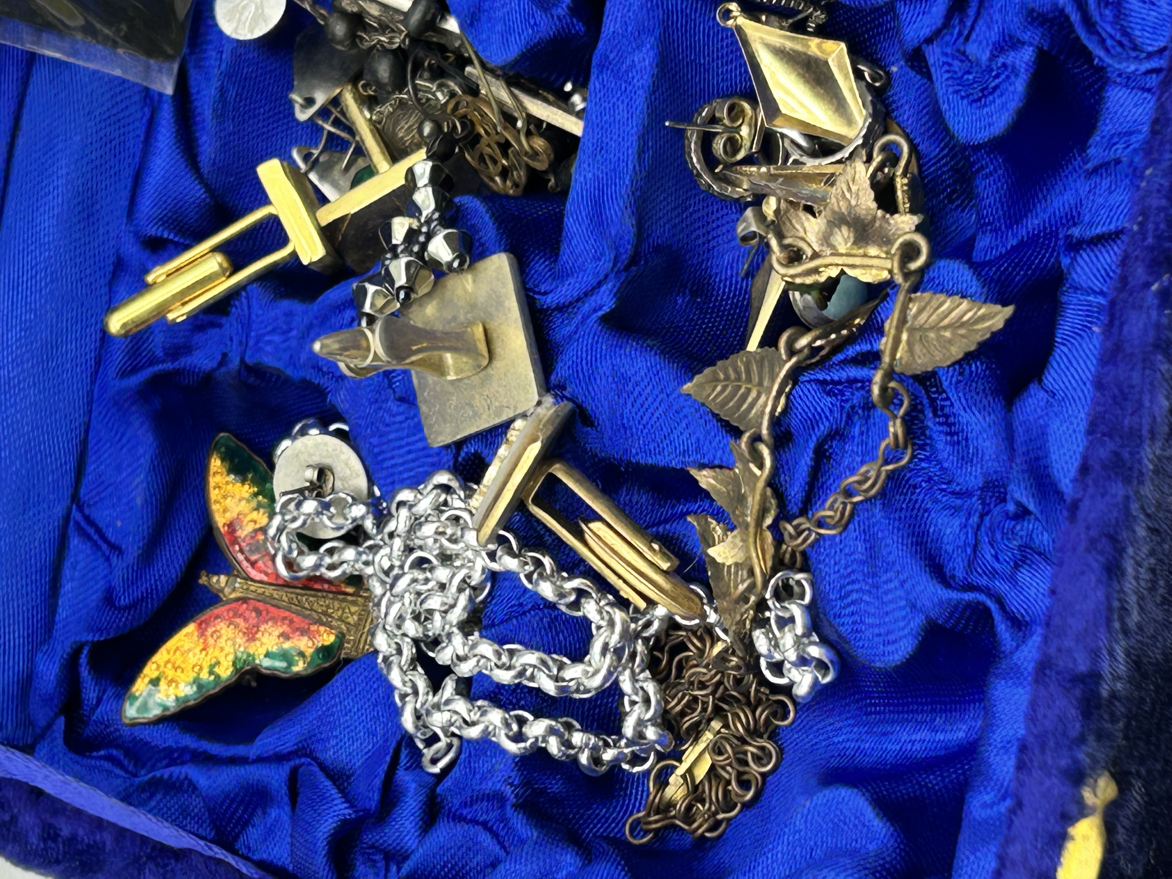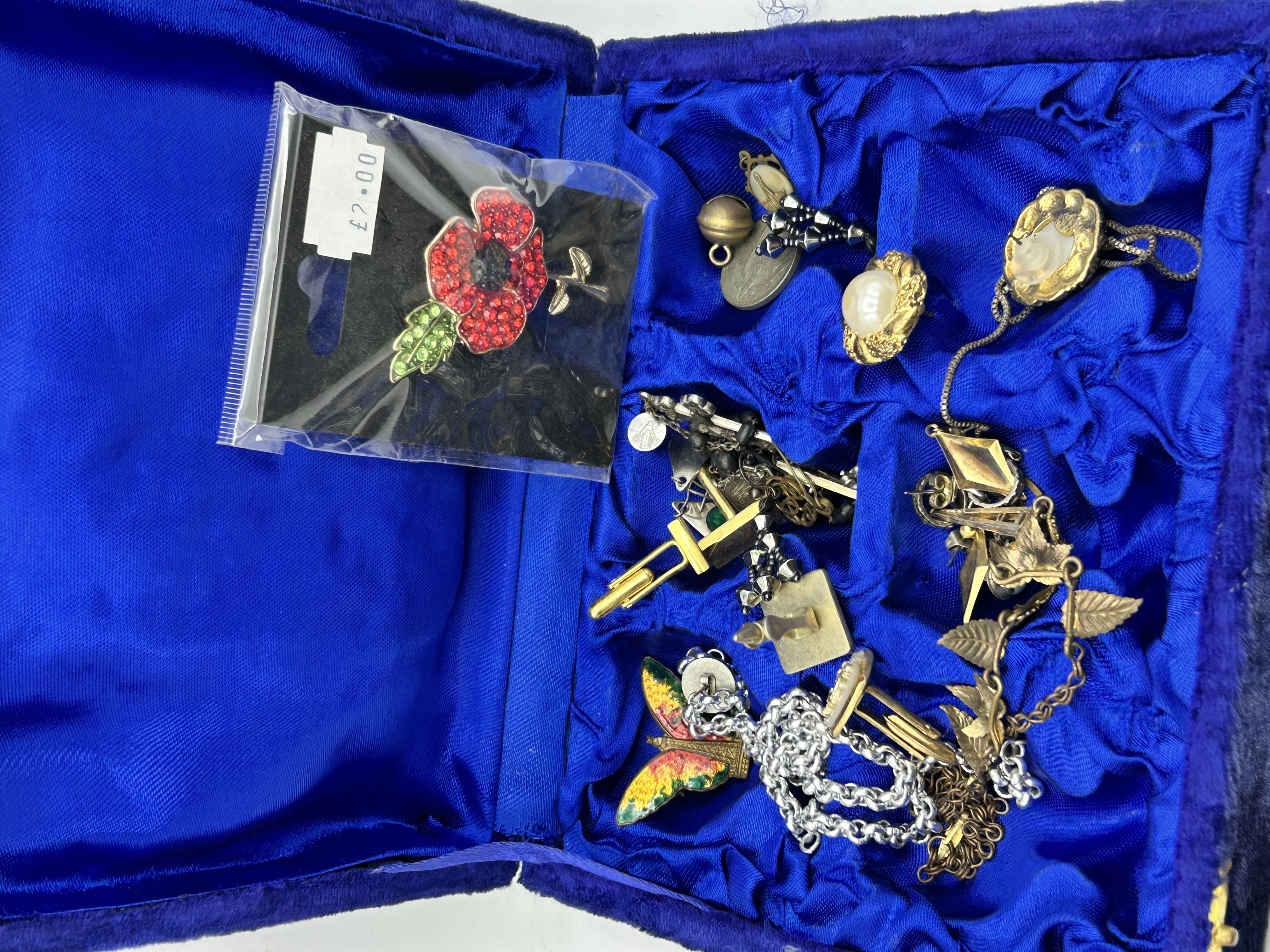 An assortment of costume jewellery and miscellaneous objects presented in a blue velvet-lined case. The collection includes a red poppy brooch set with red and green rhinestones, retained in its original plastic packaging. Also present is an enameled butterfly-shaped pin with yellow and red detailing, a gold-toned necklace featuring a leaf-motif design, and a pair of faux-pearl stud earrings with textured gold-toned surrounds. The lot further comprises various gold- and silver-toned cufflinks in geometric designs, several metal chains, a small brass bell, and a silver-toned coin. The items are constructed from base metals, glass, enamel, and plastic.