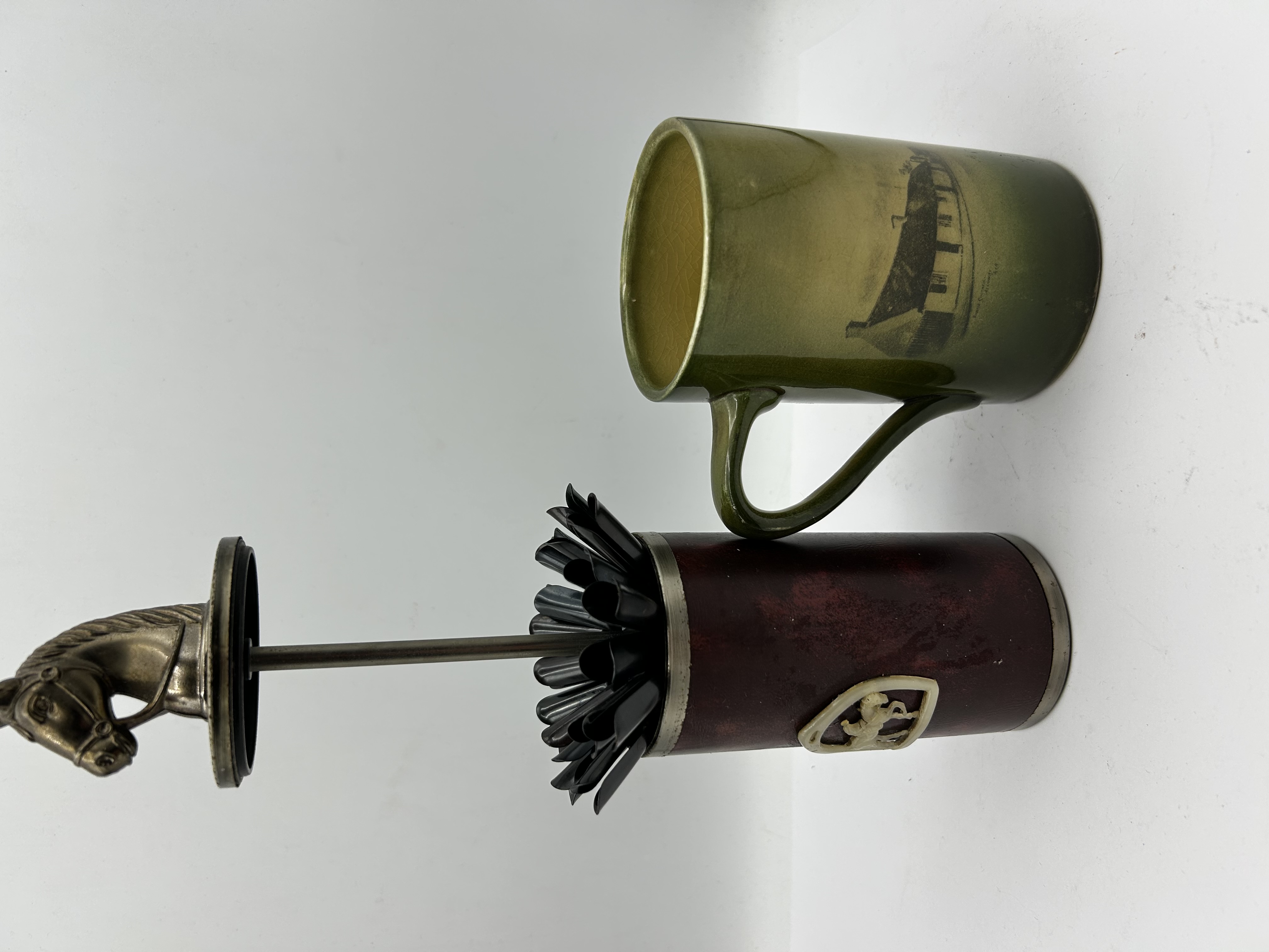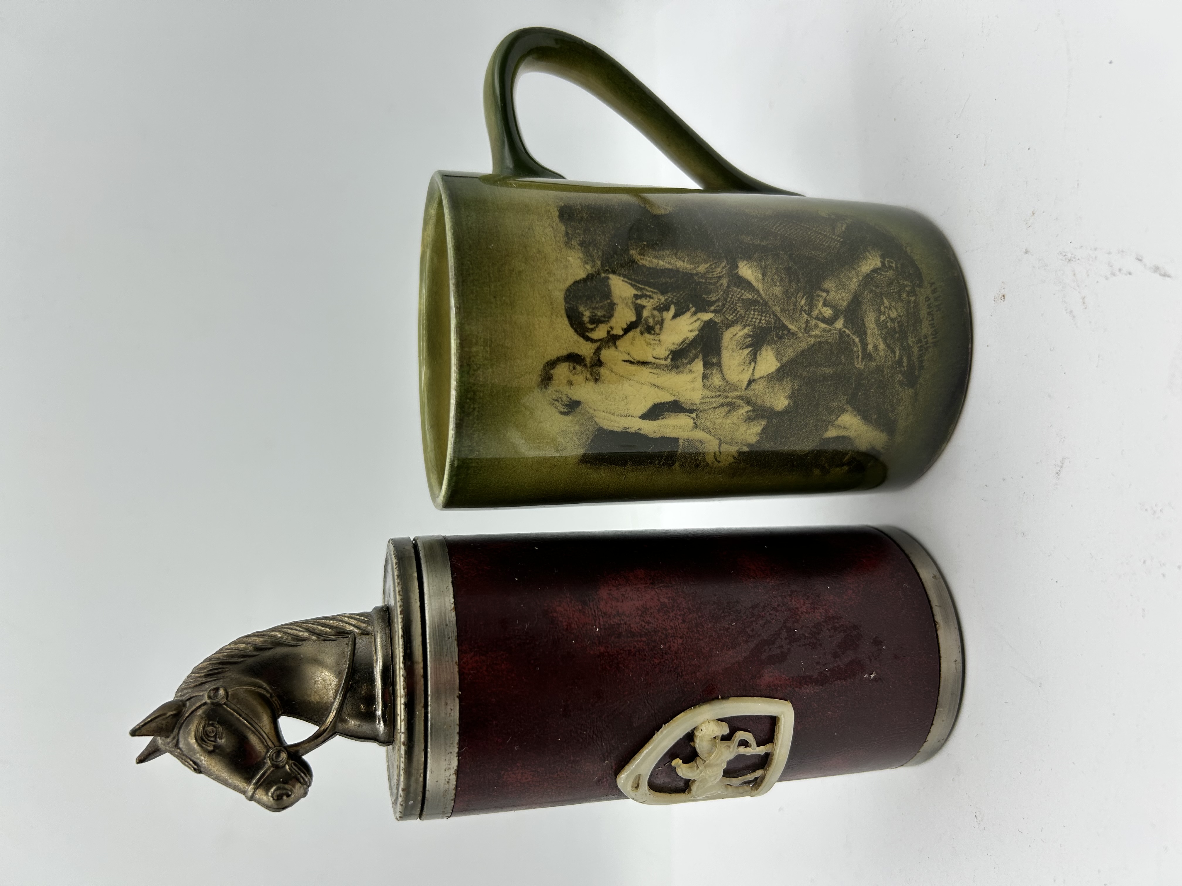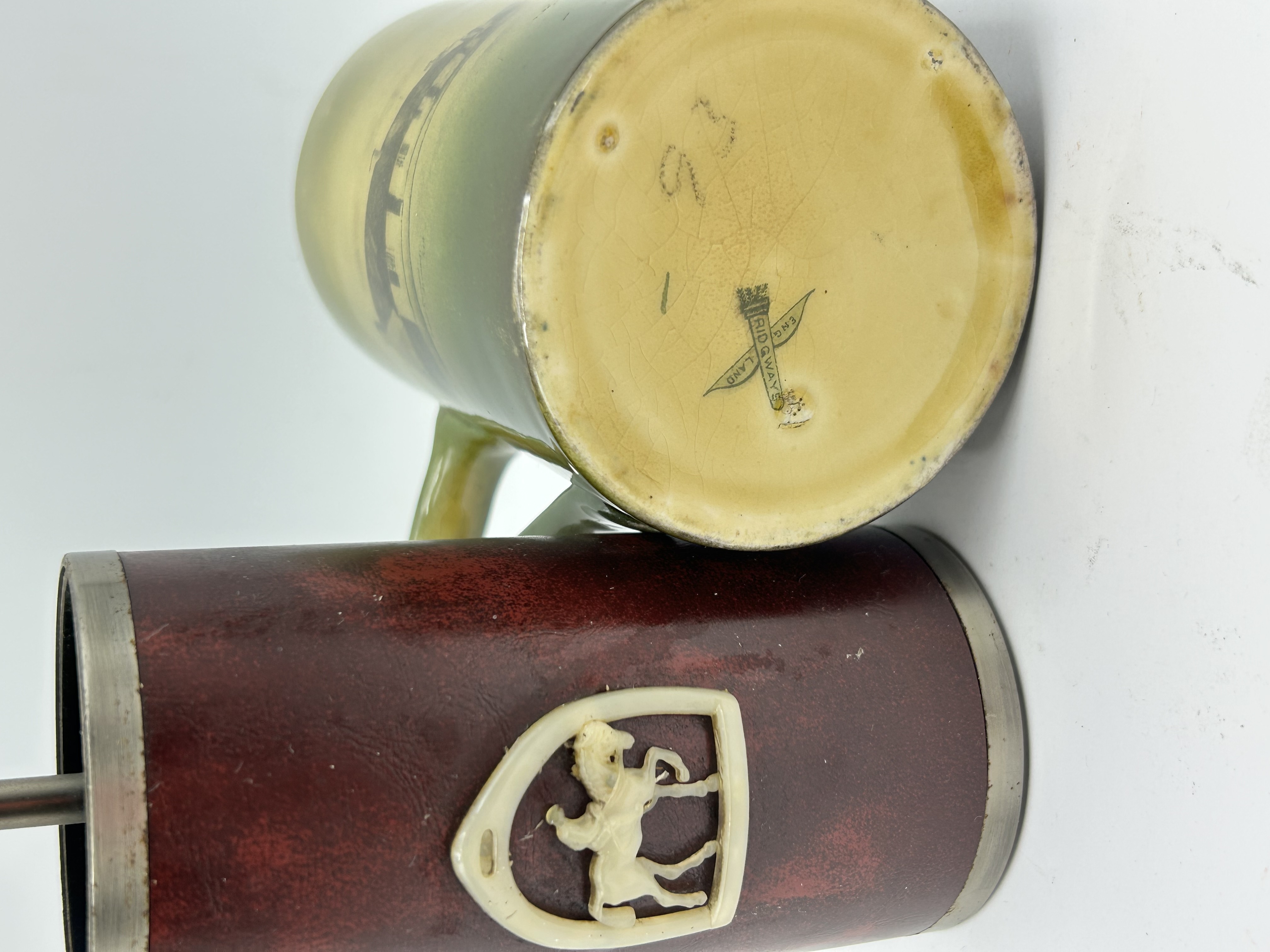 A lot consisting of two items. The first is a glazed ceramic mug produced by Ridgways, England. The vessel features an olive green glaze with transfer-printed scenes including a cottage and a group of figures, titled The Highland Mary. The base is marked with a green stamped Ridgways England mark. The second item is a mechanical cigarette dispenser with a cylindrical body wrapped in maroon faux-leather. The body is decorated with a white plastic shield crest depicting a rearing horse. The item is fitted with a cast metal horse-head handle that operates a lift-up internal mechanism for the storage and dispensing of cigarettes.