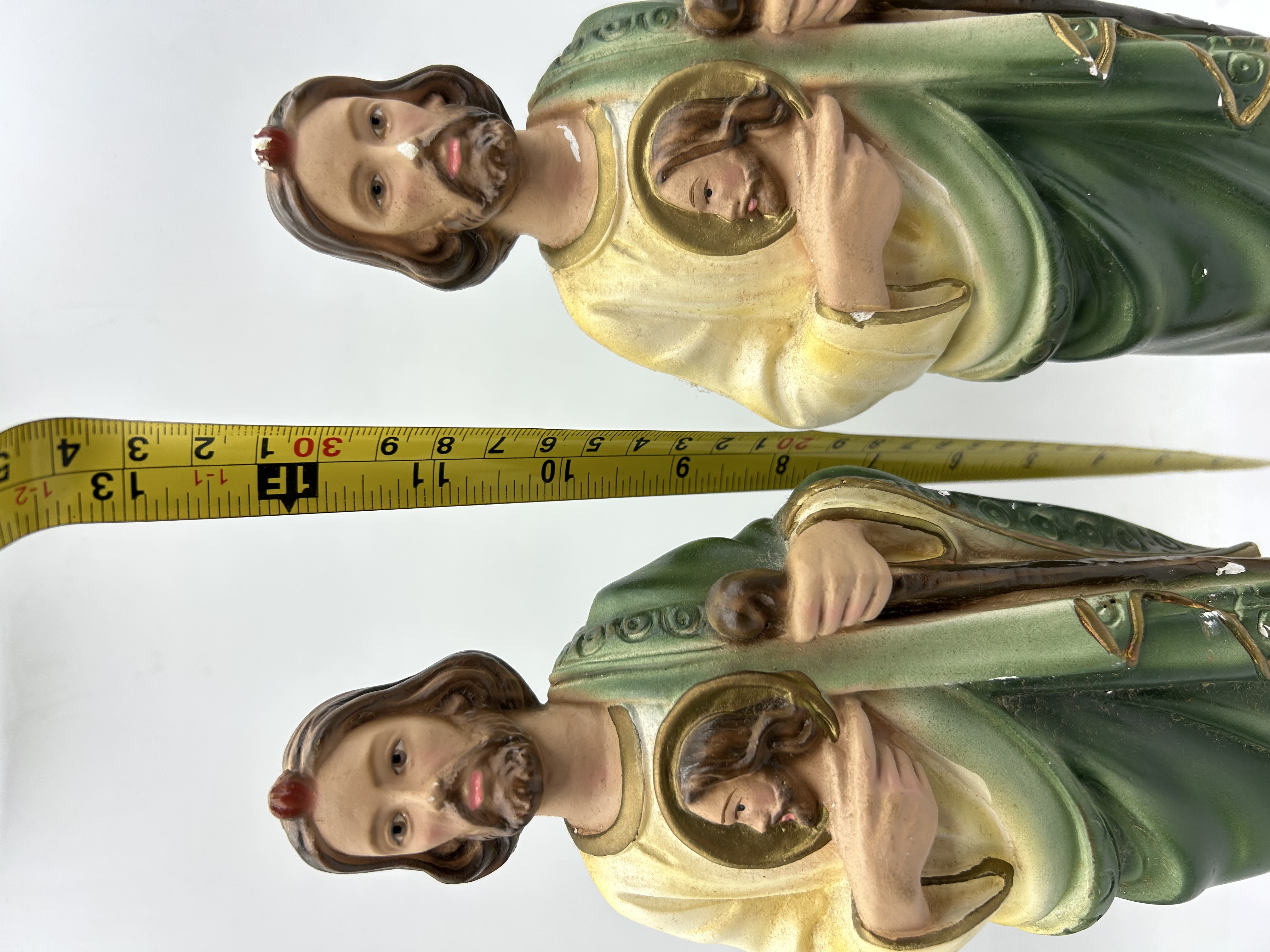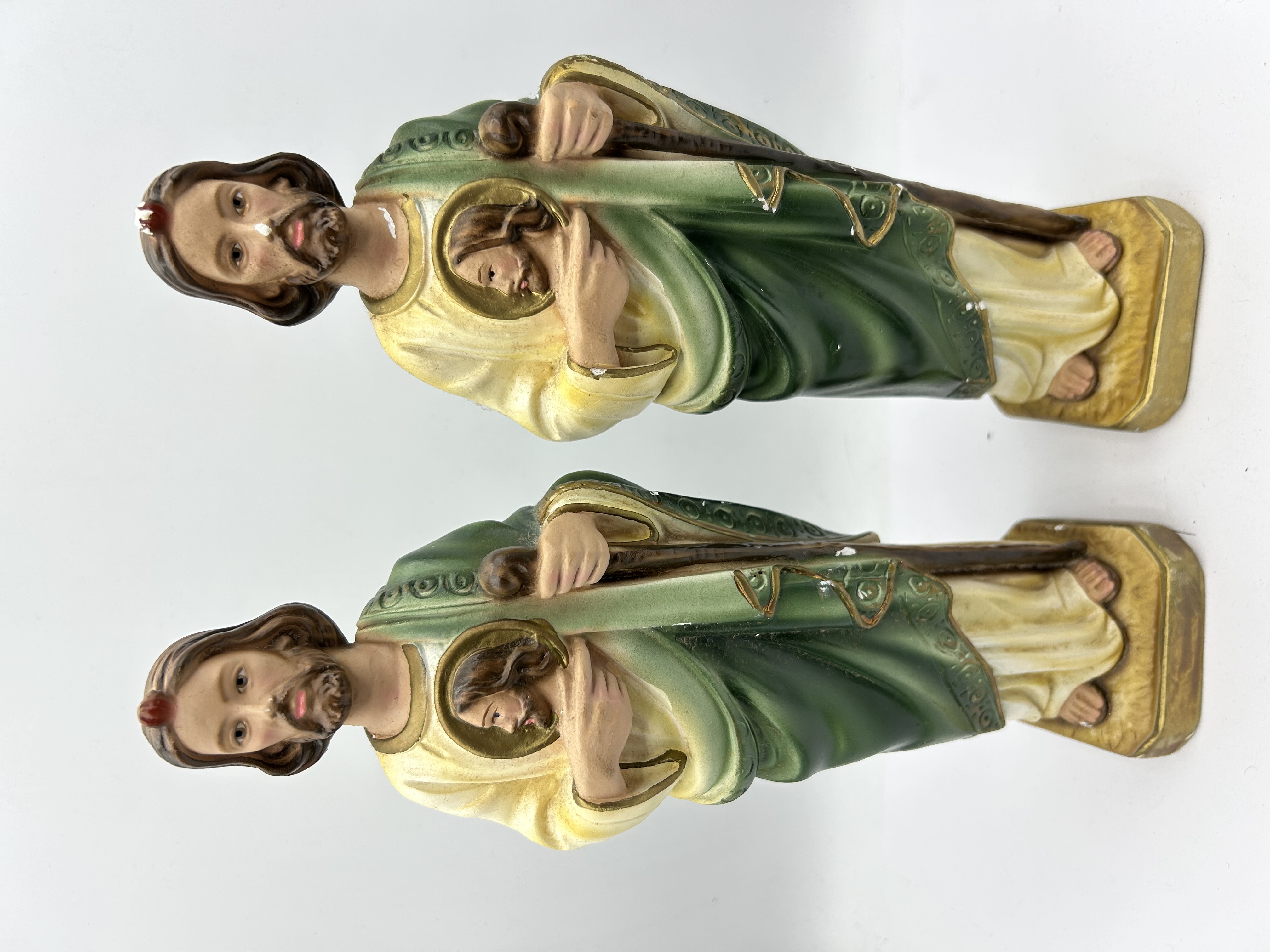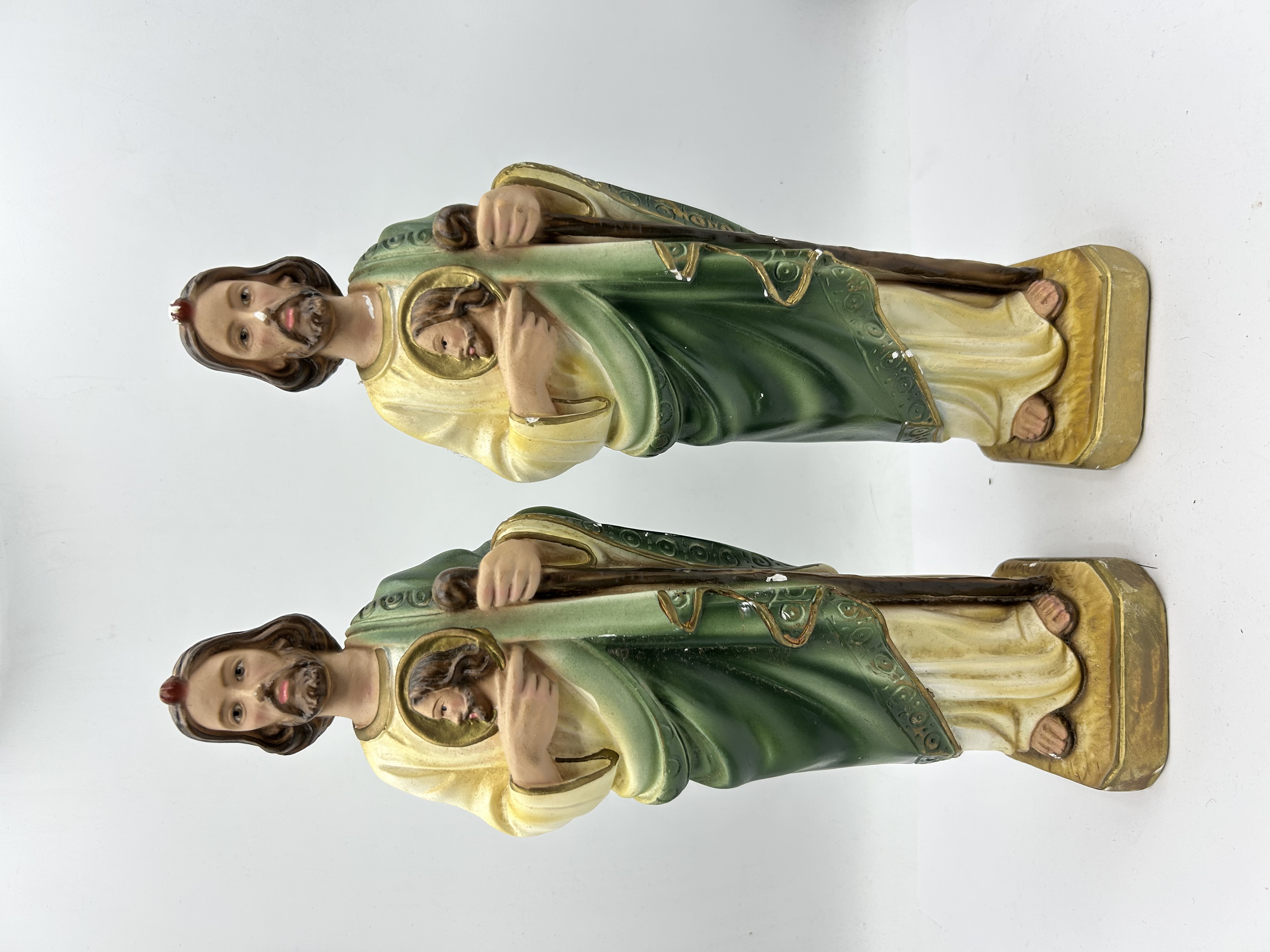 A pair of polychrome religious figurines depicting Saint Jude Thaddeus, rendered in a traditional devotional style. Each figure is crafted from painted plaster and is depicted wearing flowing green and cream robes with gold-toned decorative borders. The saint is shown holding a brown staff in one hand and a golden medallion bearing the image of Christ against his chest. A symbolic red flame is positioned atop the head of each figure. Both statues stand on integral rectangular gold-toned bases. No maker marks or signatures are visible.