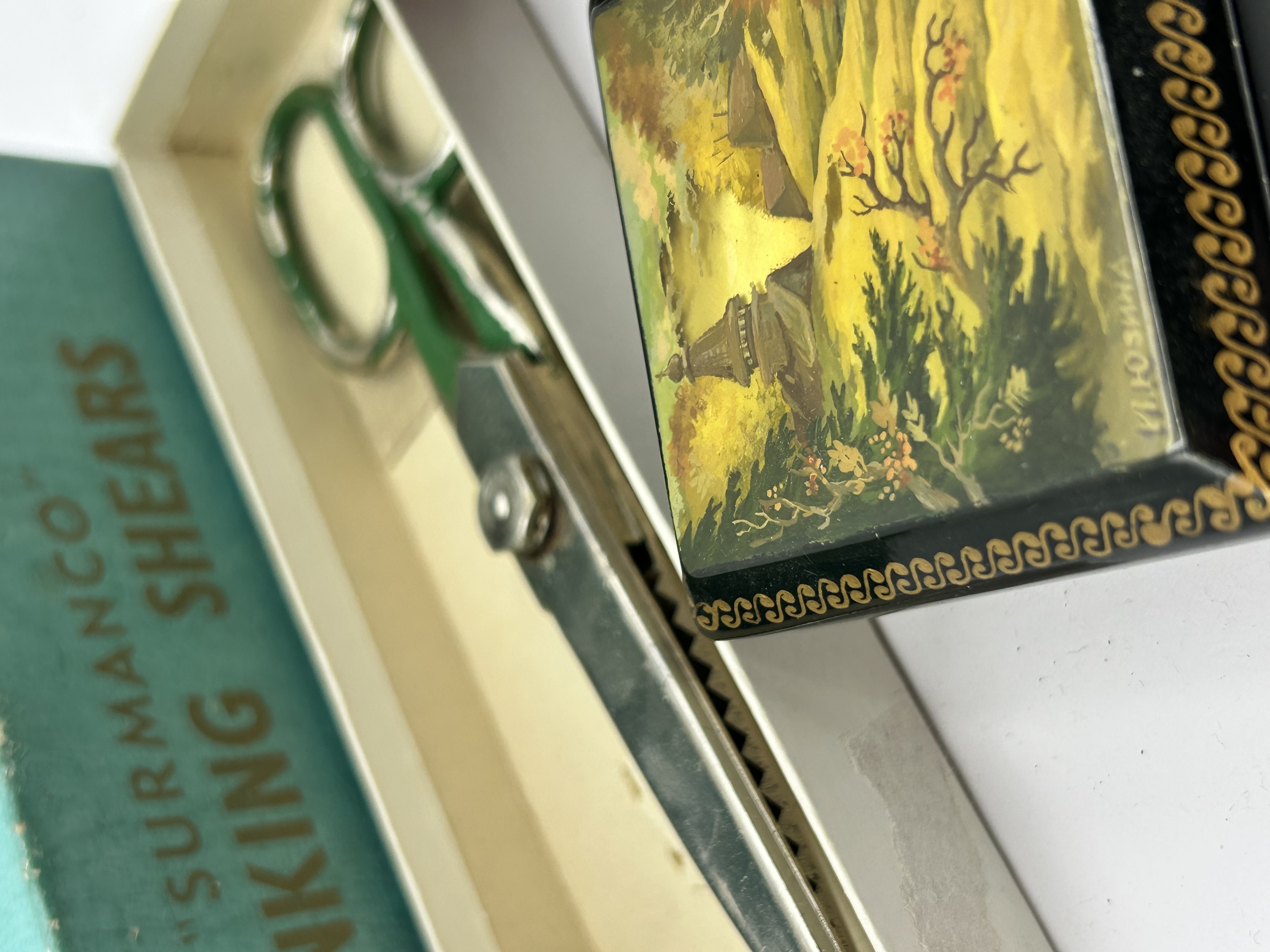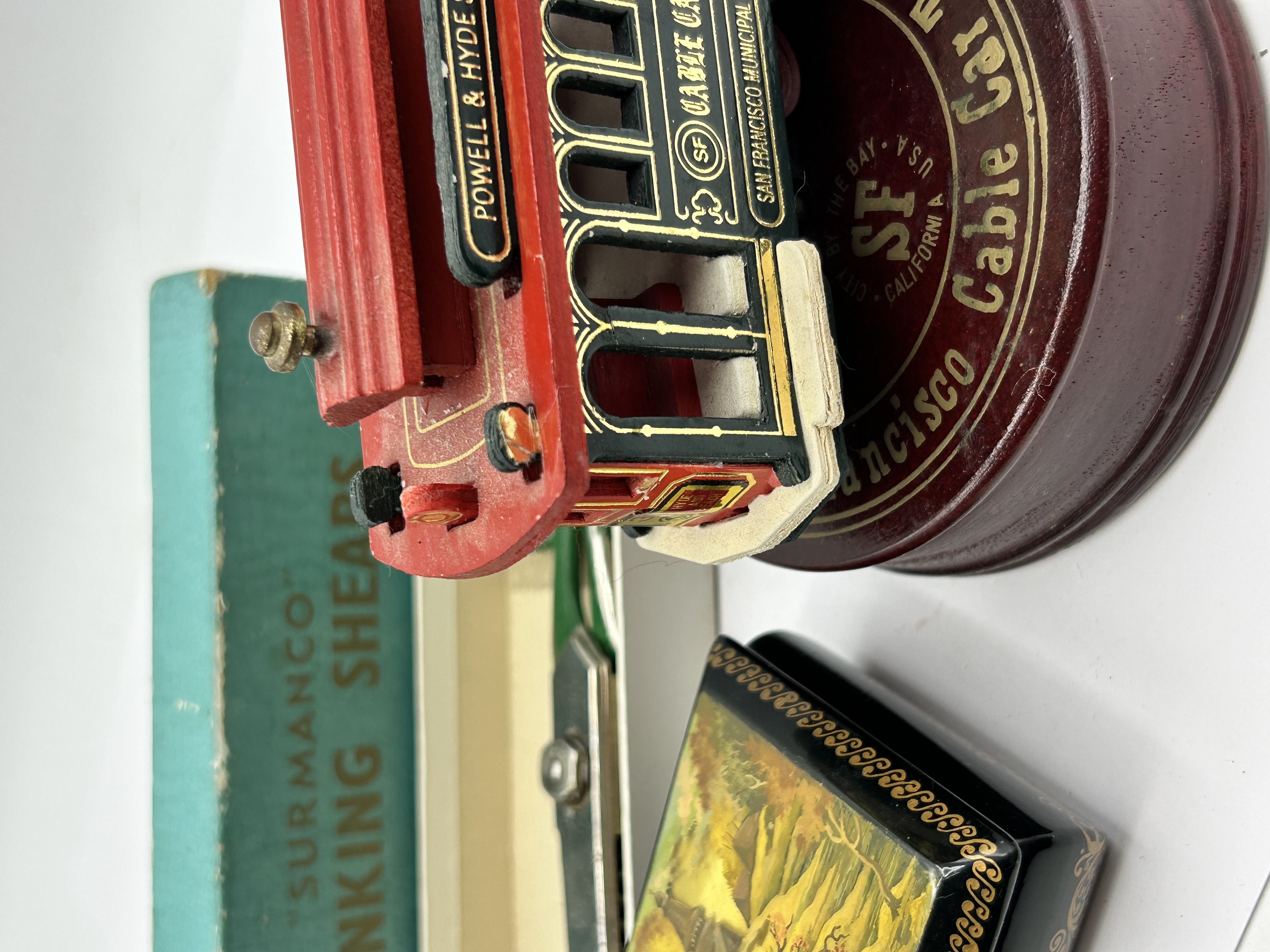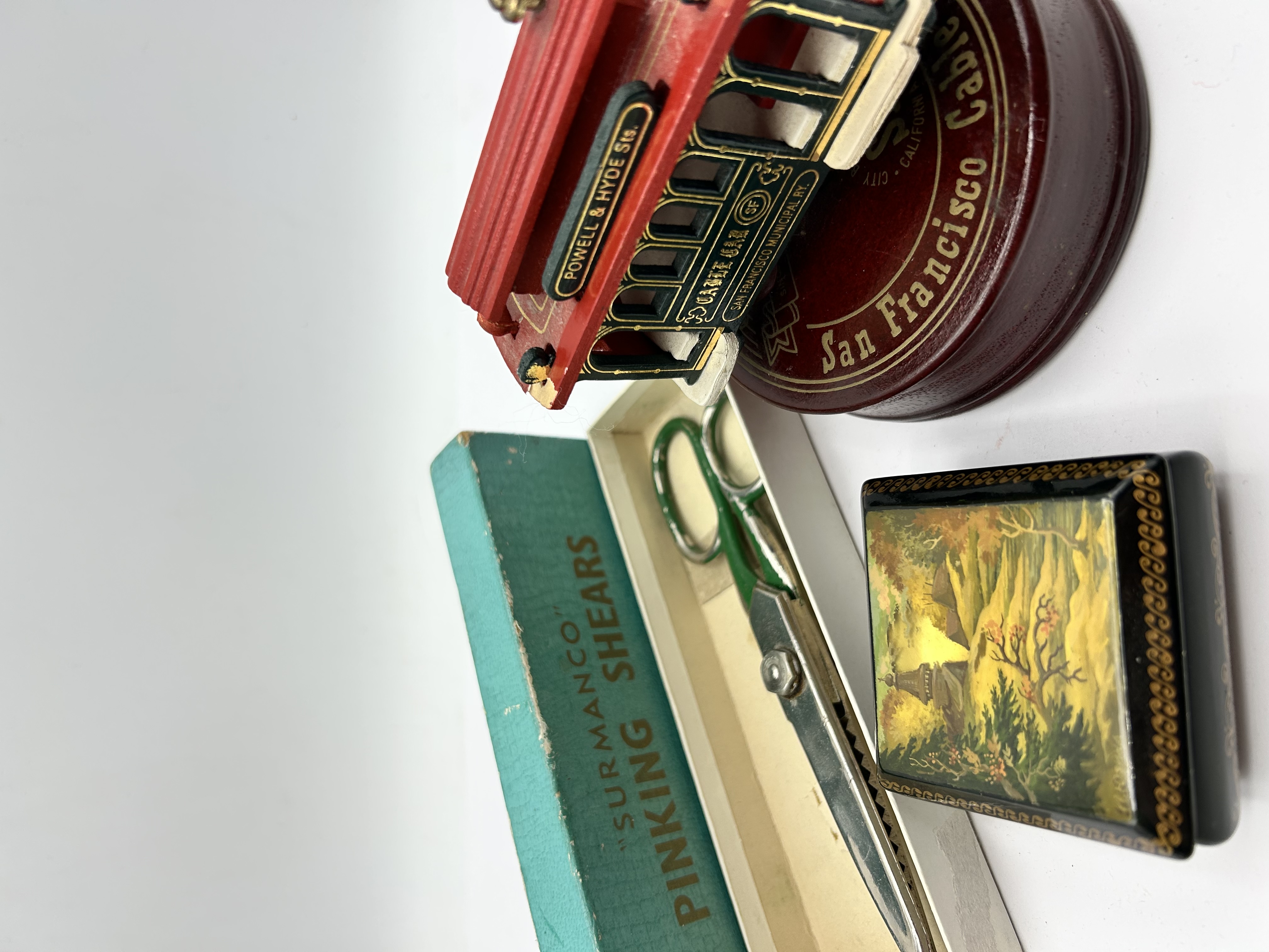 A trio of vintage collectibles. The lot includes a pair of Surmanco pinking shears with green-painted metal handles, housed in the original teal and cream cardboard box. Also featured is a model of a San Francisco Powell and Hyde Sts. cable car, mounted on a circular dark wood base. The model is finished in red and black paint with gold-tone detailing and San Francisco Municipal Ry. text; this item is attributed to the San Francisco Music Box Company. The third item is a rectangular black lacquer box, likely of Russian origin, featuring a hand-painted landscape scene on the lid depicting a building amongst trees, finished with a gold-tone scrolled border and a Cyrillic signature to the lower right.