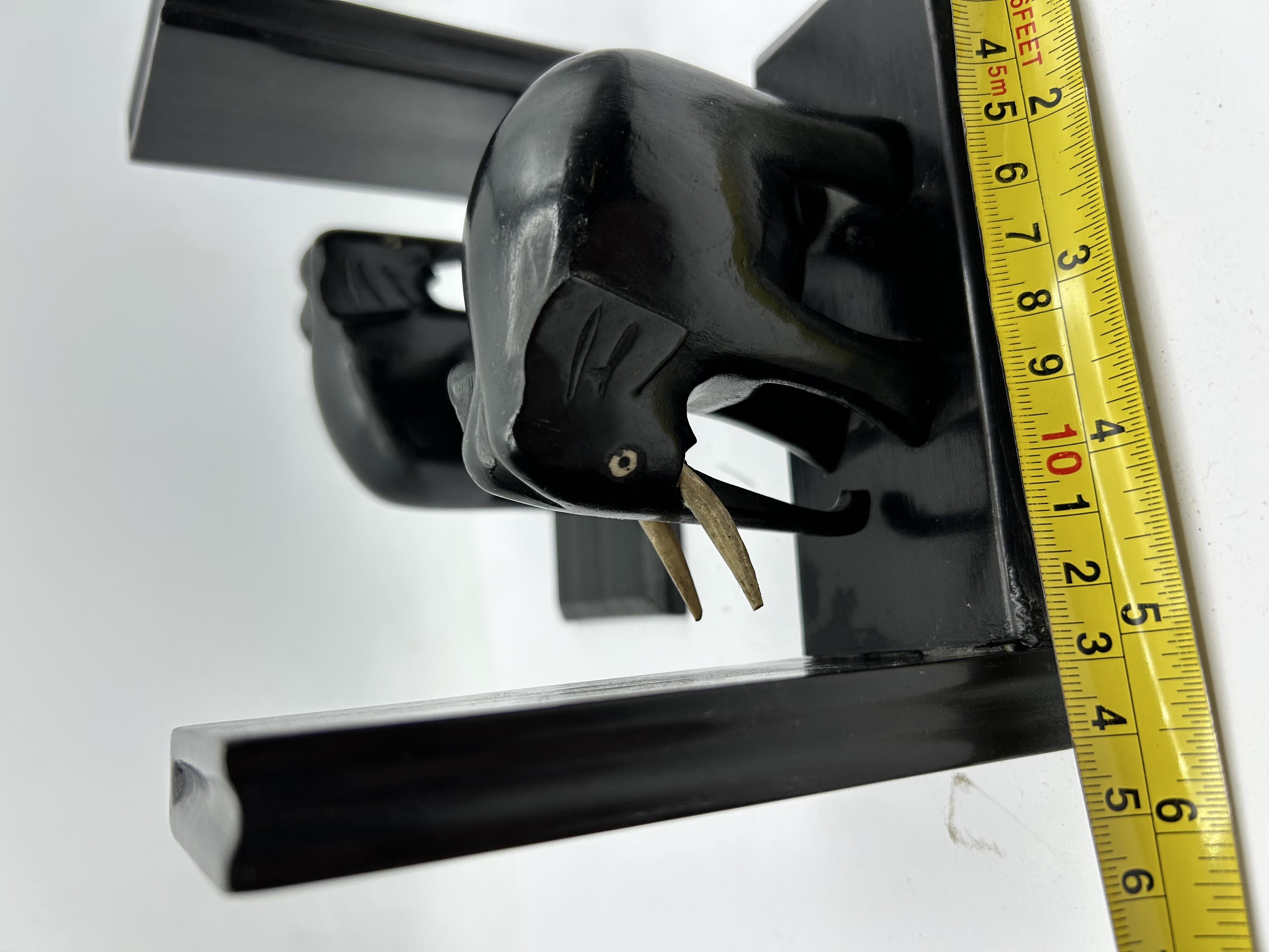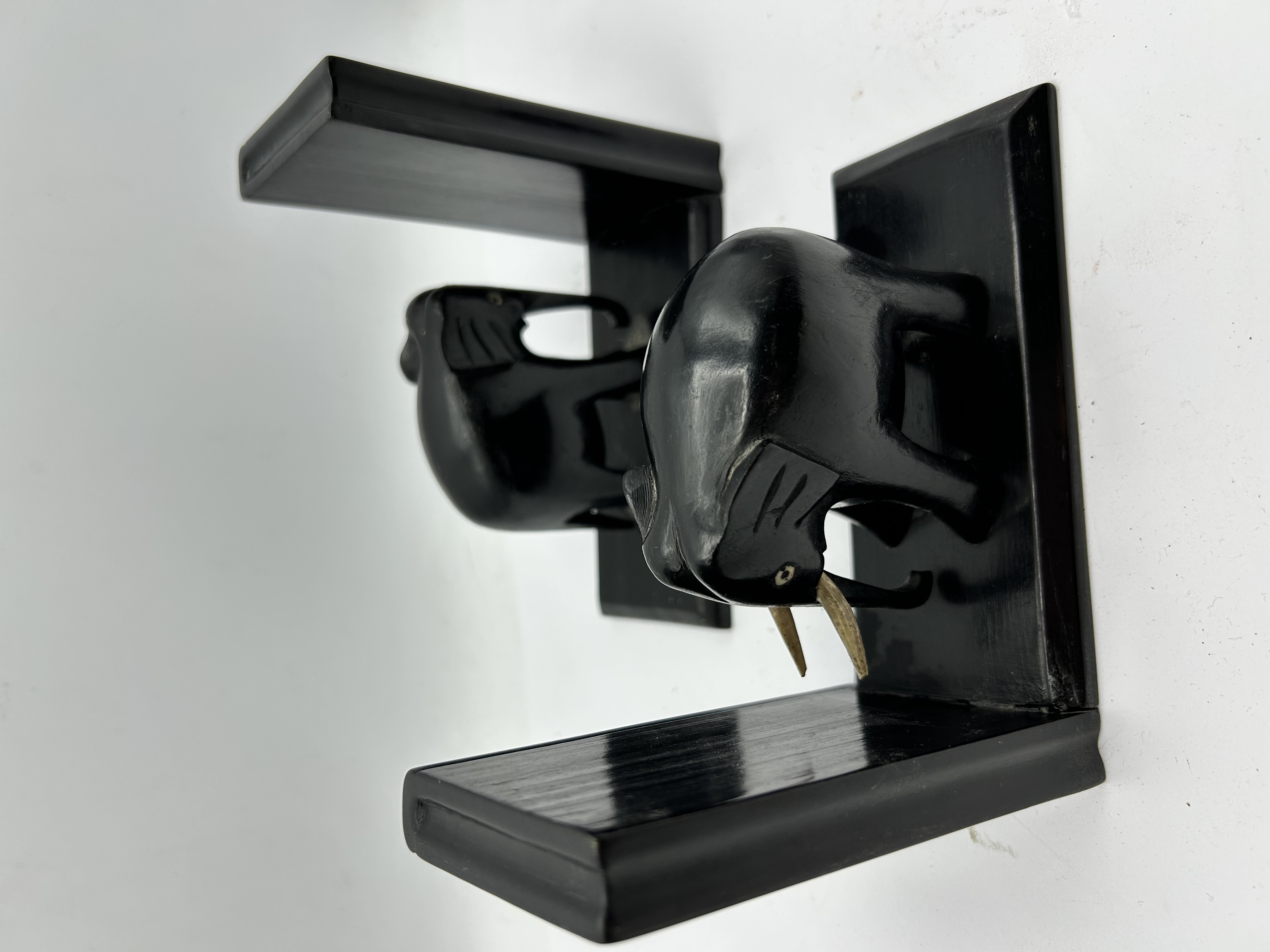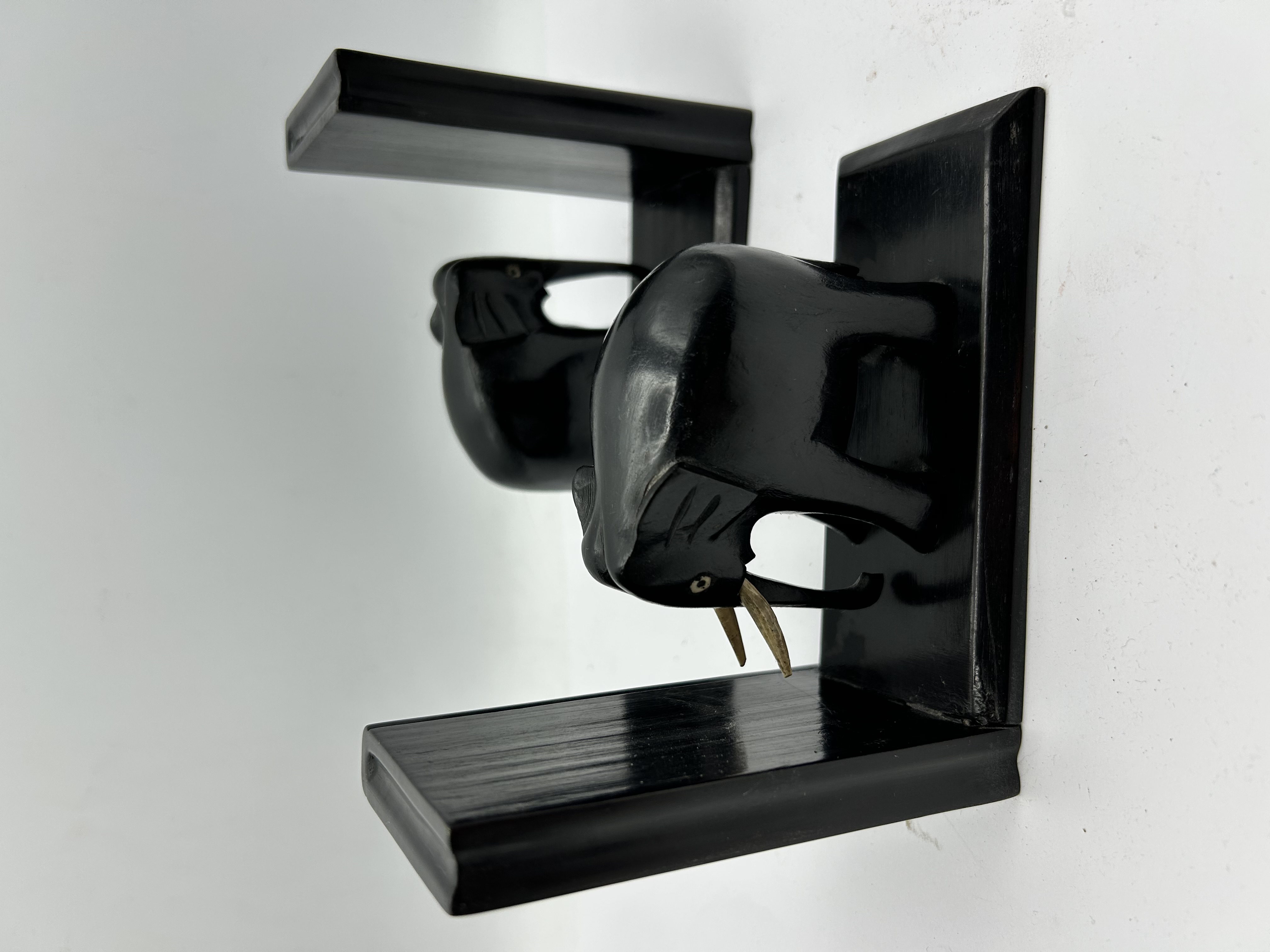 A pair of matching bookends featuring stylised carved elephant figures. The items are constructed from wood with a polished black finish, mounted on L-shaped bases with bevelled edges. Each elephant is accented with contrasting light-coloured tusks. The design reflects Art Deco stylistic influences and resembles early 20th-century hand-carved examples. No maker’s marks or signatures are present.