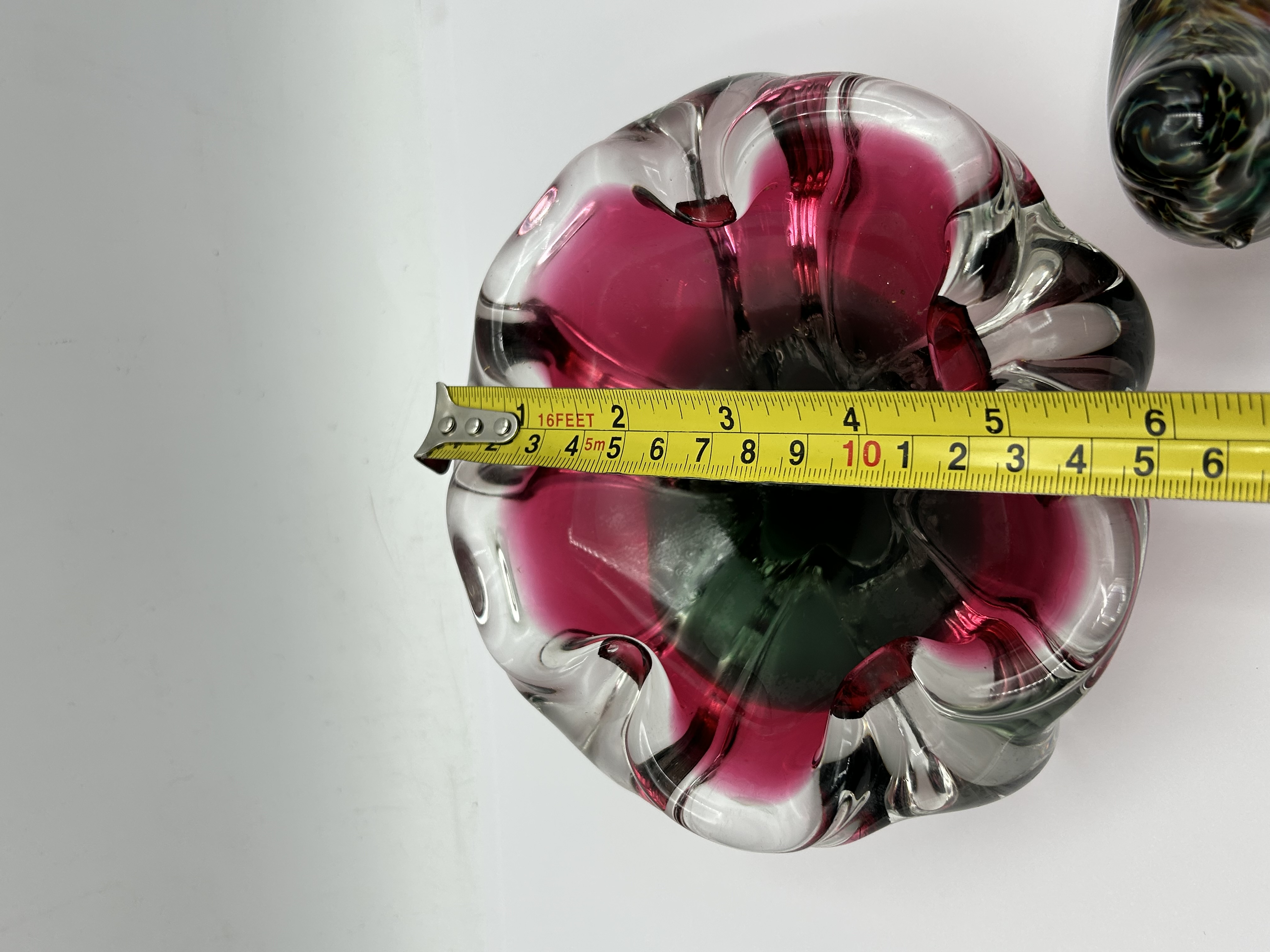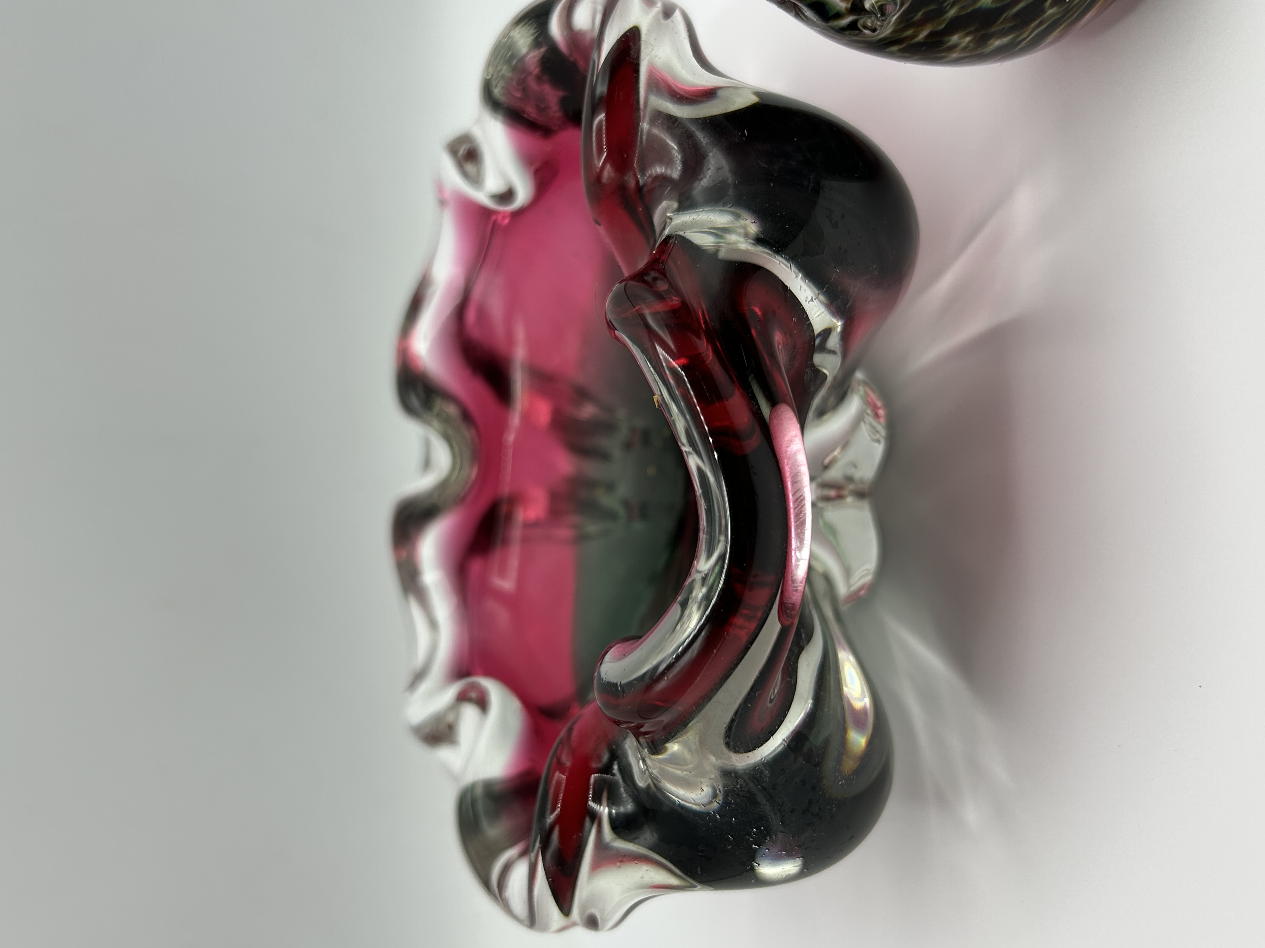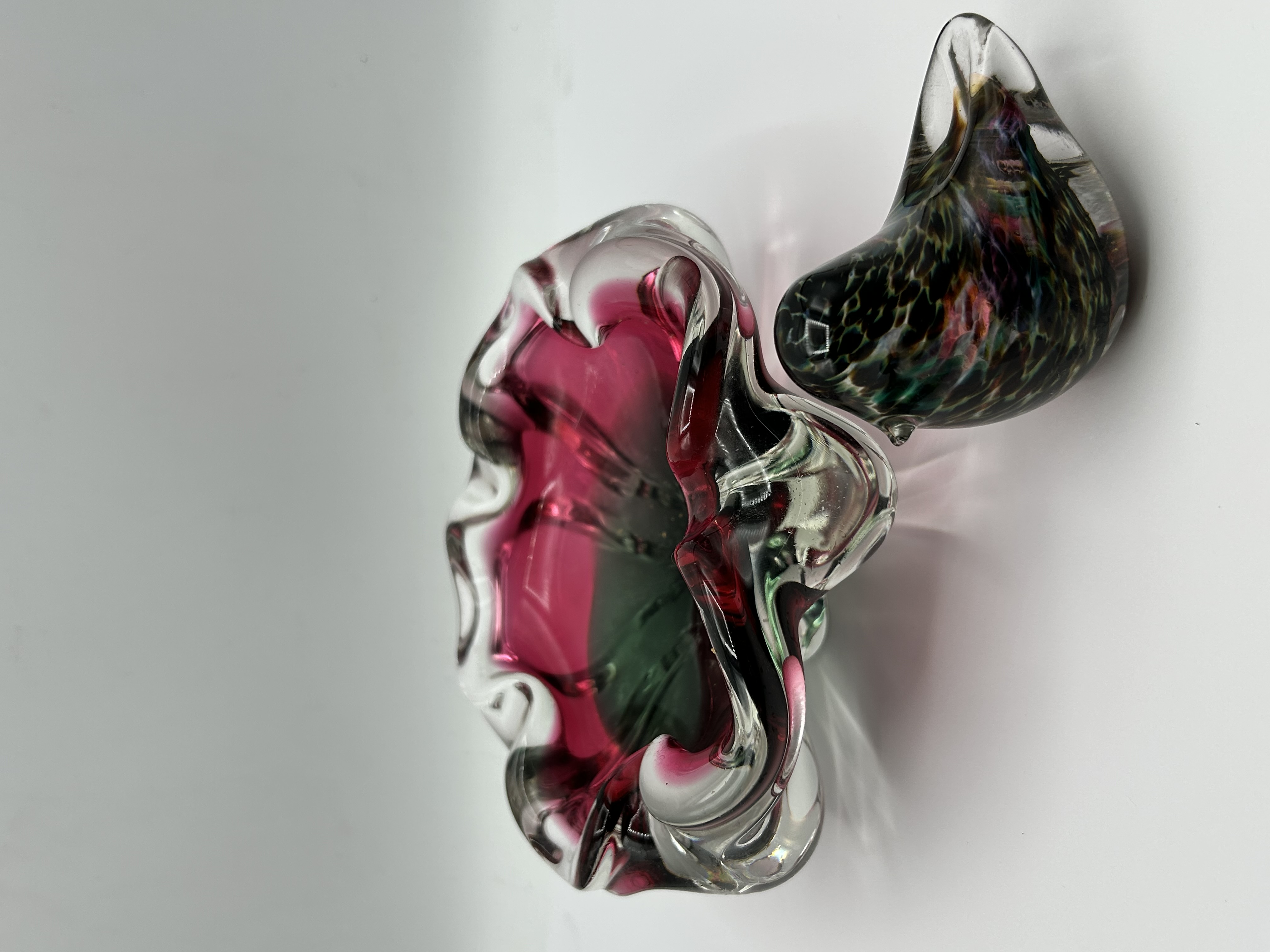 Two art glass items. The first is a heavy, hand-blown glass bowl with a ruffled rim, attributed to the Chřibská Glassworks of Czechoslovakia and designed in the style of Josef Hospodka. The piece is produced using the Sommerso technique, featuring a deep magenta interior and a green-tinted centre encased within a thick clear glass layer. The second item is a stylized bird figurine, displaying a mottled, multi-coloured pattern suspended within clear glass. Neither piece bears a visible maker’s mark or signature.
