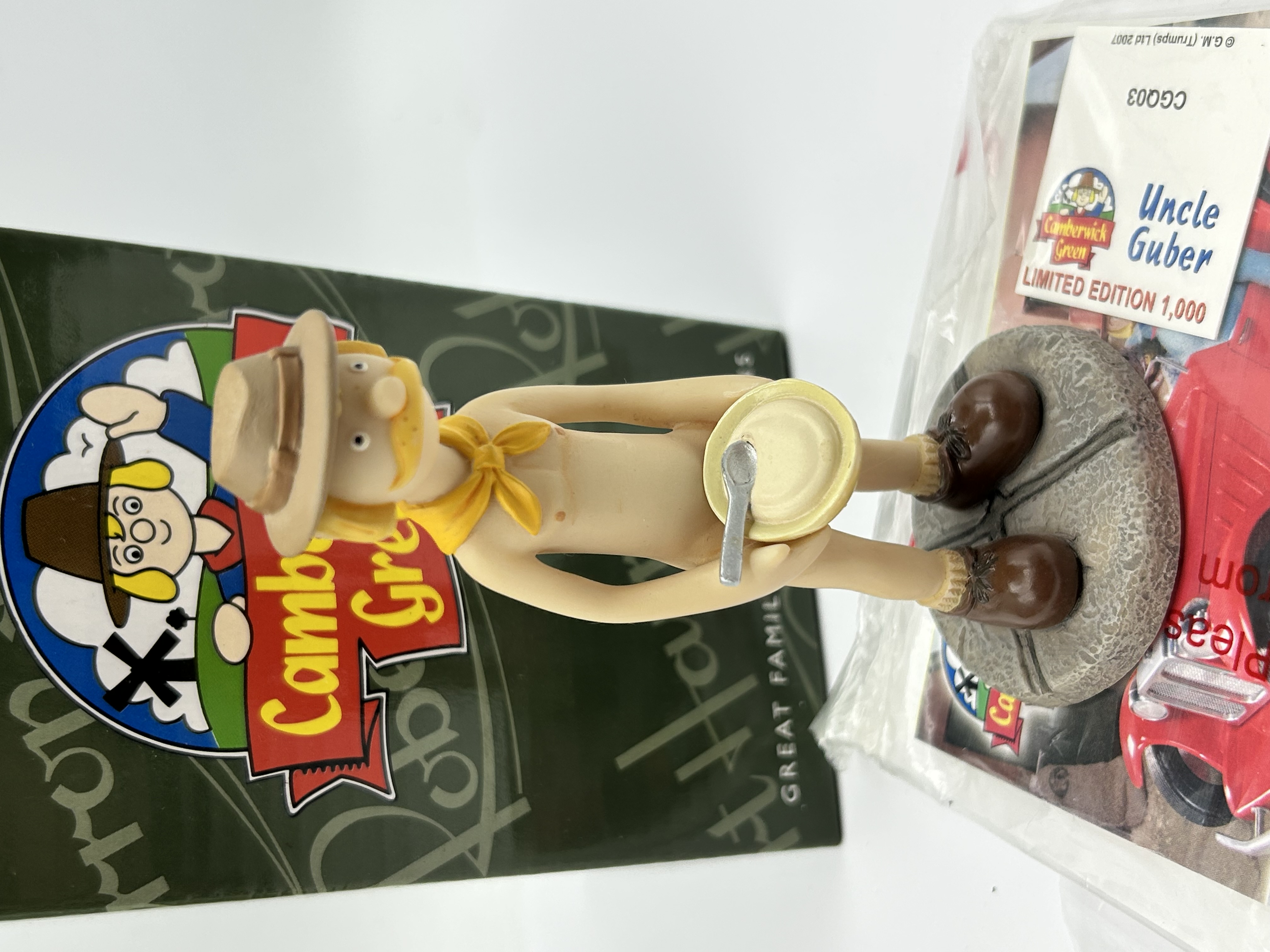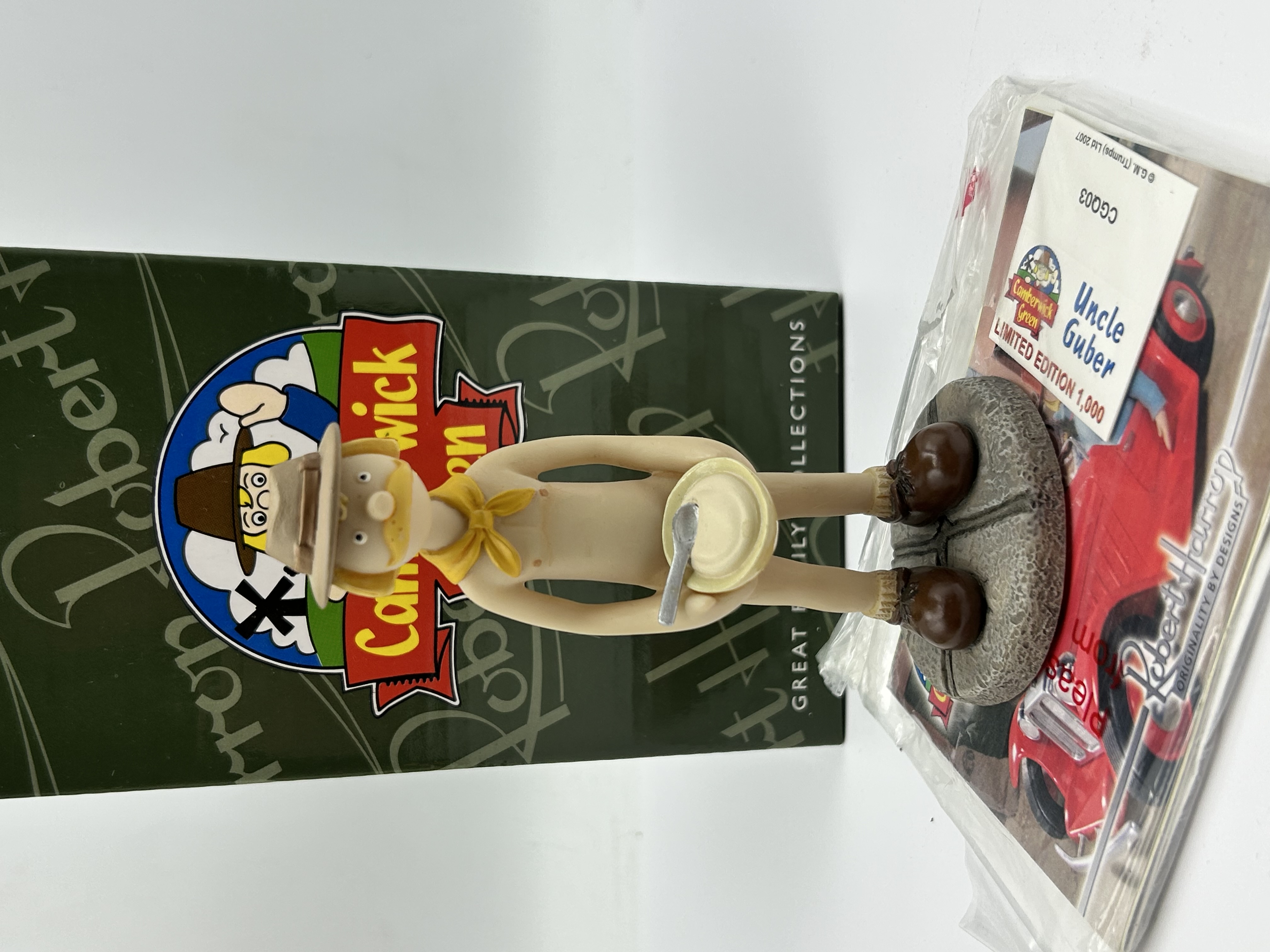 A Robert Harrop resin figurine depicting the character Uncle Guber from the British stop-motion television series Camberwick Green. The figure is part of the Great Family Collections series and is identified as model number CGQ03. The character is depicted with a blonde moustache, wearing a tan hat, yellow neckerchief, and brown boots, holding a plate and spoon. The figure stands upon a circular base with a grey cobblestone effect. This item is from a limited edition run of 1,000. The lot includes the original green Robert Harrop branded box and an informational booklet.