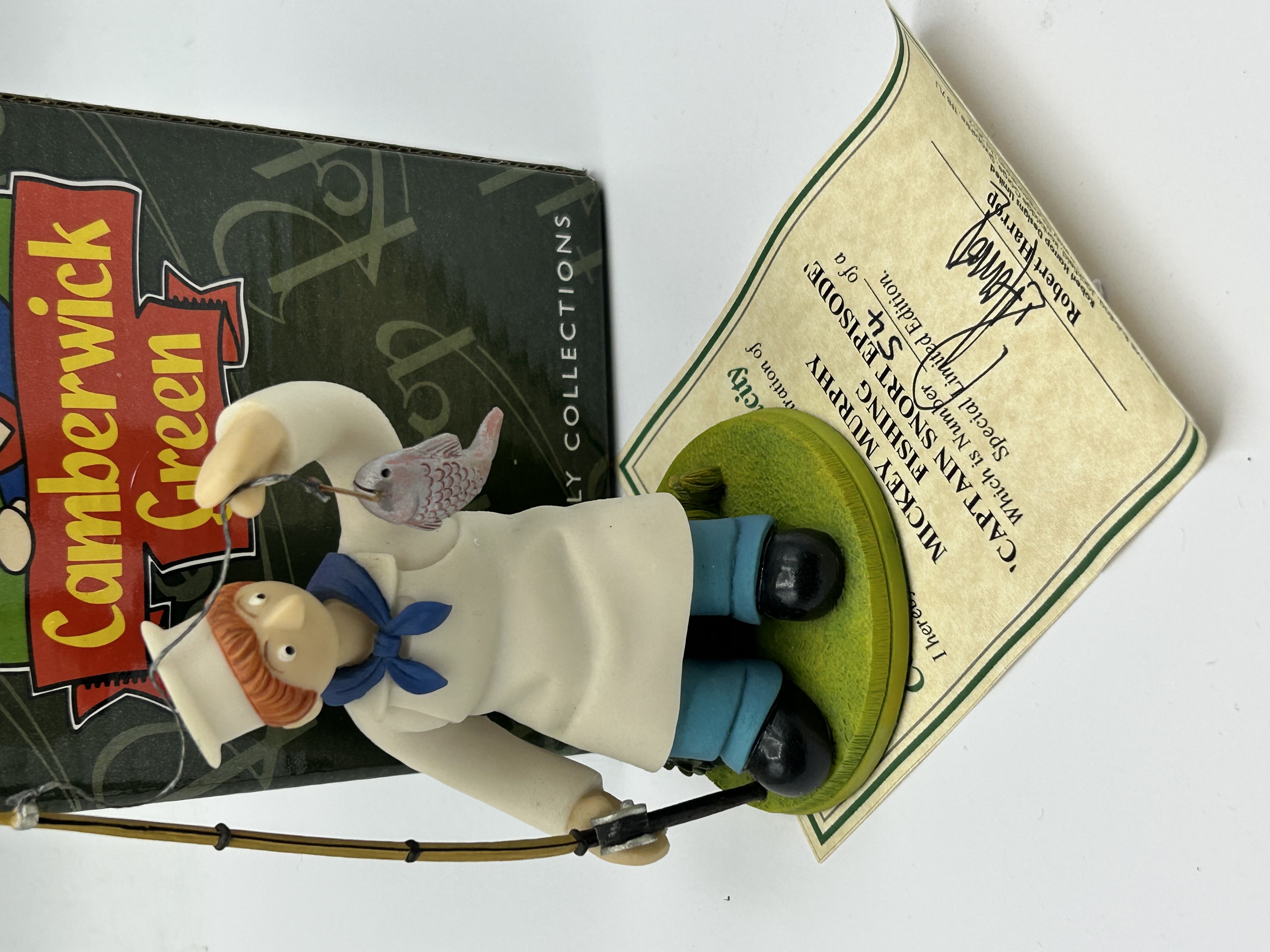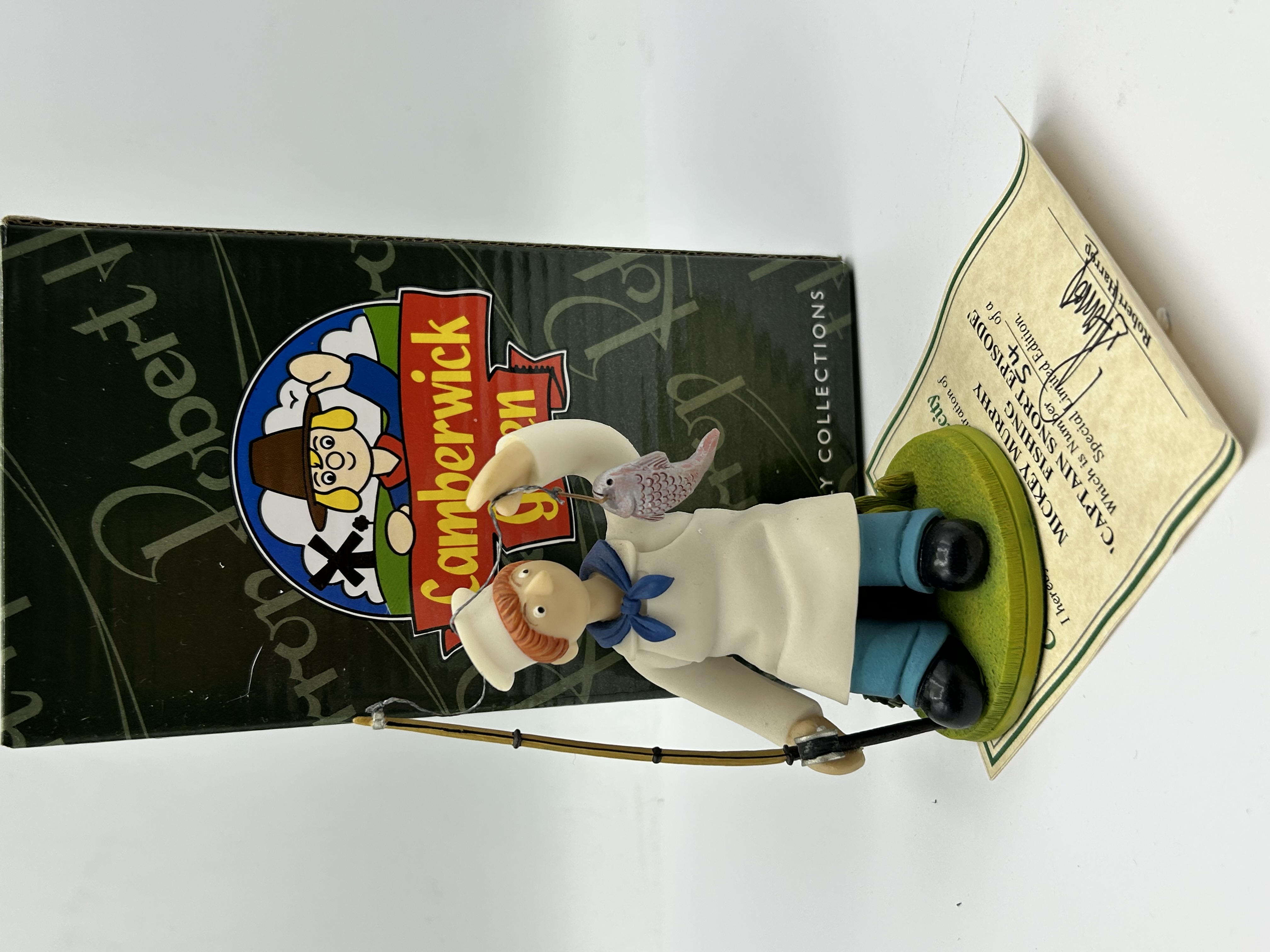 A Robert Harrop Designs Limited hand-painted character figurine featuring Mickey Murphy from the television series Camberwick Green. The piece, titled Mickey Murphy Captain Snort Episode Fishing, depicts the baker character in a white uniform with a blue neckerchief, holding a fishing rod with a caught fish. The figure is mounted on a circular green base. This lot includes the original green illustrated box and a hand-signed Certificate of Authenticity, which identifies this example as number 54 of a Special Limited Edition.