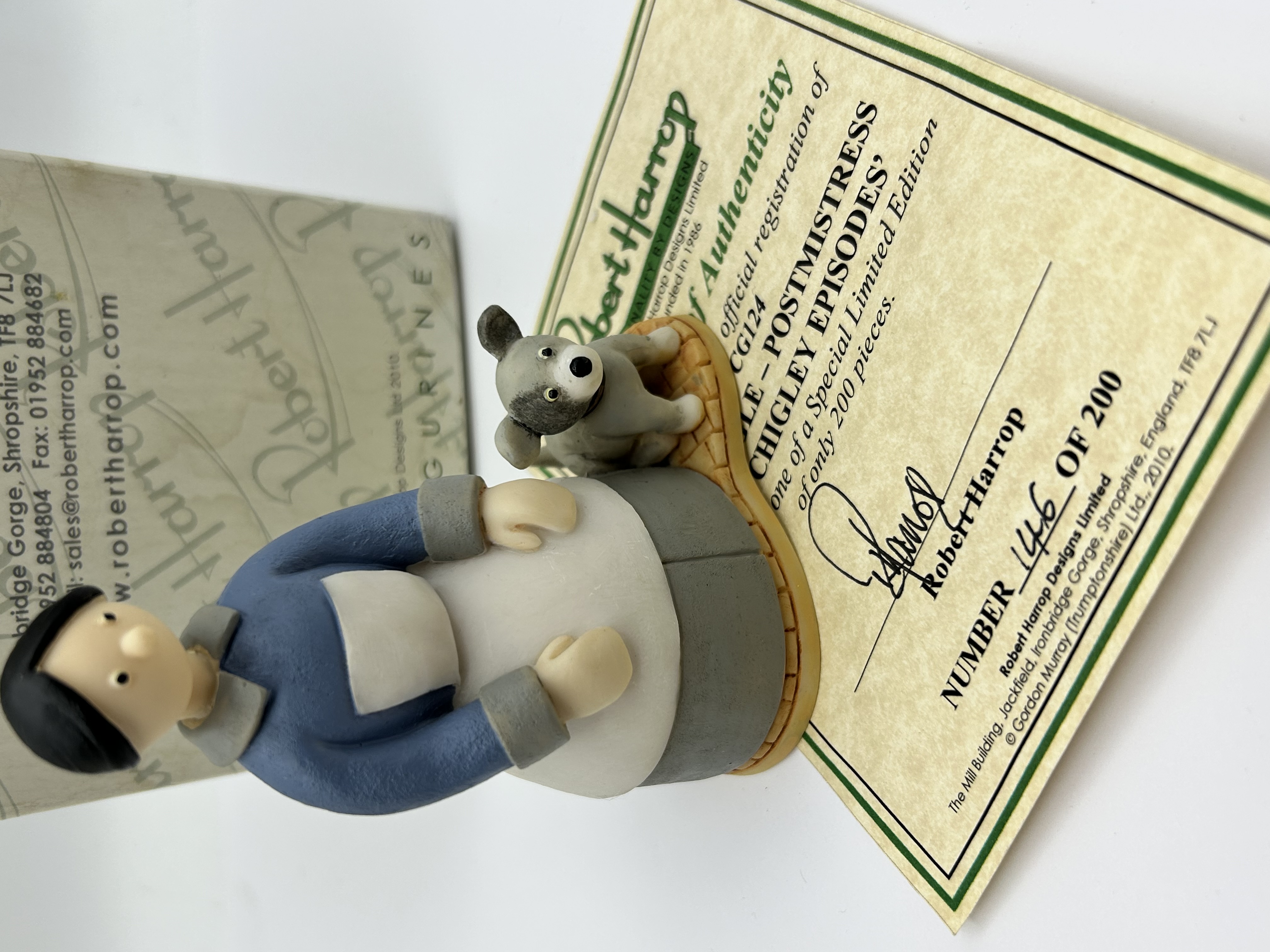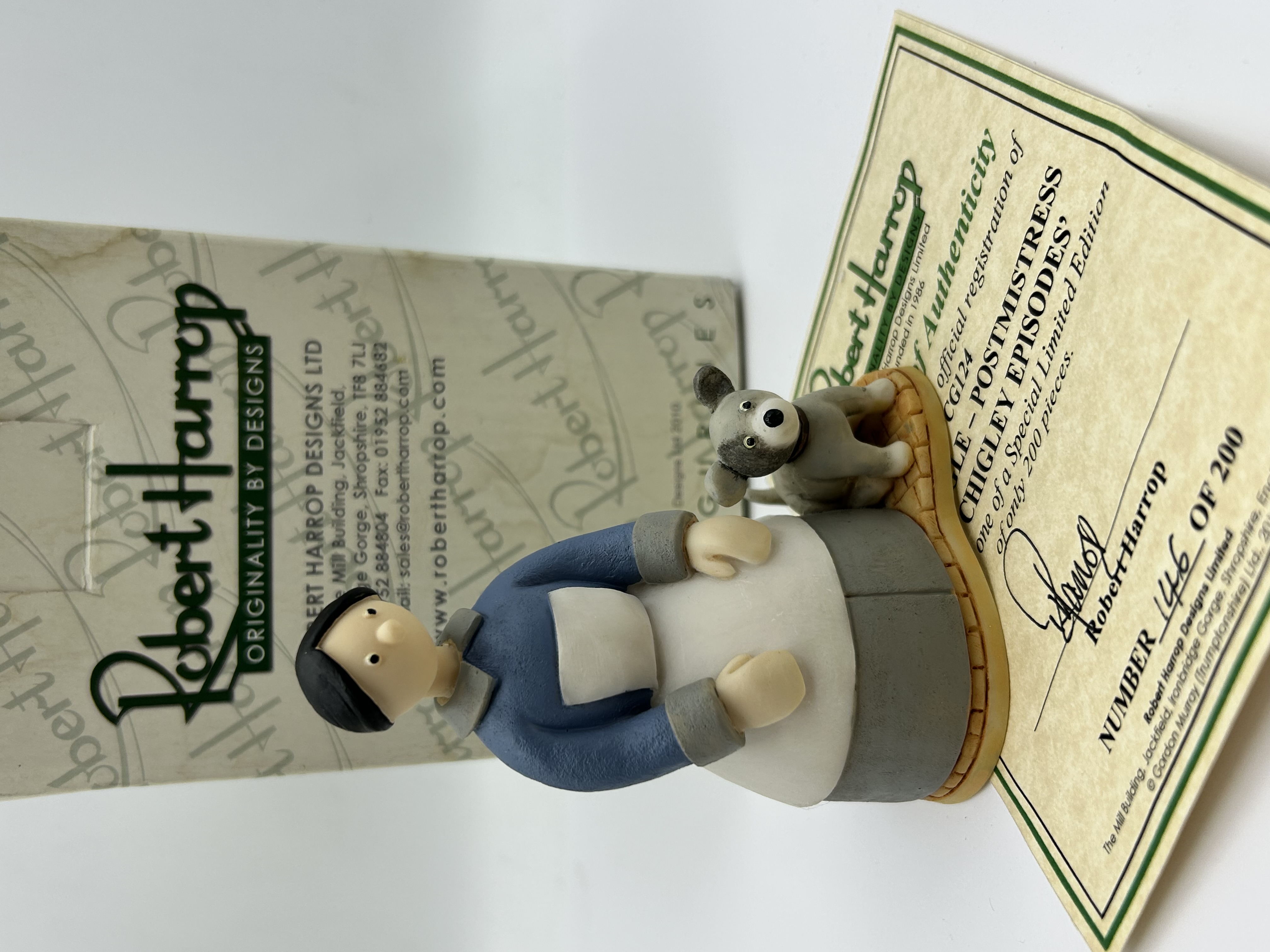 A Robert Harrop Designs Ltd. painted resin figurine, model CG124, depicting the character Miss Apple – Postmistress from the stop-motion animated series Chigley. The figure is portrayed in a blue coat and white apron, accompanied by a small dog on a yellow patterned base. This item is number 146 of a limited edition of 200 pieces. The lot includes the original branded box and a Certificate of Authenticity, which notes the production was circa 2010 under copyright for Gordon Murray (Trumptonshire) Ltd.