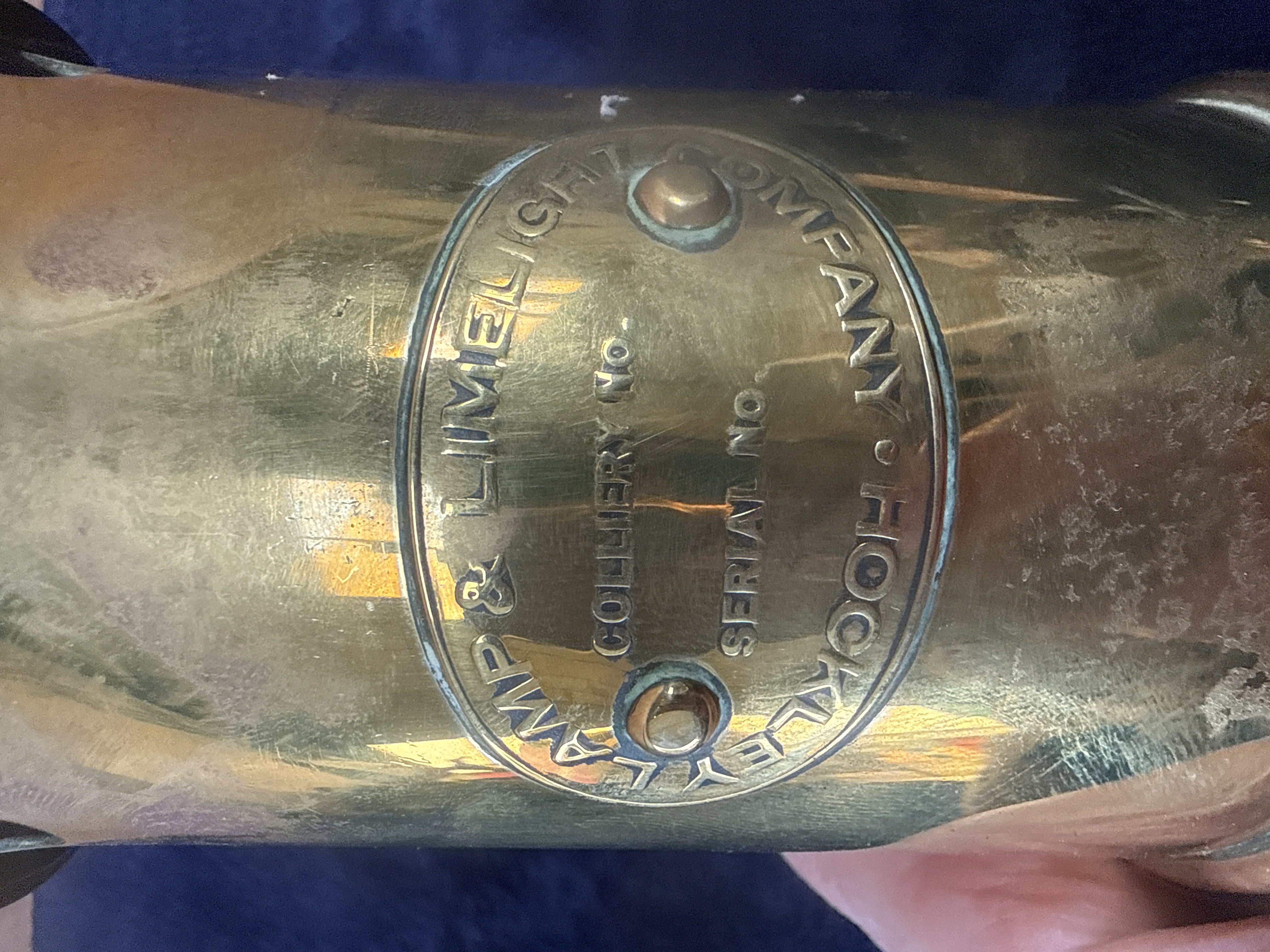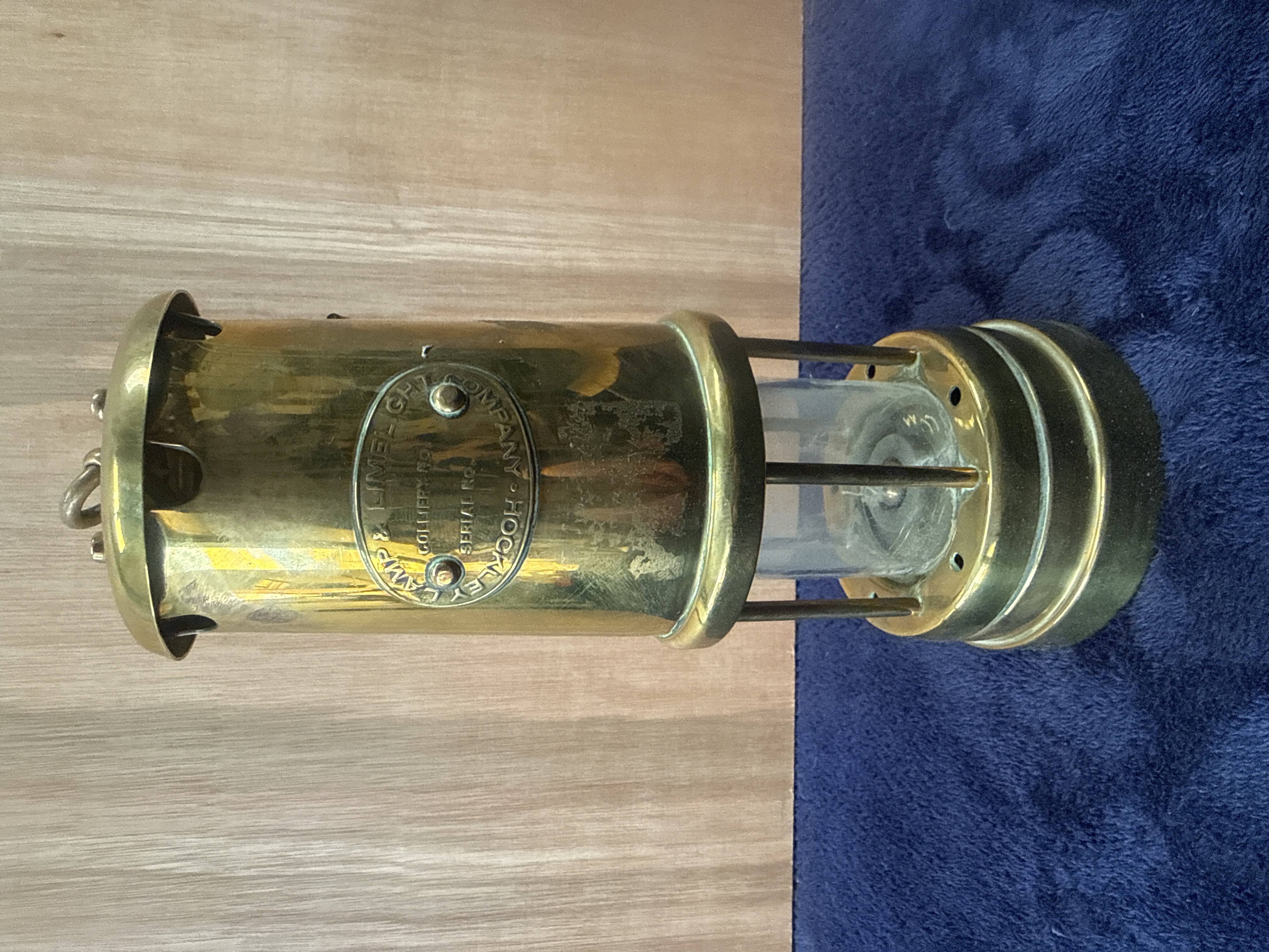 A vintage brass miner’s safety lamp by the Hockley Lamp & Limelight Company. The lamp features a cylindrical brass upper body and a lower glass enclosure protected by a cage of vertical brass bars. Affixed to the front is an oval brass identification plaque embossed with the maker’s name and unrecorded fields for a Colliery No. and Serial No. The top of the lamp is fitted with a large, integrated brass suspension hook.