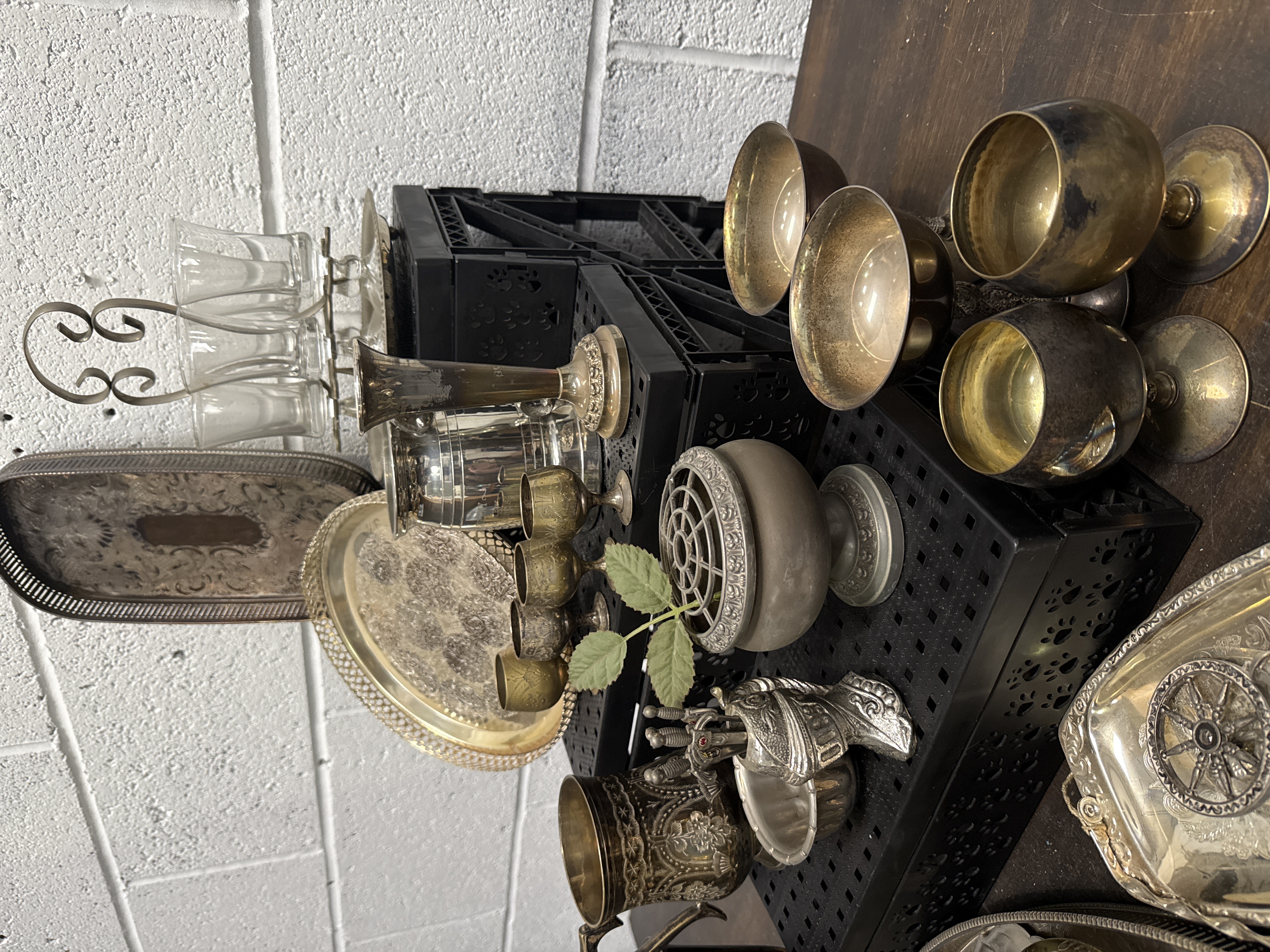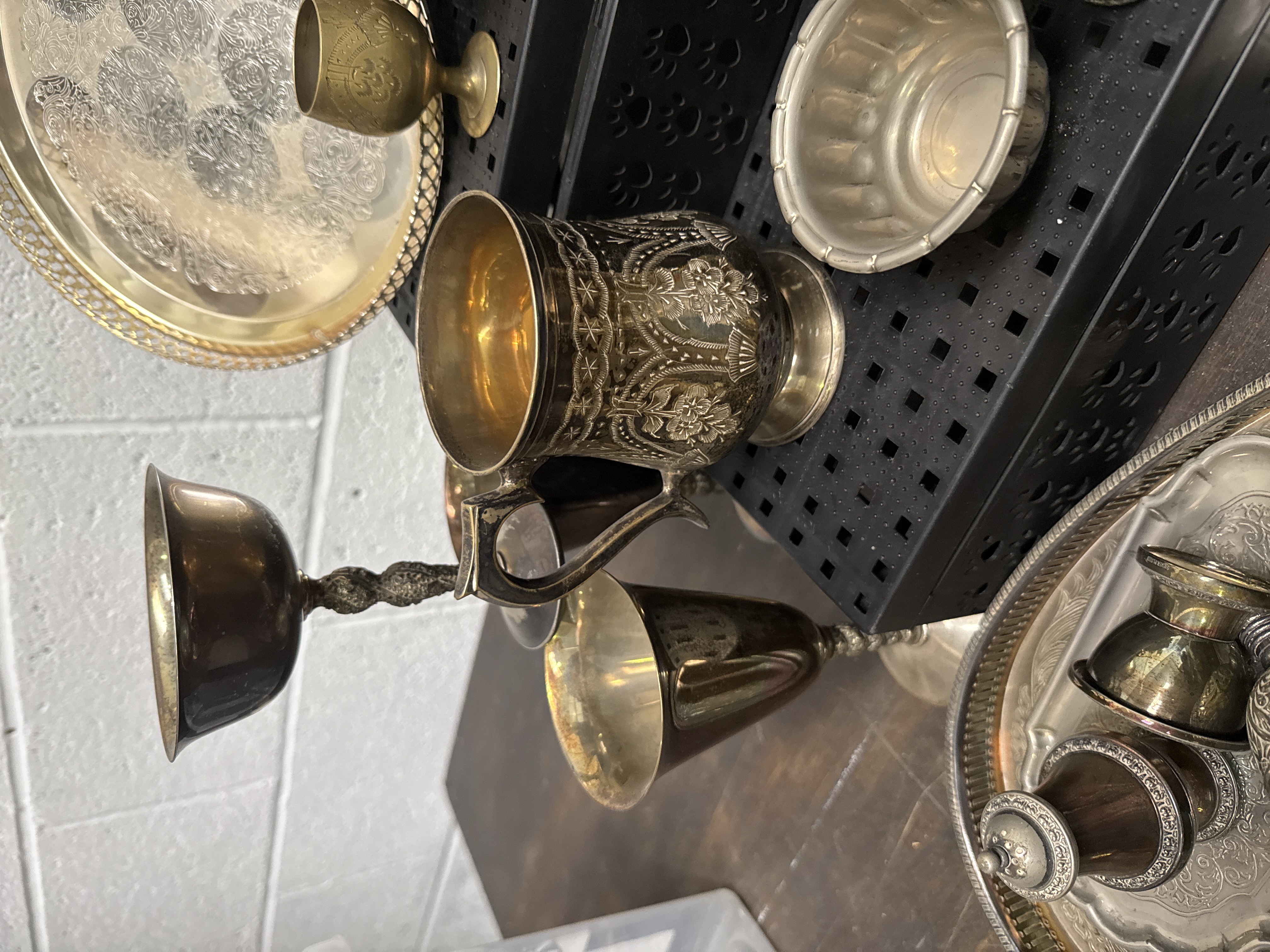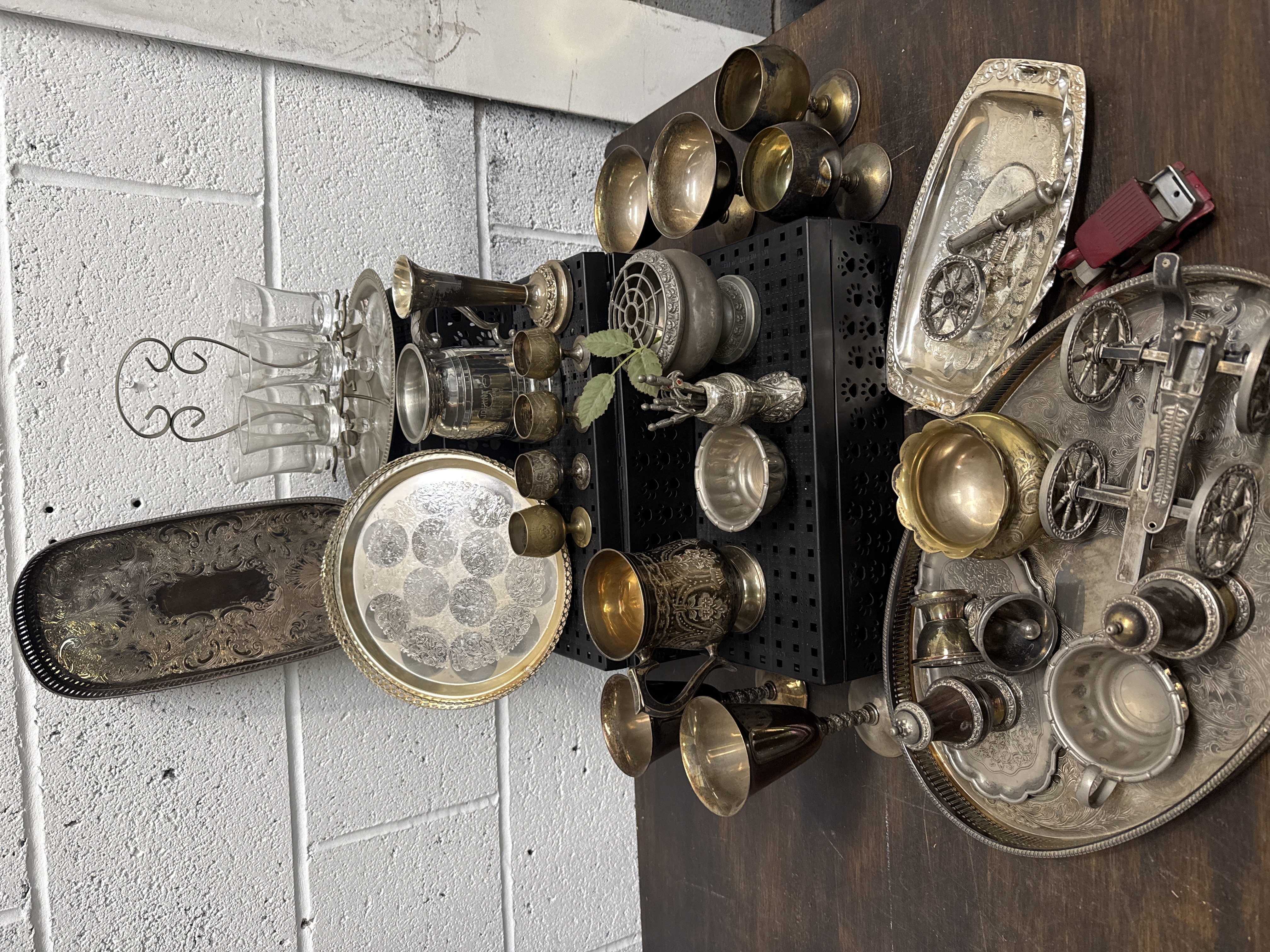A varied collection of metalware and glass items comprising several trays in silver plate and brass tones featuring engraved and embossed foliate patterns. The group includes multiple drinking vessels such as goblets, chalices, and a detailed tankard decorated with scrolled floral motifs. Also present is a set of clear glass tumblers housed within a wirework carrier, a metal flower frog, small bowls, and several decorative miniature metal carriages. Certain elements of the collection, specifically the small goblets and associated tray, are in the style of a traditional Zam-Zam drinking set. The materials include silver plate, brass, pewter, and glass.