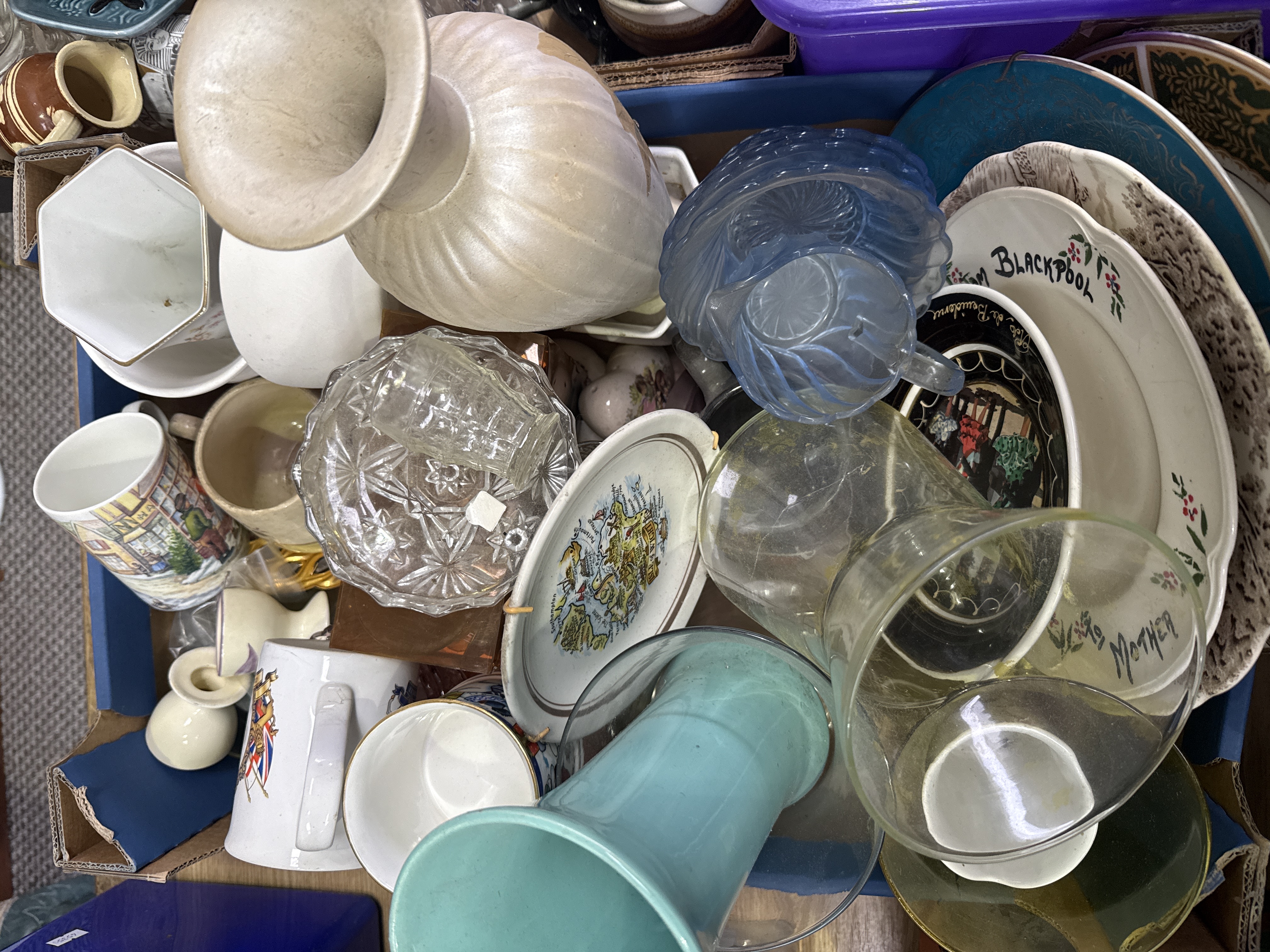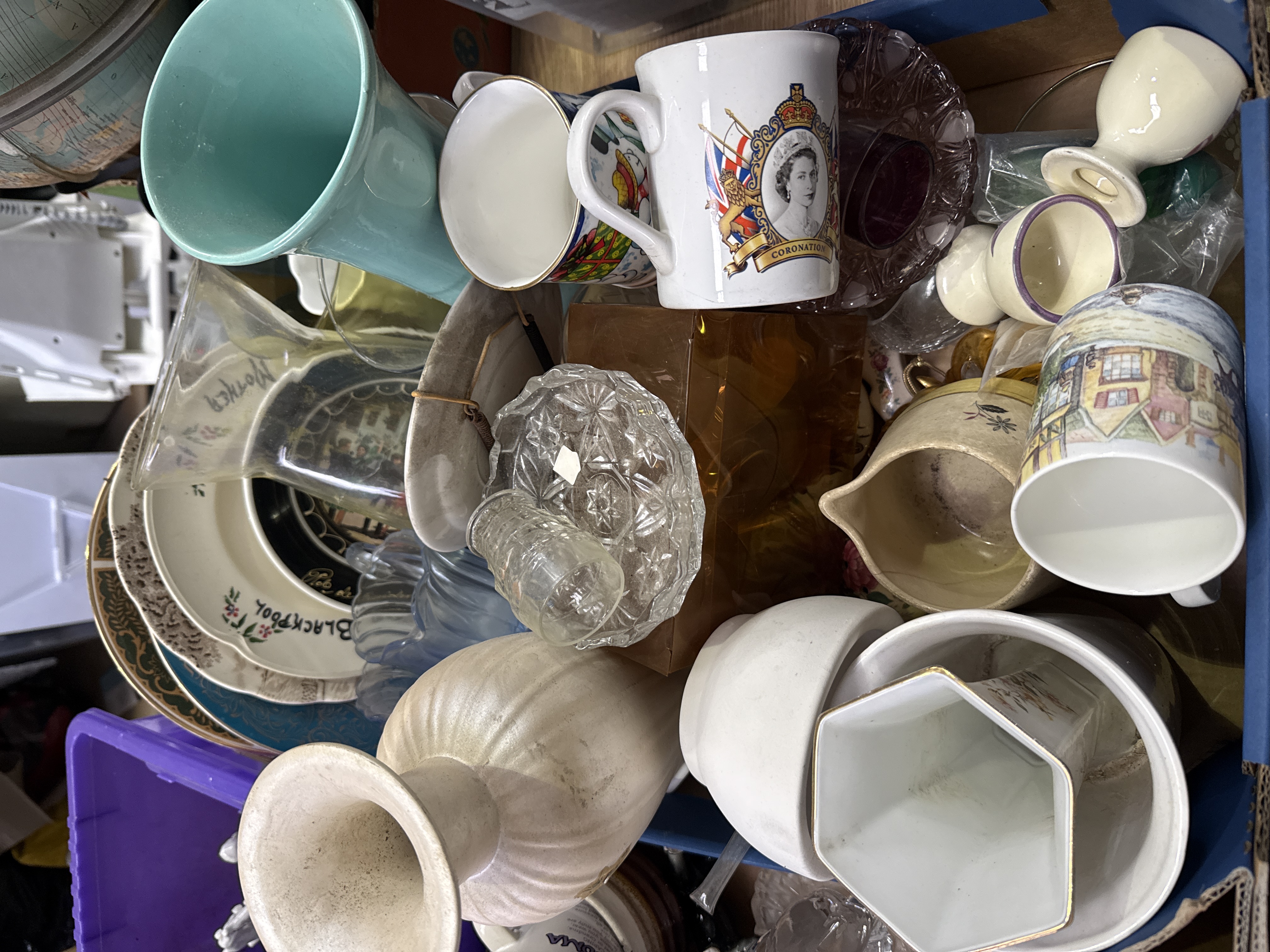 An assortment of ceramic and glassware items, primarily featuring mid-20th-century commemorative and souvenir pieces. The collection includes a ceramic mug depicting the Coronation of Queen Elizabeth II, alongside mugs with Blackpool and Mother motifs. Souvenir plates are present, including a topographical map of the Isle of Wight and a plate marked Pub de l’Ecaillère. The lot features various vases, such as a large pearlescent ribbed ceramic vase, a turquoise flared vase, and a white hexagonal ceramic vase. Glassware elements include a clear pressed glass bowl with geometric star patterns, a blue scalloped dish, and various clear glass vessels.