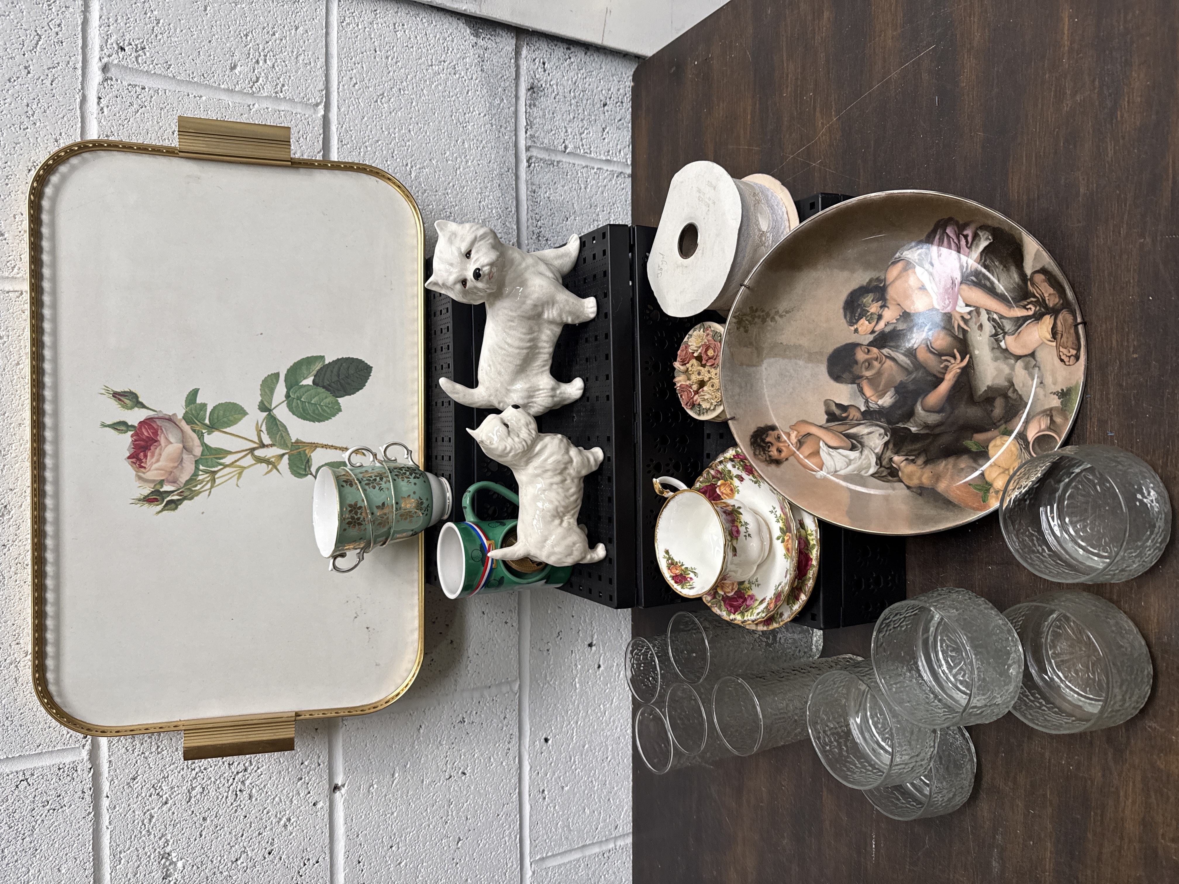 A collection of various decorative home goods and tableware. The lot includes porcelain tea wares in the Royal Albert Old Country Roses pattern, featuring the characteristic multi-coloured floral motif and gilt rims. Also present is a large rectangular serving tray with a central botanical rose print and gilt-tone handles. The group contains a pair of white glazed porcelain figurines depicting West Highland White Terriers. A large shallow ceramic bowl is decorated with a transfer-printed classical figural scene. The glassware component consists of an assortment of clear textured glasses in multiple sizes. Additional items include a green ceramic mug with tricolour accents and miscellaneous decorative or craft materials.