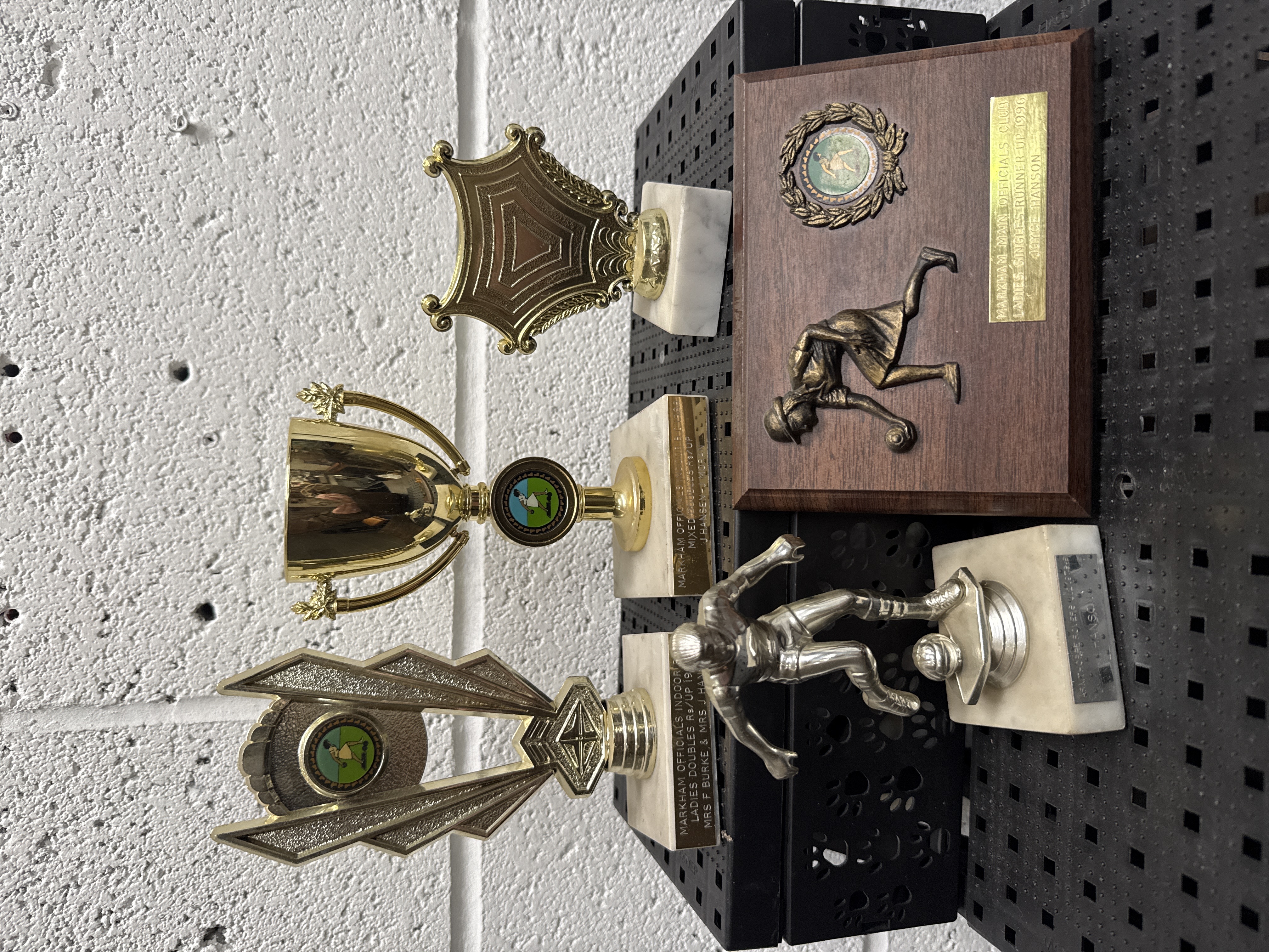 A group of sports-related awards primarily focused on lawn bowls and association football. The lot includes a rectangular wooden wall plaque featuring a raised relief of a female lawn bowls player and a circular emblem. Also included are several gold-toned trophies of varying geometric and chalice forms, mounted on white marble bases. One trophy features a silver-toned figurine of a footballer in action. Several pieces bear engraved metal plates with inscriptions including Markham Main Officials Club, Ladies Singles Runner-Up 1996 awarded to Joyce Hanson, Mixed Doubles, and Ladies Doubles Rs/Up. The items are constructed from wood, marble, and plated metal.