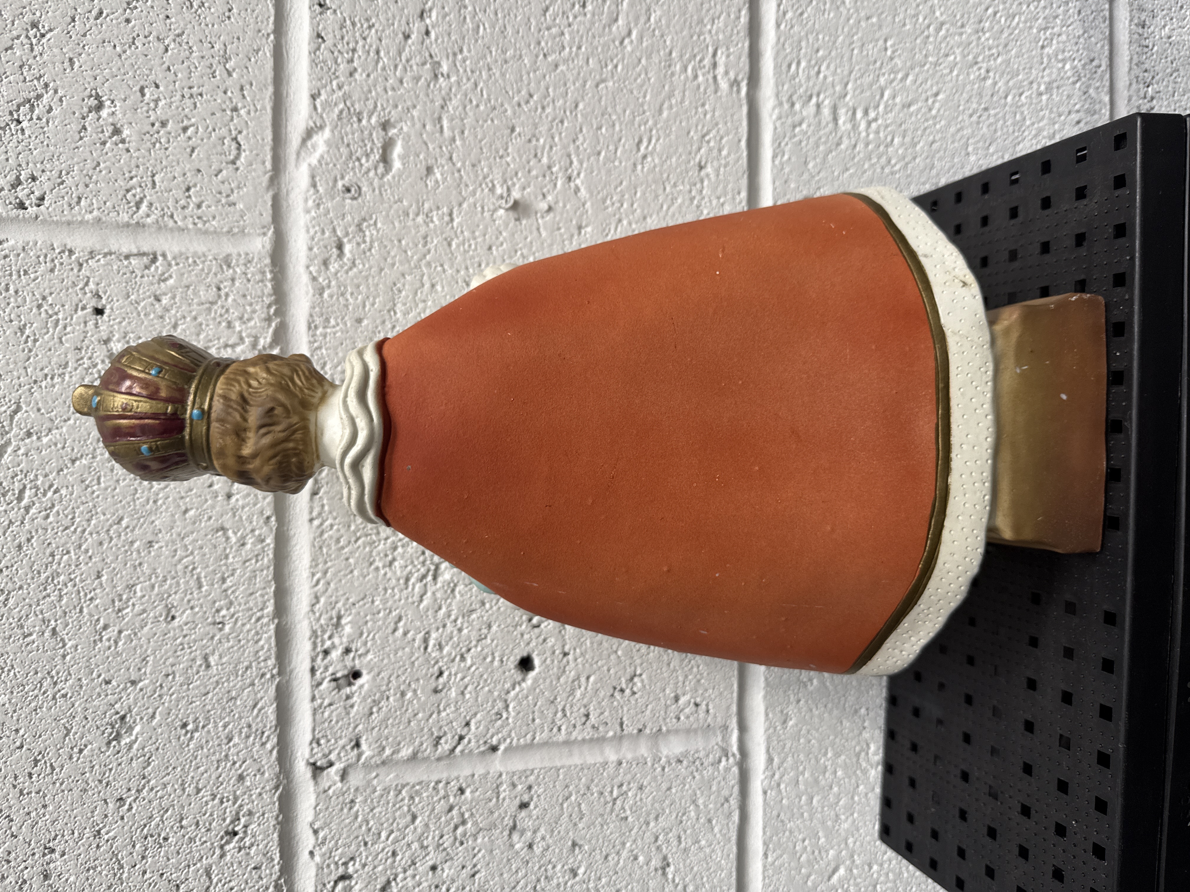 A polychrome religious figure depicting the Infant Jesus of Prague, standing 15 inches in height. The figure is presented in traditional iconography, wearing an ornate crown and a white dalmatic with orange and gold-coloured trim. The chest features a gilded IHS monogram within a scrolling cartouche, embellished with blue and red circular accents resembling inlaid gemstones. The figure holds a globus cruciger in the left hand, with the right hand raised in a gesture of benediction. The piece is constructed from a moulded material, likely plaster or chalkware, with a matte painted finish. The figure stands upon a rectangular base featuring a gilded scrollwork motif.