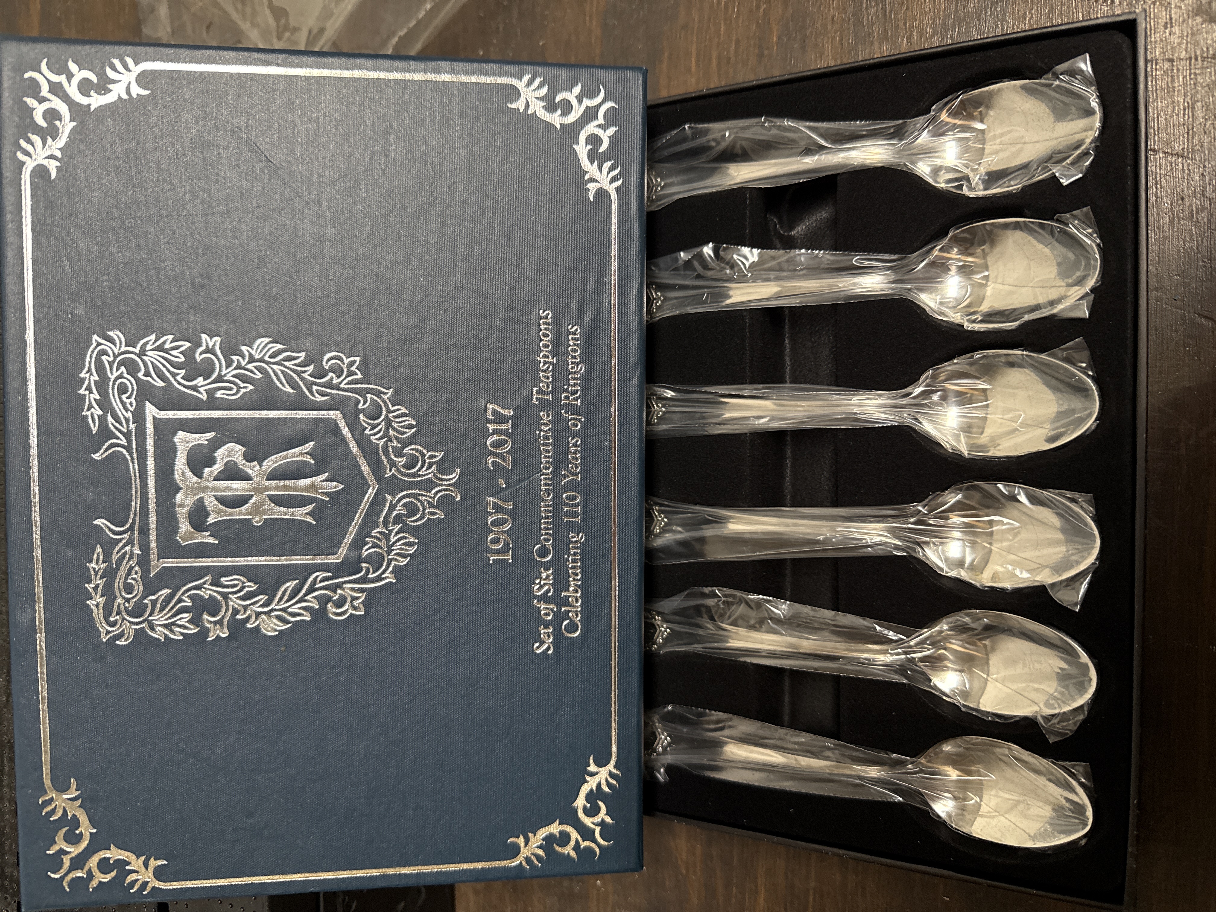 A set of six silver-toned metal teaspoons produced to commemorate the 110th anniversary of Ringtons (1907-2017). The spoons are presented in their original navy blue hinged display box. The lid of the box features a silver-stamped floral-bordered crest and the inscription 1907 – 2017 / Set of Six Commemorative Teaspoons / Celebrating 110 Years of Ringtons. Internally, the spoons are housed within a black flocked tray and remain in their individual protective plastic sleeves.