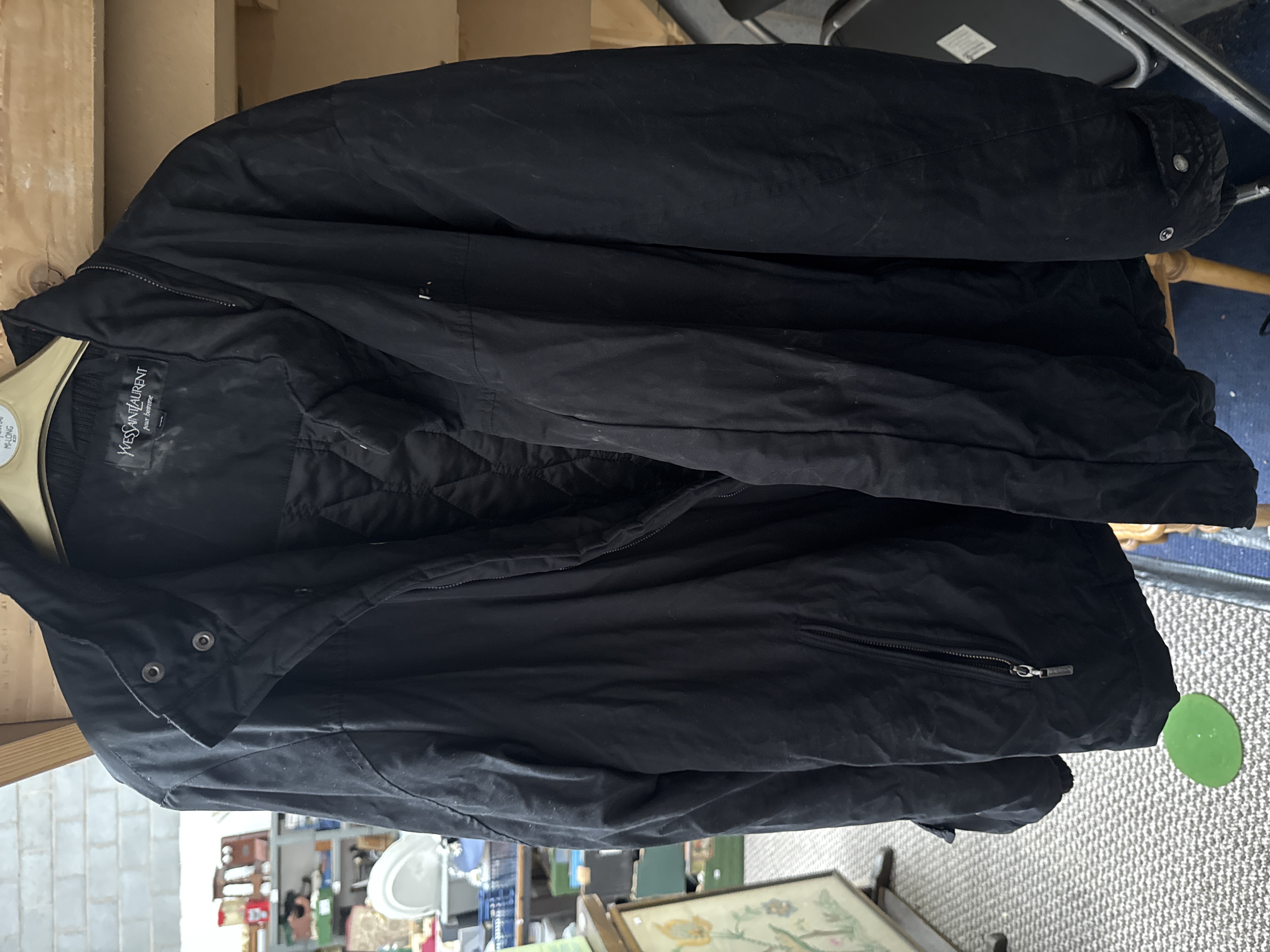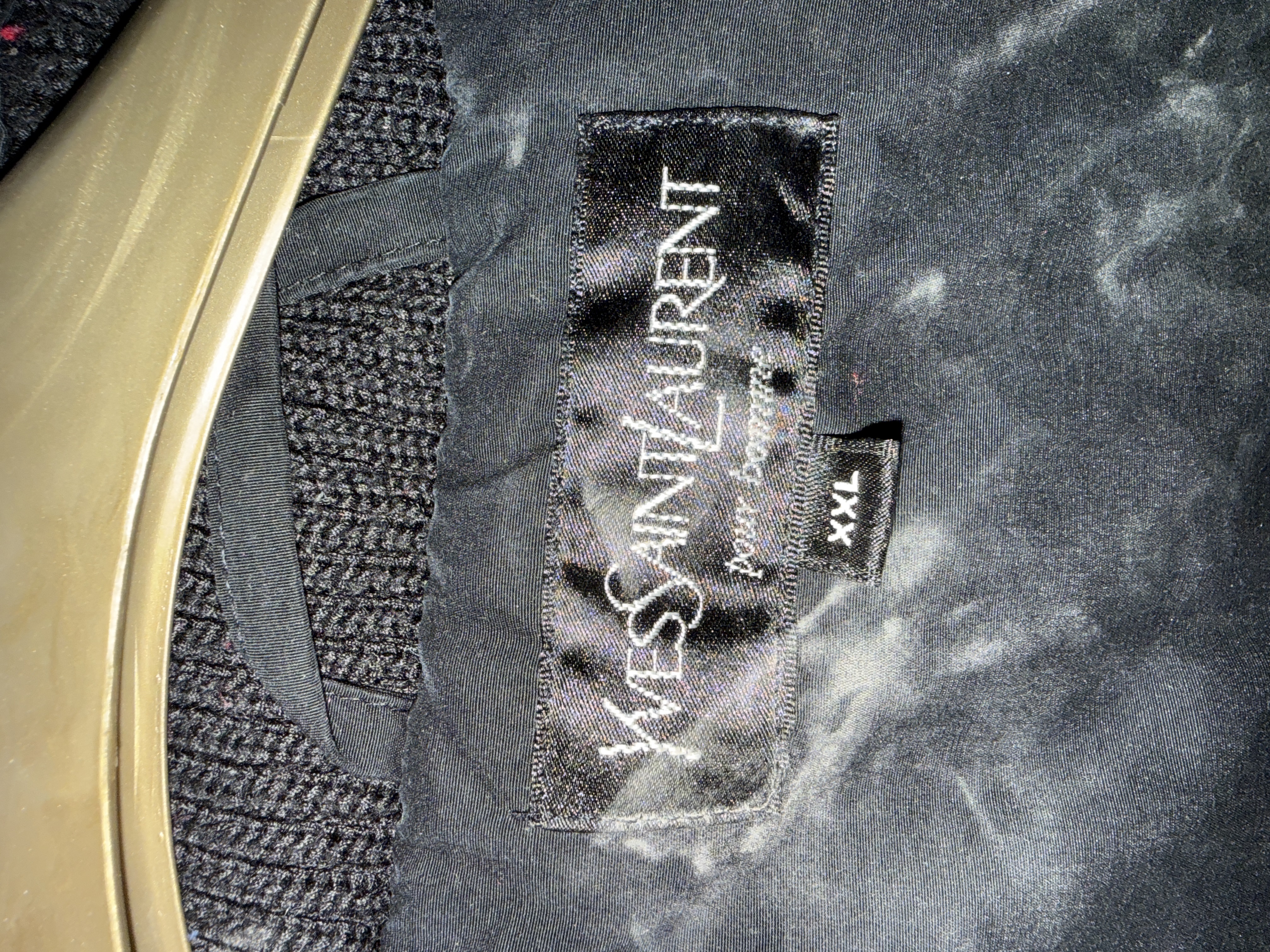 A men’s black zip-front jacket by Yves Saint Laurent. The garment features a snap-fastened collar placket and functional exterior zipper pockets. The interior is finished with a quilted lining and includes a woven brand label reading Yves Saint Laurent pour homme with an adjacent size tag marked XXL. The construction incorporates smooth textile panels with ribbed detailing at the collar.