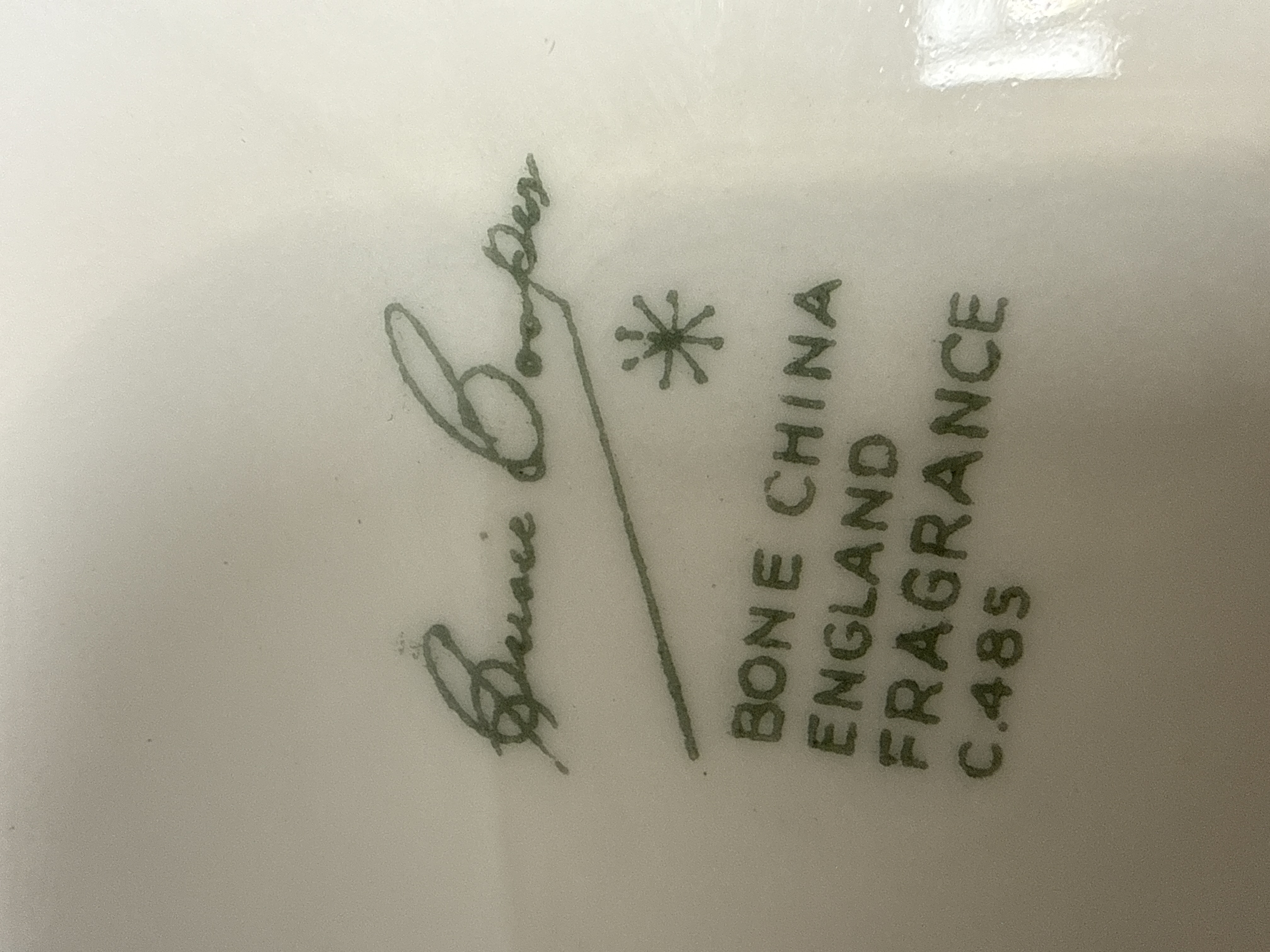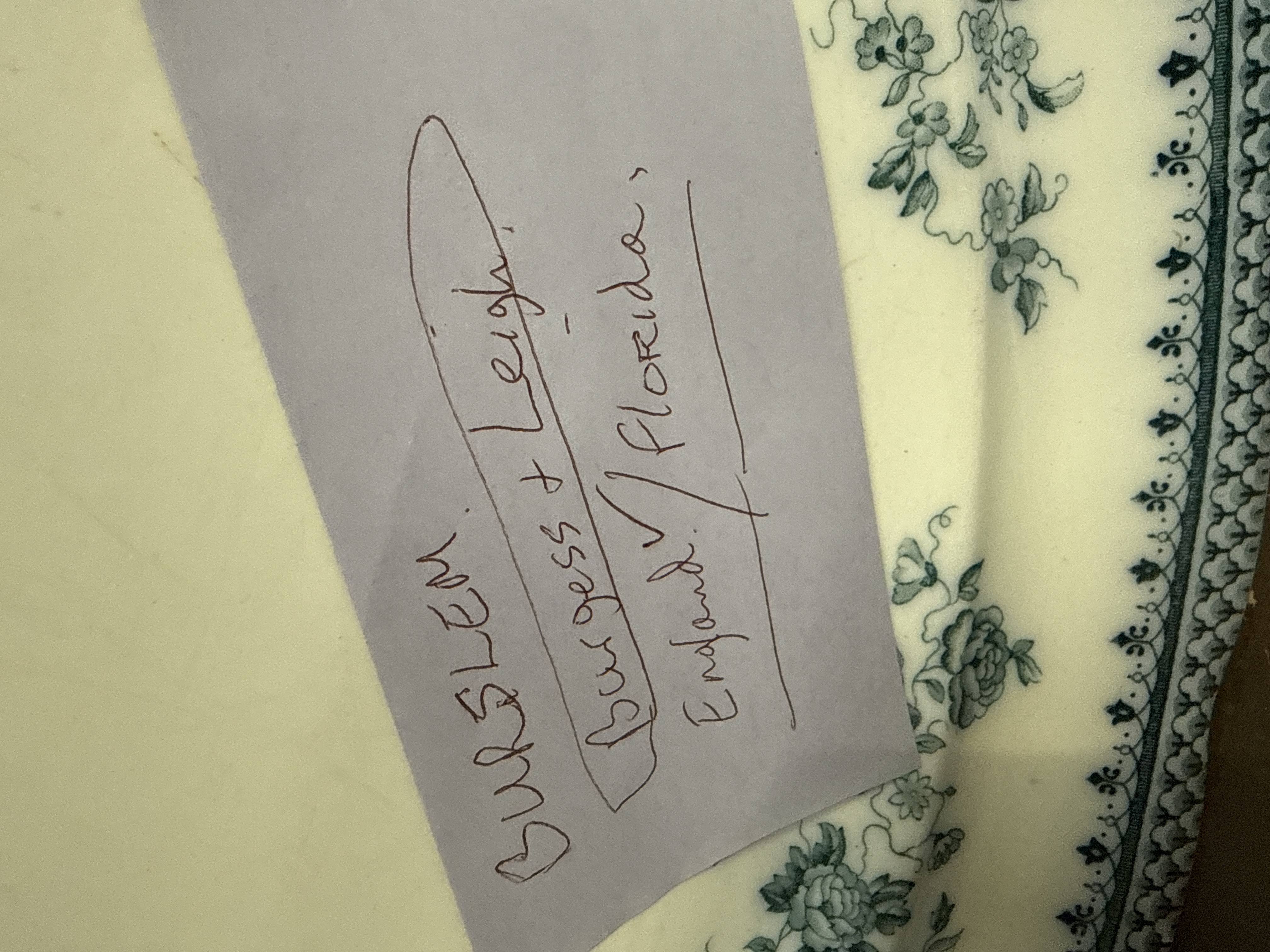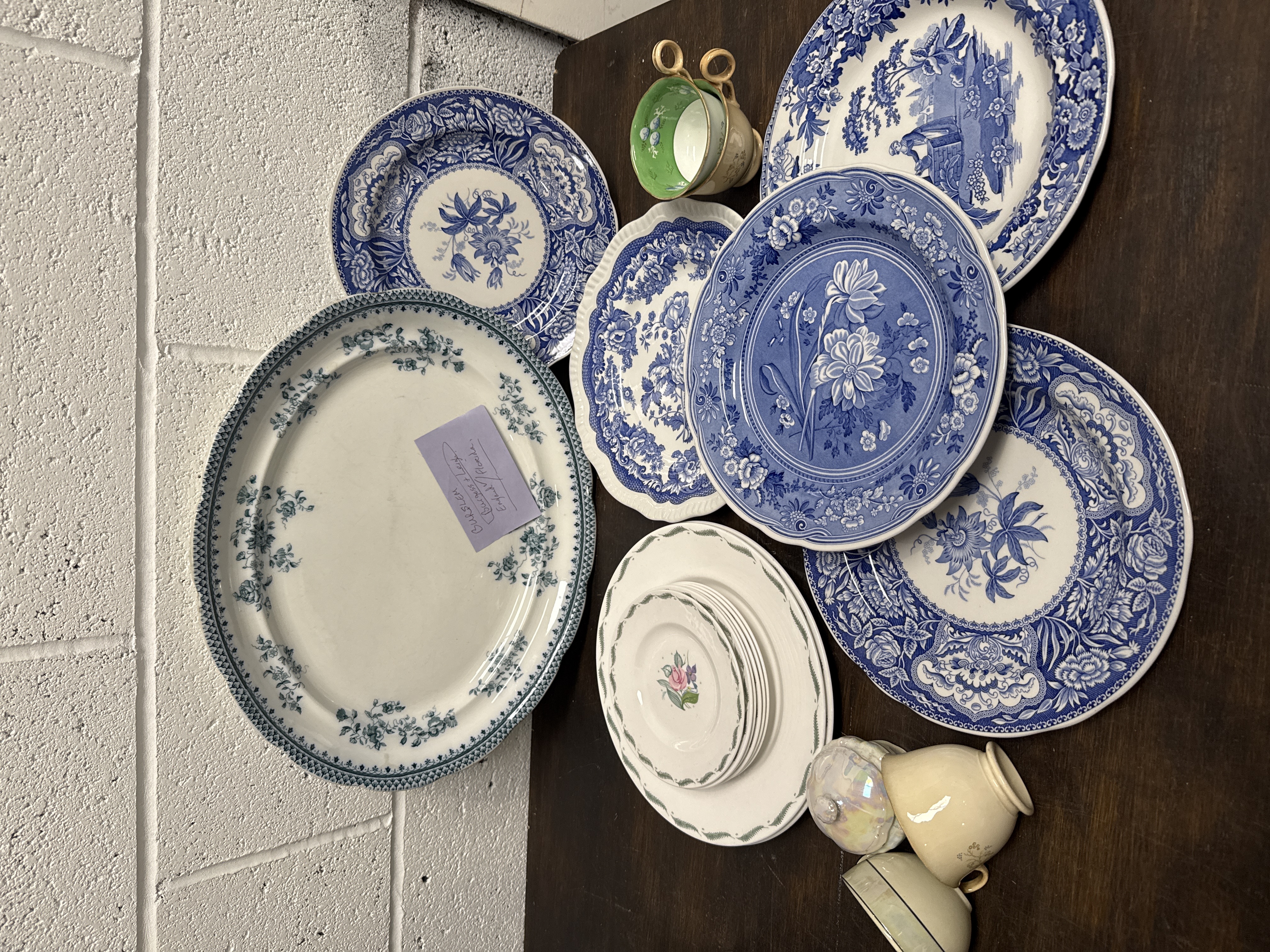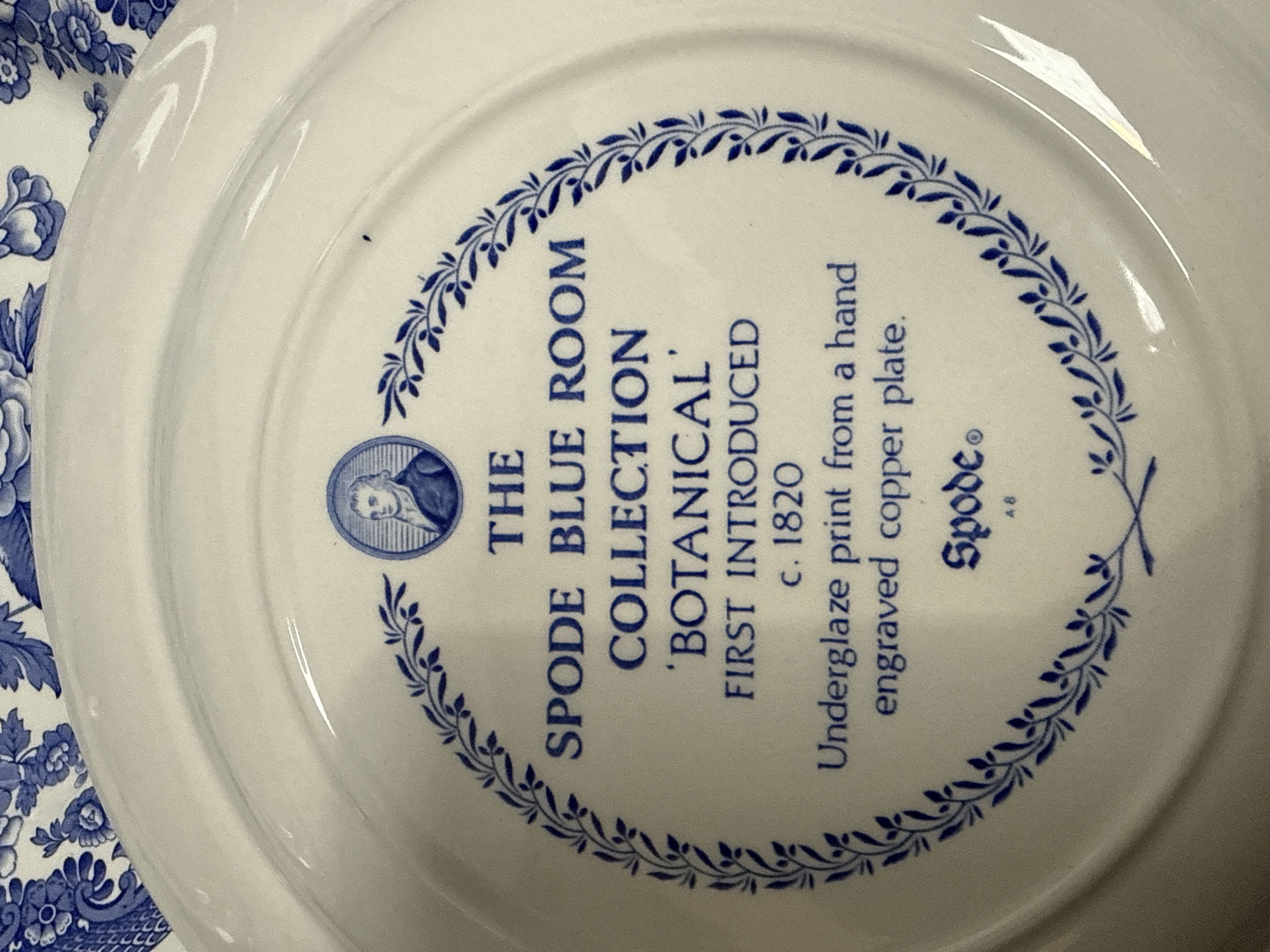 A collection of various English ceramic tableware featuring predominantly blue and white transferware designs. The grouping includes pieces from The Spode Blue Room Collection in the Botanical pattern, featuring an underglaze print from a hand-engraved copper plate first introduced circa 1820. Also included are Susie Cooper bone china items in the Fragrance pattern (C.485). A large oval platter is present, accompanied by a handwritten note attributing it to Burgess and Leigh (Burleigh) of Burslem in the Florida pattern. The assortment further comprises several dinner plates with pastoral and floral scenes, a stack of saucers with delicate floral borders, and various teacups and small bowls. One teacup features a green and white exterior with an ornate gold-tone handle and iridescent lustreware finish. Marks include printed backstamps for Spode and Susie Cooper.