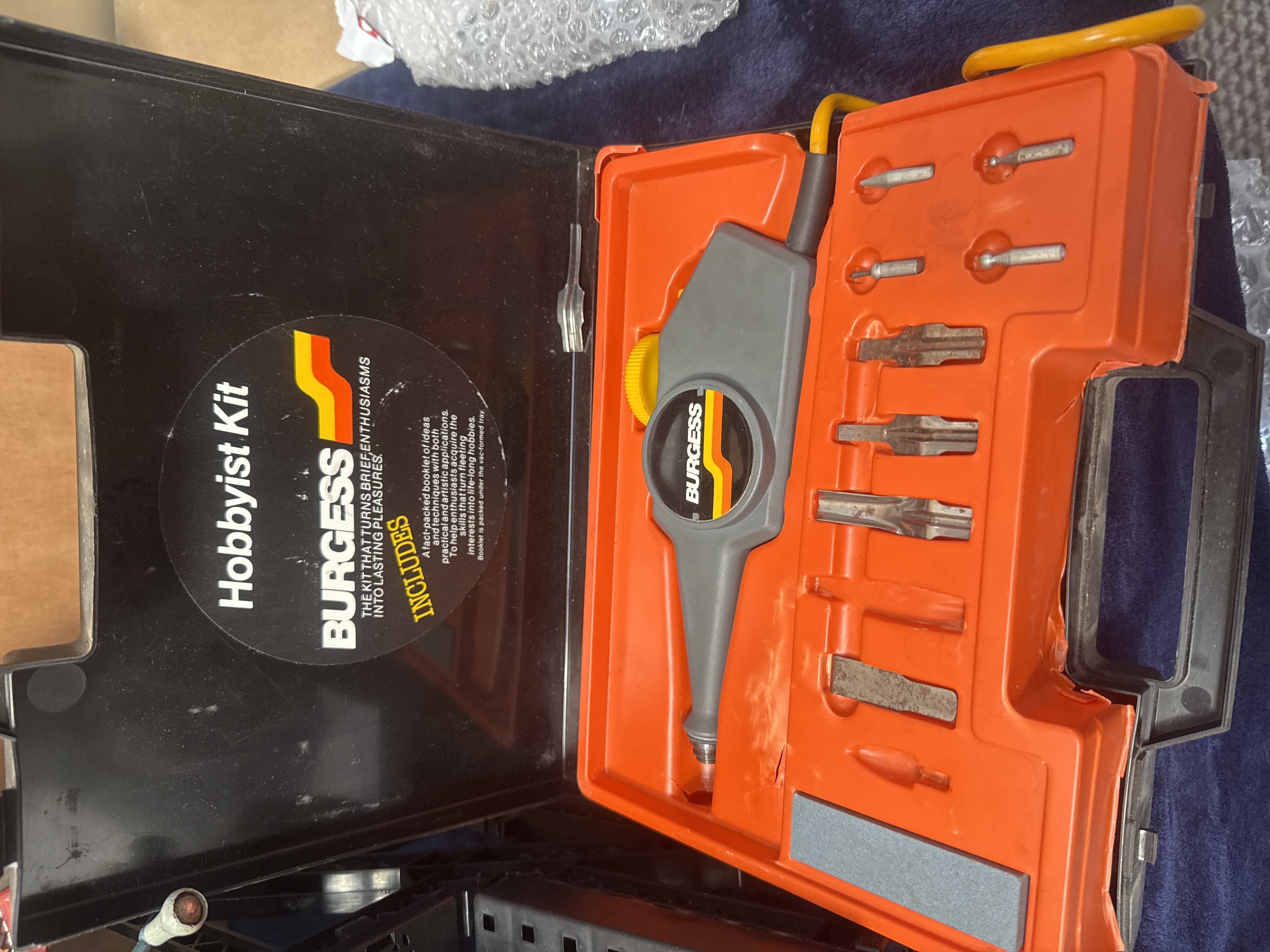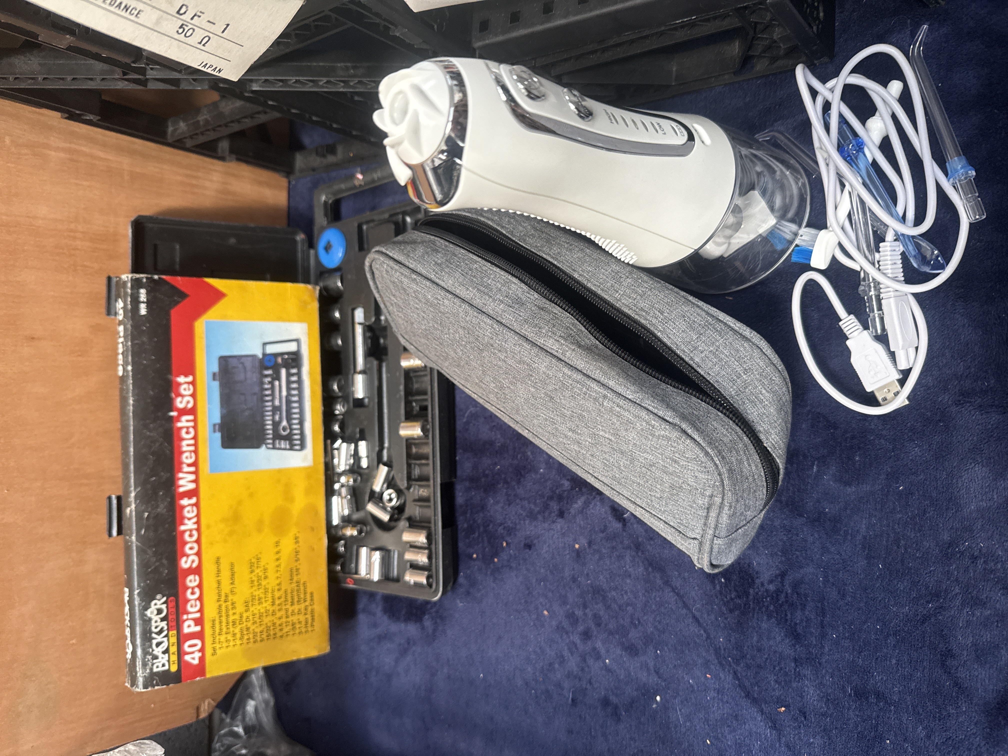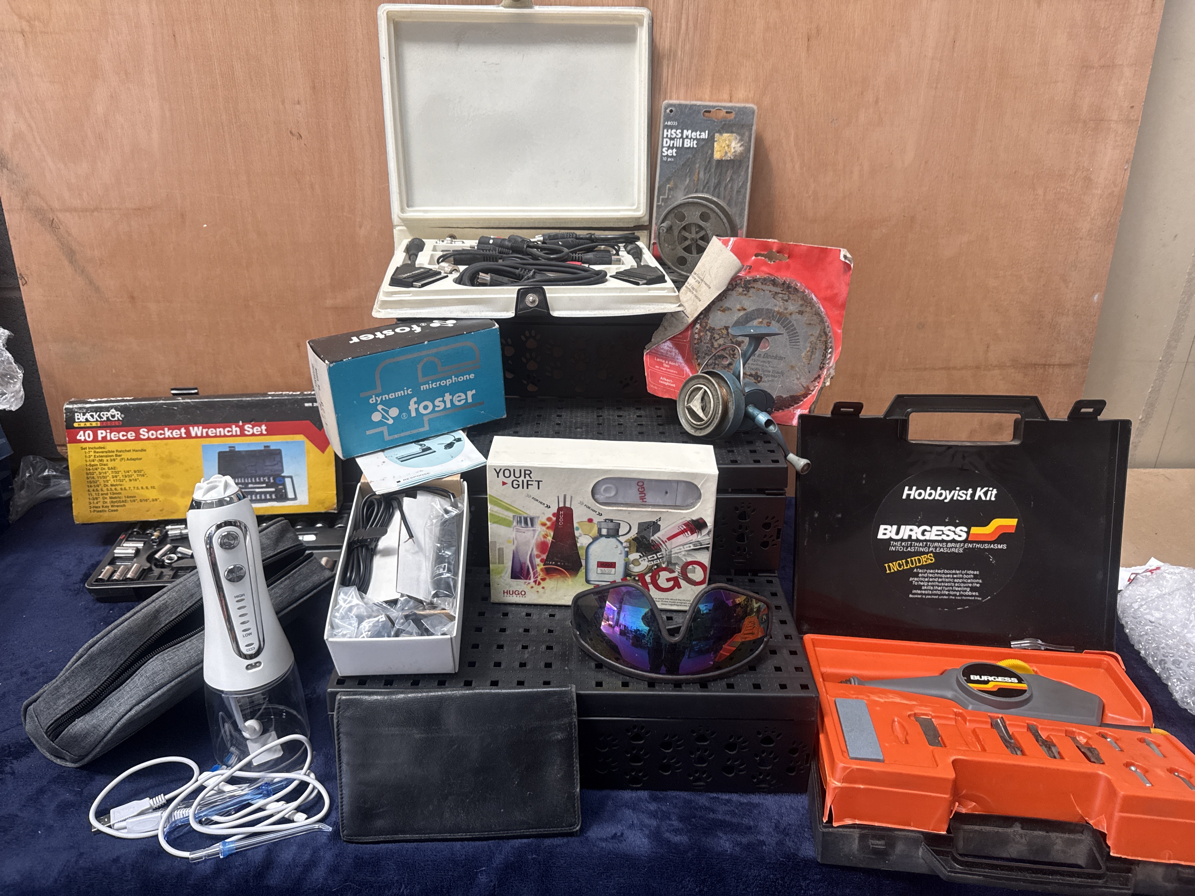 A collection of miscellaneous items featuring a Burgess Hobbyist Kit with a handheld rotary tool and assorted bits in a fitted orange and black plastic case. The group includes a Blackspur 40-piece socket wrench set in a yellow and black box, a boxed Foster dynamic microphone, and a Hugo Boss promotional gift box. Also present is a white and silver portable electric water flosser with a grey zippered carrying case and USB cable. Additional items consist of a pair of iridescent-lens sunglasses, a black leather wallet, a vintage-style light blue fishing reel, a set of HSS metal drill bits, and a white case containing various audio-visual cables including SCART and RCA leads. A Black & Decker circular saw blade is included in its original red packaging.