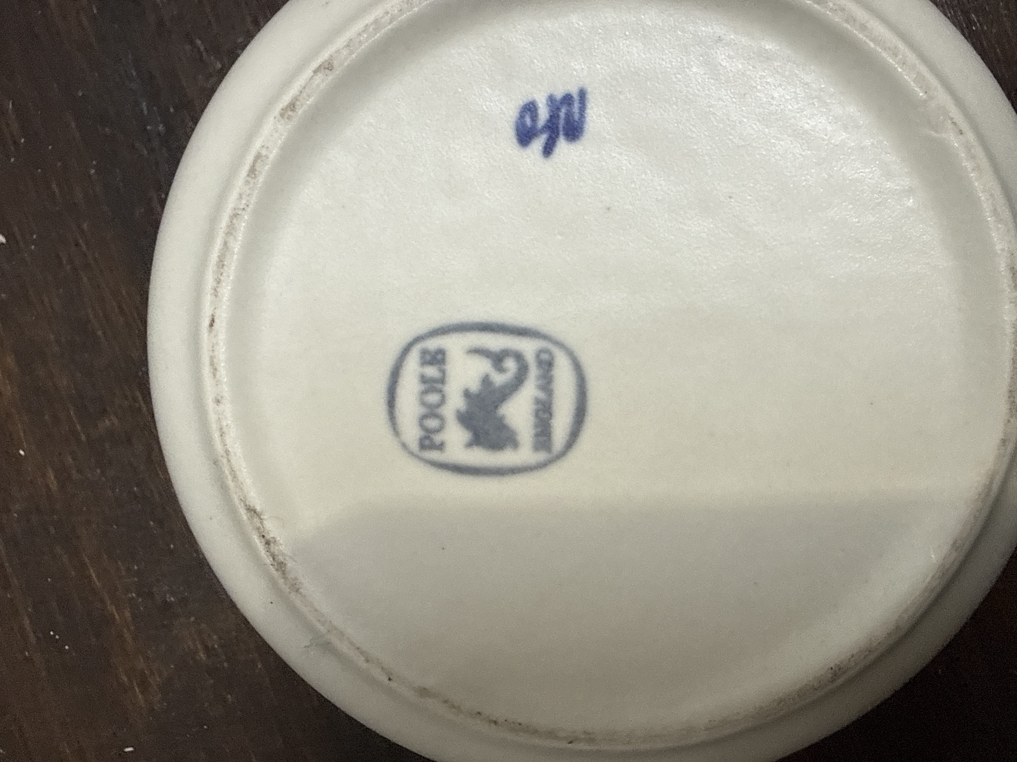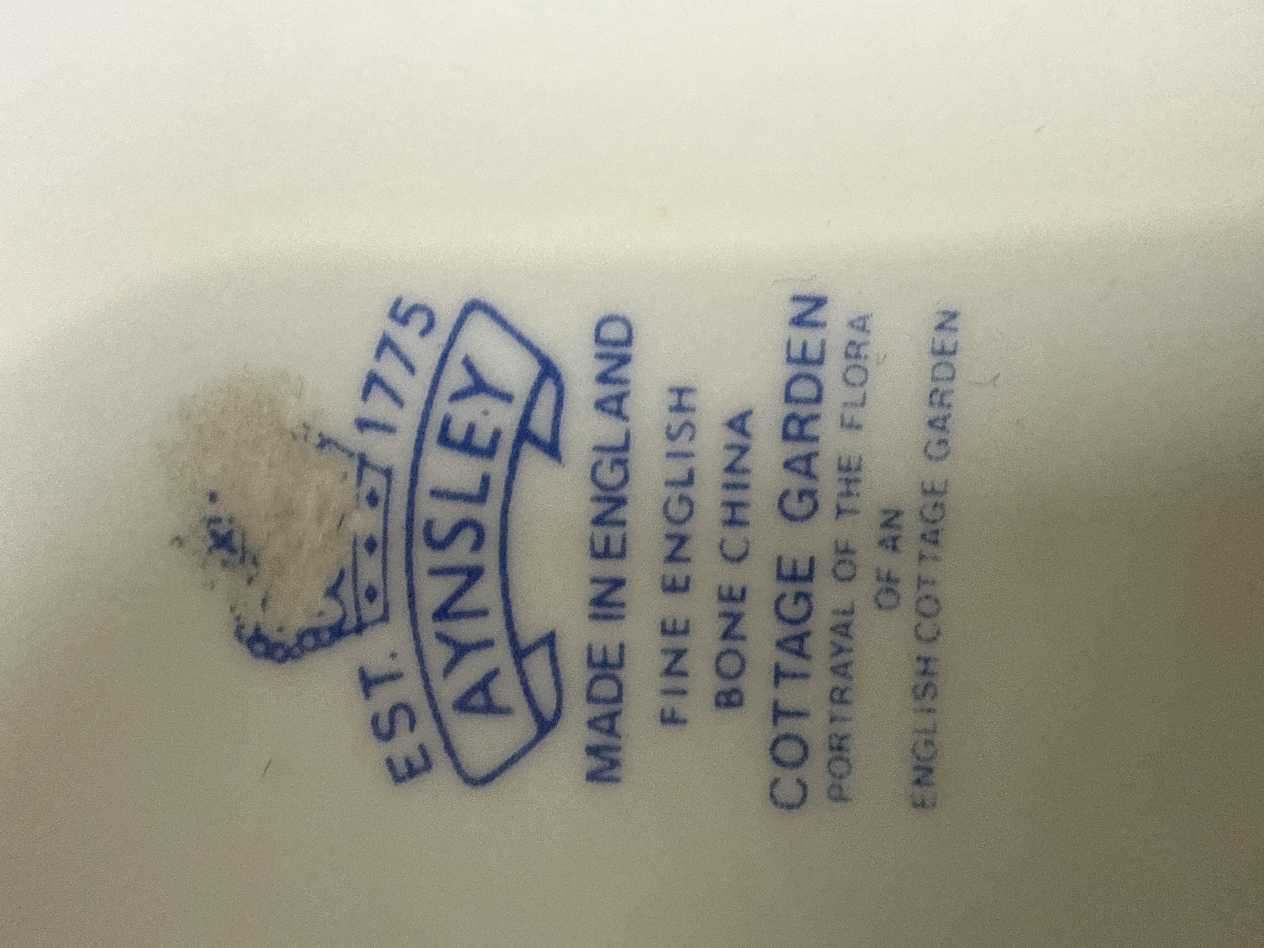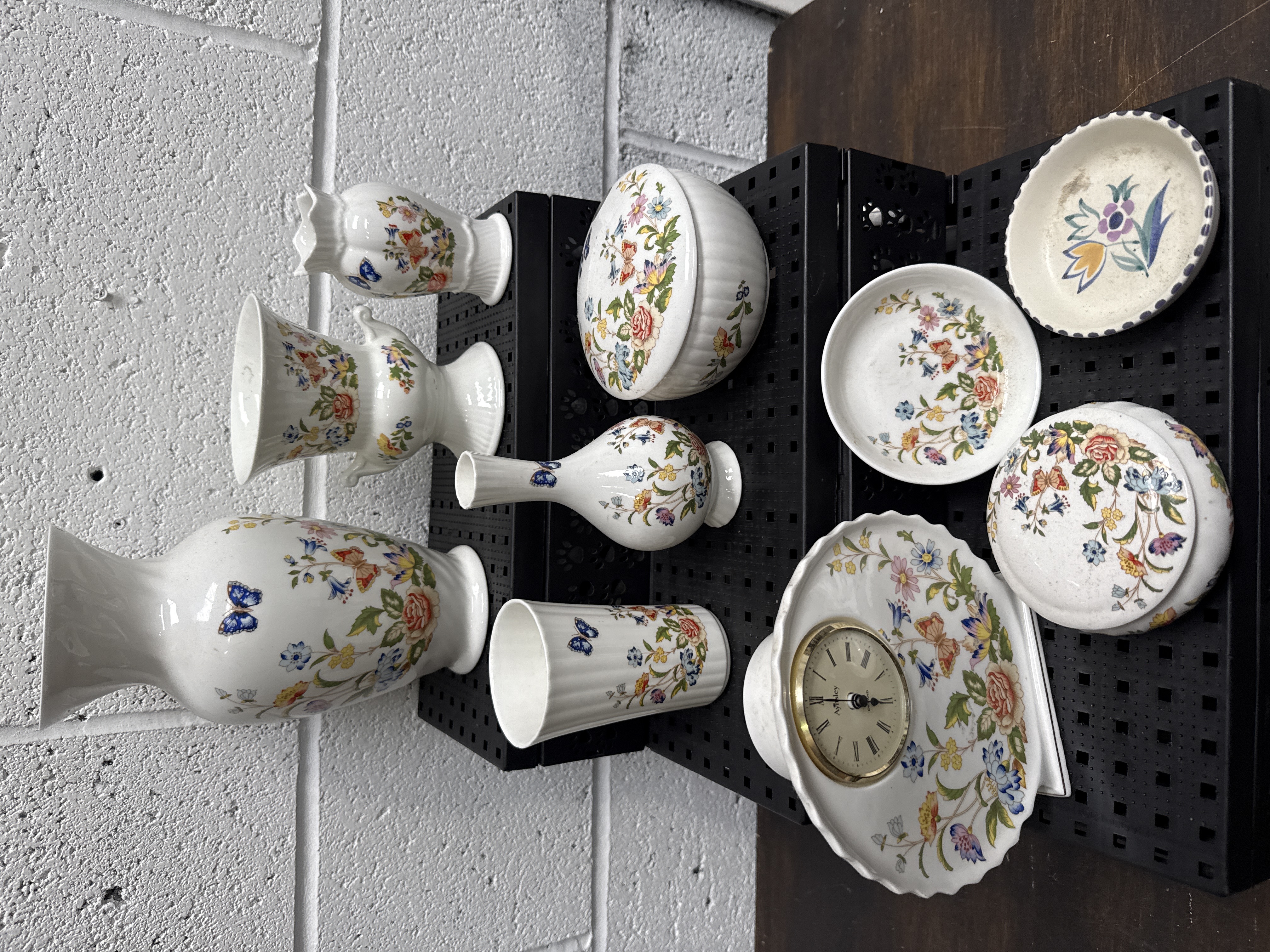 A collection of nine Aynsley Cottage Garden fine bone china items and one Poole Pottery dish. The Aynsley assortment includes several vases in baluster, trumpet, and bud forms, two lidded trinket boxes, a cylindrical tumbler, and a mantle clock set into a scalloped porcelain base. These pieces are decorated with the multicoloured floral and butterfly motifs of the Cottage Garden pattern. Most items bear the Aynsley Made in England Fine English Bone China backstamp identifying the pattern. The Poole Pottery dish features a hand-painted floral design and is marked with the Poole England dolphin stamp and a blue artist mark on the reverse.