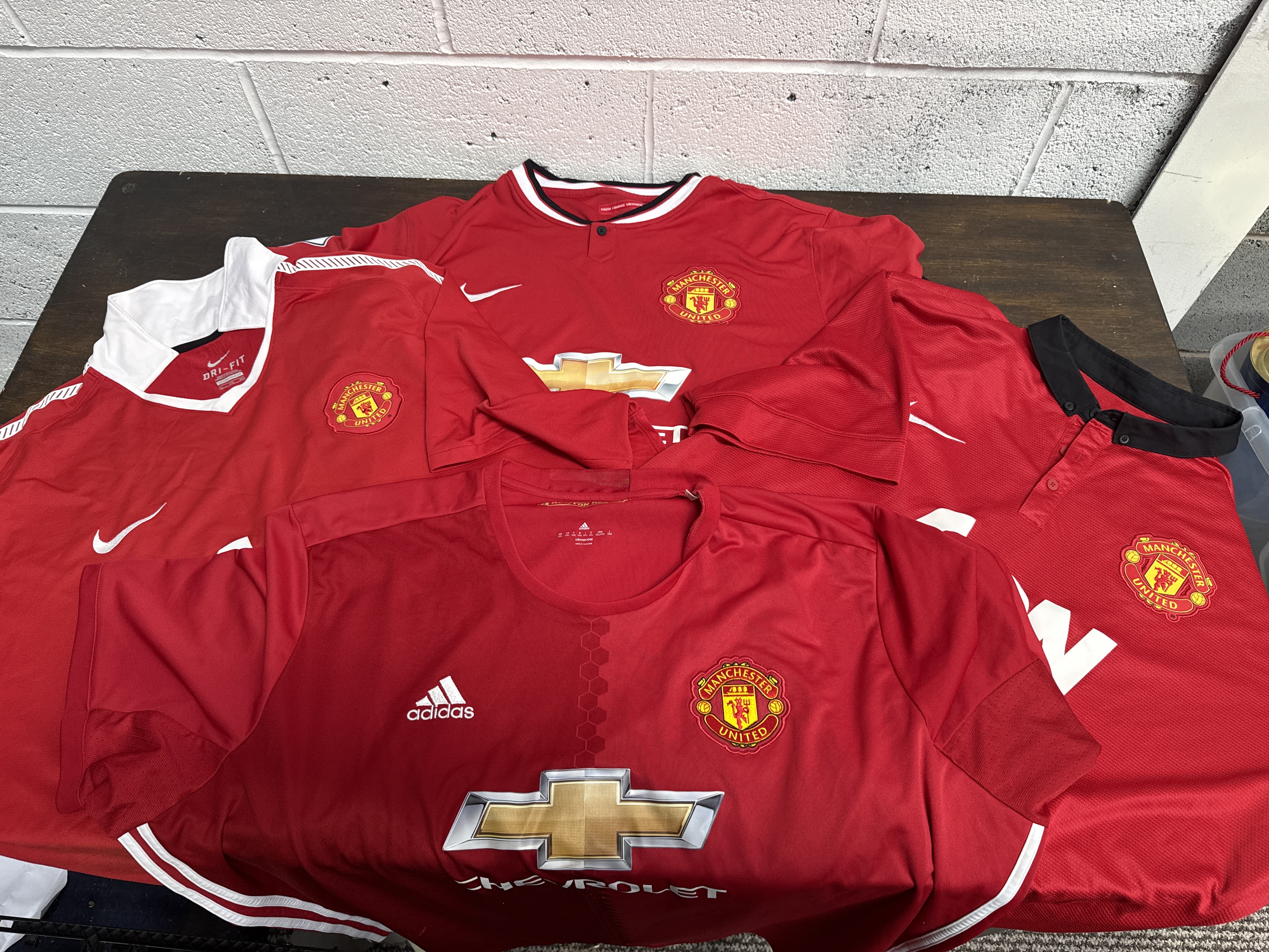 A collection of four Manchester United Football Club home jerseys. The lot comprises garments from various seasons, including examples manufactured by Nike and Adidas. The jerseys are constructed from red synthetic performance fabrics, featuring embroidered club crests and applied manufacturer logos. Sponsor branding includes Chevrolet and Aon. The group displays various design elements, including white, black, and multi-coloured ribbed collars. Technical markings for Nike Dri-Fit and Adidas Climacool are present on the respective garments.