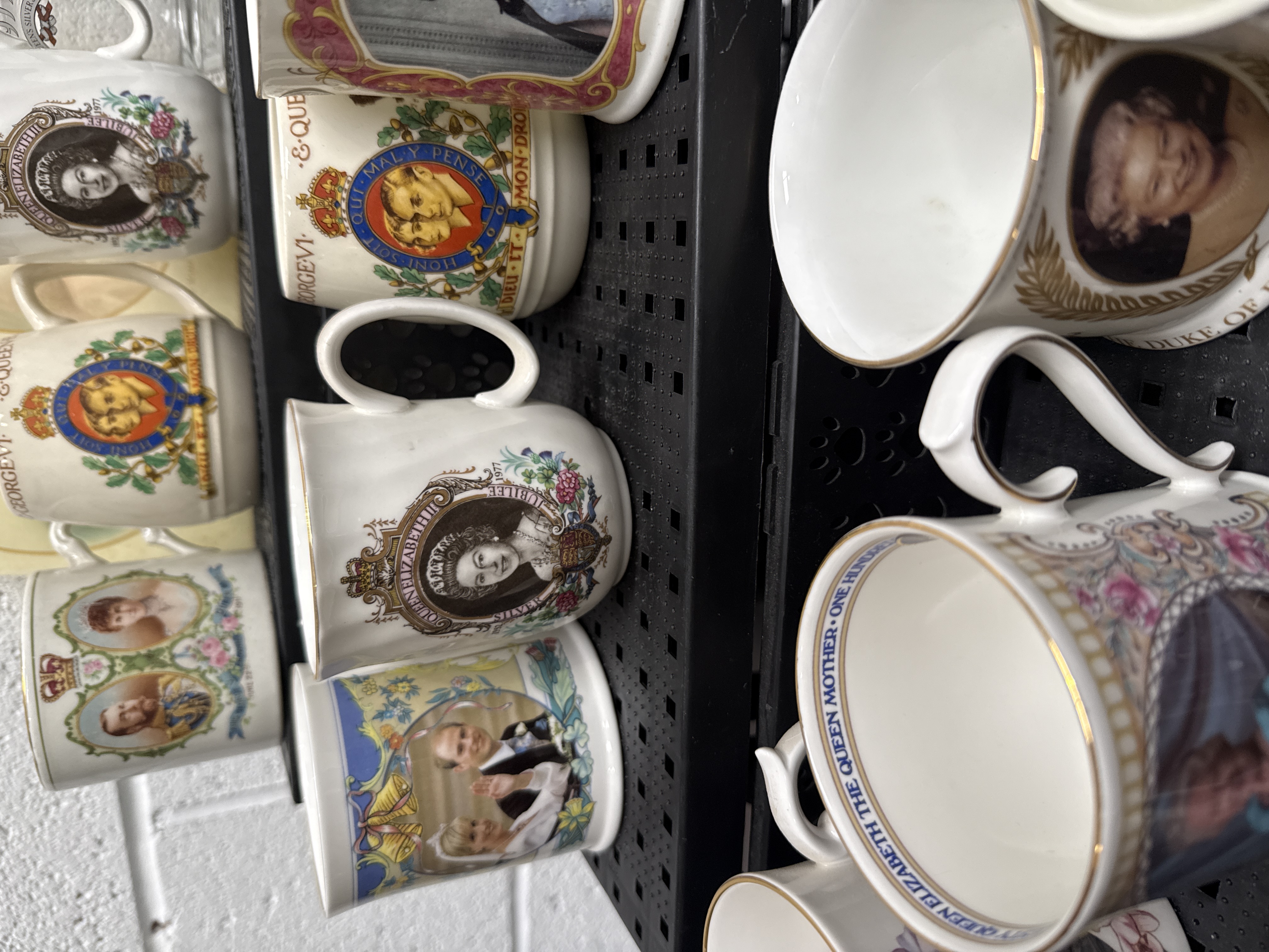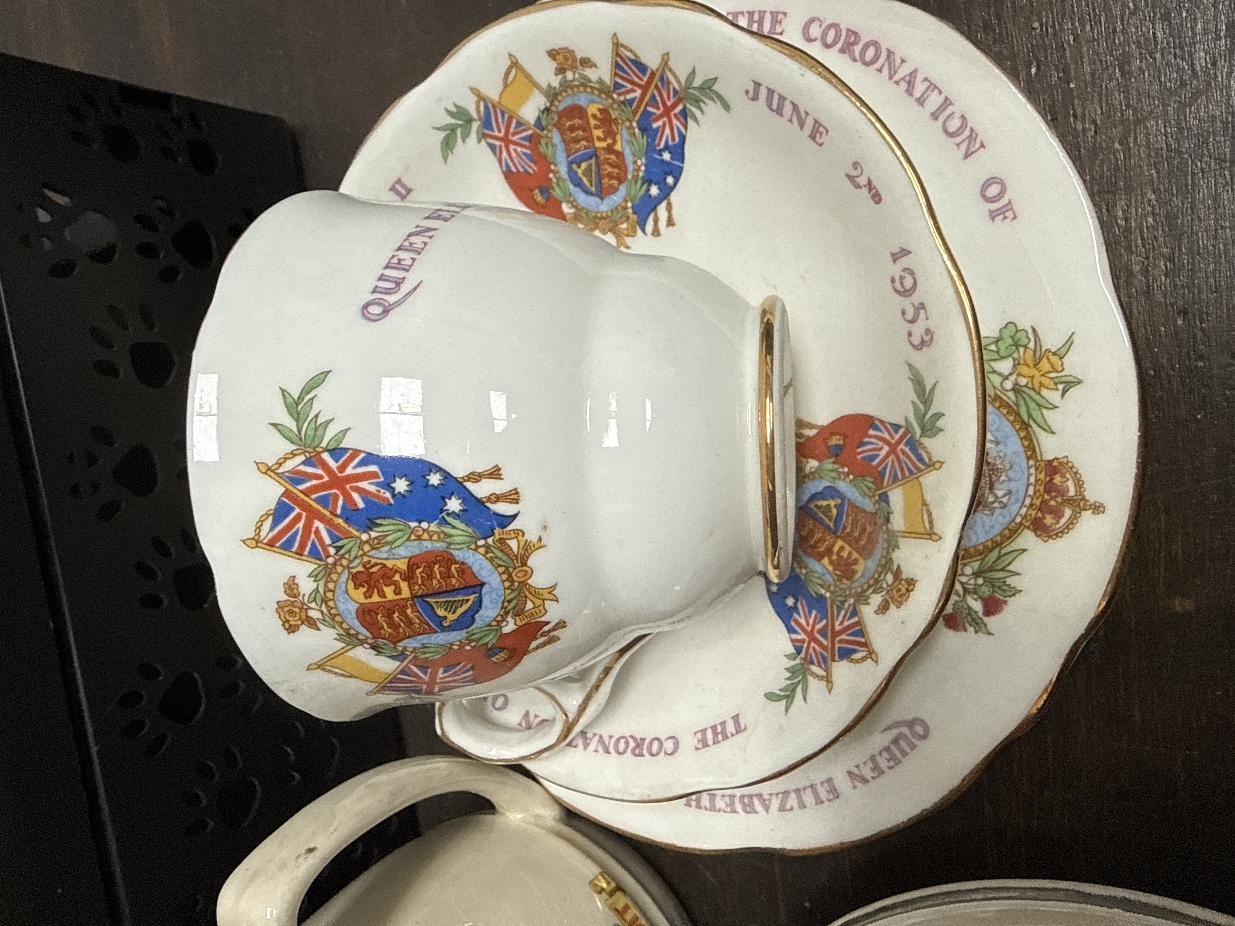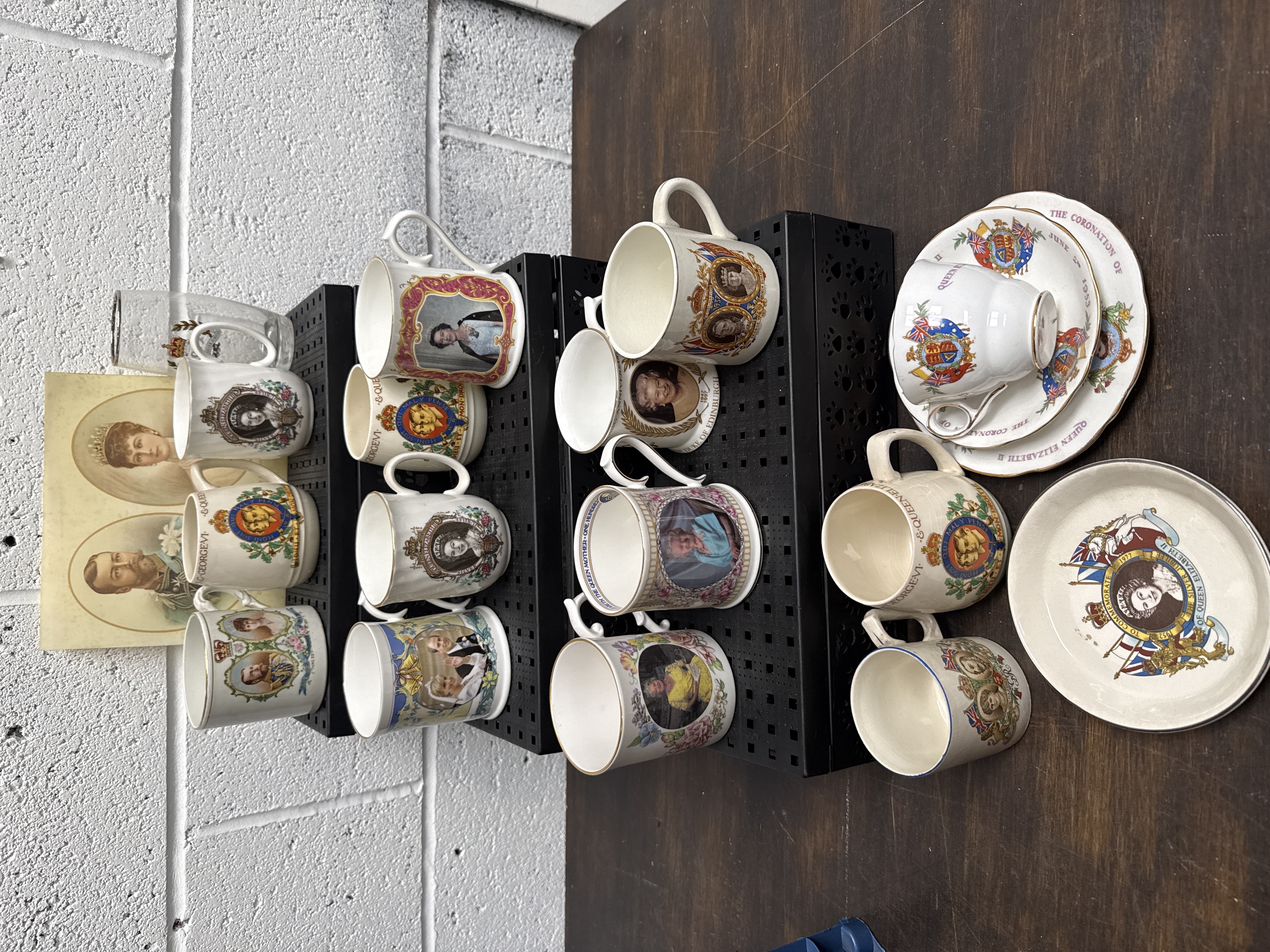 A collection of British royal commemorative ceramic ware, comprising various mugs, a teacup, and multiple saucers. The pieces are primarily manufactured from white glazed porcelain or ceramic, featuring colourful transfer-printed portraits and heraldic motifs. Notable commemorative subjects include the 1953 coronation of Queen Elizabeth II, her 1977 Silver Jubilee, the centenary of Queen Elizabeth The Queen Mother in 2000, and the 1981 marriage of Prince Charles and Lady Diana Spencer. The decoration includes various royal titles, significant dates, and heraldic mottos such as Honi soit qui mal y pense and Dieu et mon droit. Several items feature gilt-edged rims. One specific set includes a teacup and matching saucers inscribed The Coronation of Queen Elizabeth II June 2nd 1953. The collection also includes pieces depicting King George VI and Queen Elizabeth.