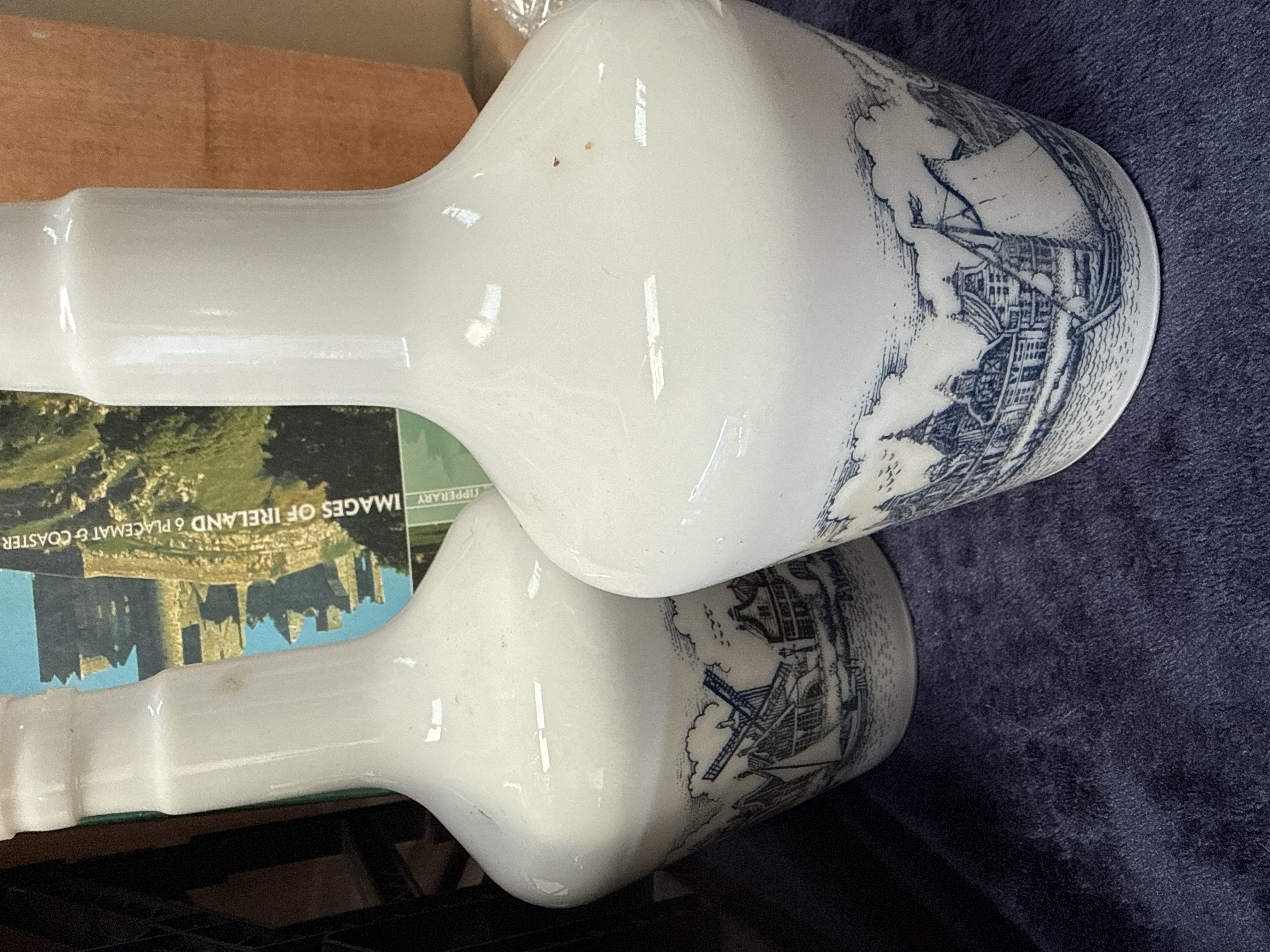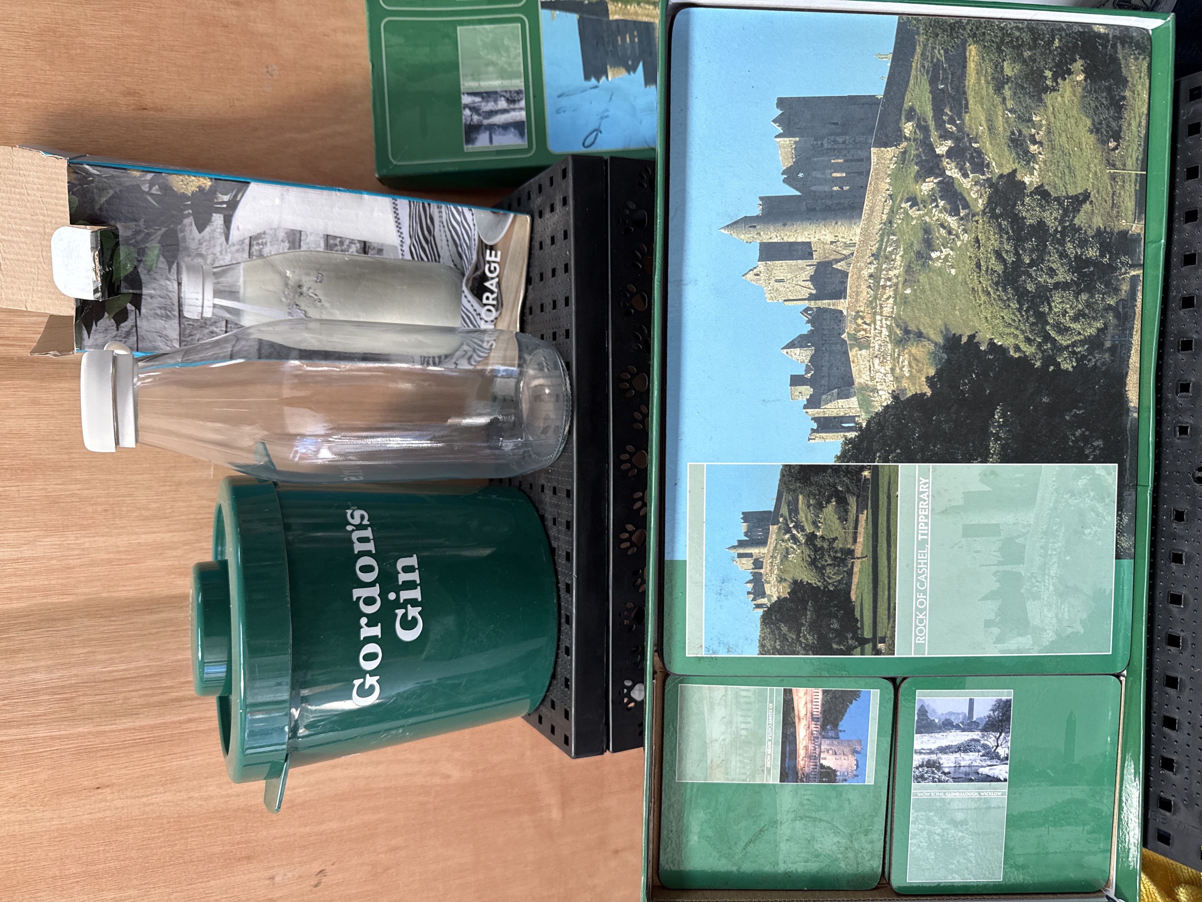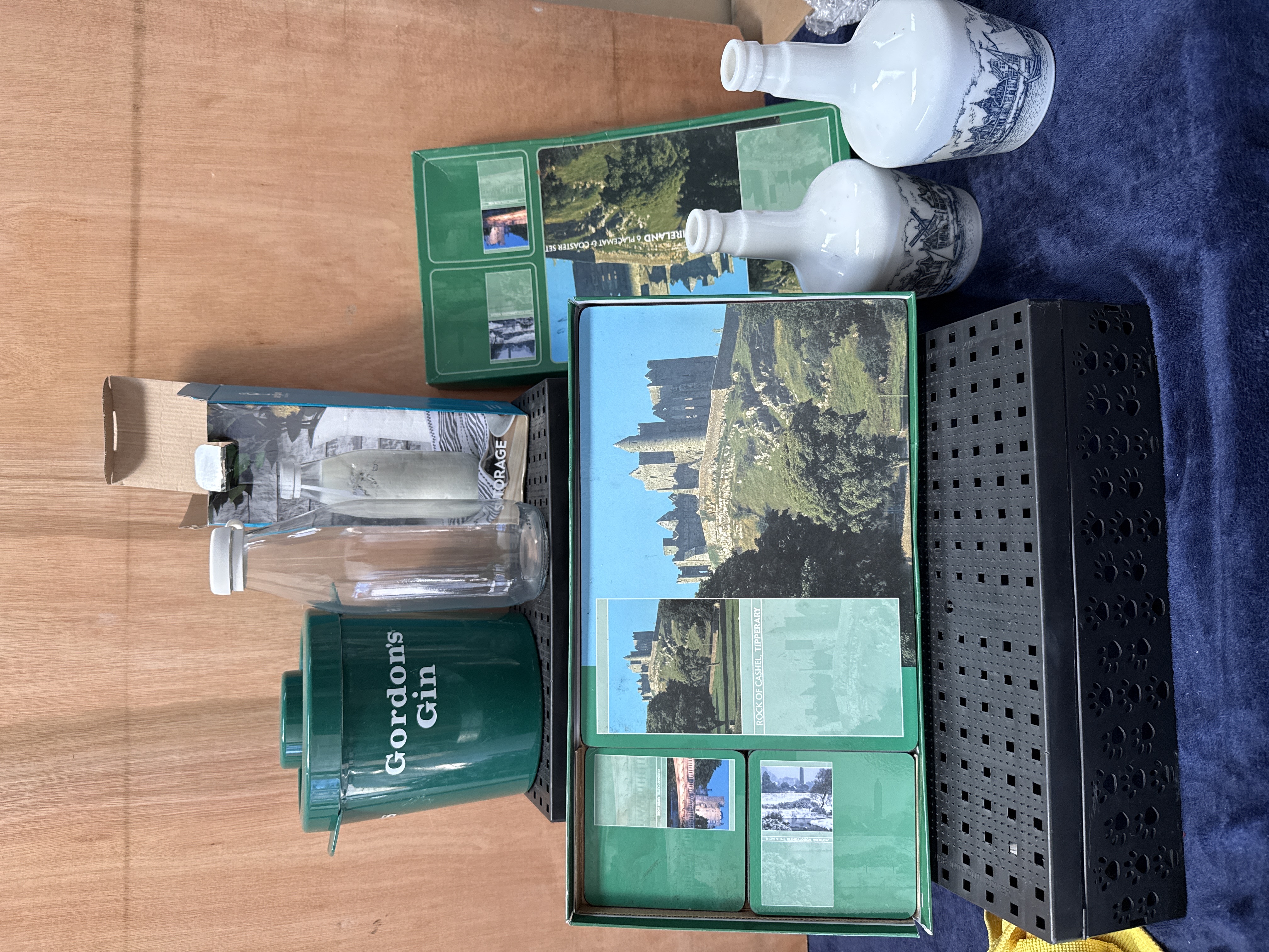 A collection of various household and decorative items. The lot includes a boxed Images of Ireland set comprising placemats and matching coasters featuring scenic Irish landmarks such as the Rock of Cashel and Kilkenny Castle. Also present are ceramic bottles finished in a white glaze with blue transferware-style decoration depicting maritime scenes and windmills. The collection further contains a green plastic ice bucket with a lid, bearing the Gordon’s Gin brand name, and a clear glass storage bottle with its original cardboard packaging. The items are accompanied by several black plastic grid-style storage crates.