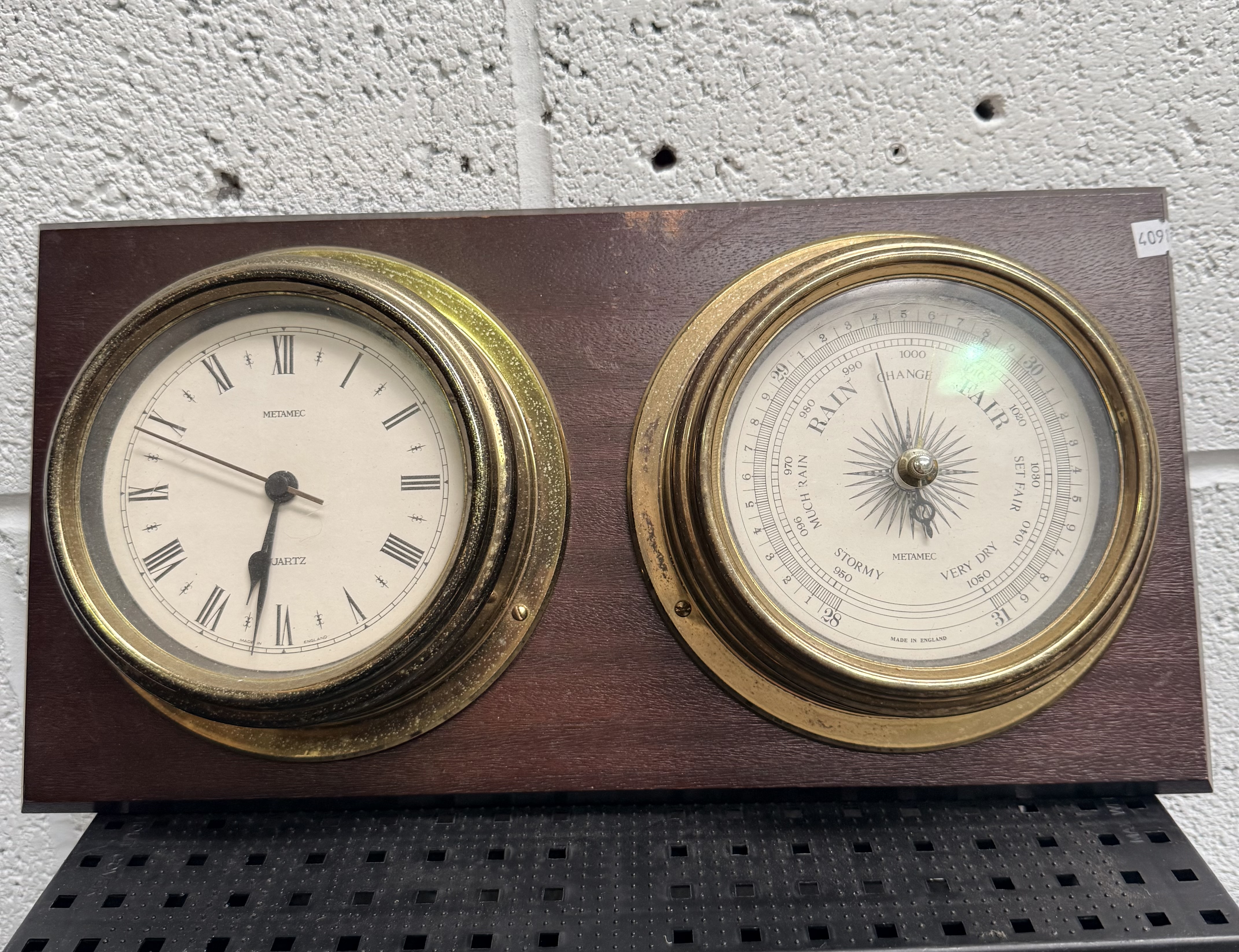 A vintage weather station by Metamec, comprising a quartz clock and an aneroid barometer mounted side-by-side on a rectangular dark wood plaque. The clock features a white dial with black Roman numeral hour markers and is marked METAMEC QUARTZ and MADE IN ENGLAND. The barometer features a corresponding white dial with a central compass rose motif, indicating meteorological conditions including STORMY, RAIN, CHANGE, FAIR, and VERY DRY, and is marked METAMEC and MADE IN ENGLAND. Both instruments are housed within circular brass-tone bezels with glass covers.