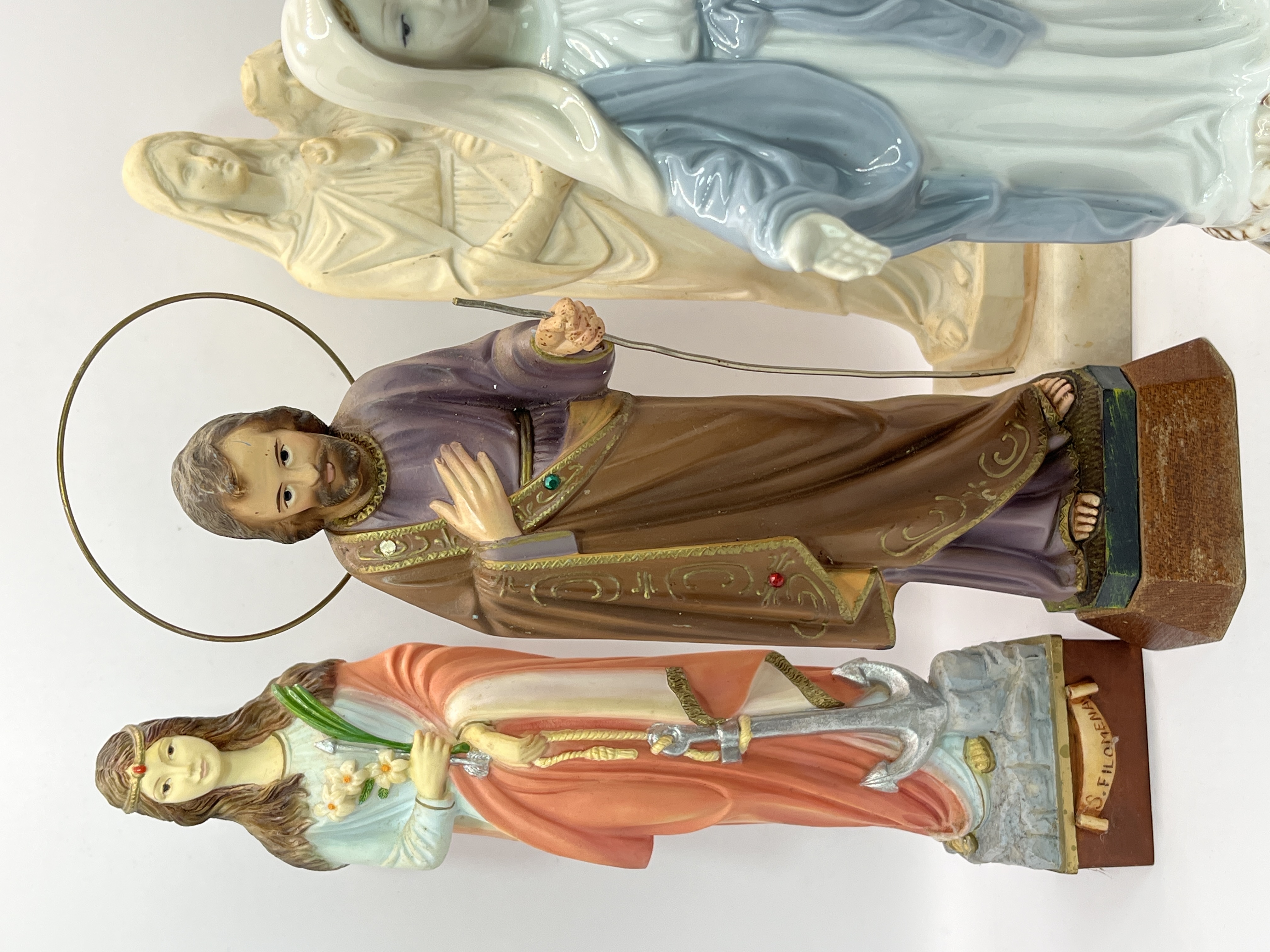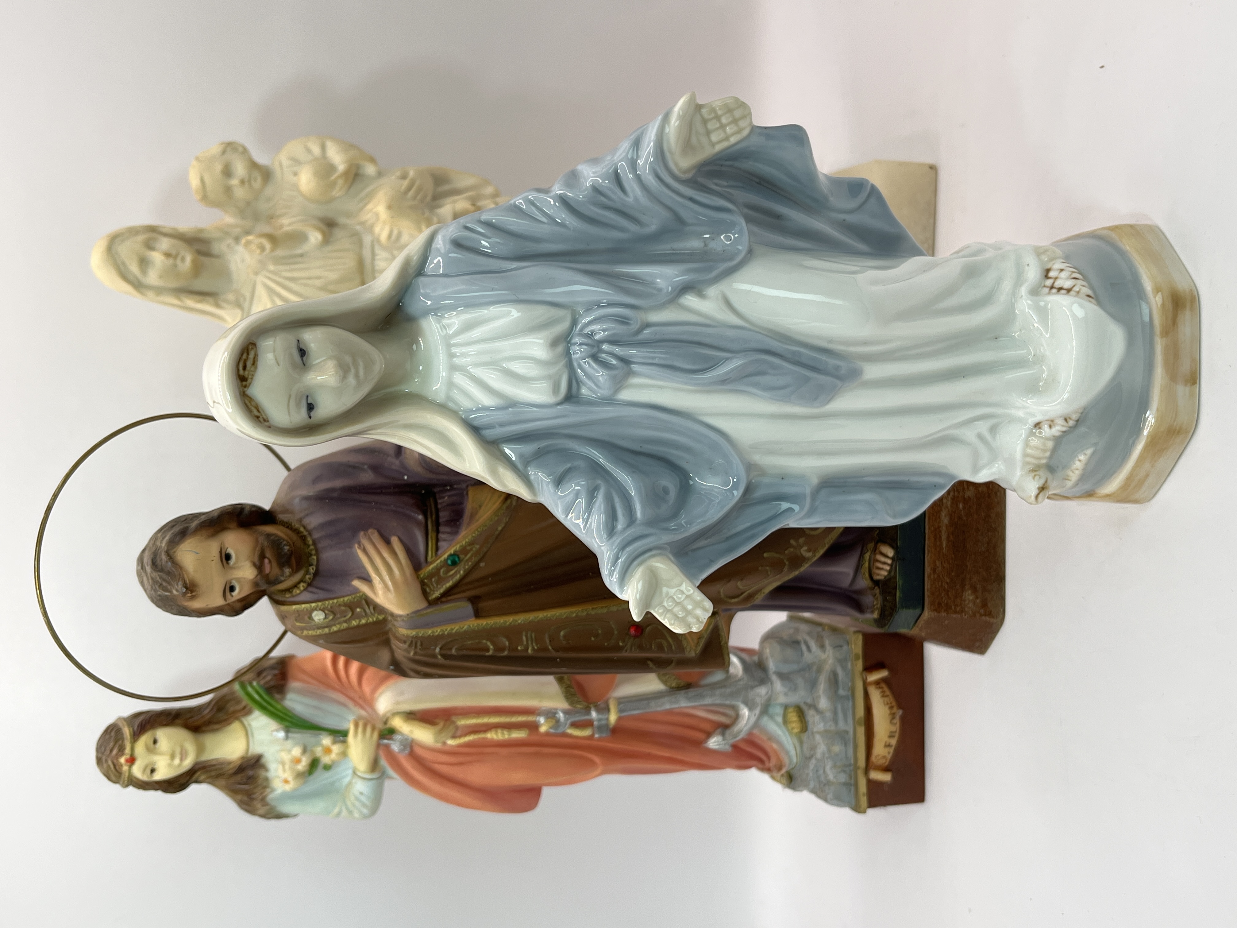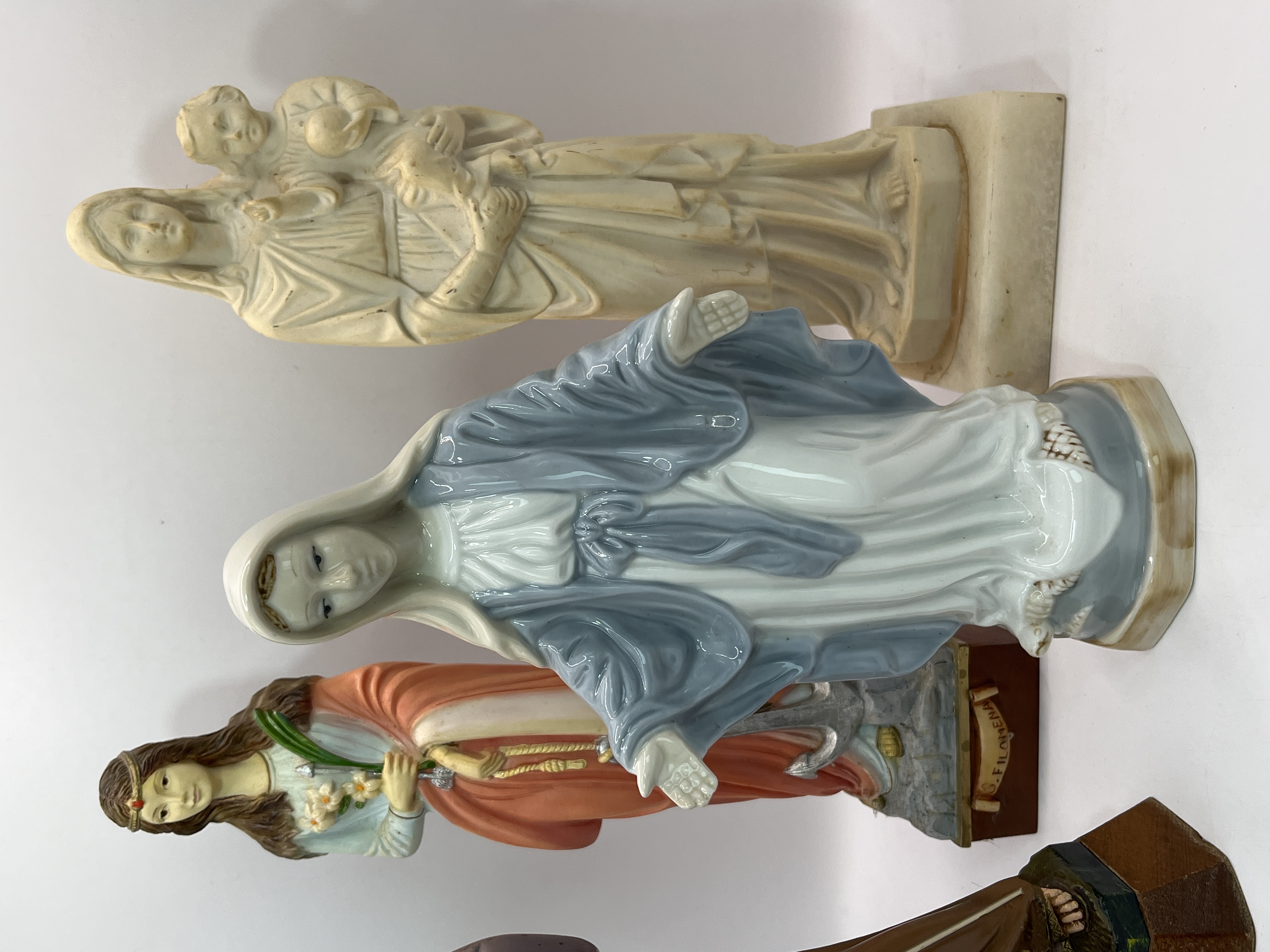 A collection of religious statues featuring diverse Catholic subjects and materials. The group includes a blue and white glazed porcelain figure of Our Lady of Grace in the Miraculous Medal pose. Also featured is a polychrome painted figure of a male saint, likely Saint Joseph, depicted with a thin metal halo and holding a metal staff. The collection further contains a polychrome figure of Saint Philomena, identified by the inscription S. FILOMENA on the base and shown with her attributes of an anchor and flowers. The assortment is completed by an unpainted cream-coloured cast resin or plaster statue of the Madonna and Child.